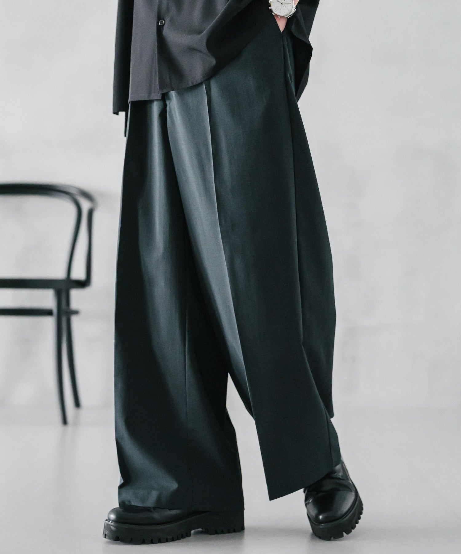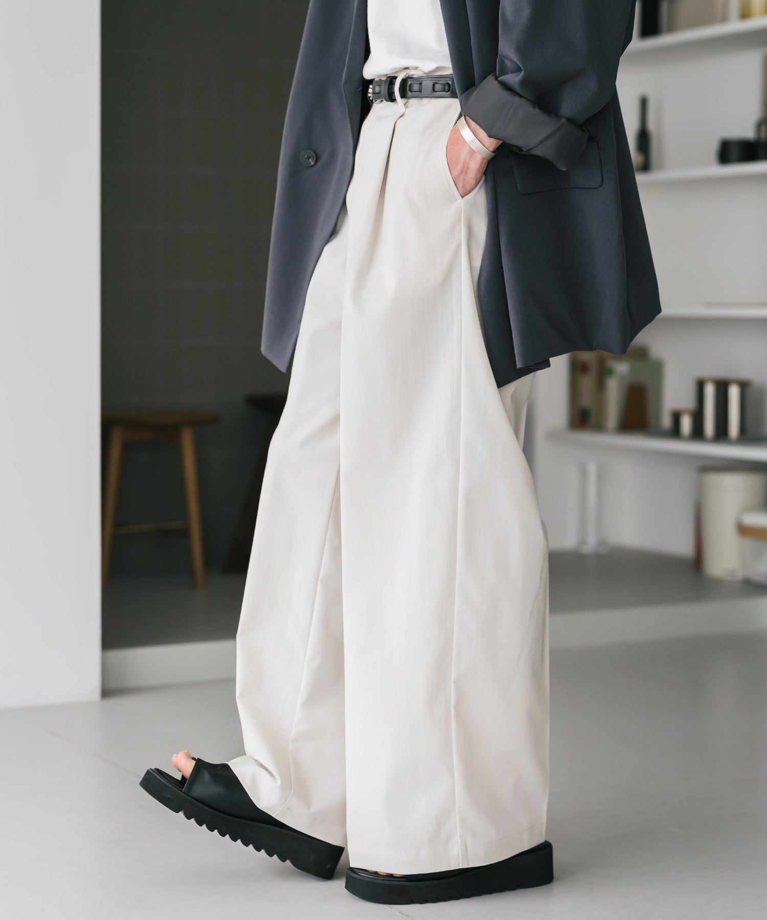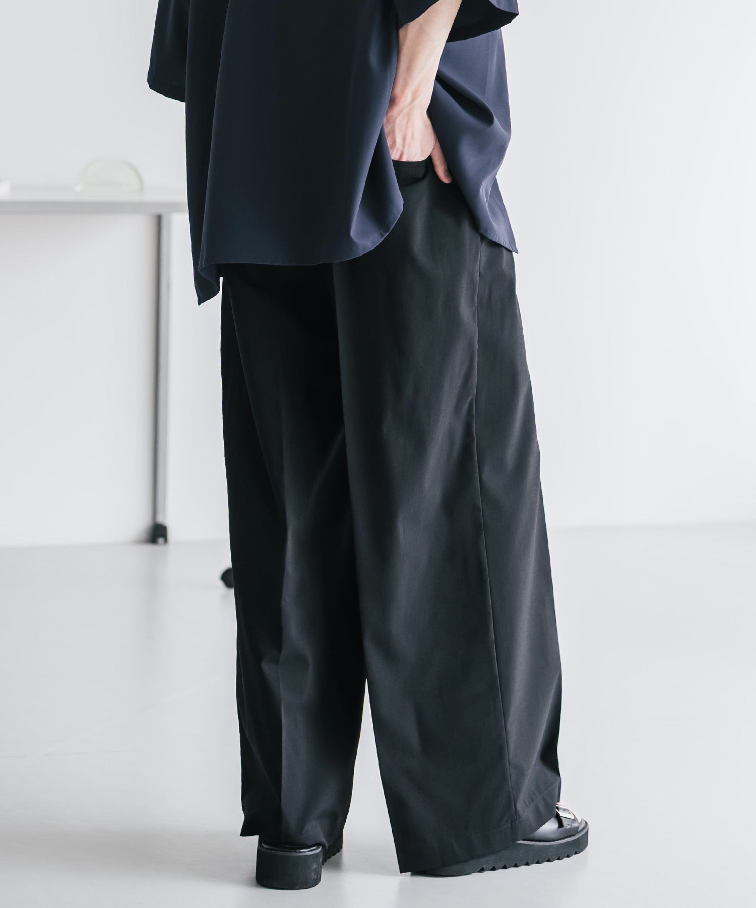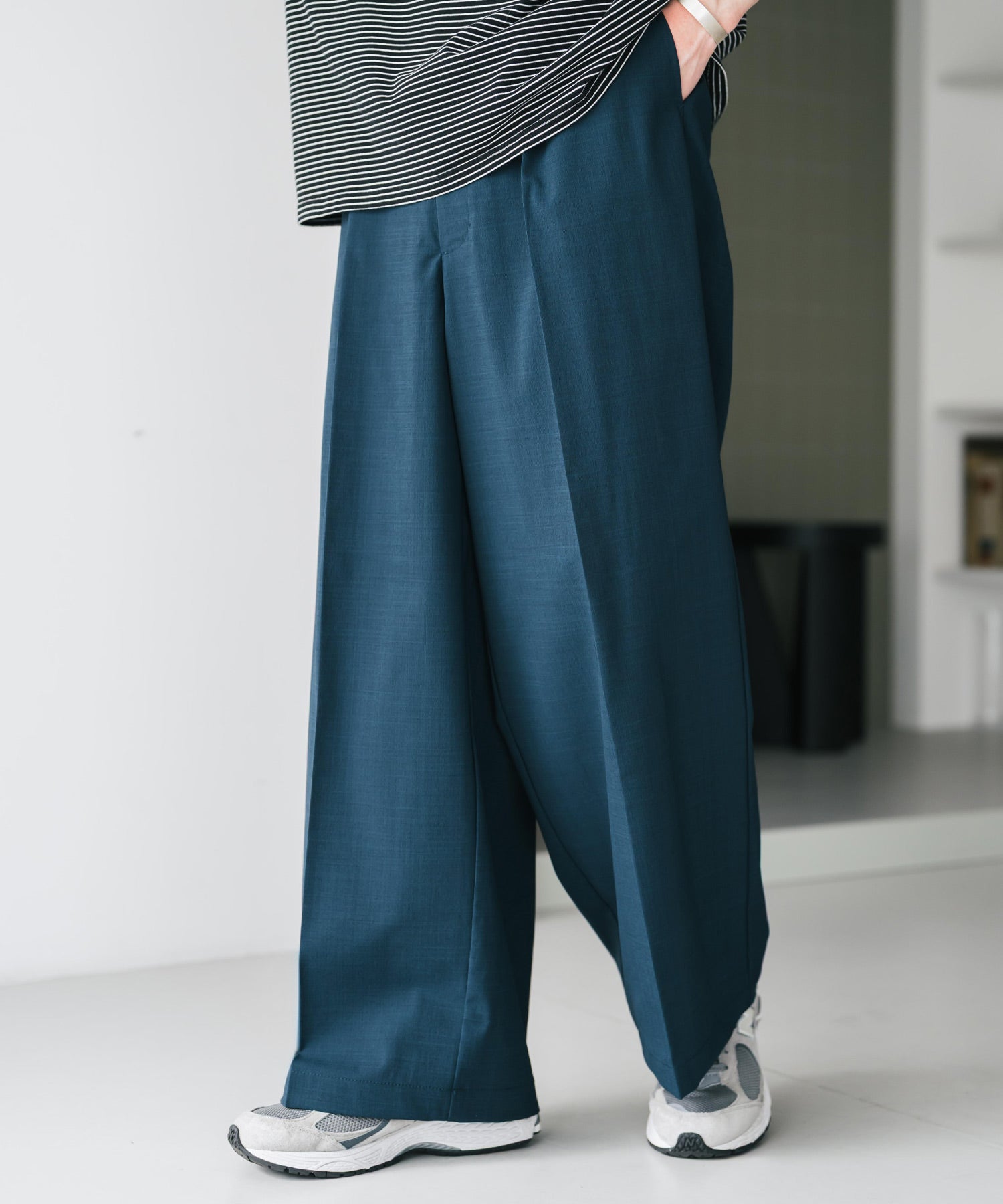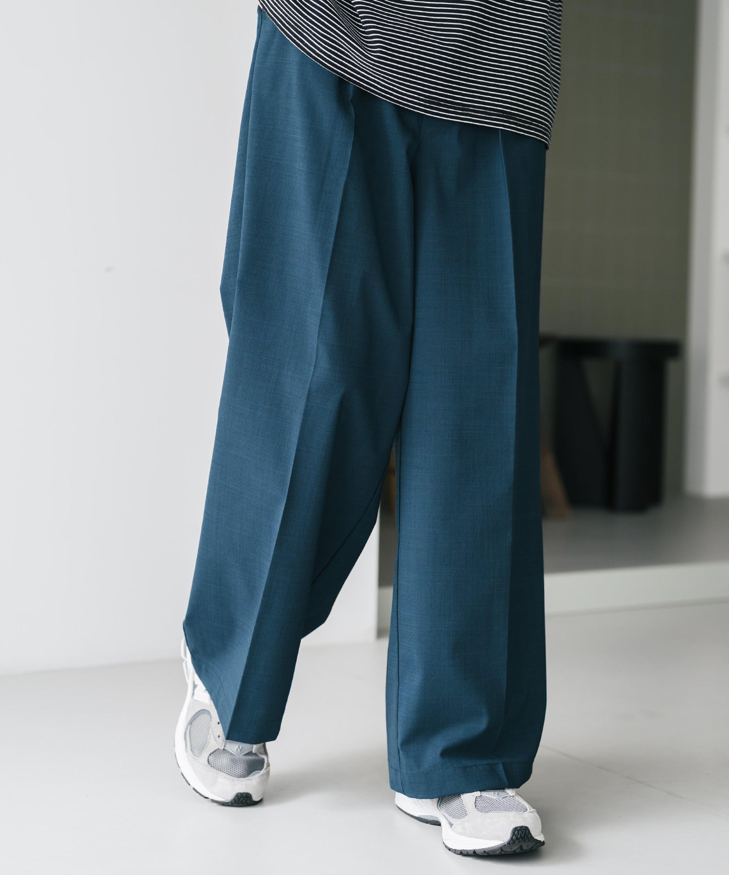 股上が深く、裾に向かってストンと落ちるようなワイドシルエット。
