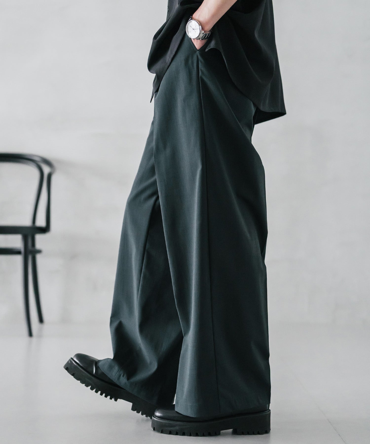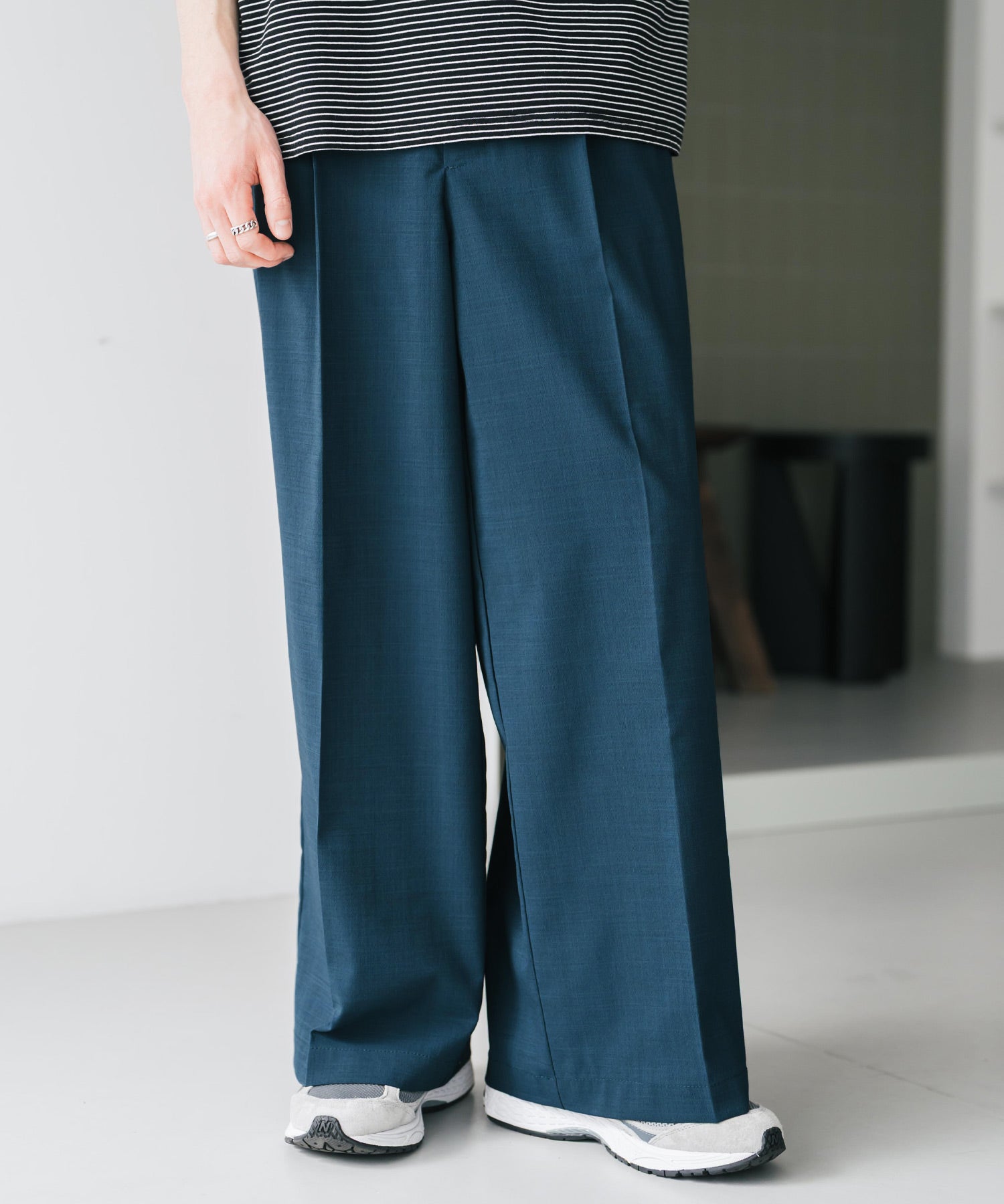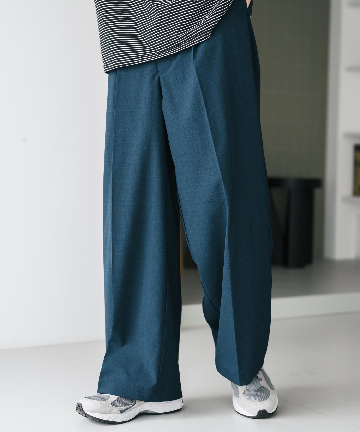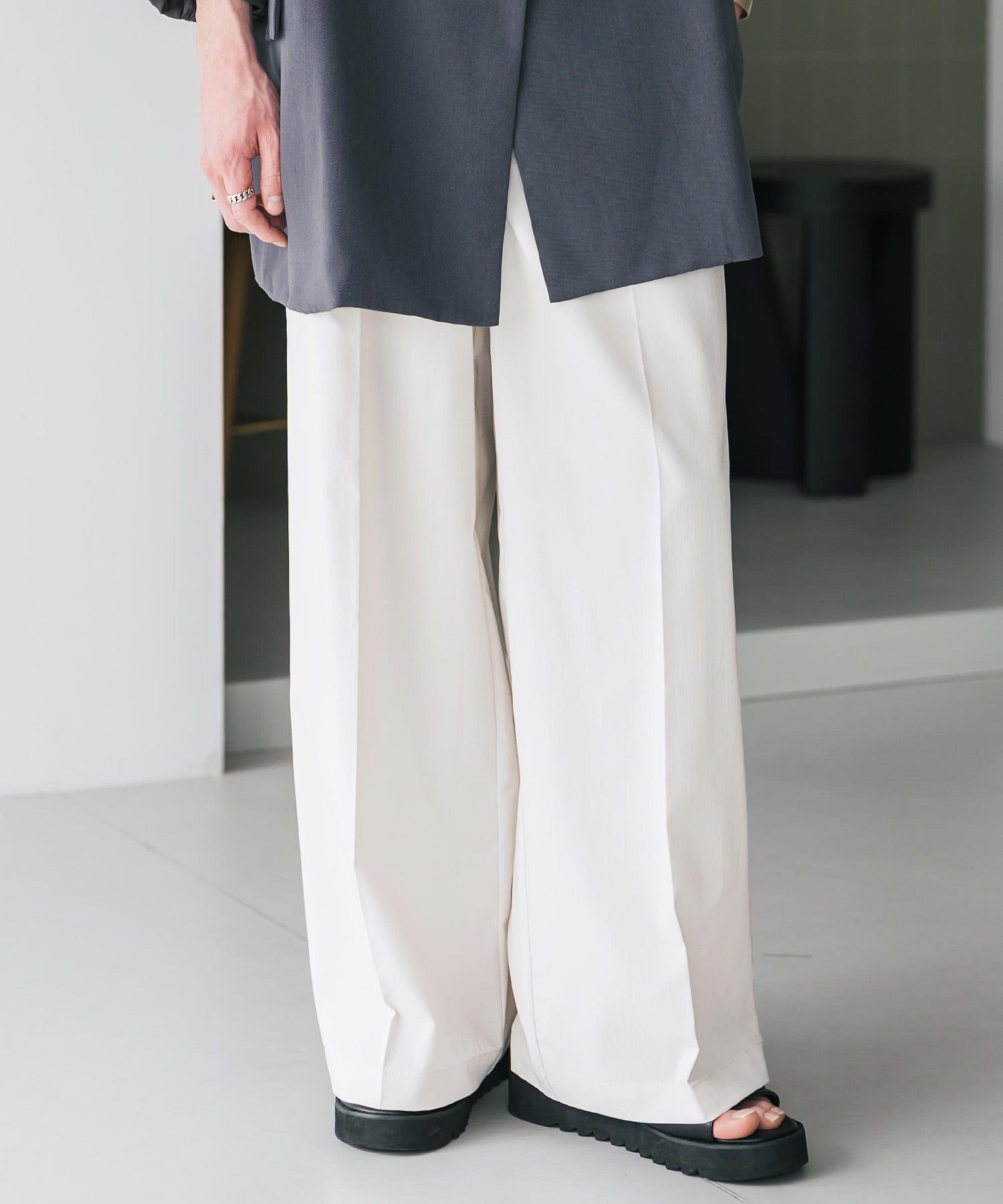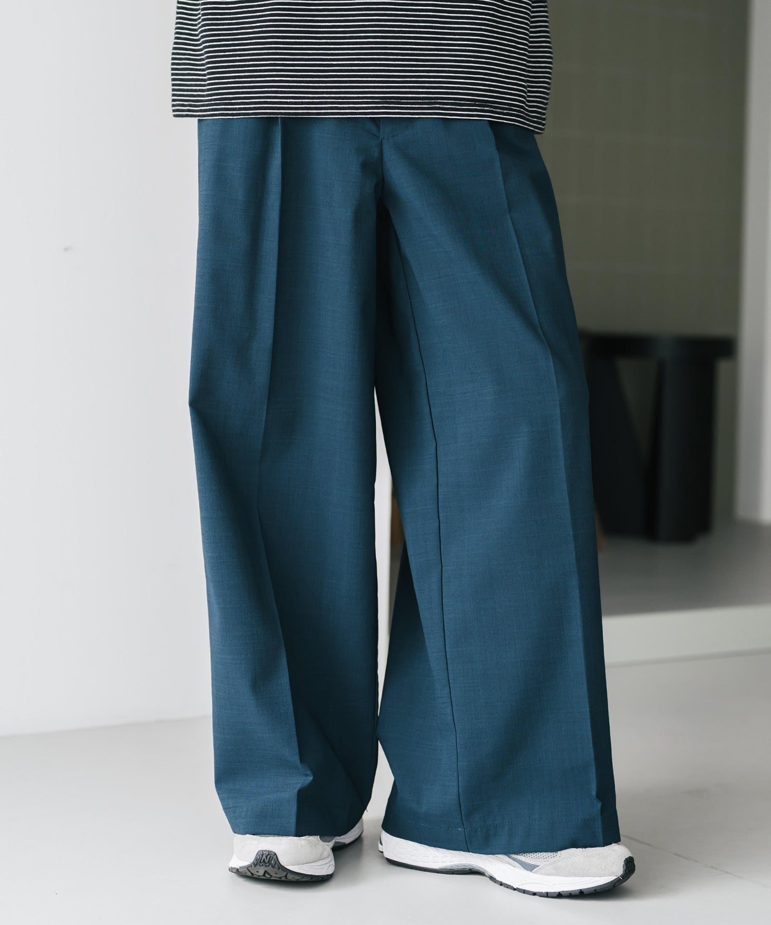 股上が深く、裾に向かってストンと落ちるようなワイドシルエット。