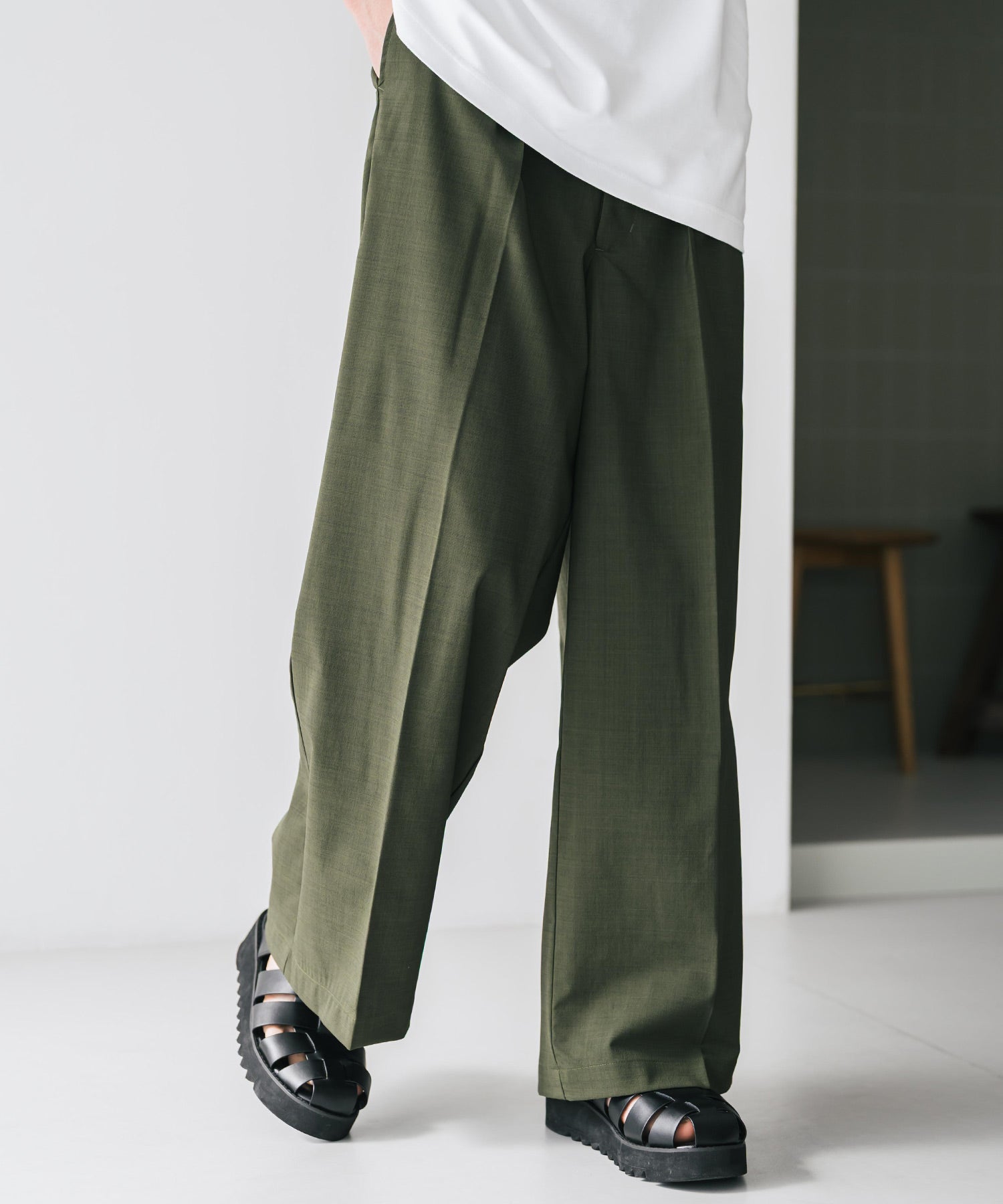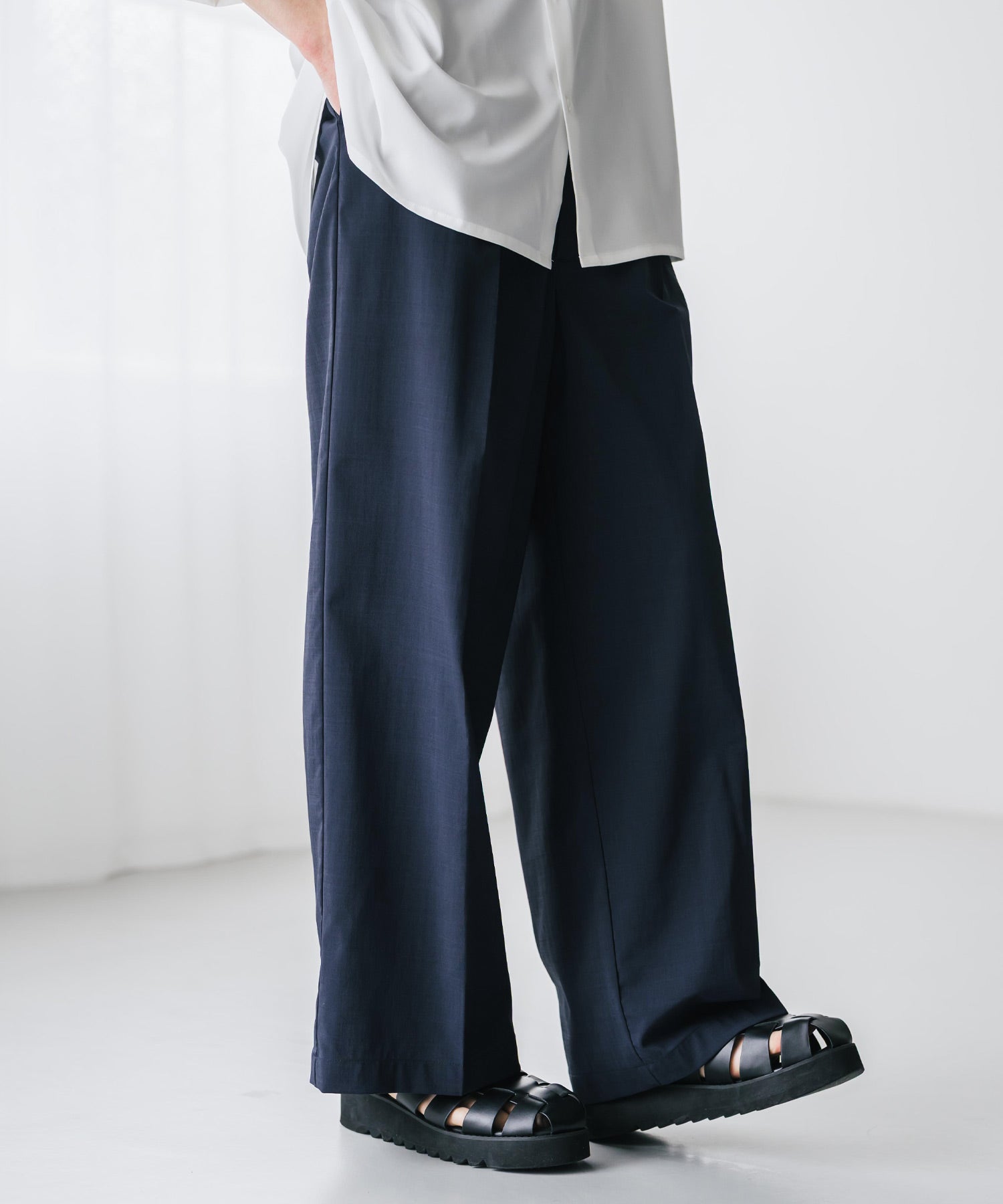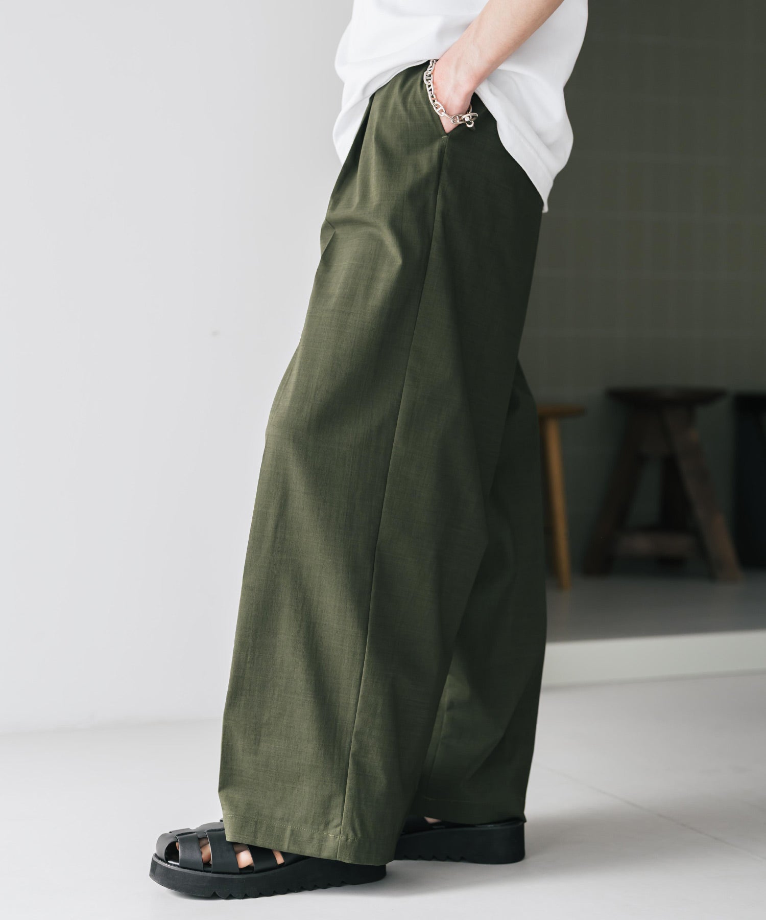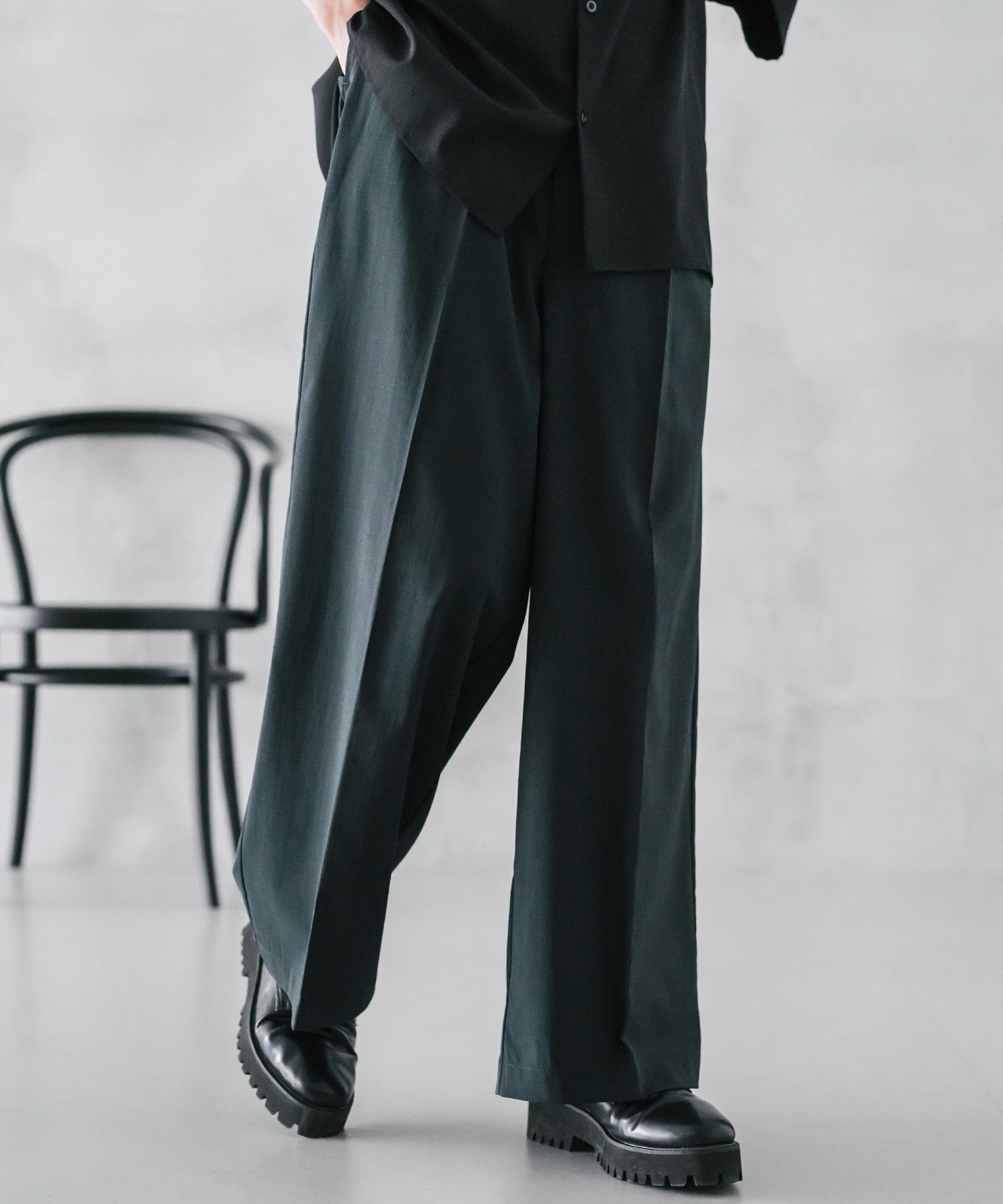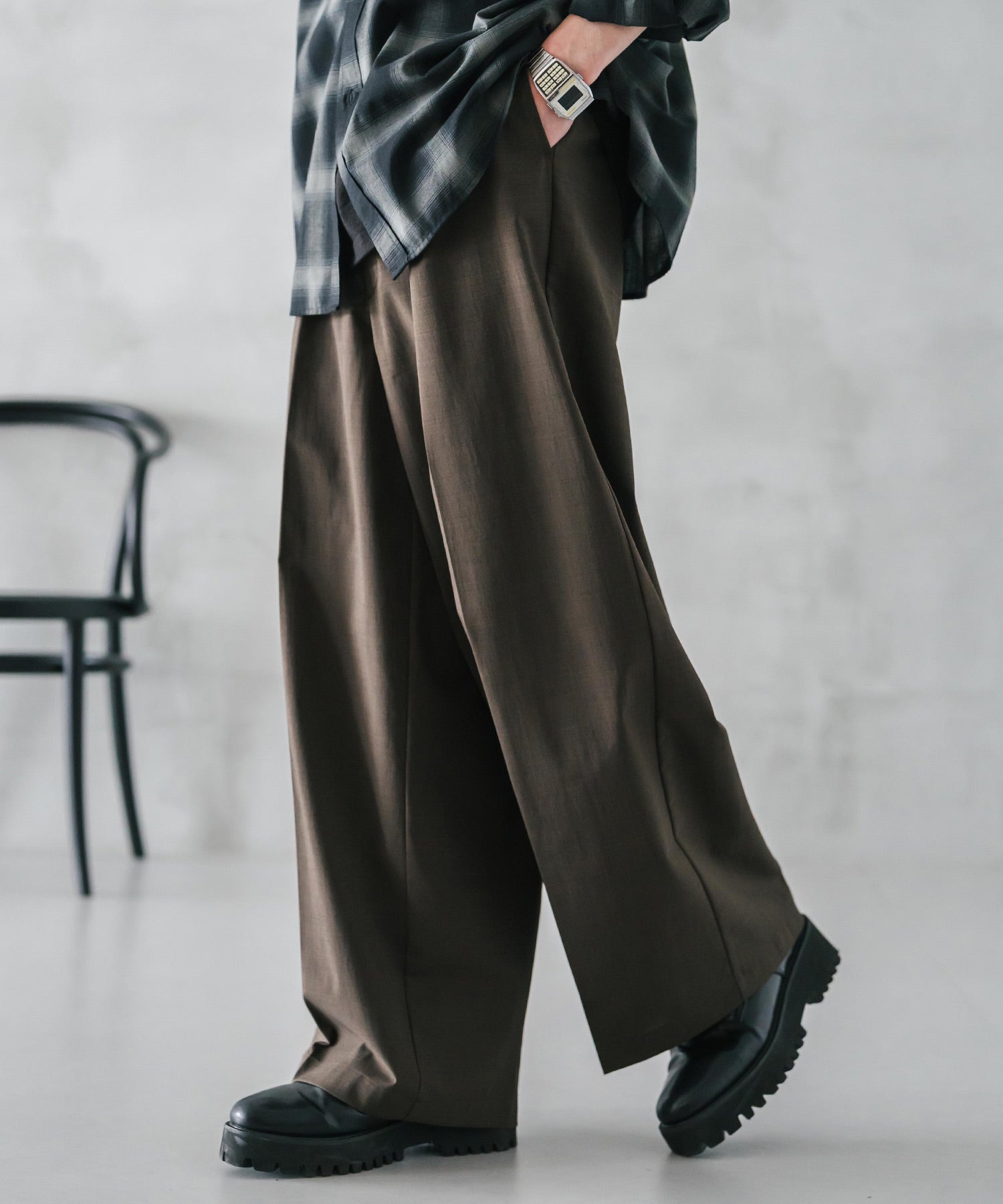 股上が深く、裾に向かってストンと落ちるようなワイドシルエット。