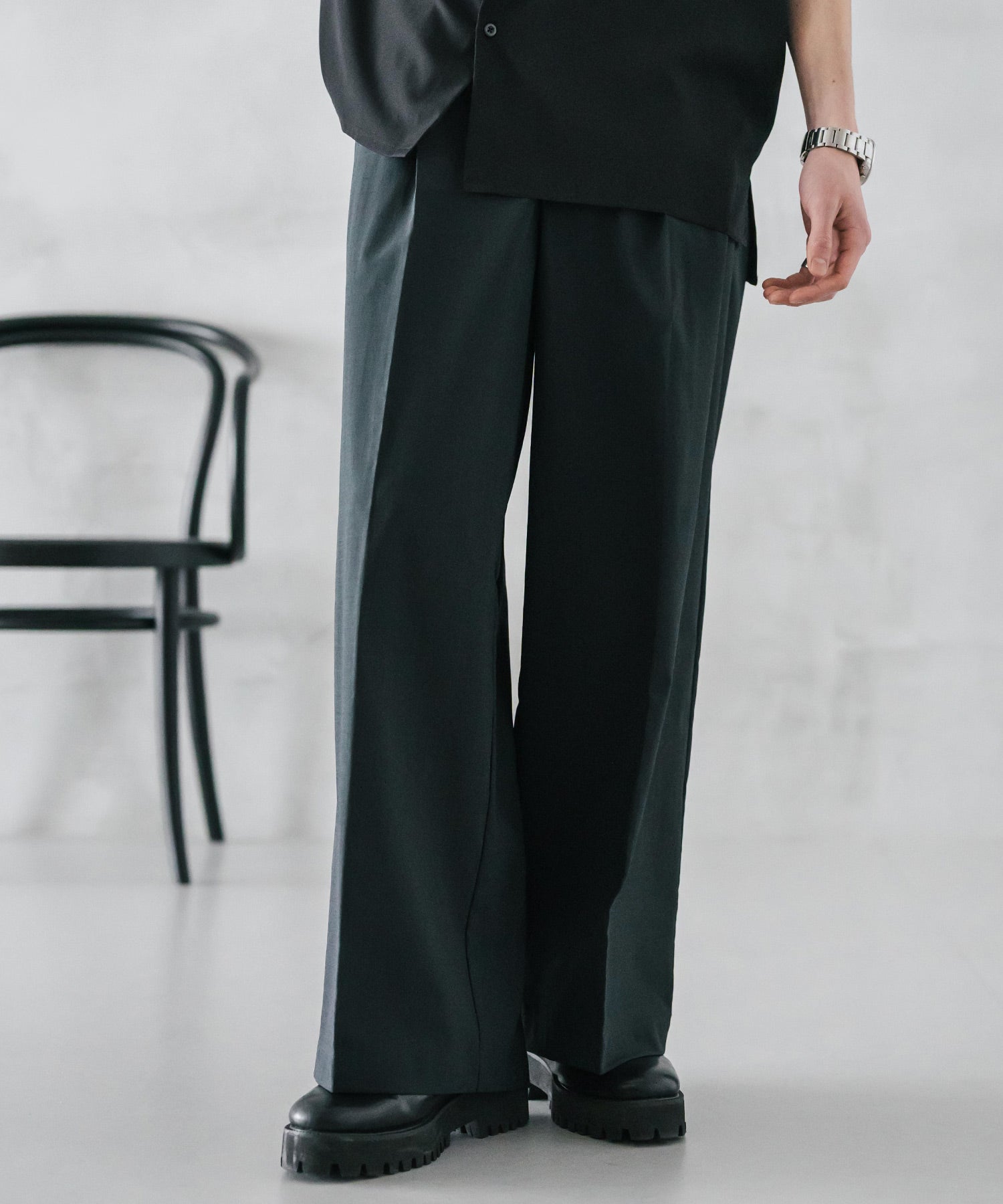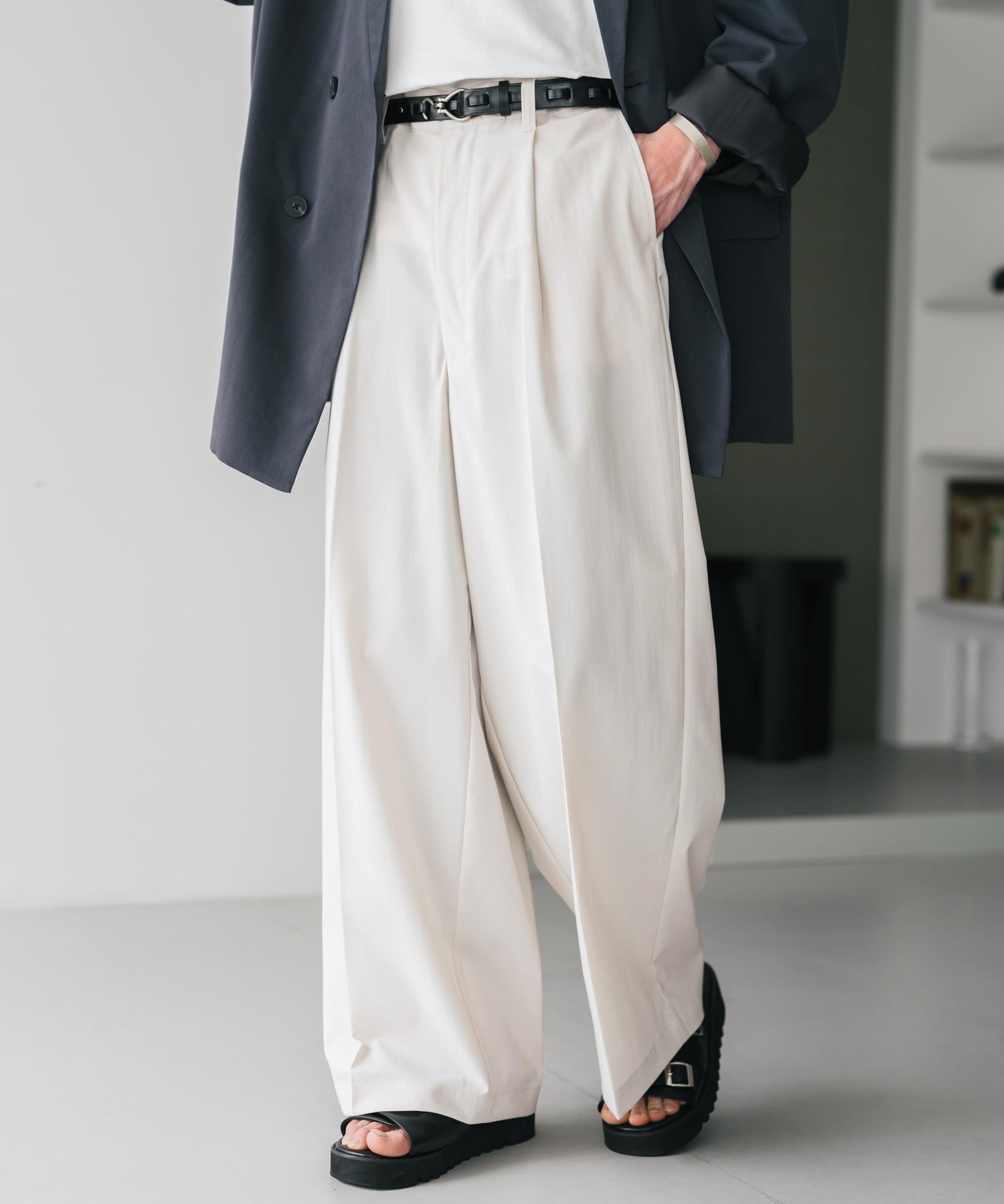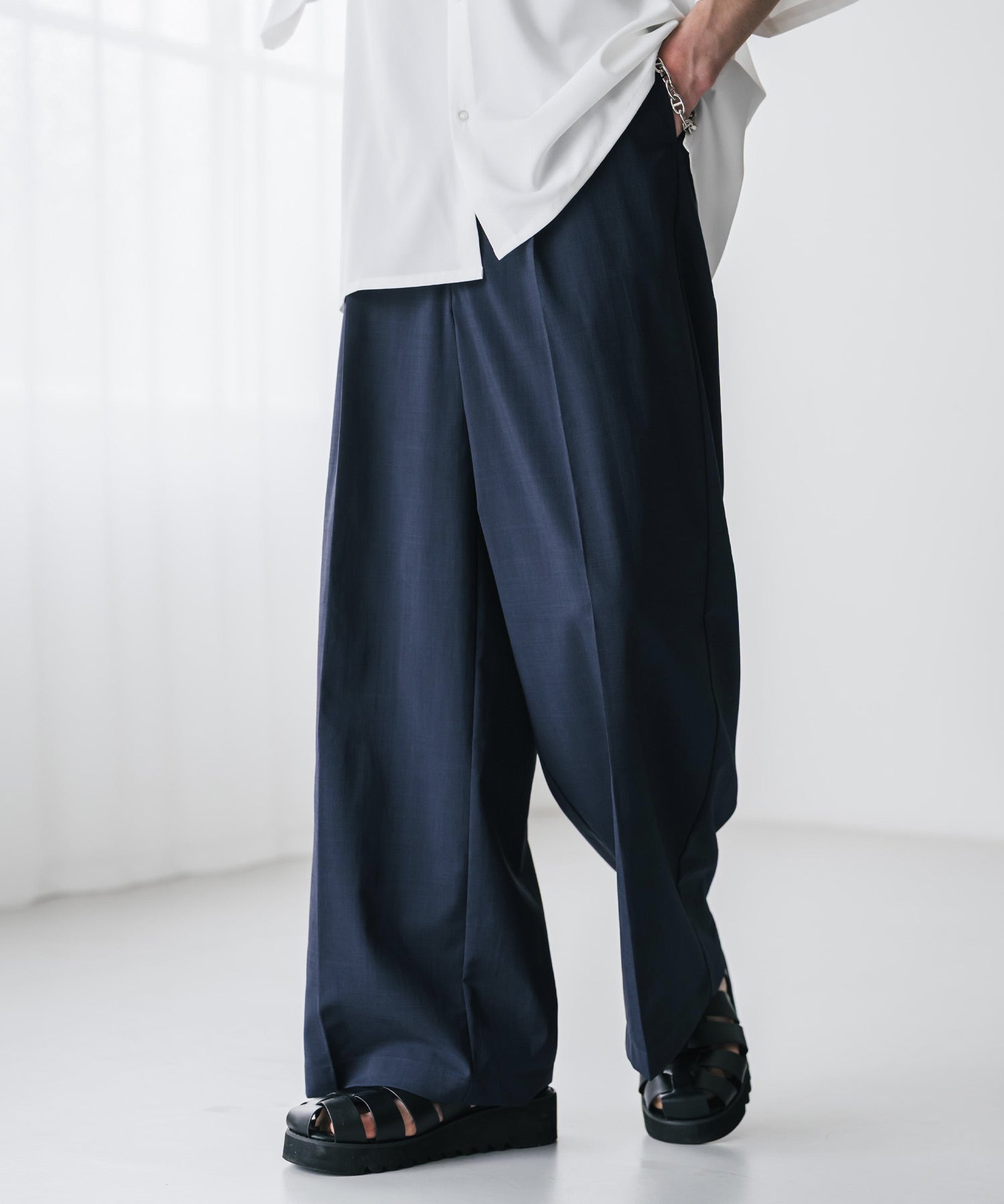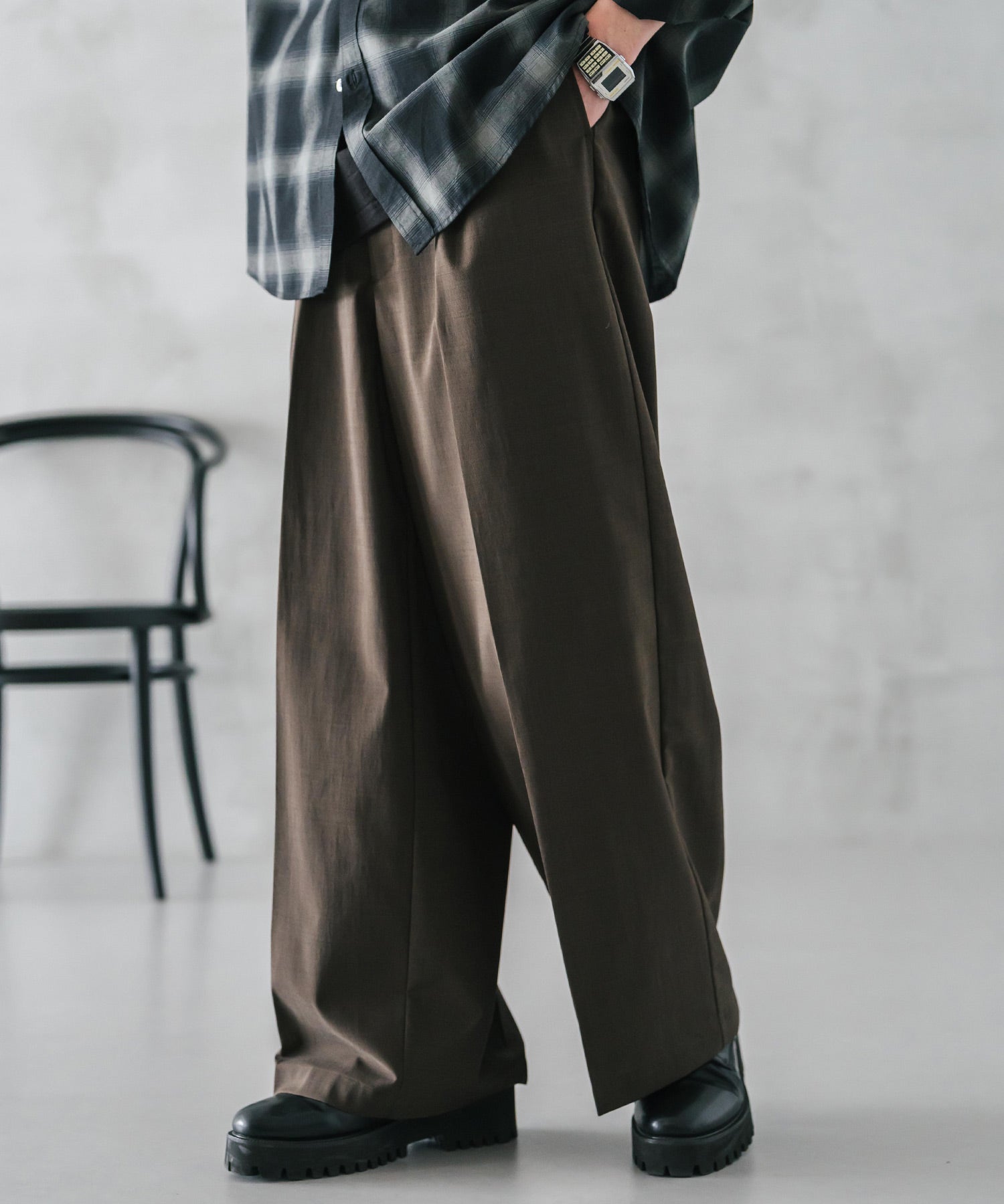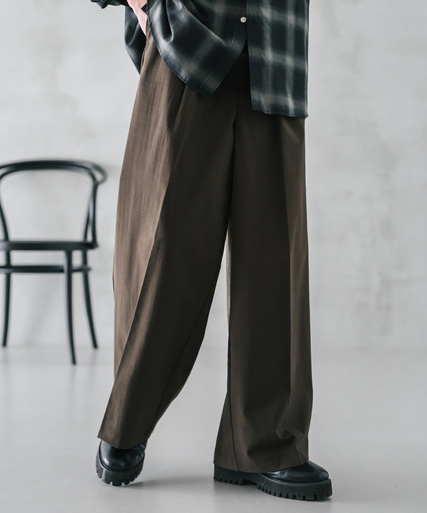 股上が深く、裾に向かってストンと落ちるようなワイドシルエット。