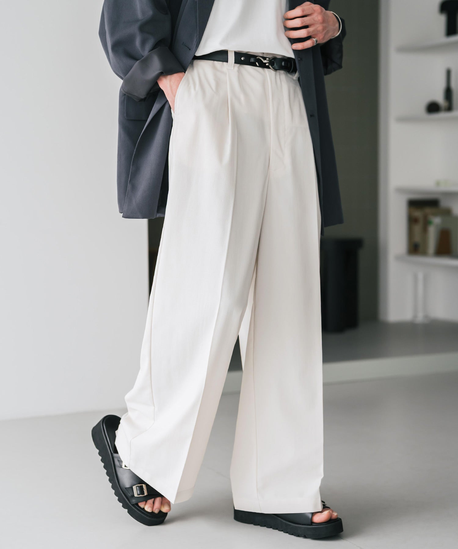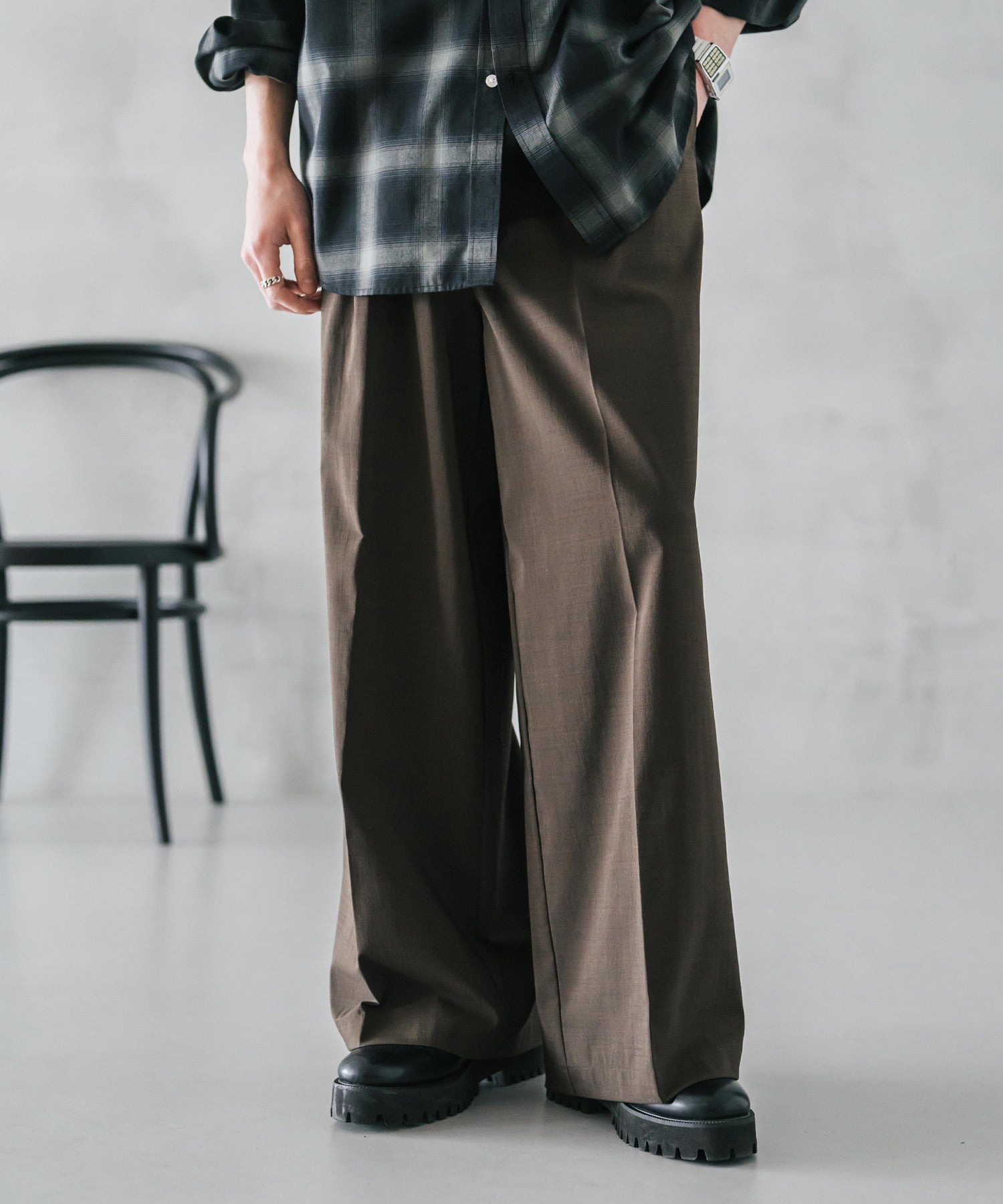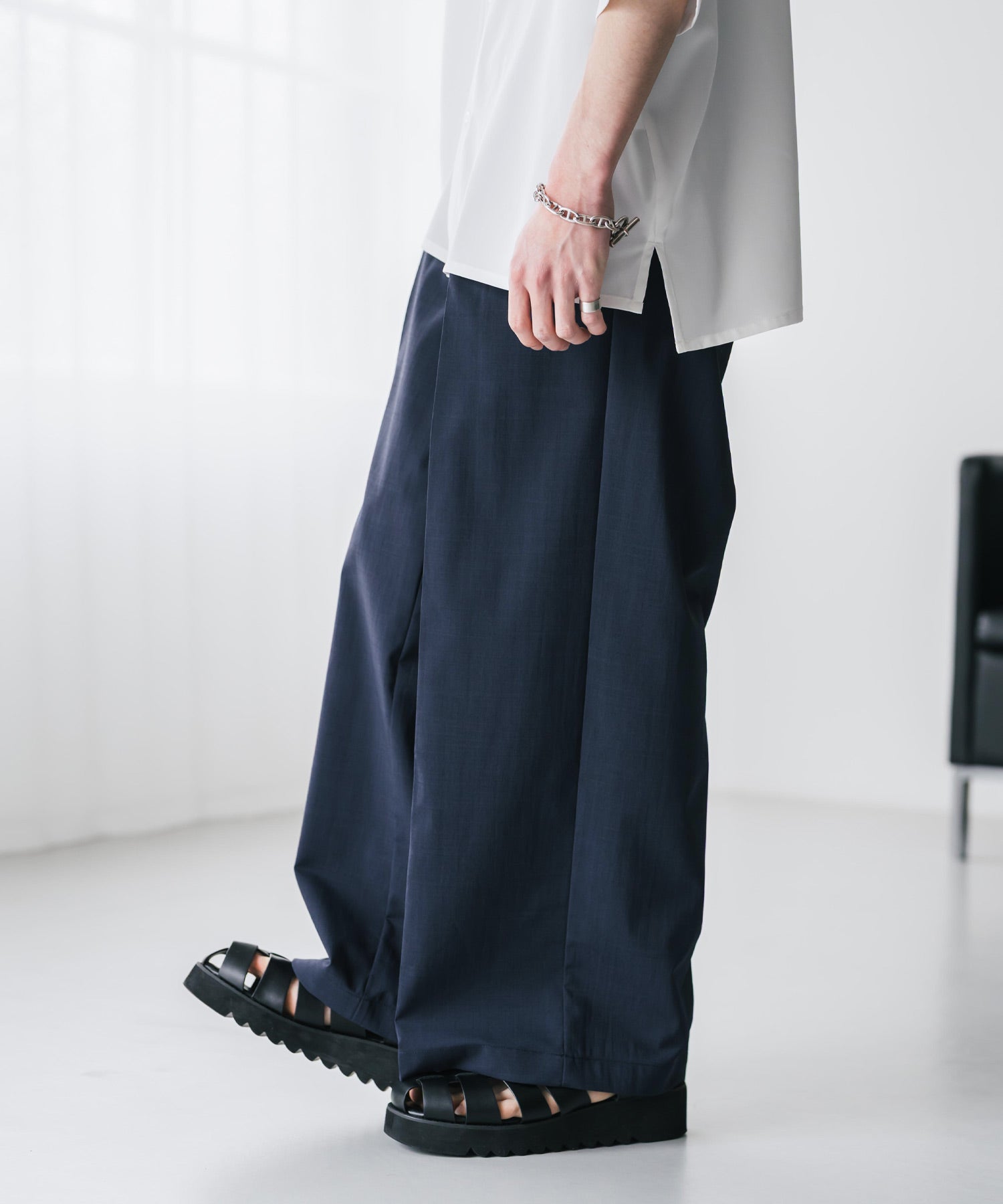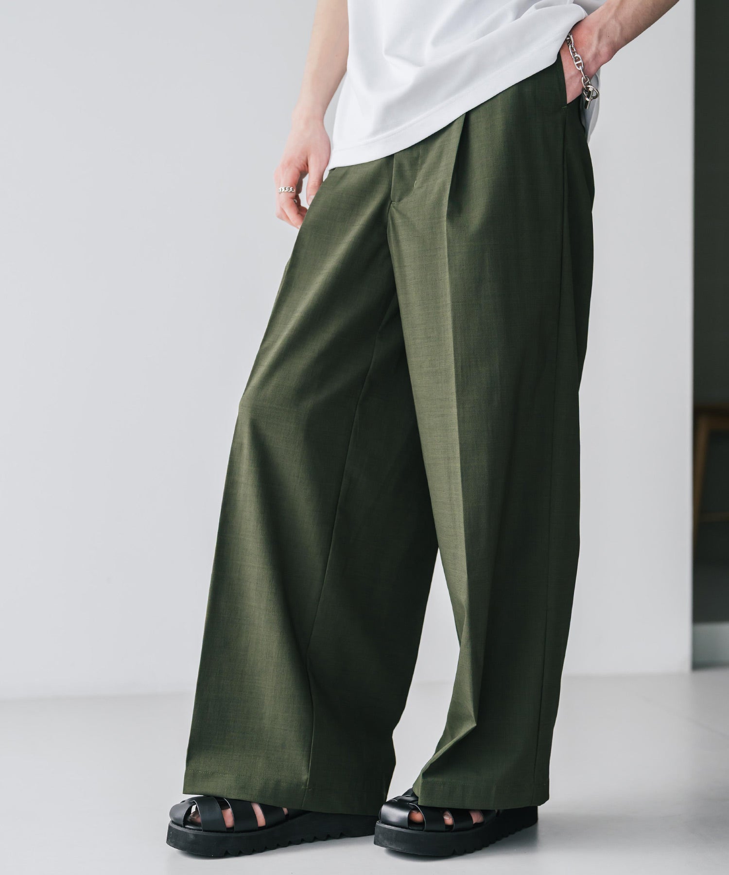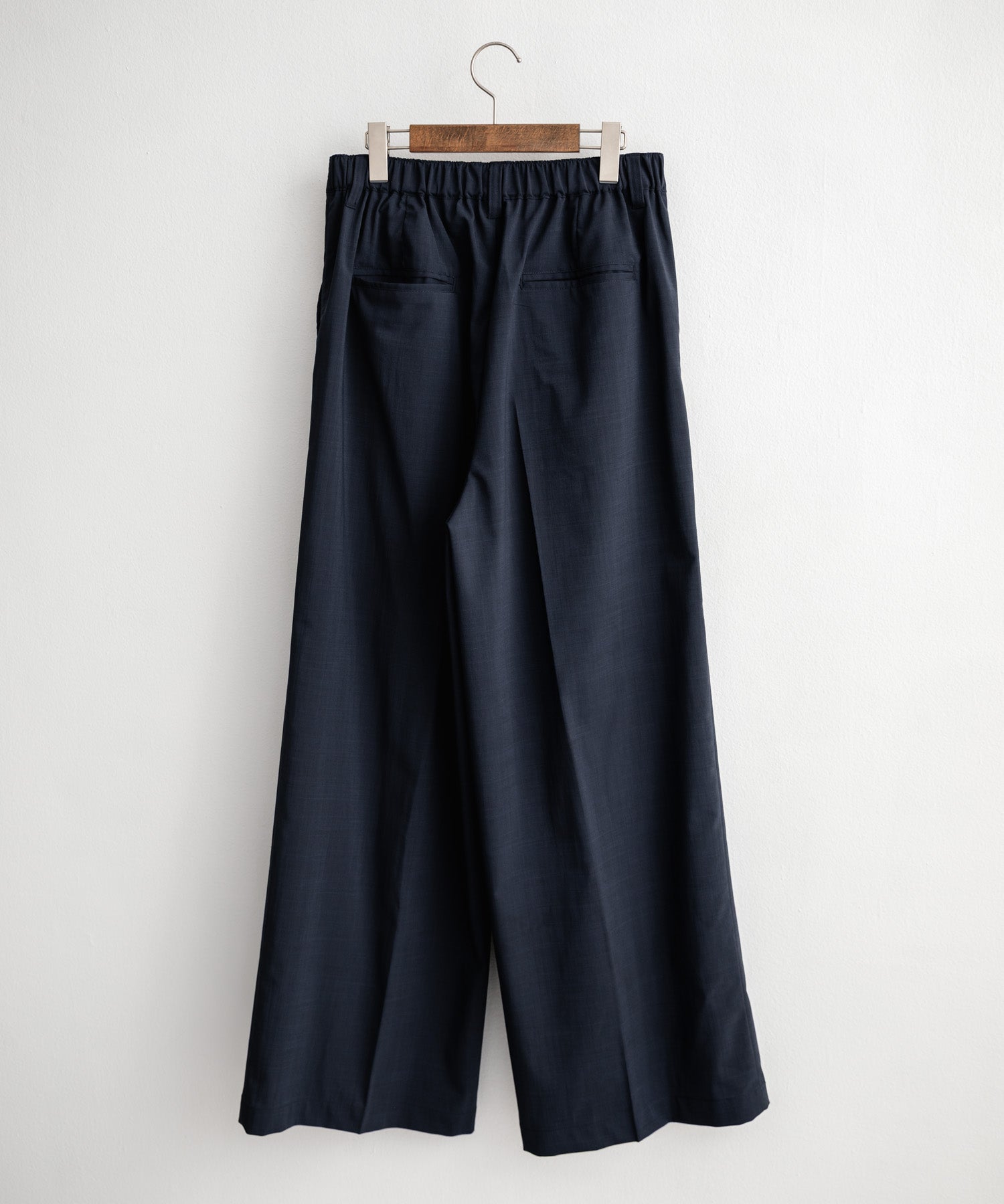 股上が深く、裾に向かってストンと落ちるようなワイドシルエット。