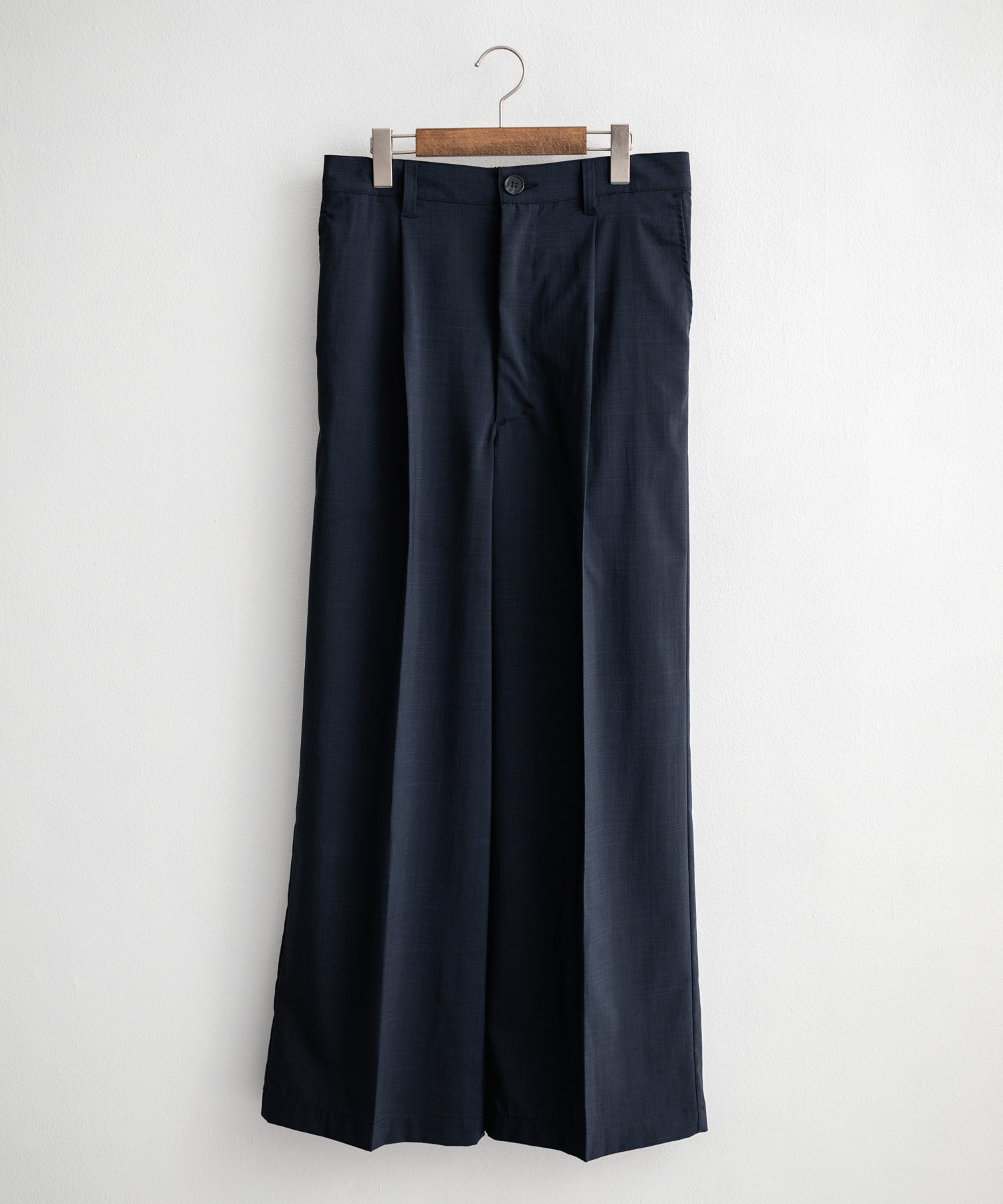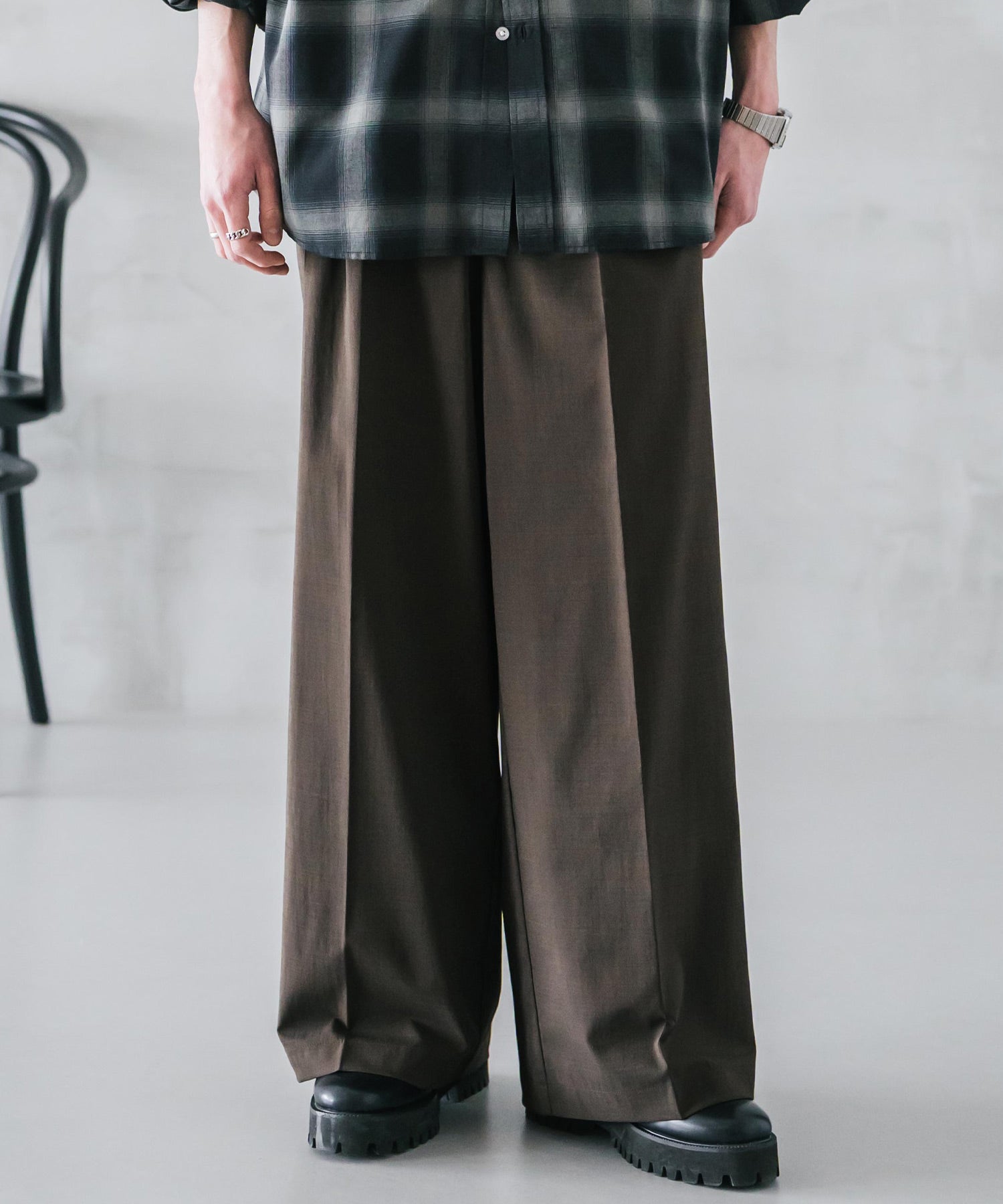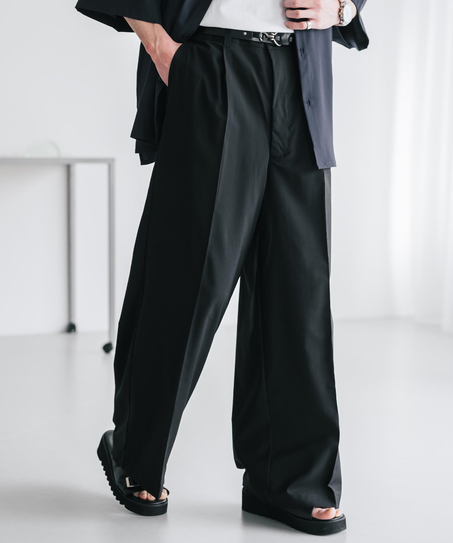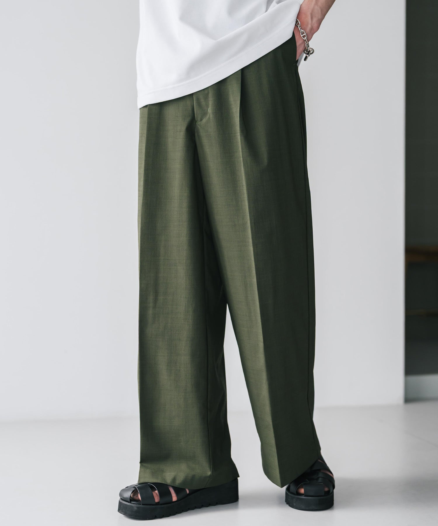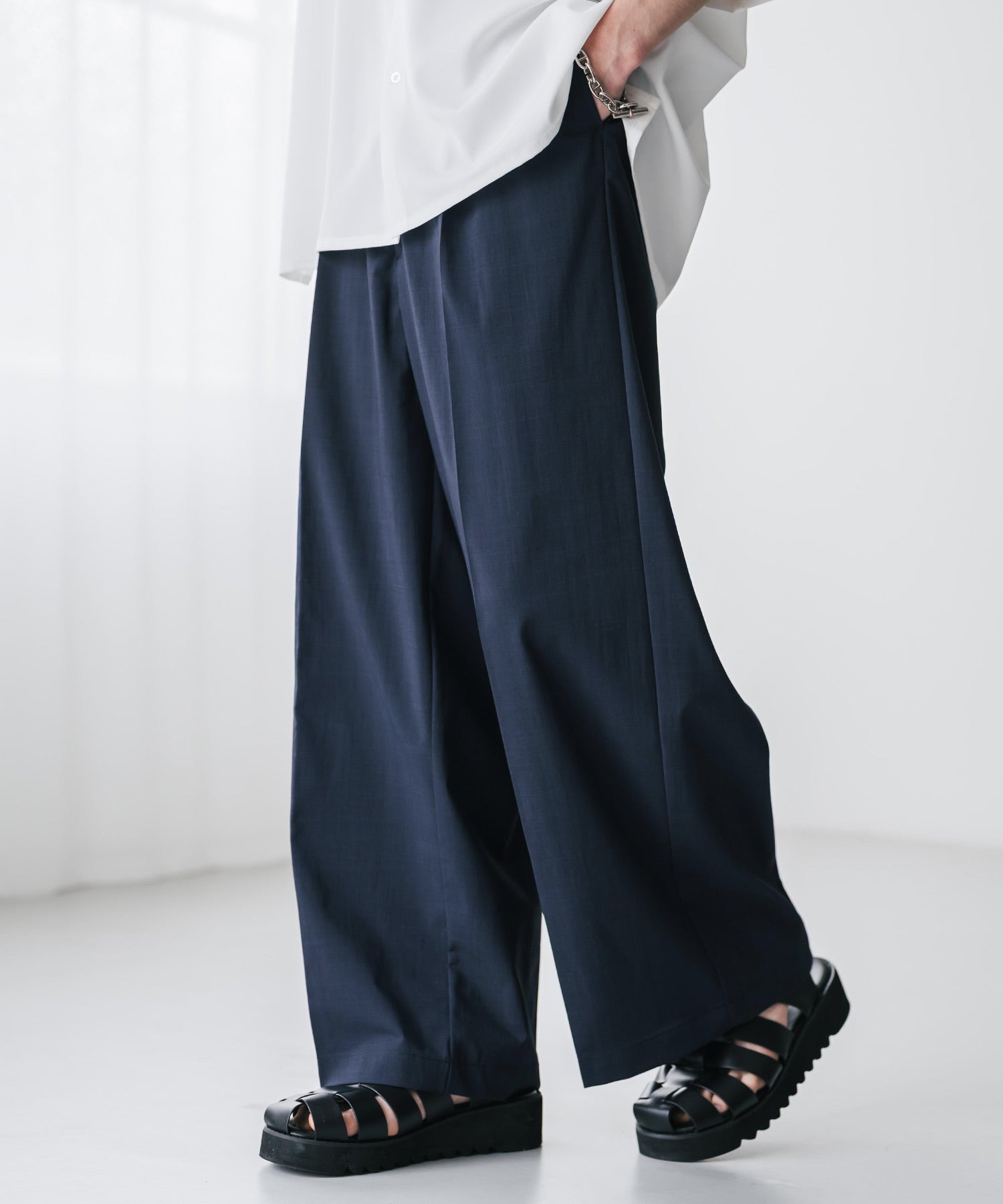 股上が深く、裾に向かってストンと落ちるようなワイドシルエット。