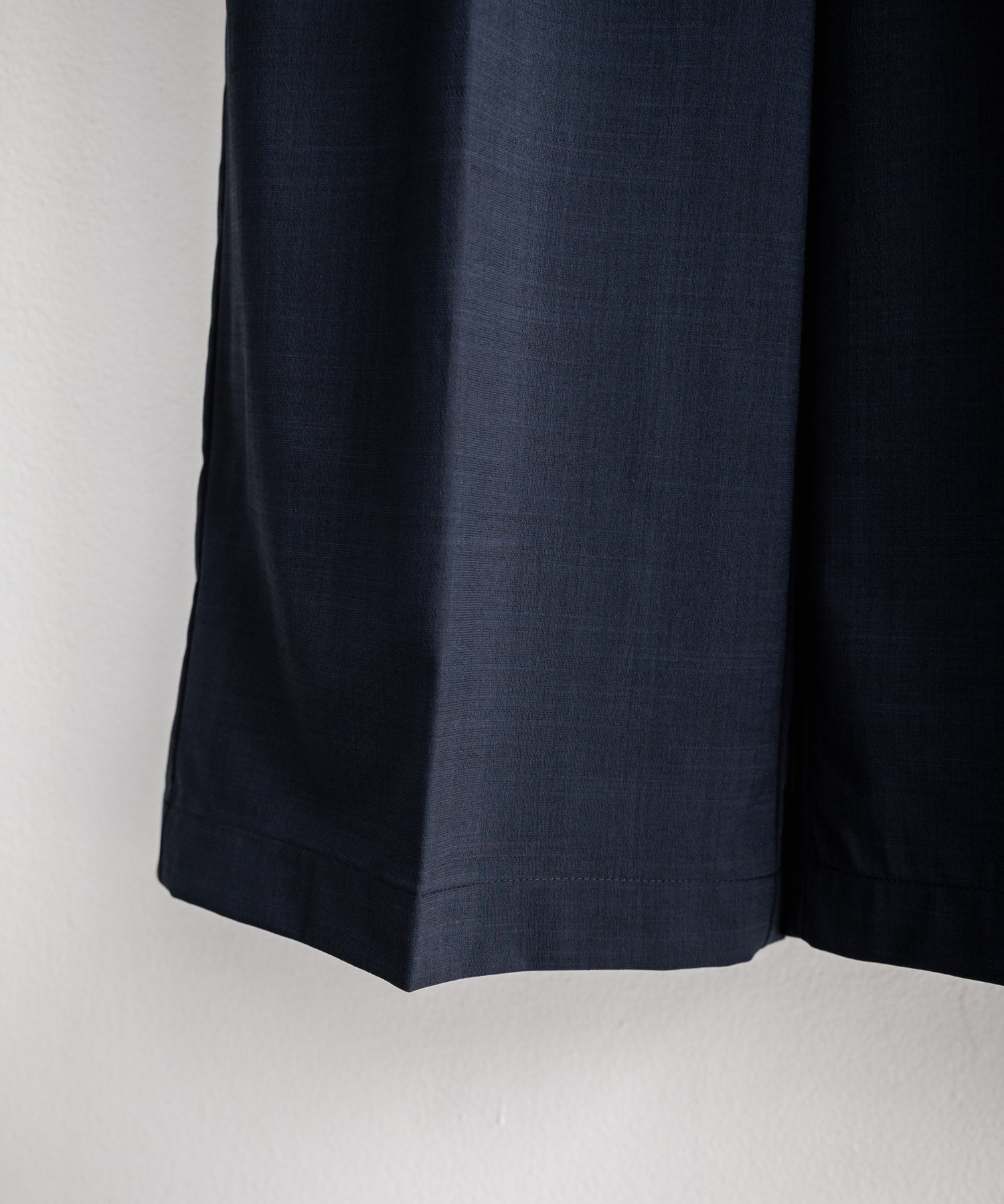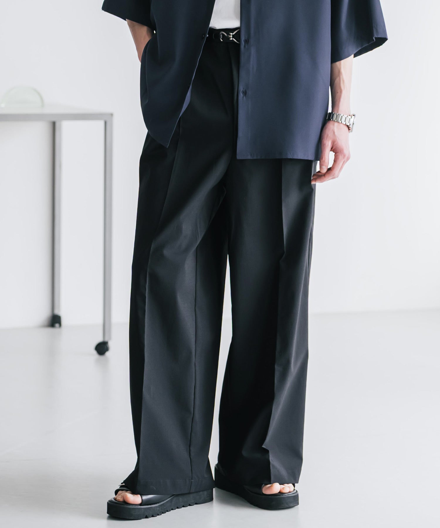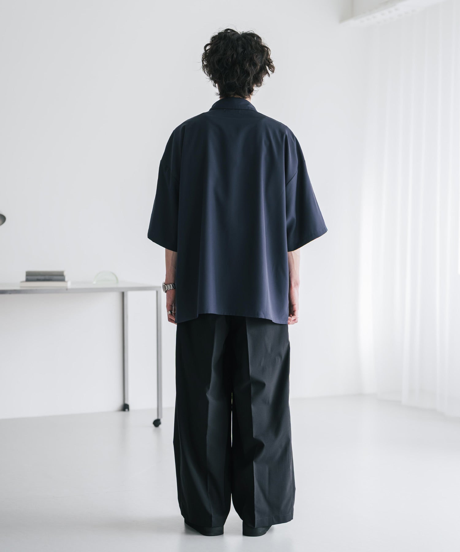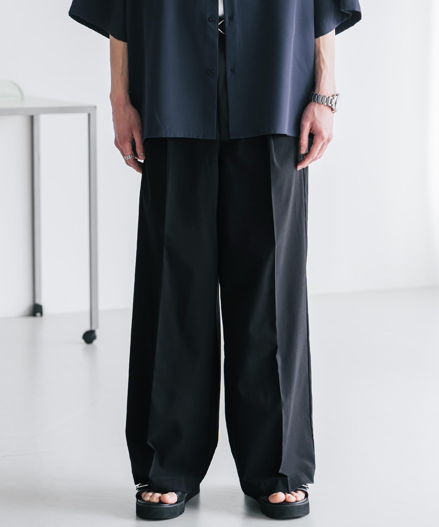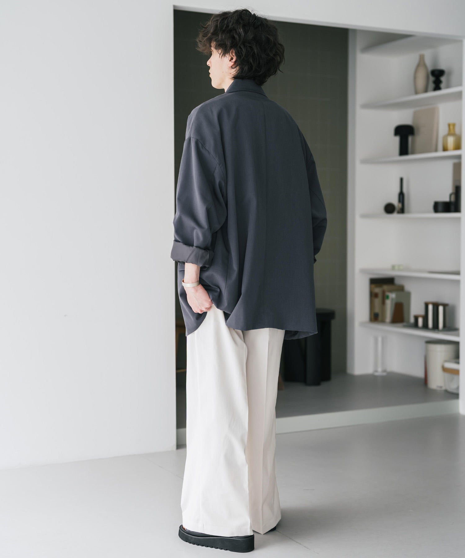 股上が深く、裾に向かってストンと落ちるようなワイドシルエット。