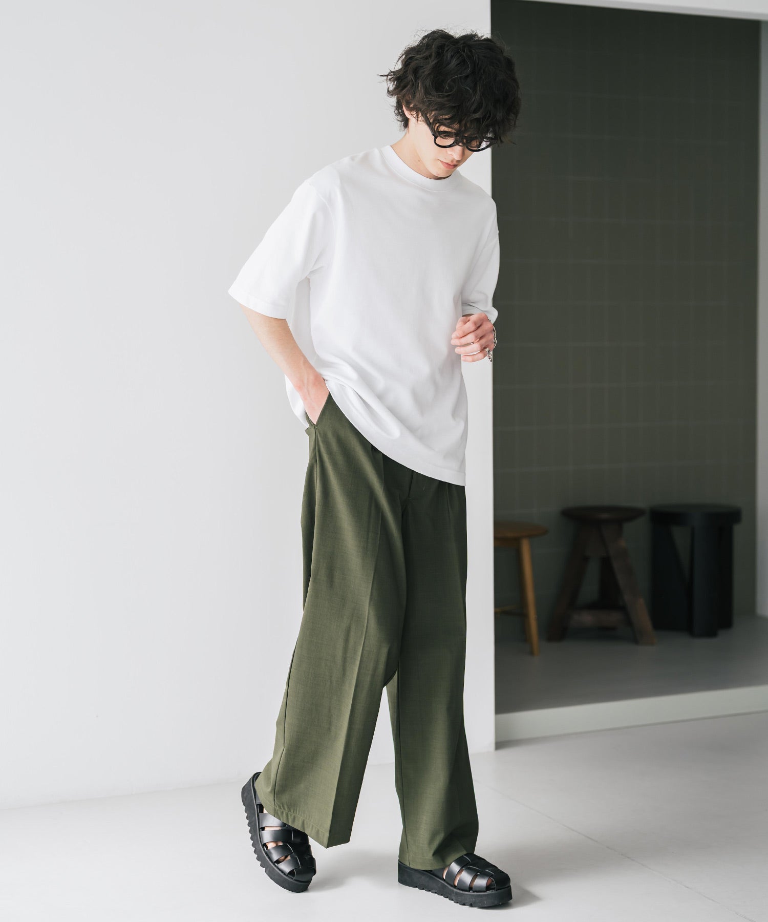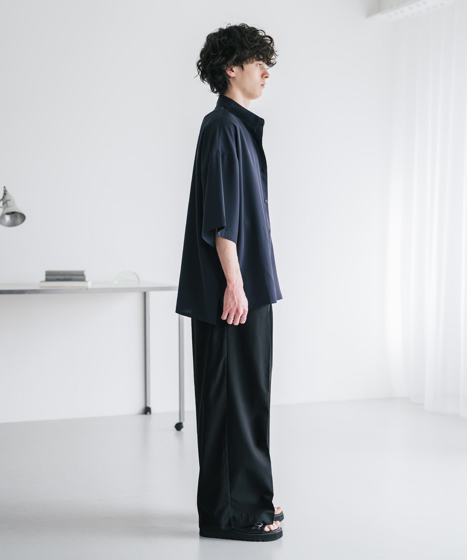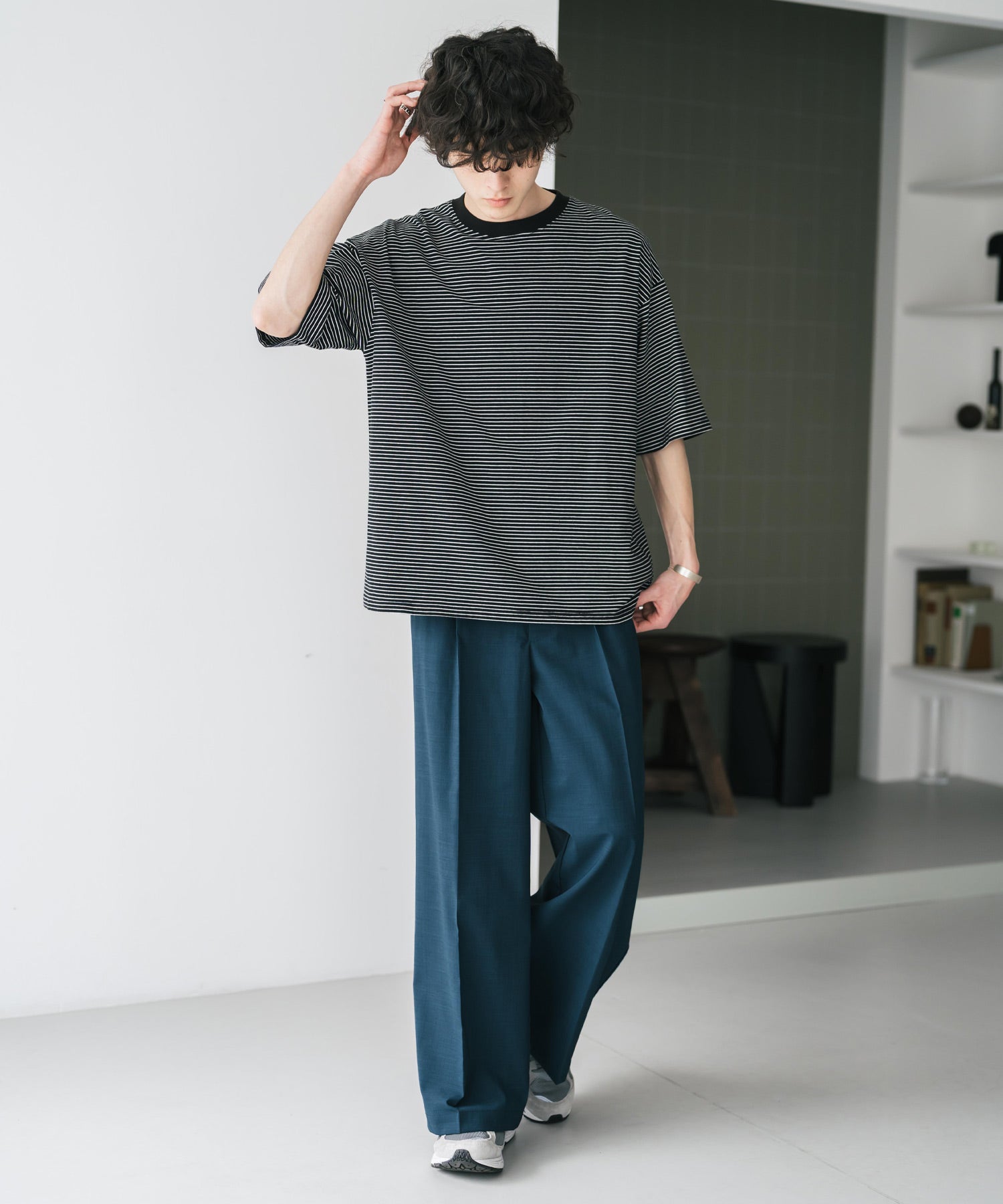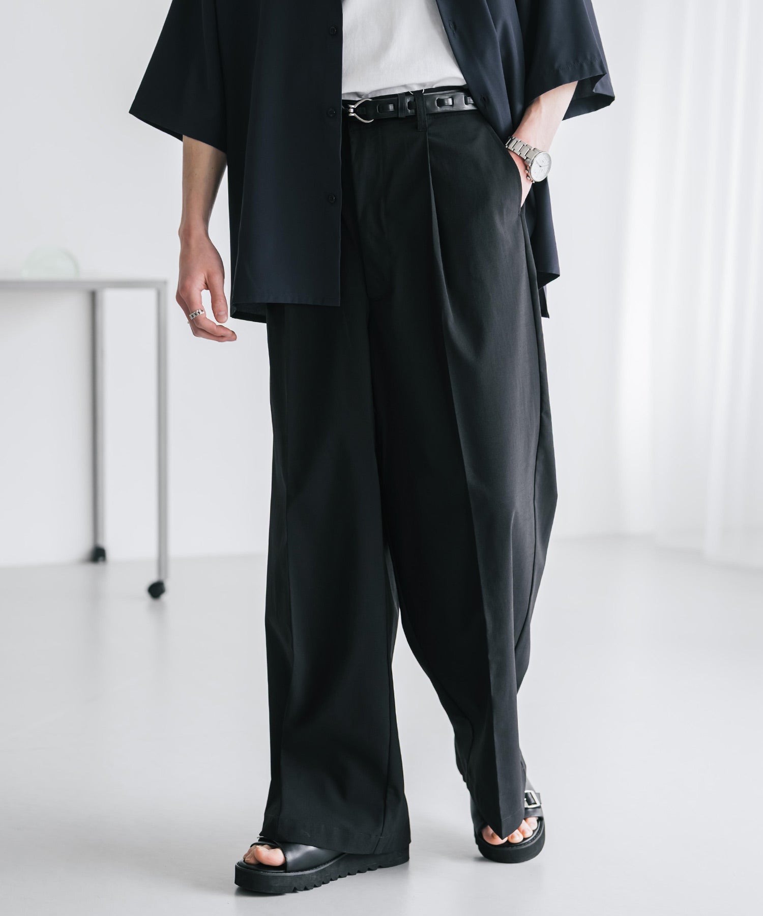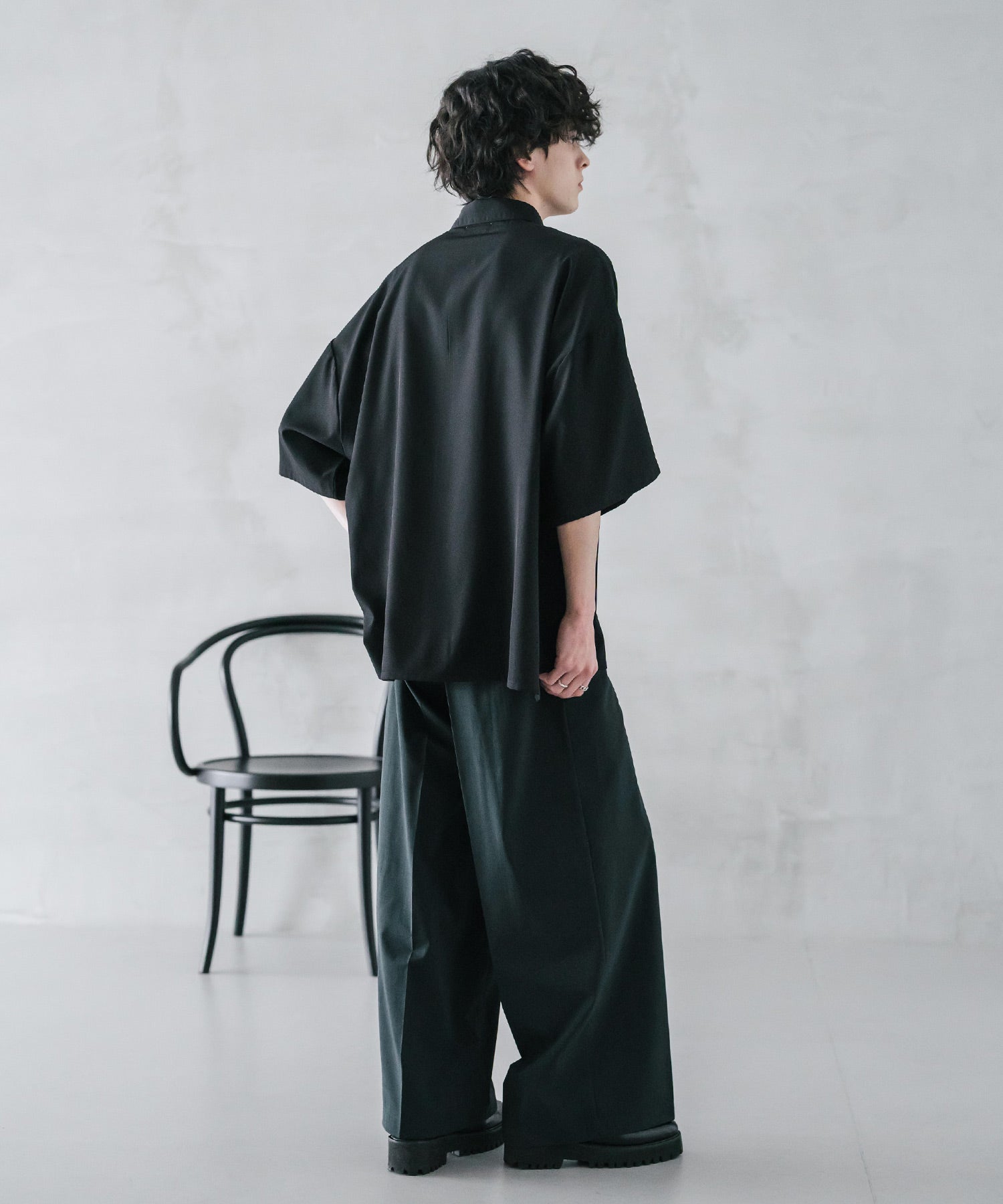 股上が深く、裾に向かってストンと落ちるようなワイドシルエット。