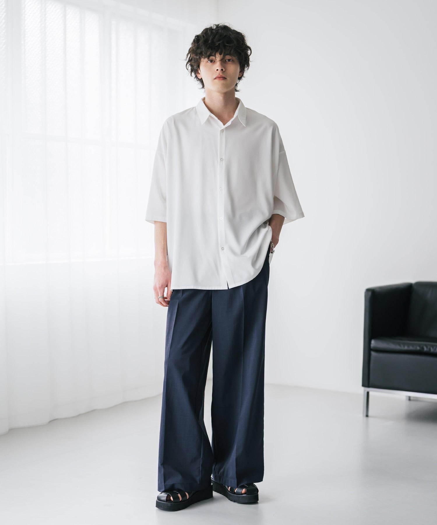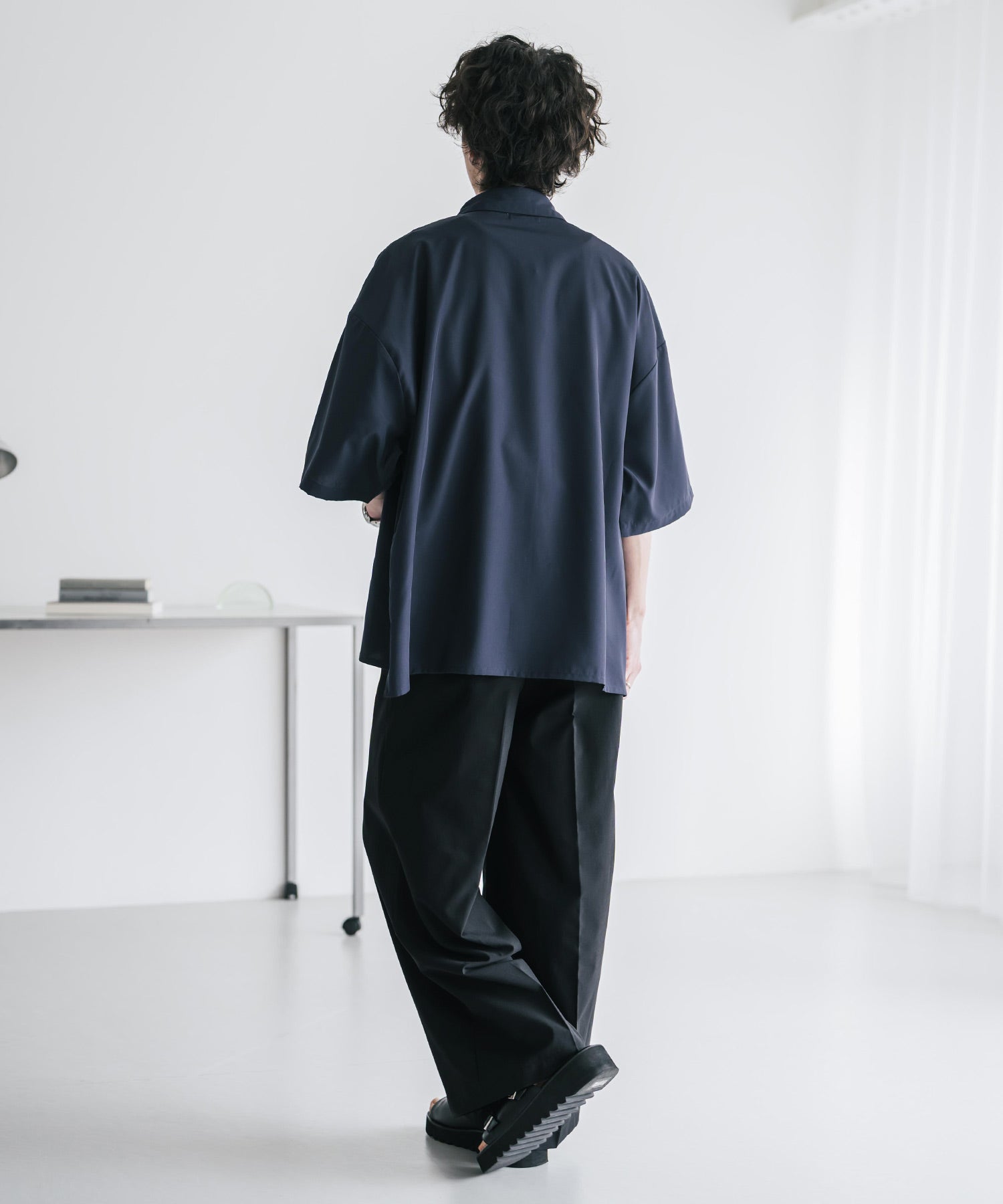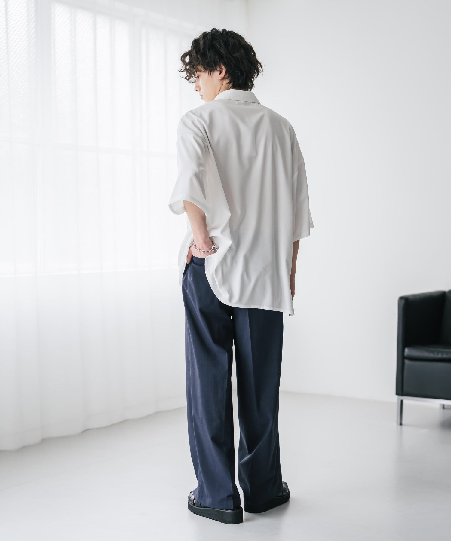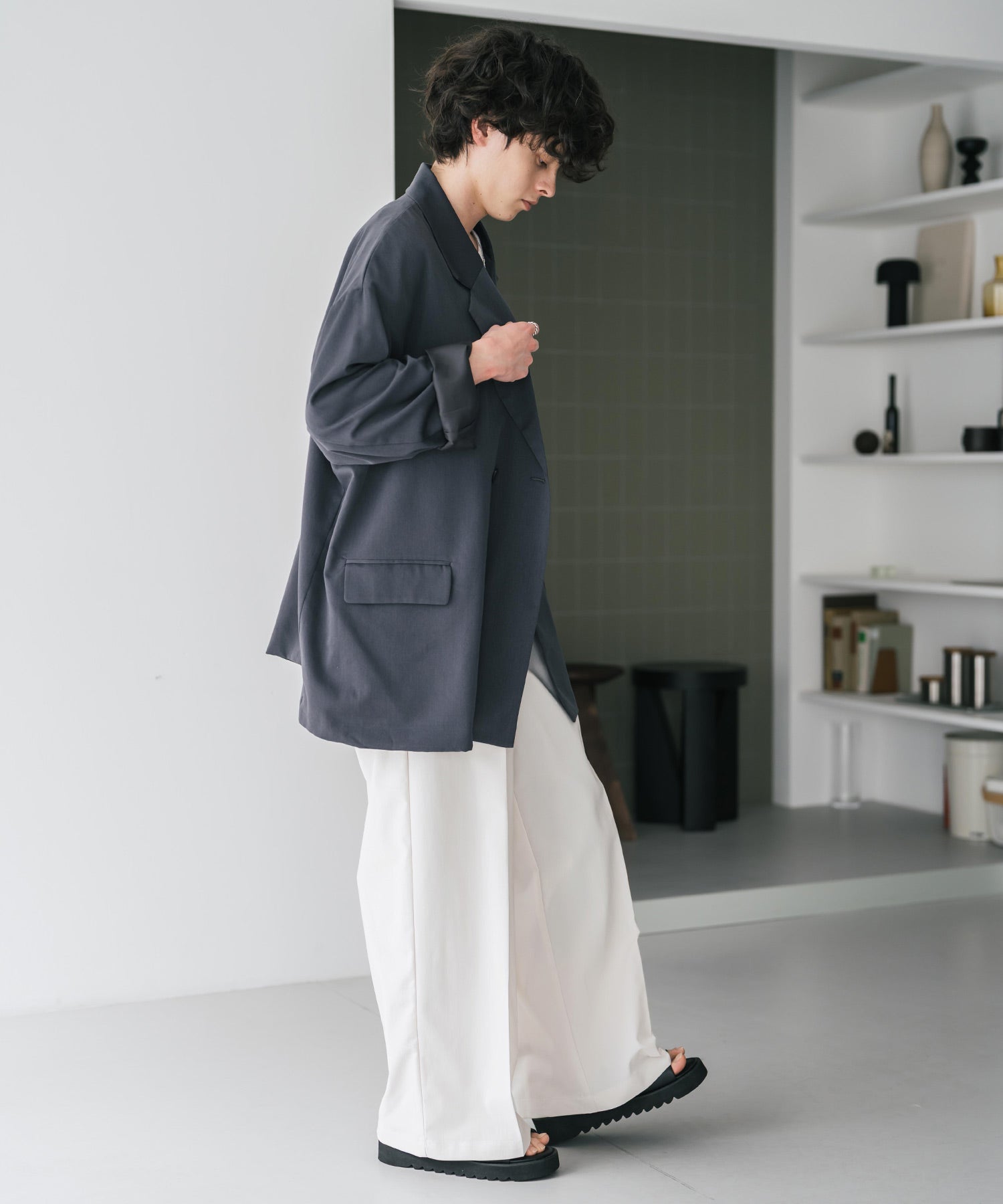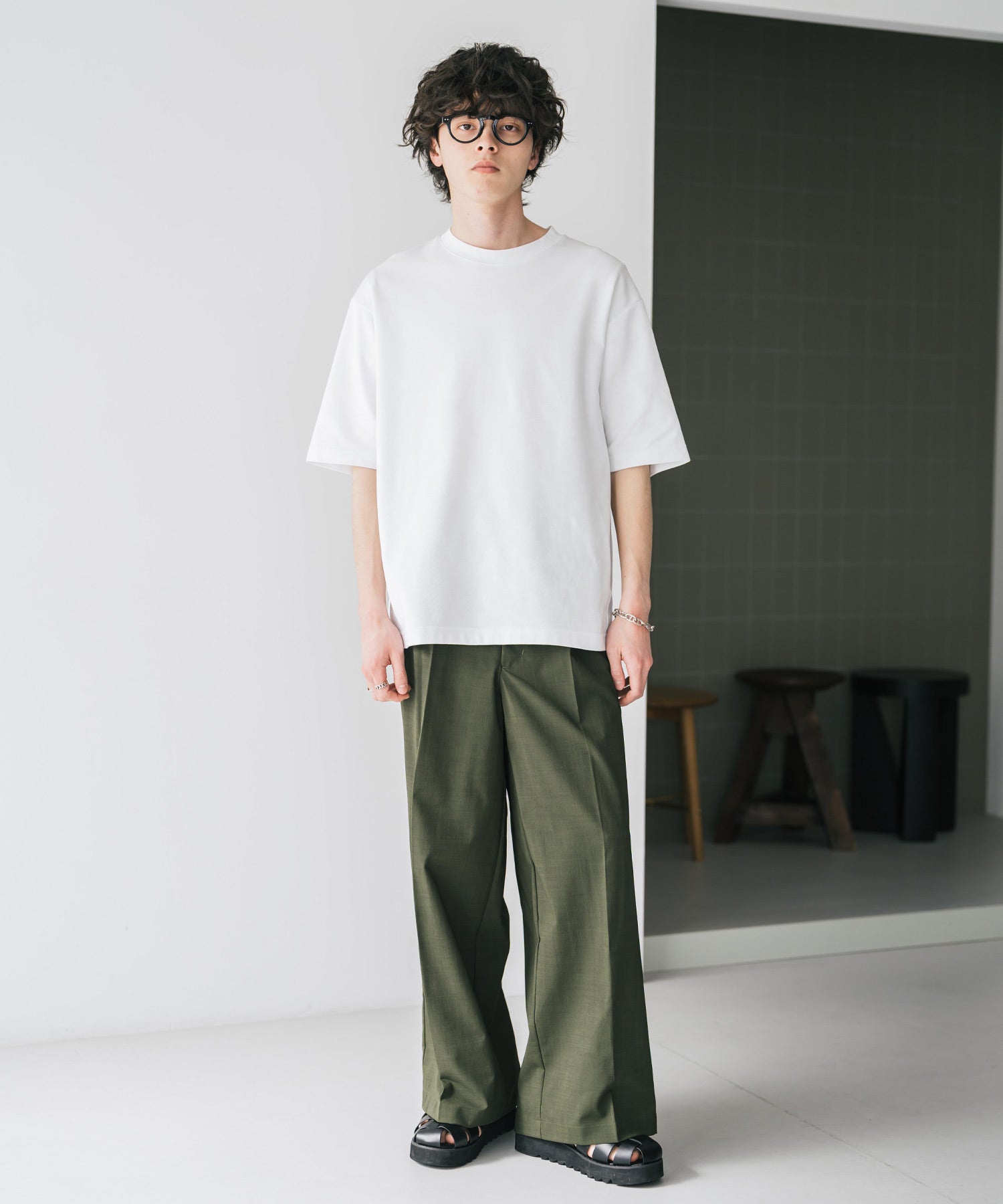 股上が深く、裾に向かってストンと落ちるようなワイドシルエット。