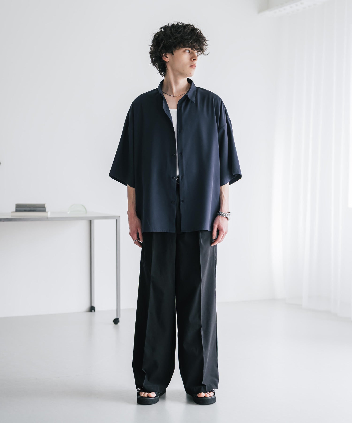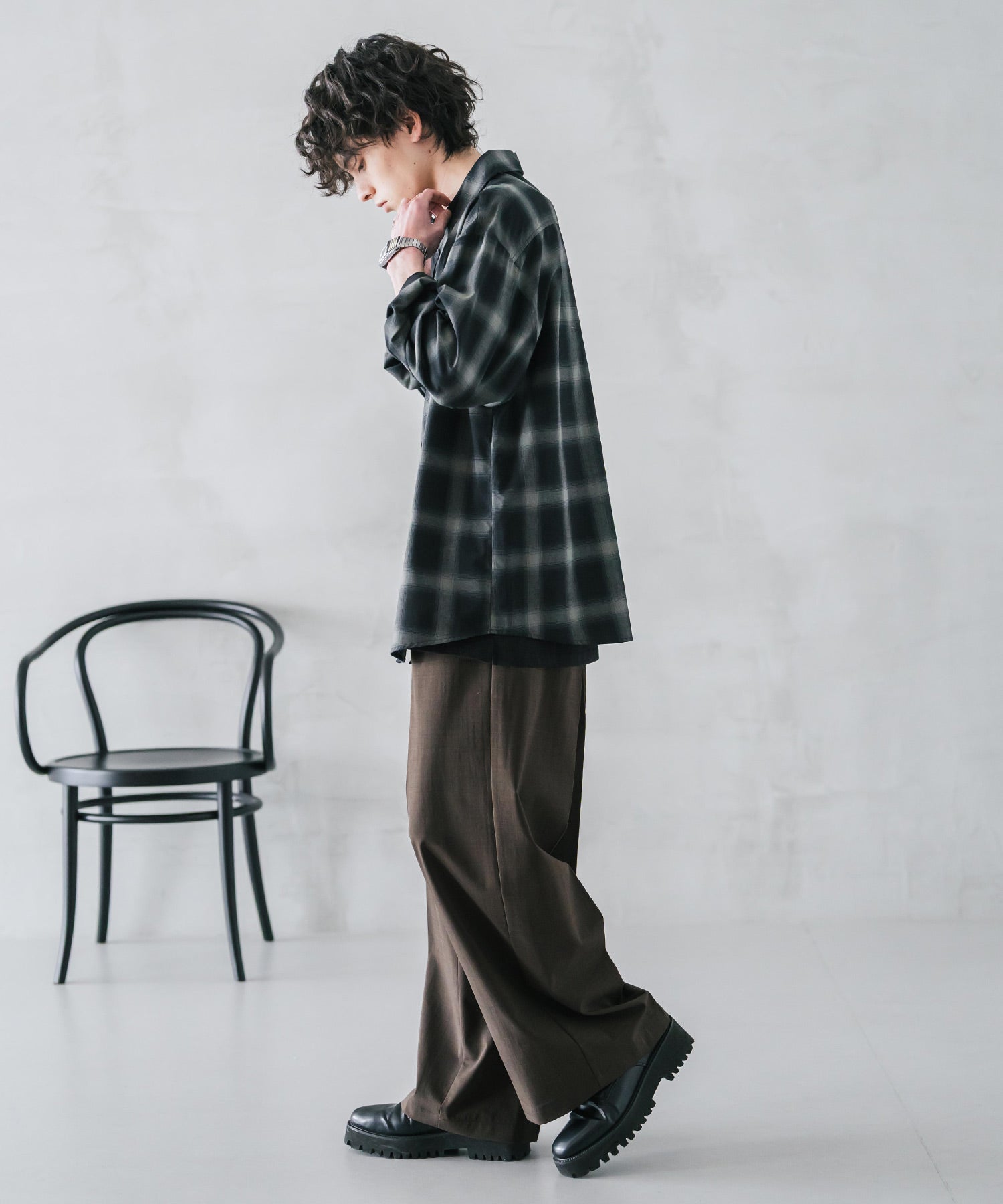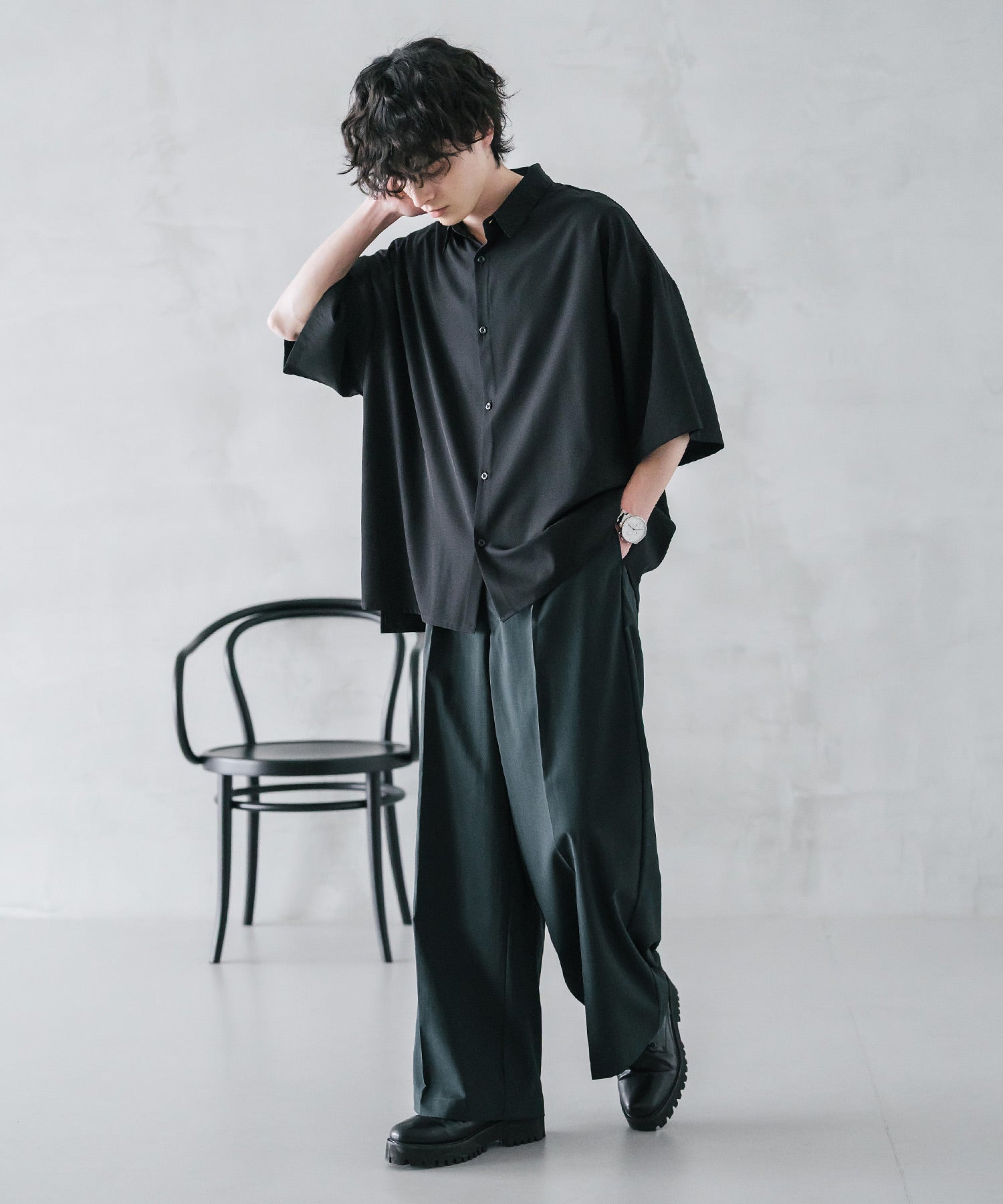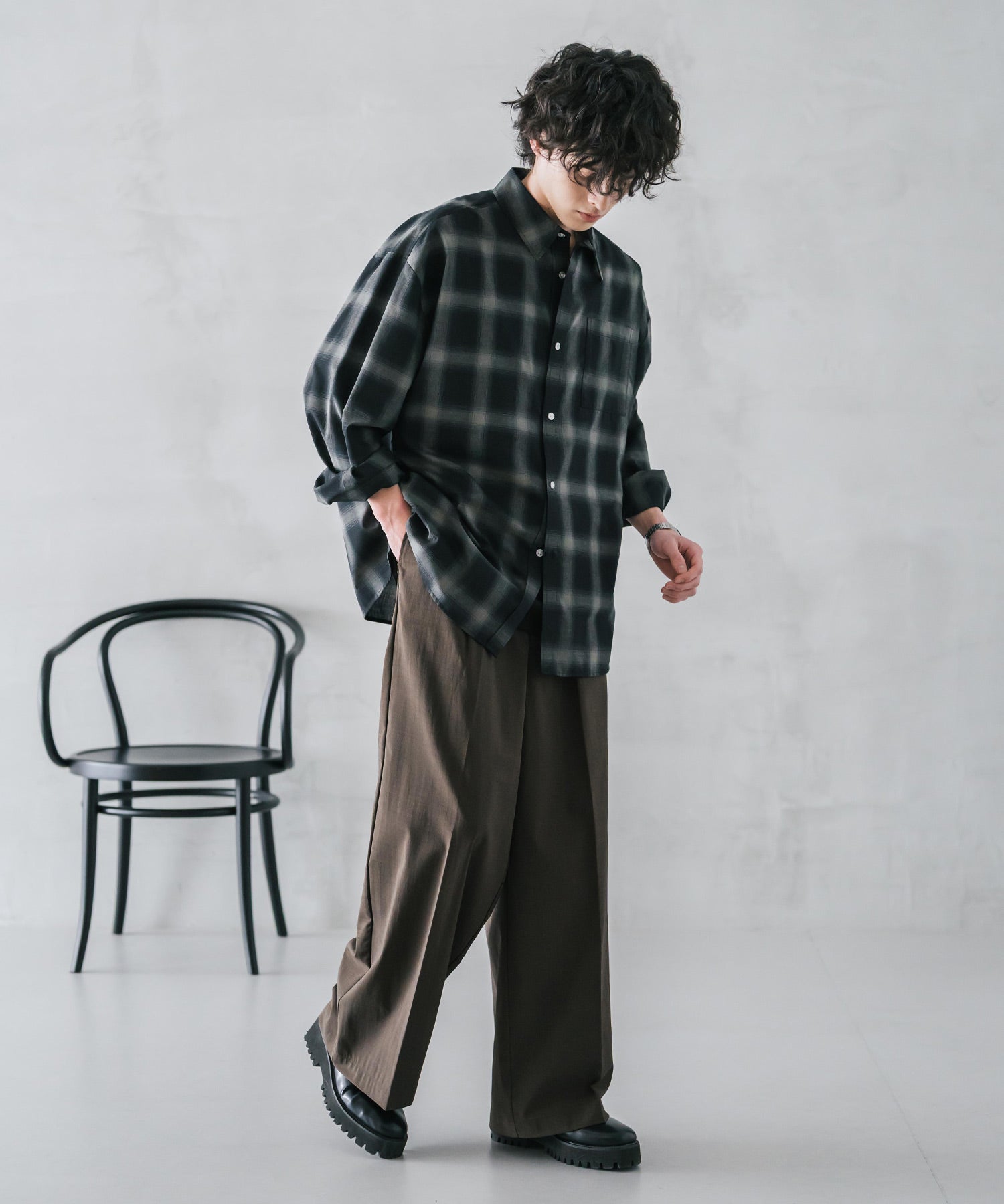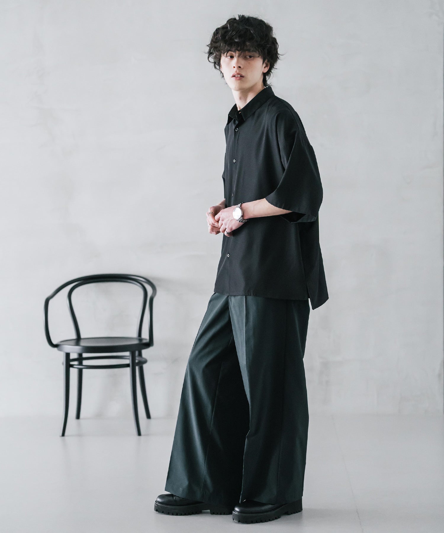 股上が深く、裾に向かってストンと落ちるようなワイドシルエット。