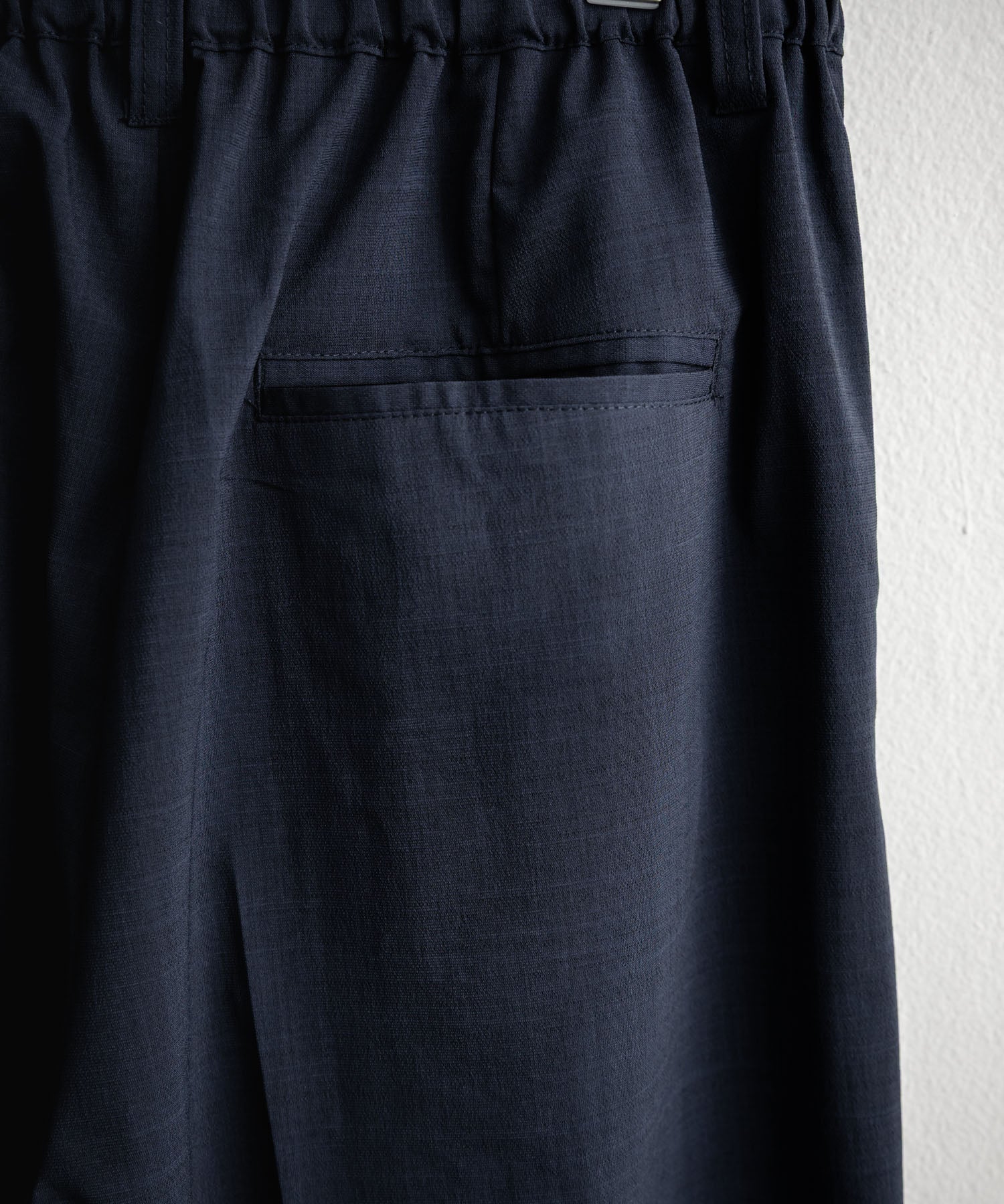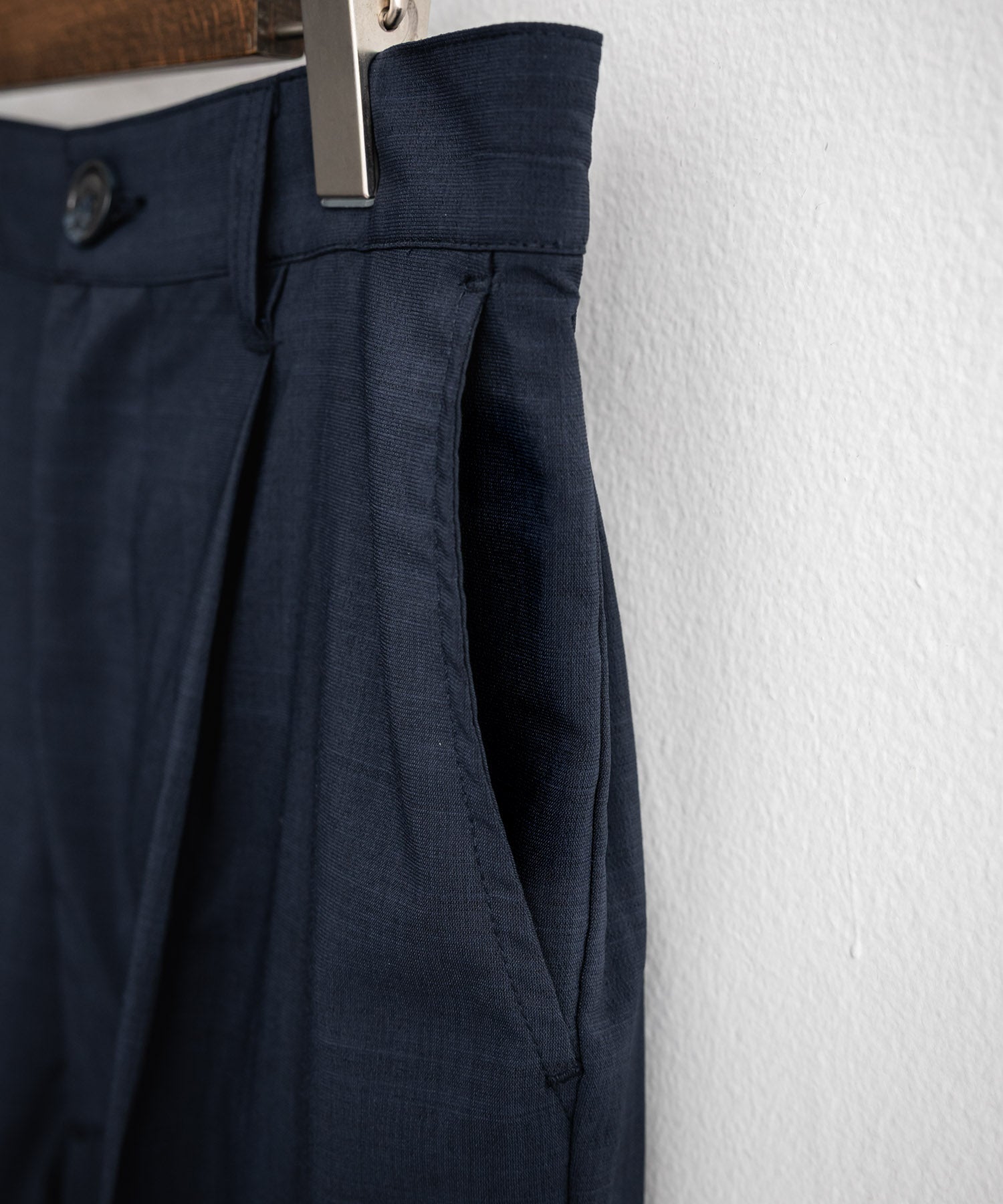 上品な佇まいのスラッシュポケットと玉縁ポケットを施しています。