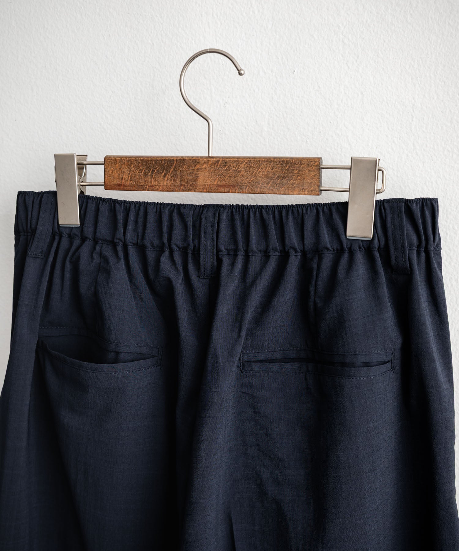 ウエストは後ろのみゴムを内蔵した、締め付け感の少ない着用感。