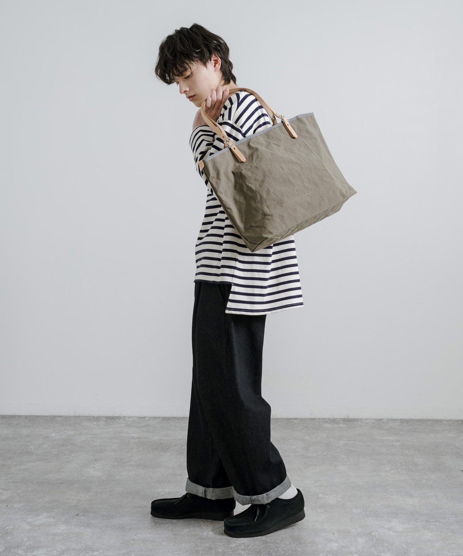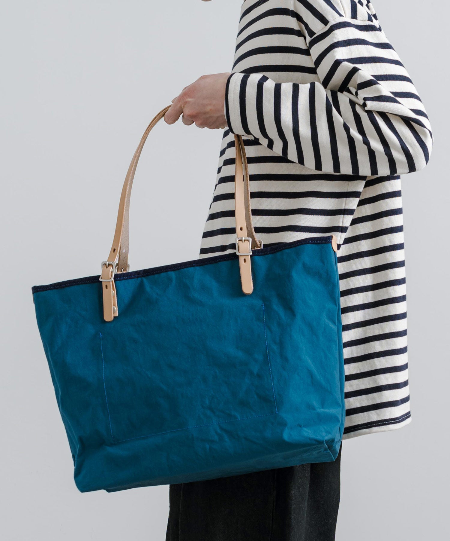 広めに作られたマチには、底板を備えているため物を入れても安定感があり、持った際のシルエットも綺麗です。