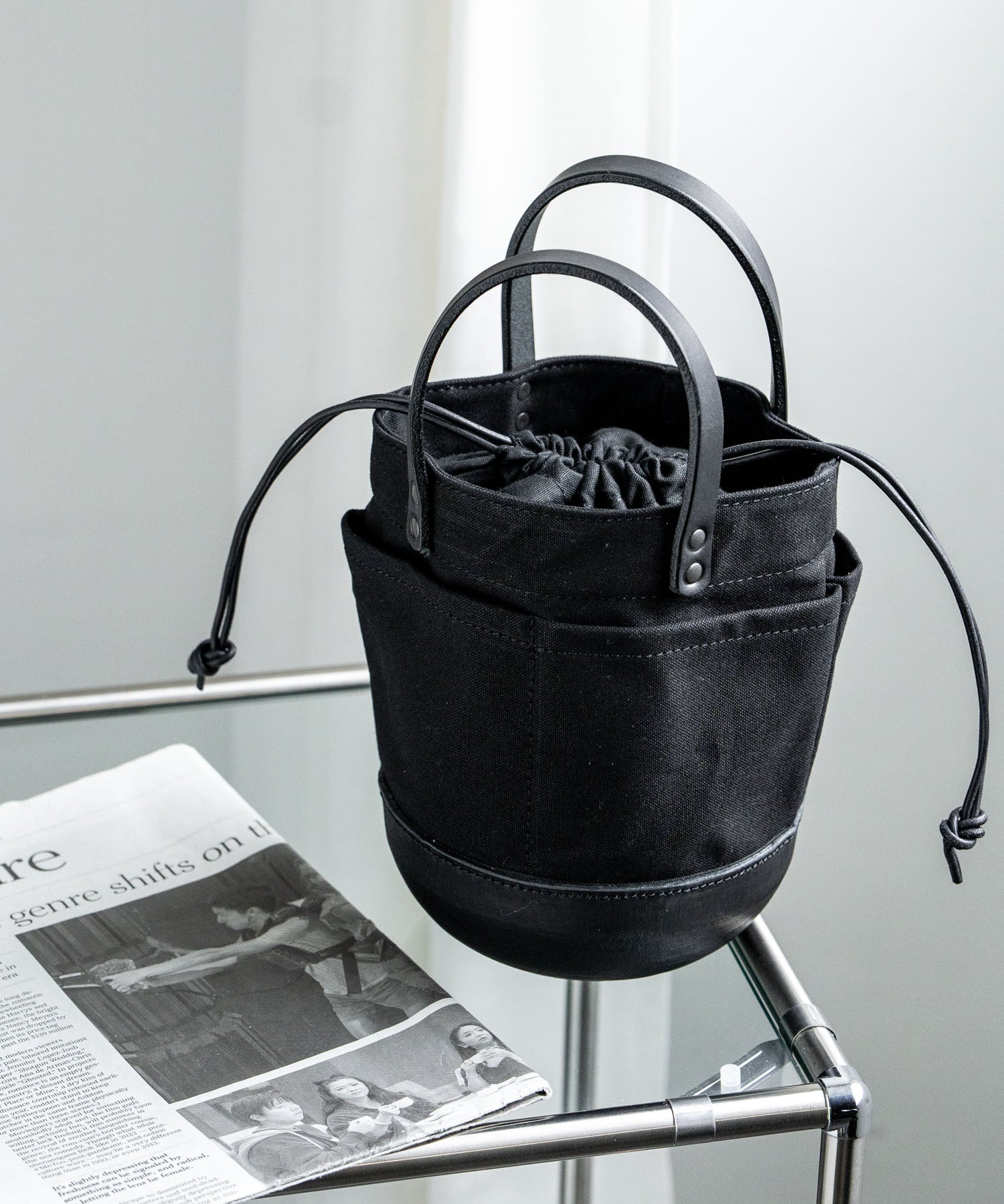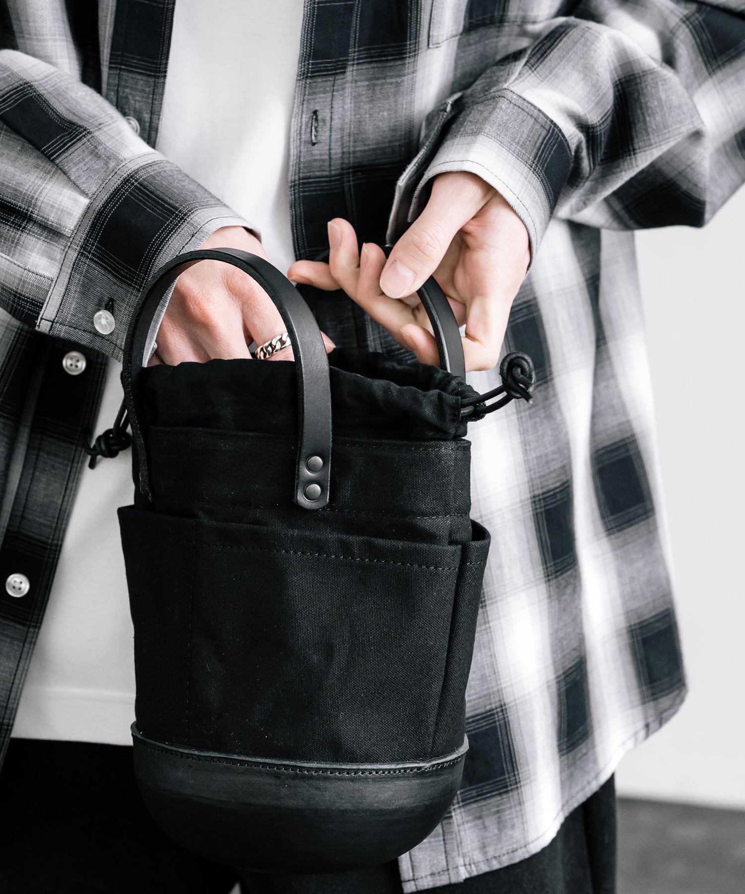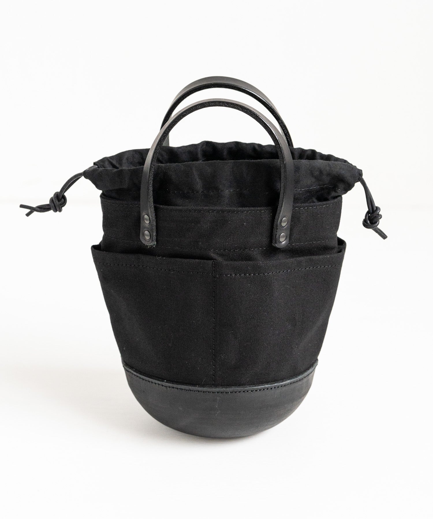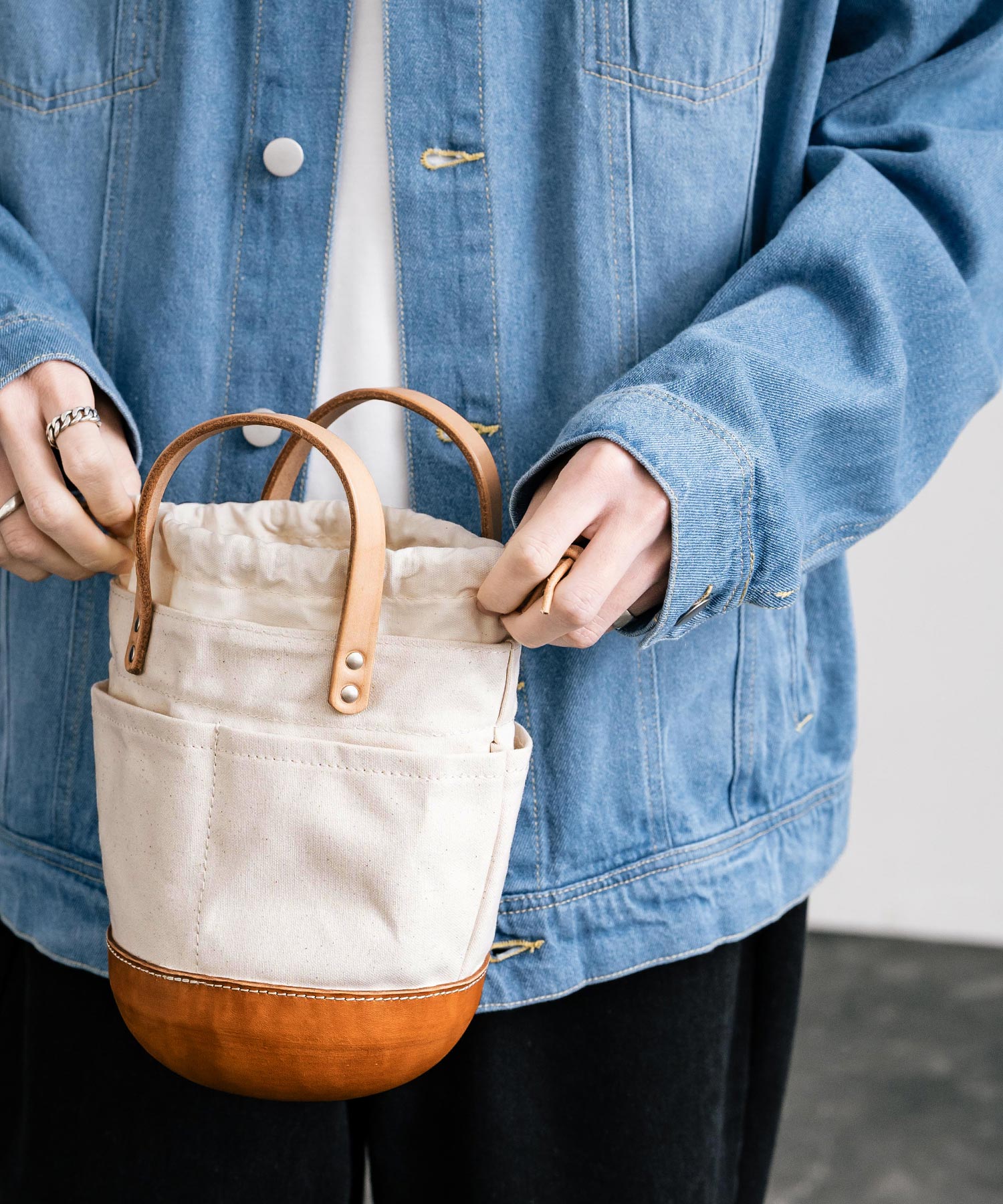 外ポケットと上部の巾着を組み合わせたツールバッグ風のデザインで、