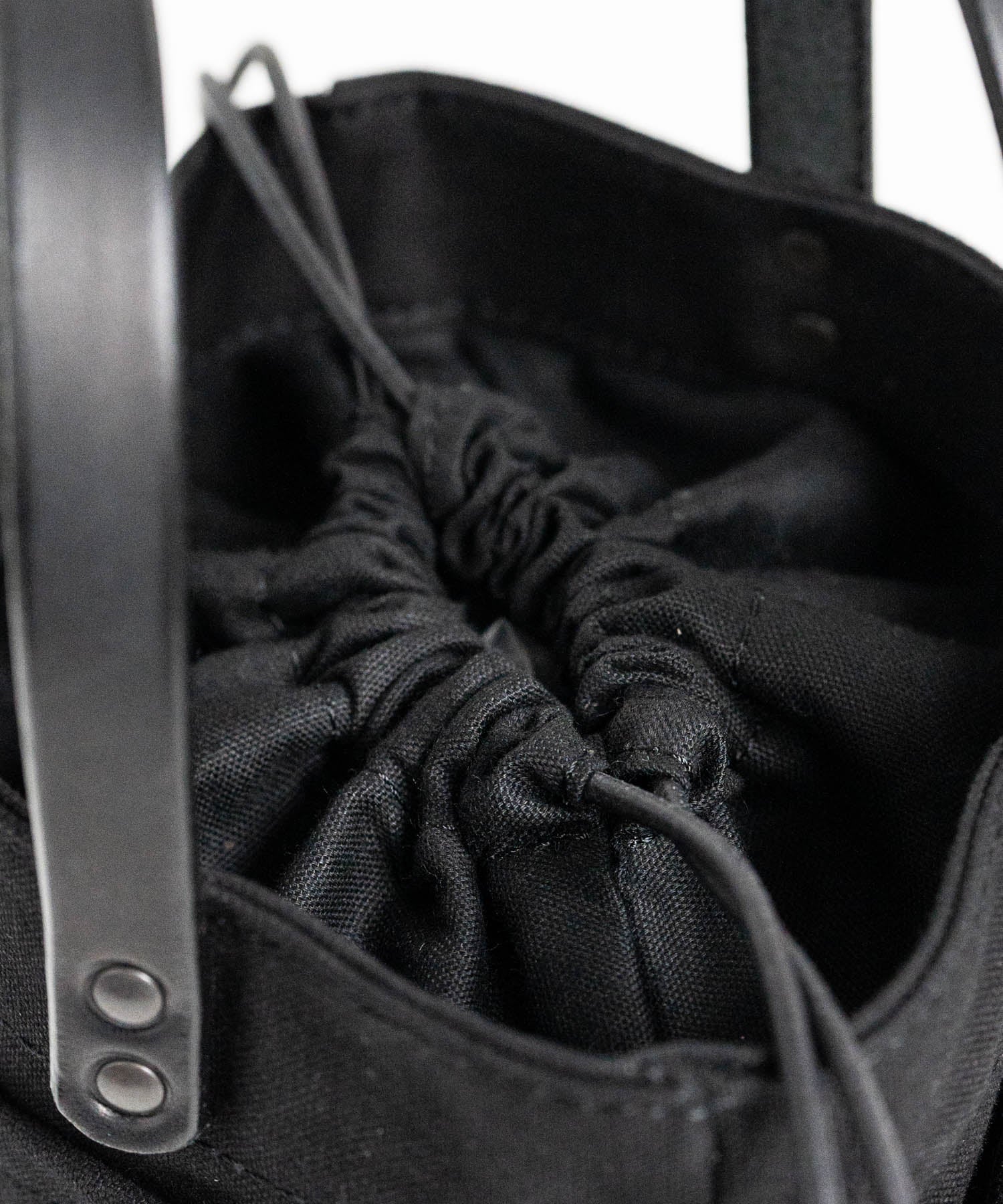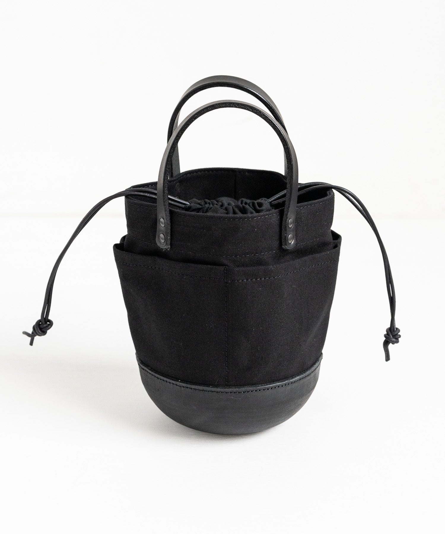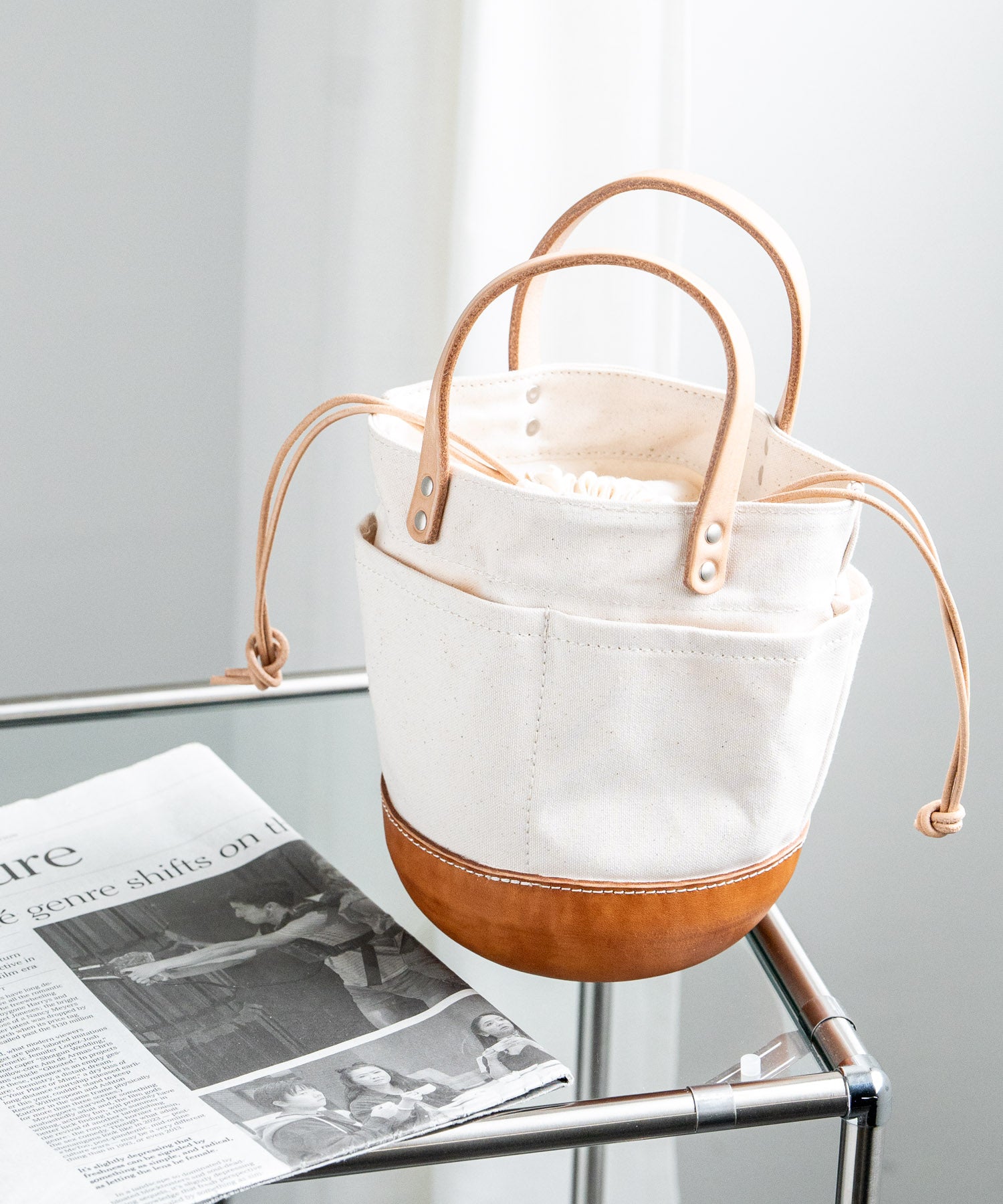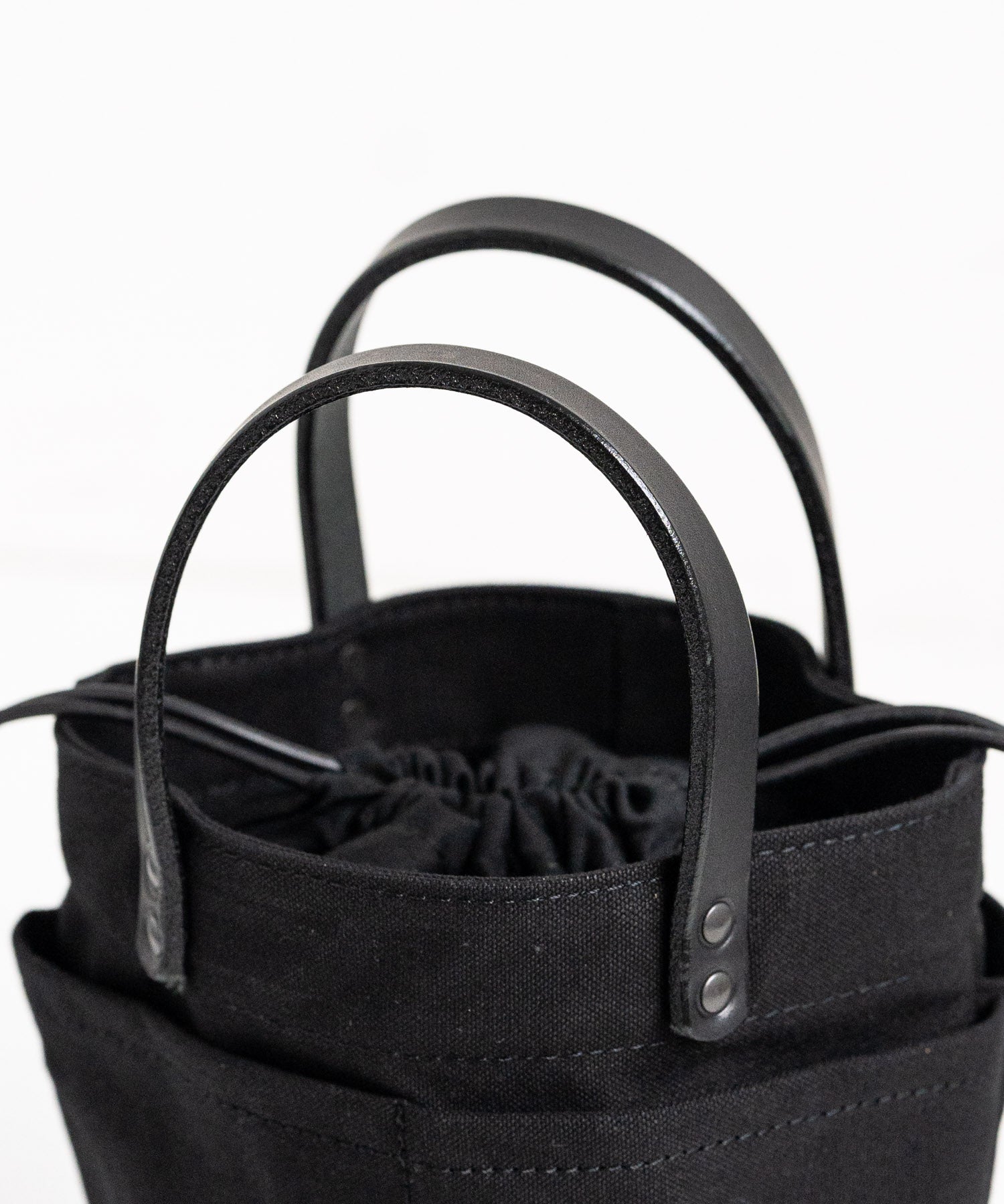 外ポケットと上部の巾着を組み合わせたツールバッグ風のデザインで、