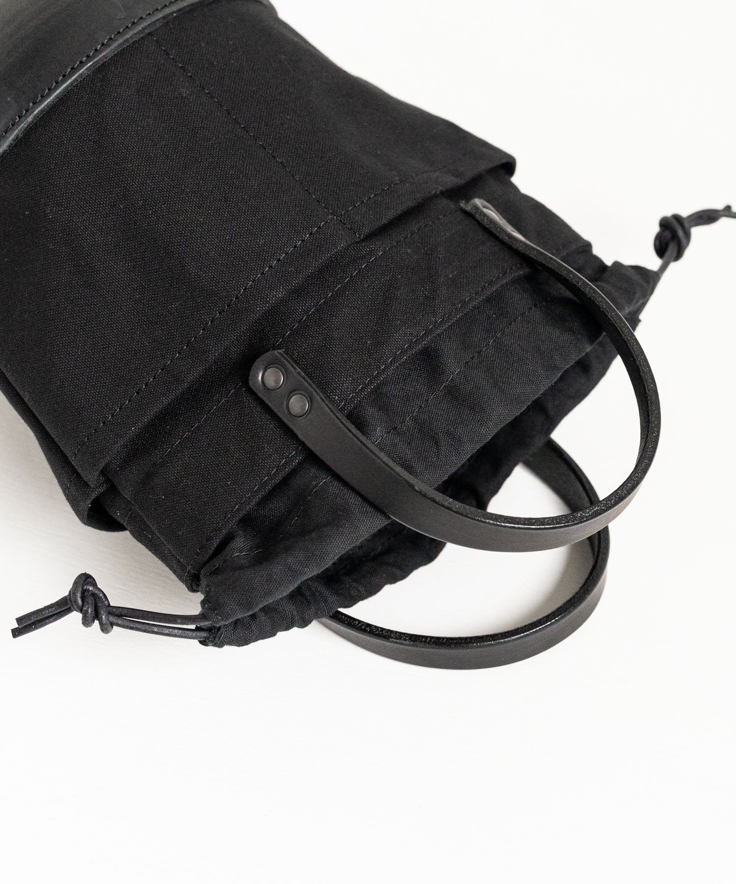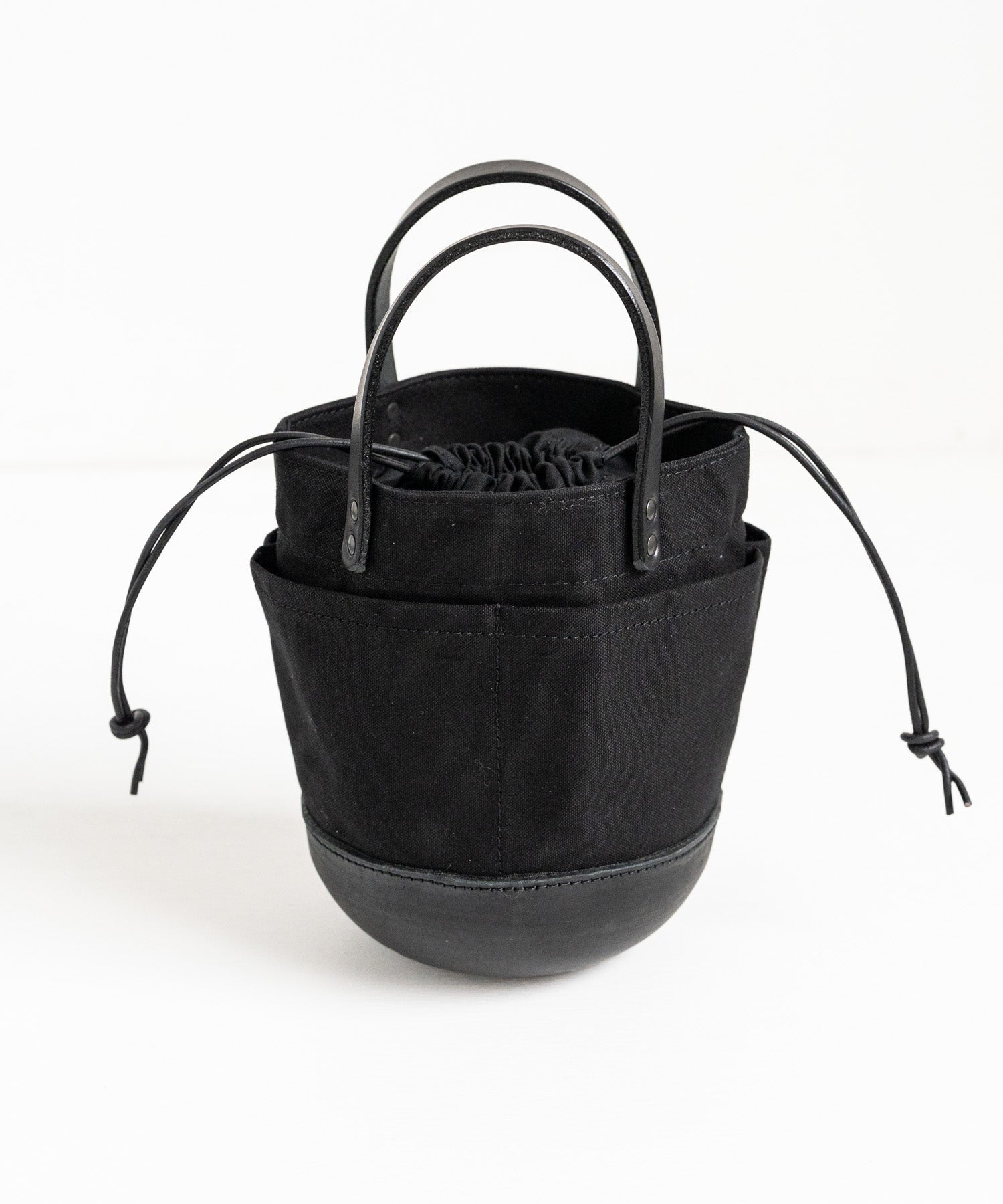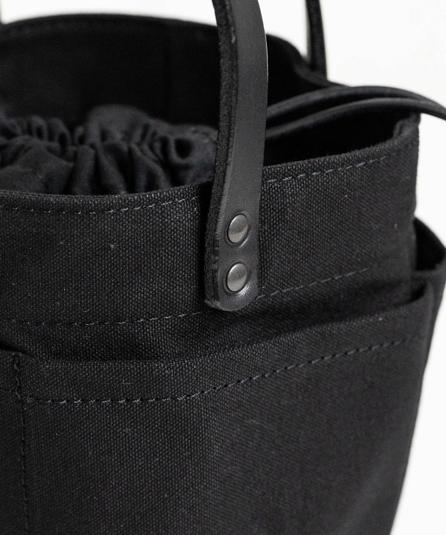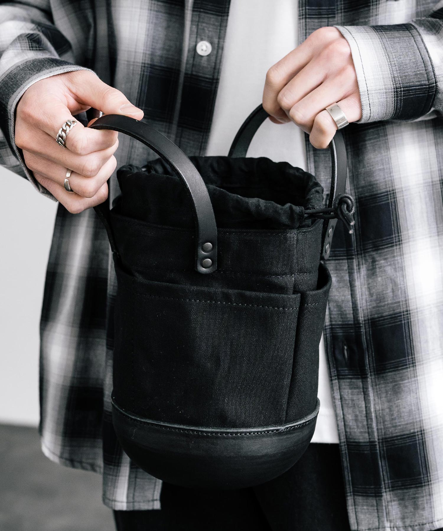 外ポケットと上部の巾着を組み合わせたツールバッグ風のデザインで、