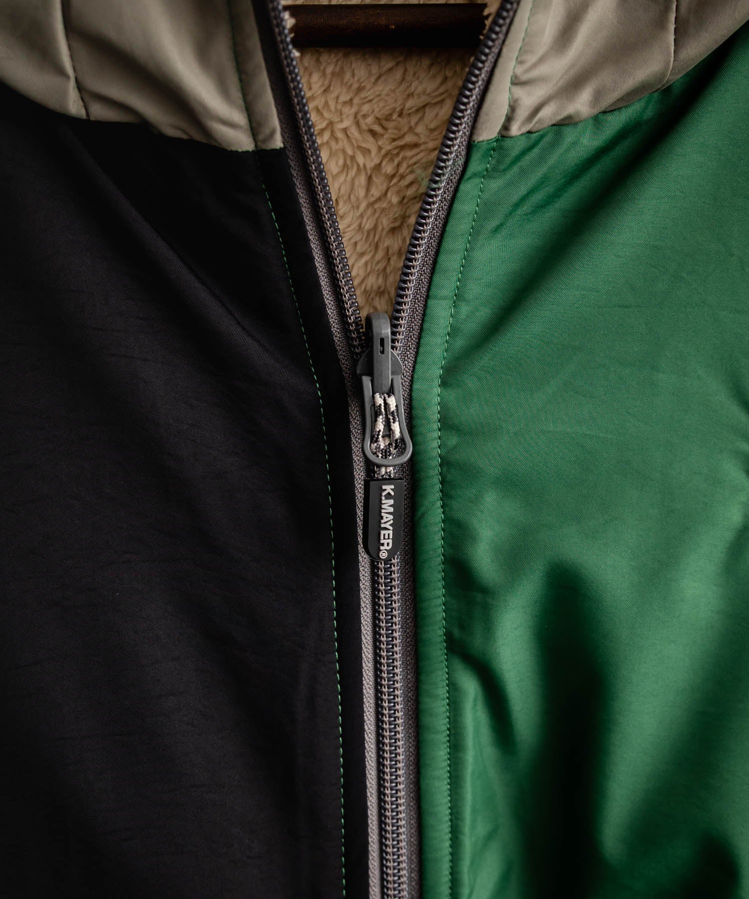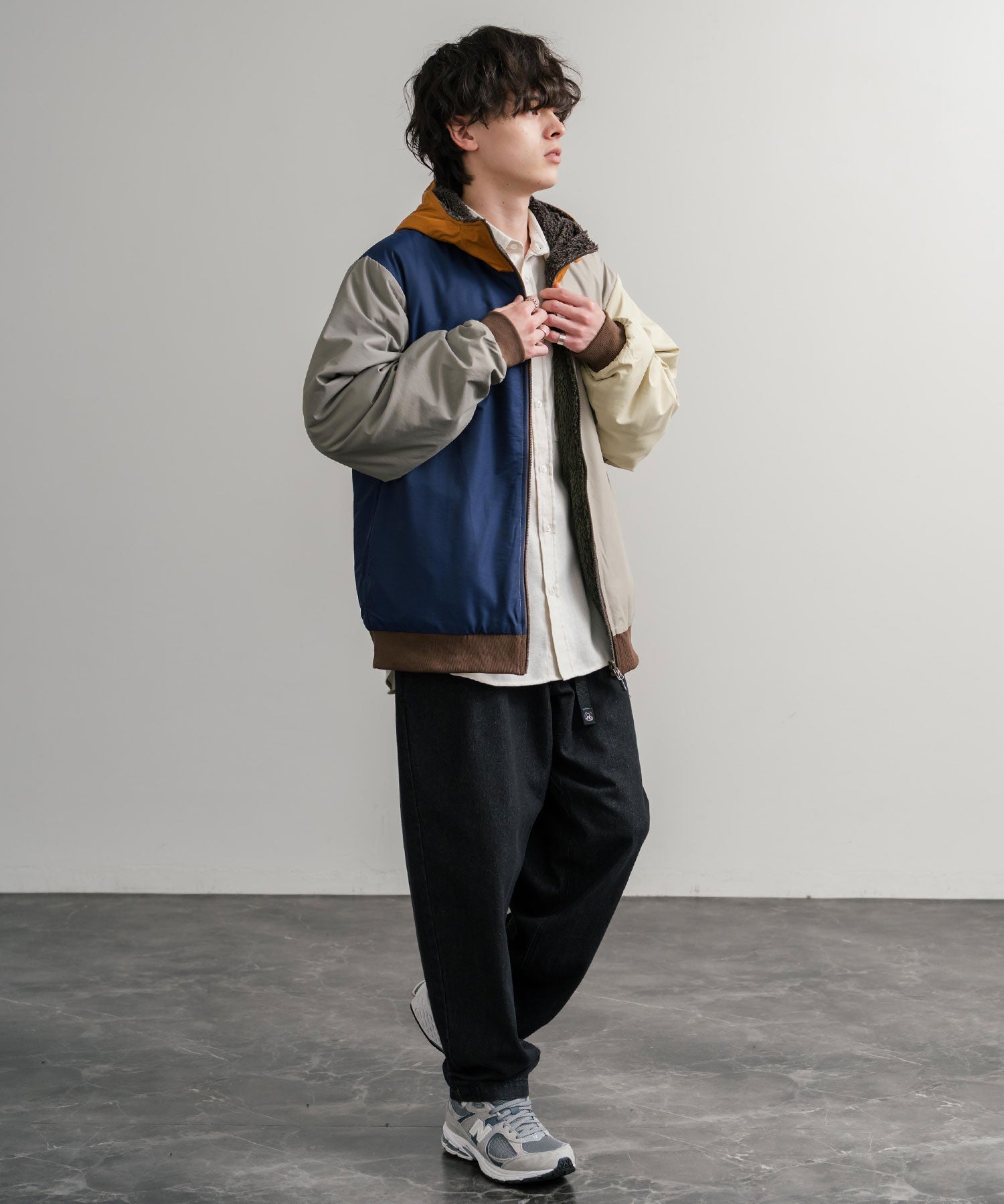 1枚で2つの素材とデザインが楽しめるひっくりフードジャケット。