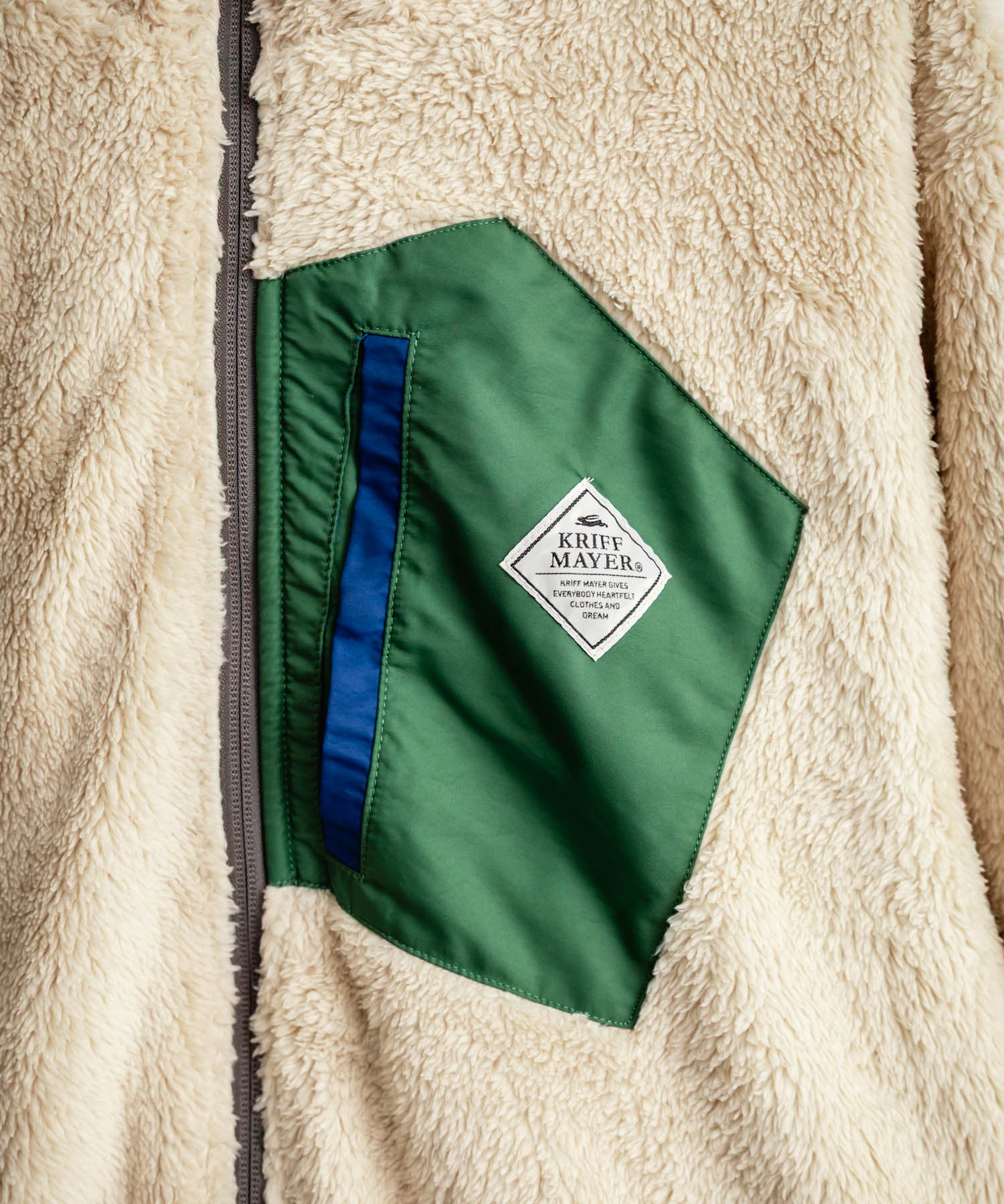 異素材のファスナーポケットを胸元に施したボアフリースの面。