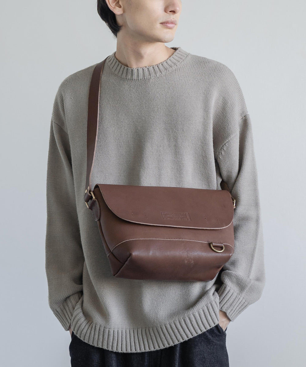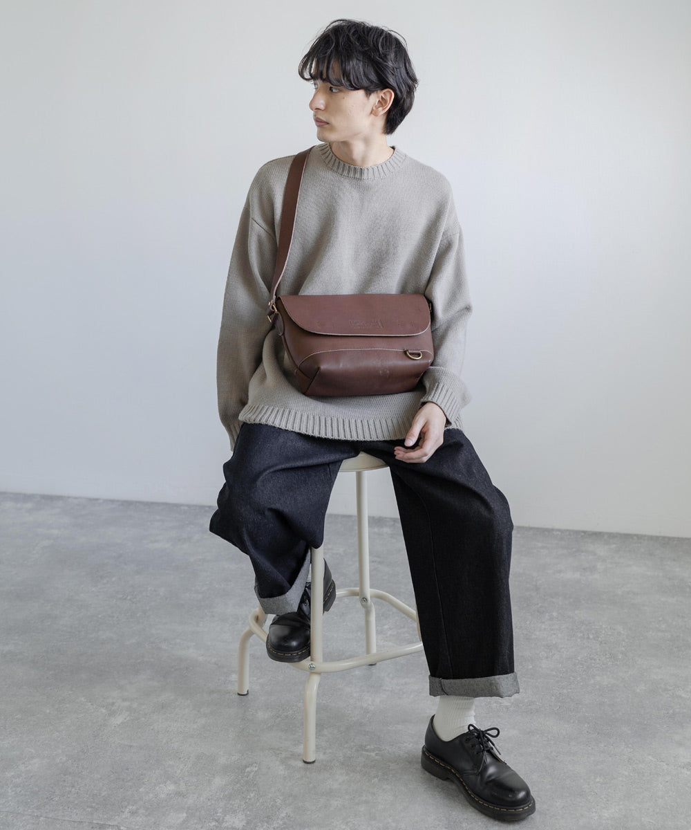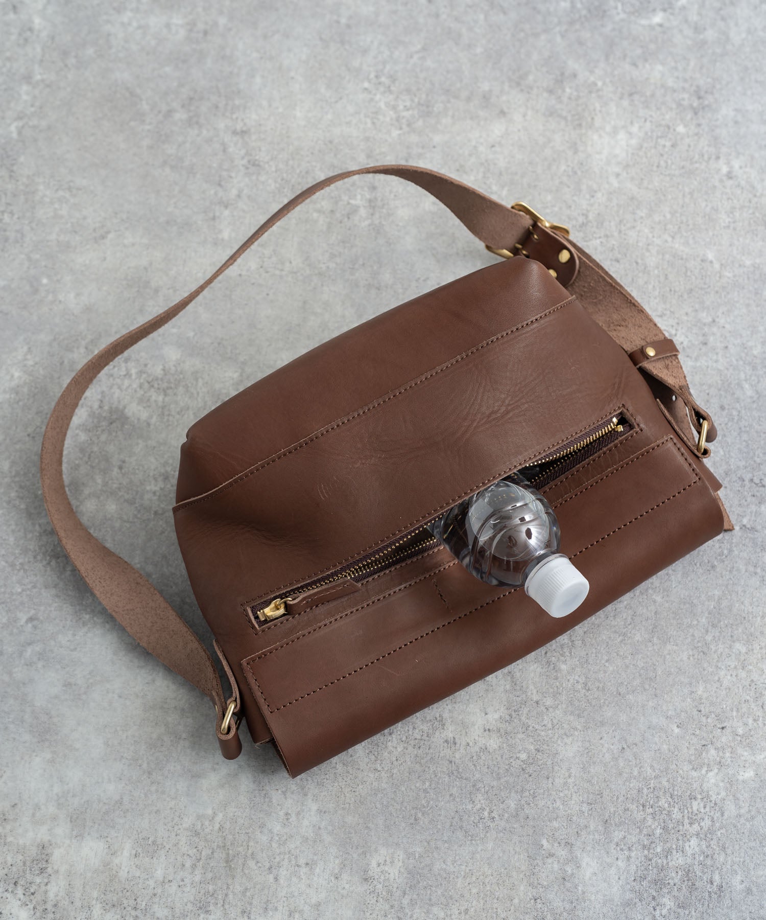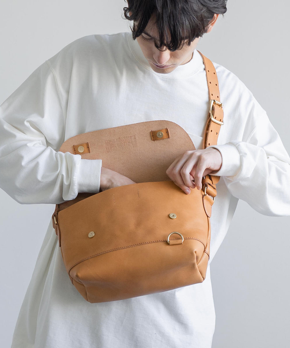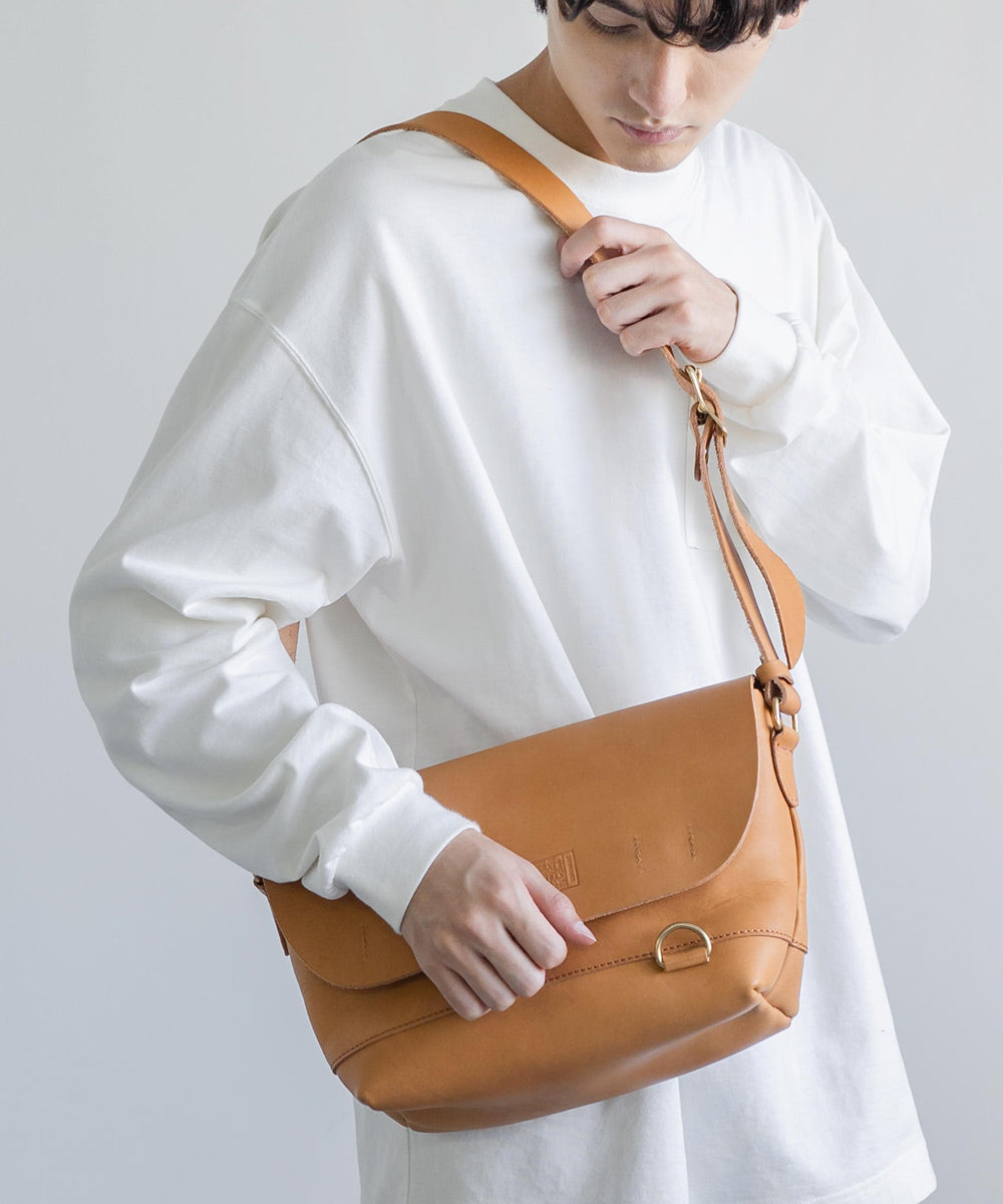 ペットボトルやB5ノートも楽々入るサイズ感の日本製本ヌメ革ショルダー。