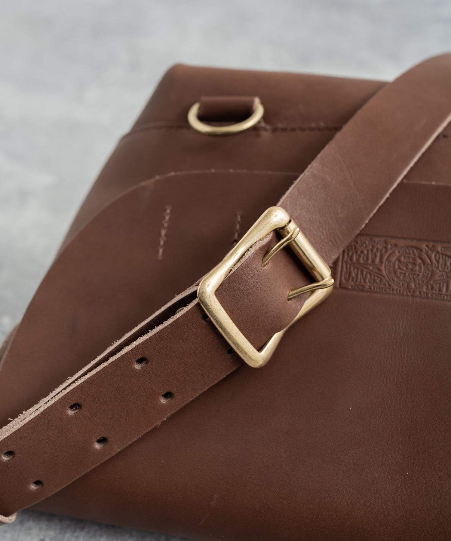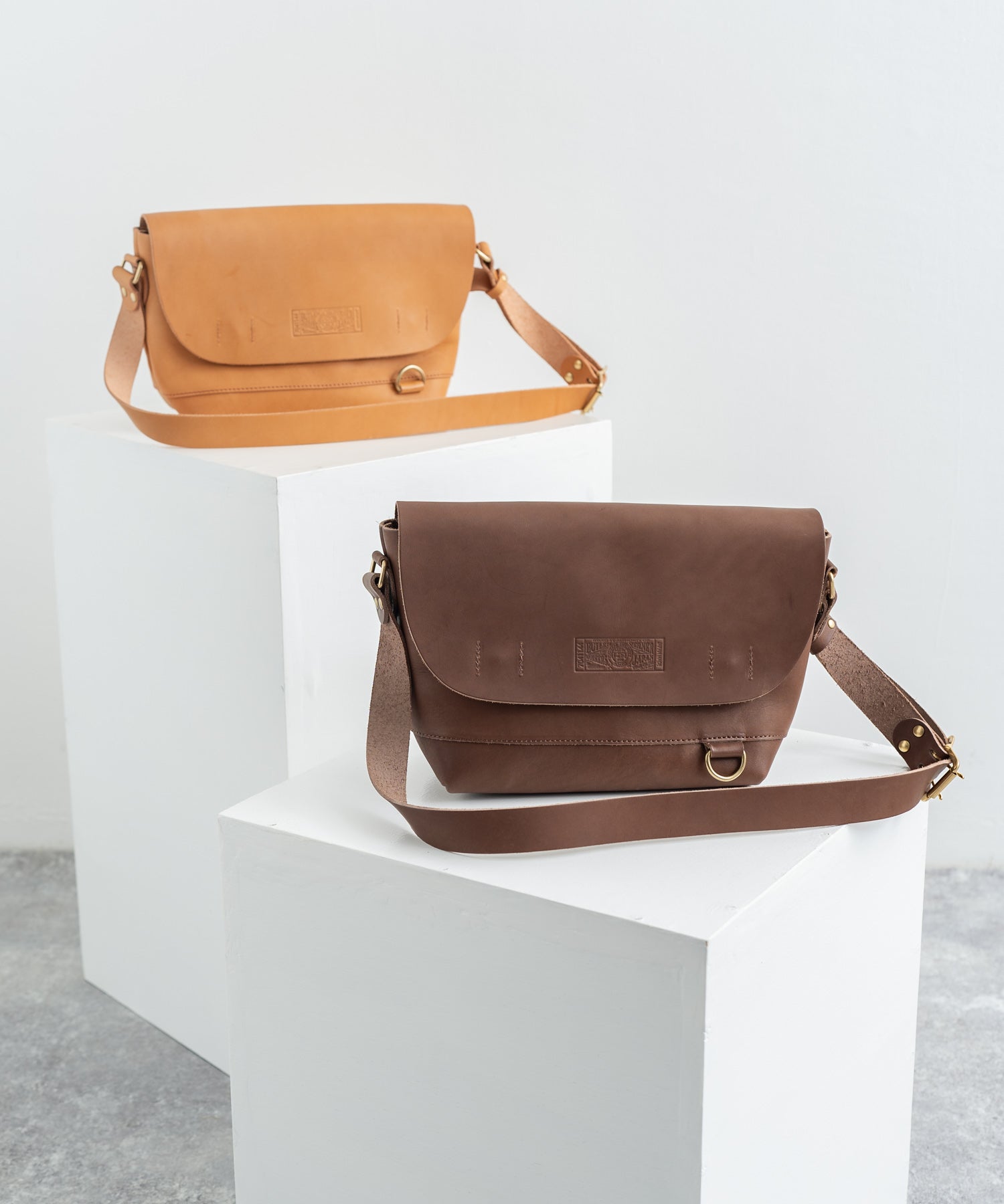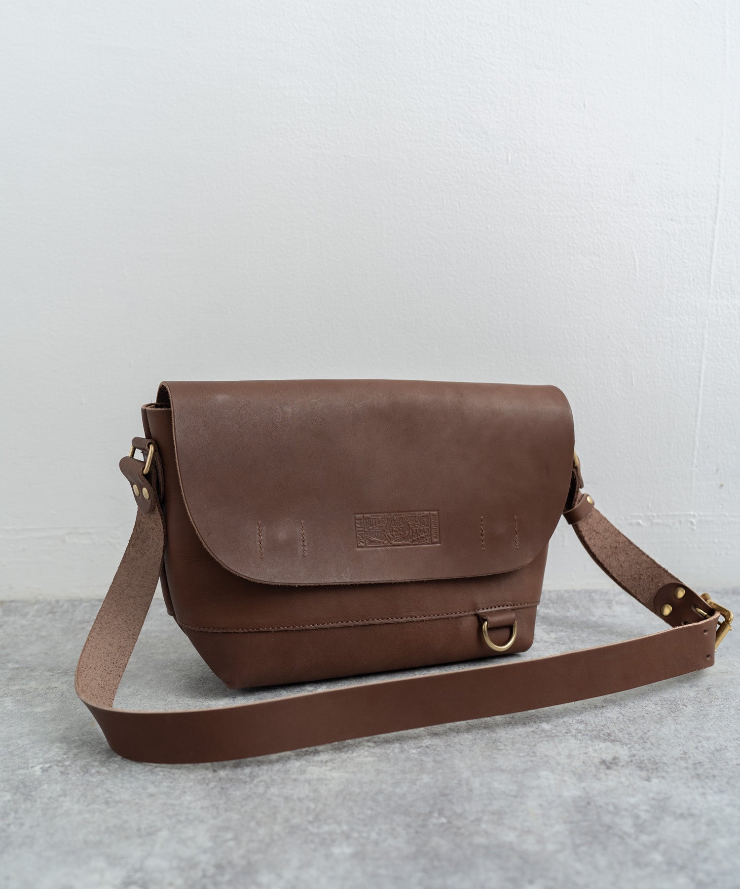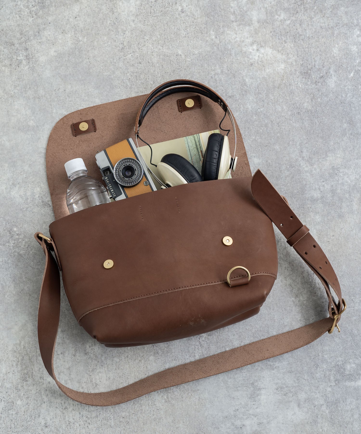 ペットボトルやB5ノートも楽々入るサイズ感の日本製本ヌメ革ショルダー。