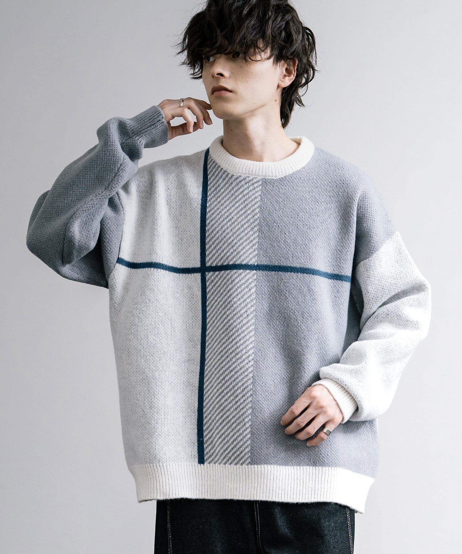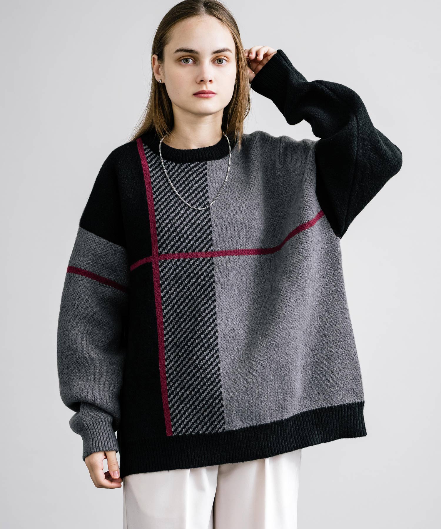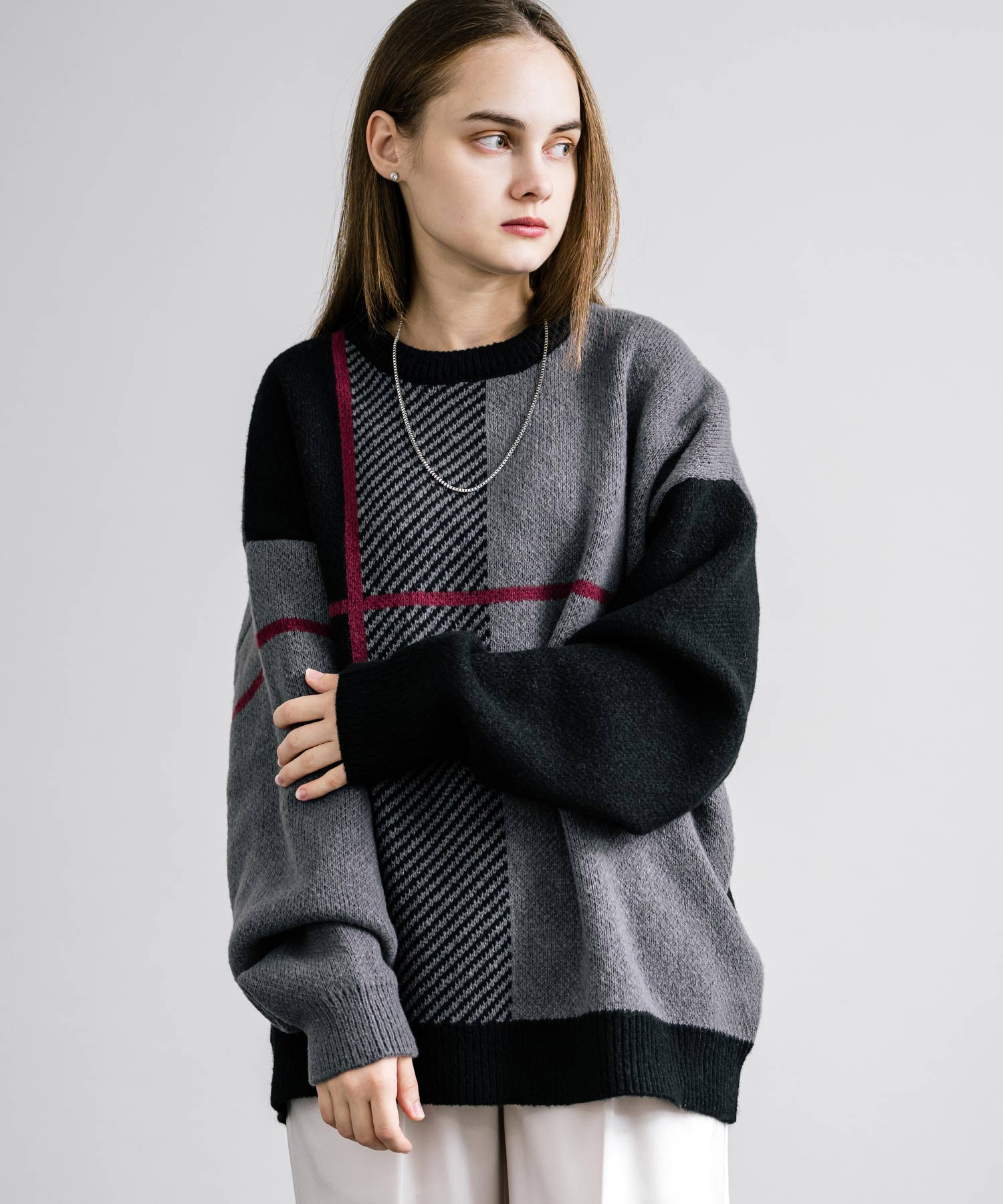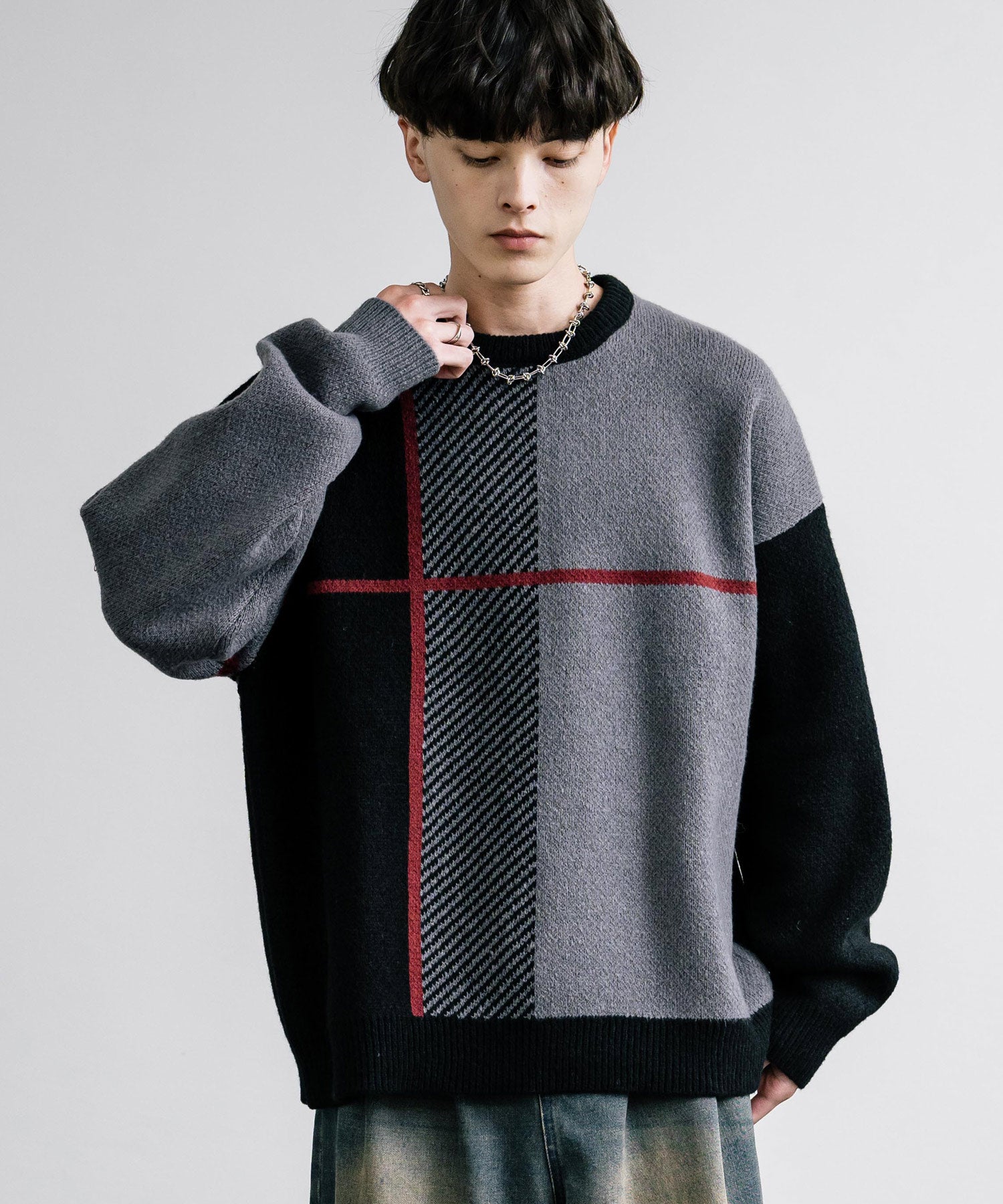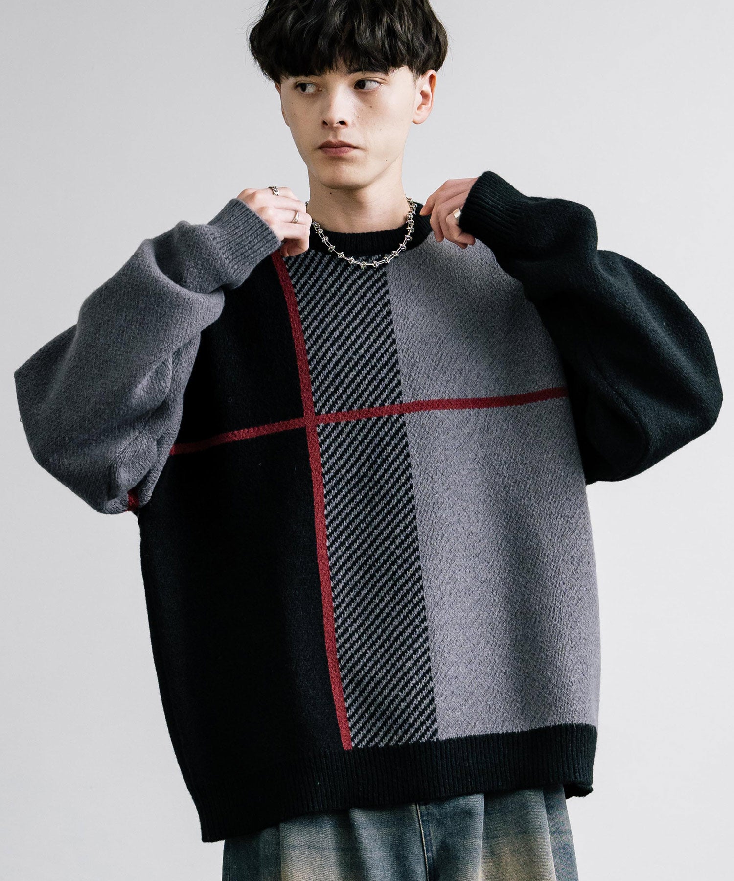 コーデの主役になる、オーバーサイズクロスチェック柄クルーニットセーター。