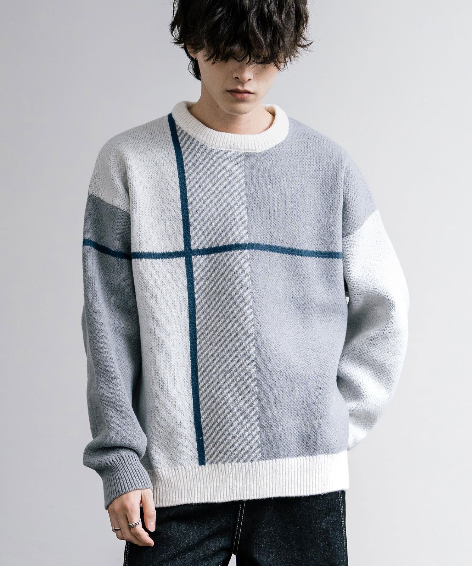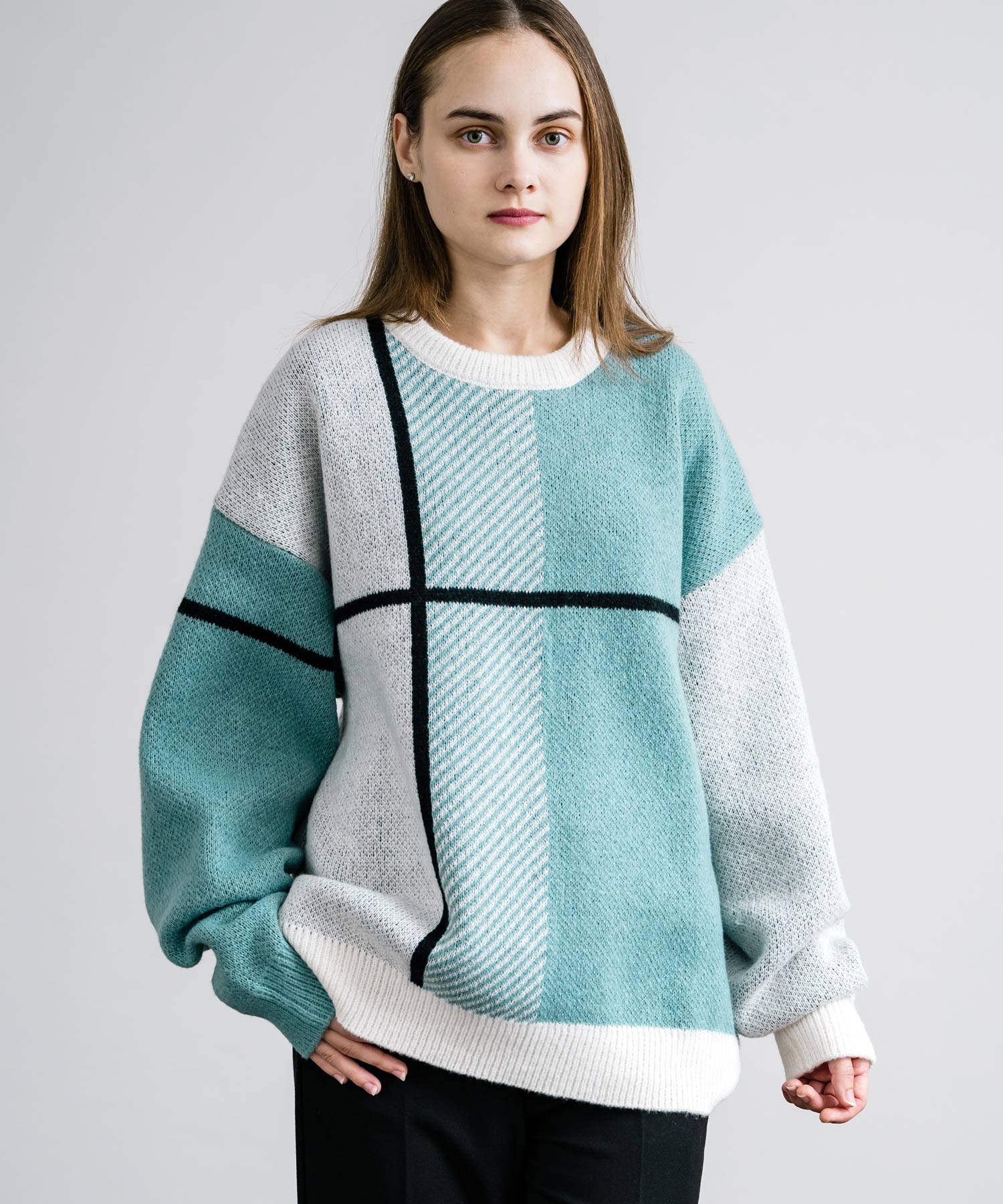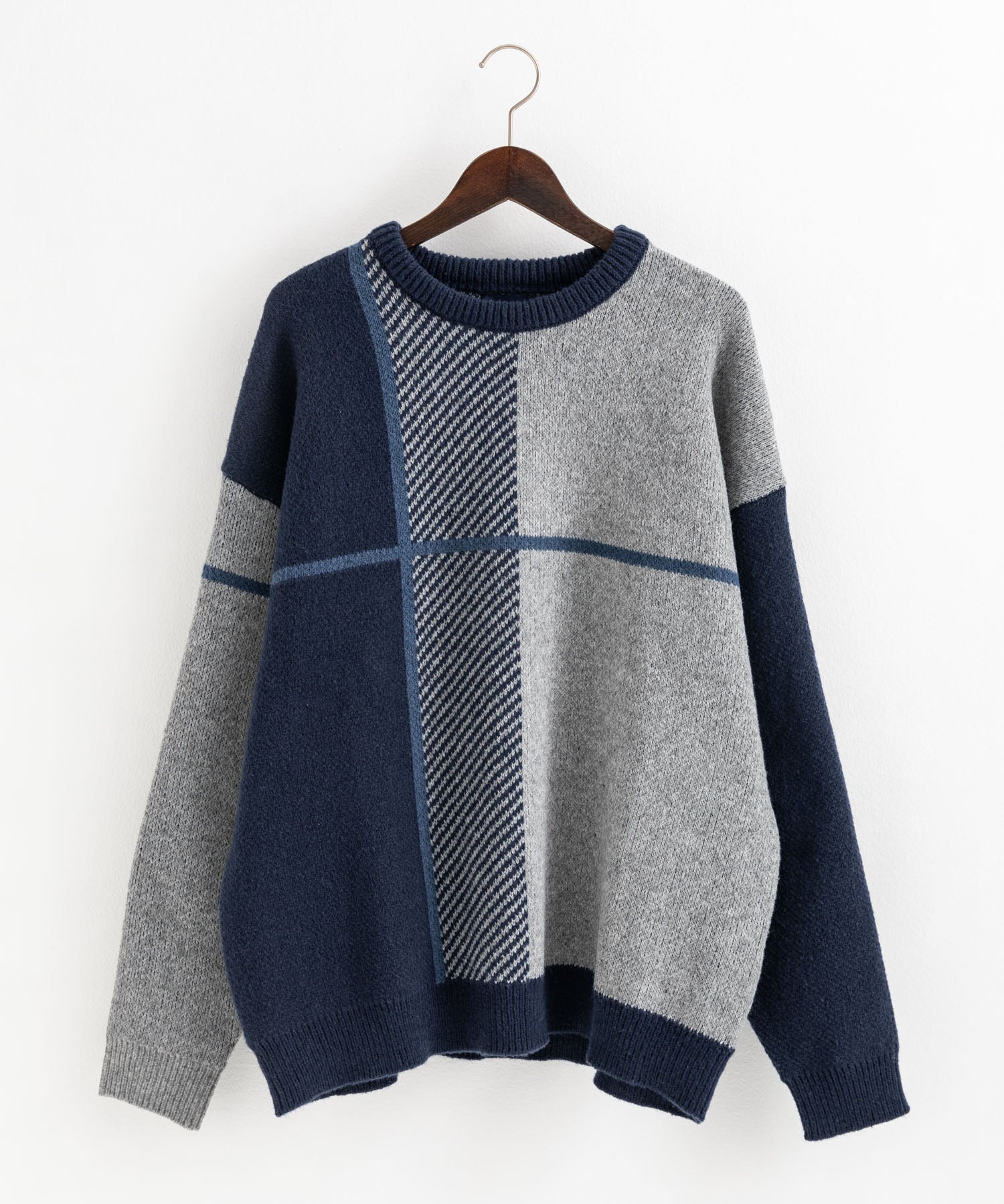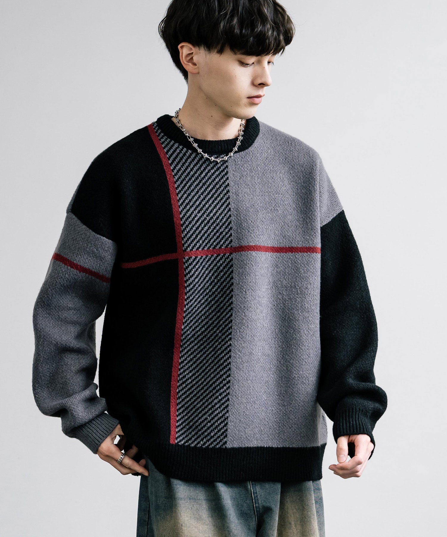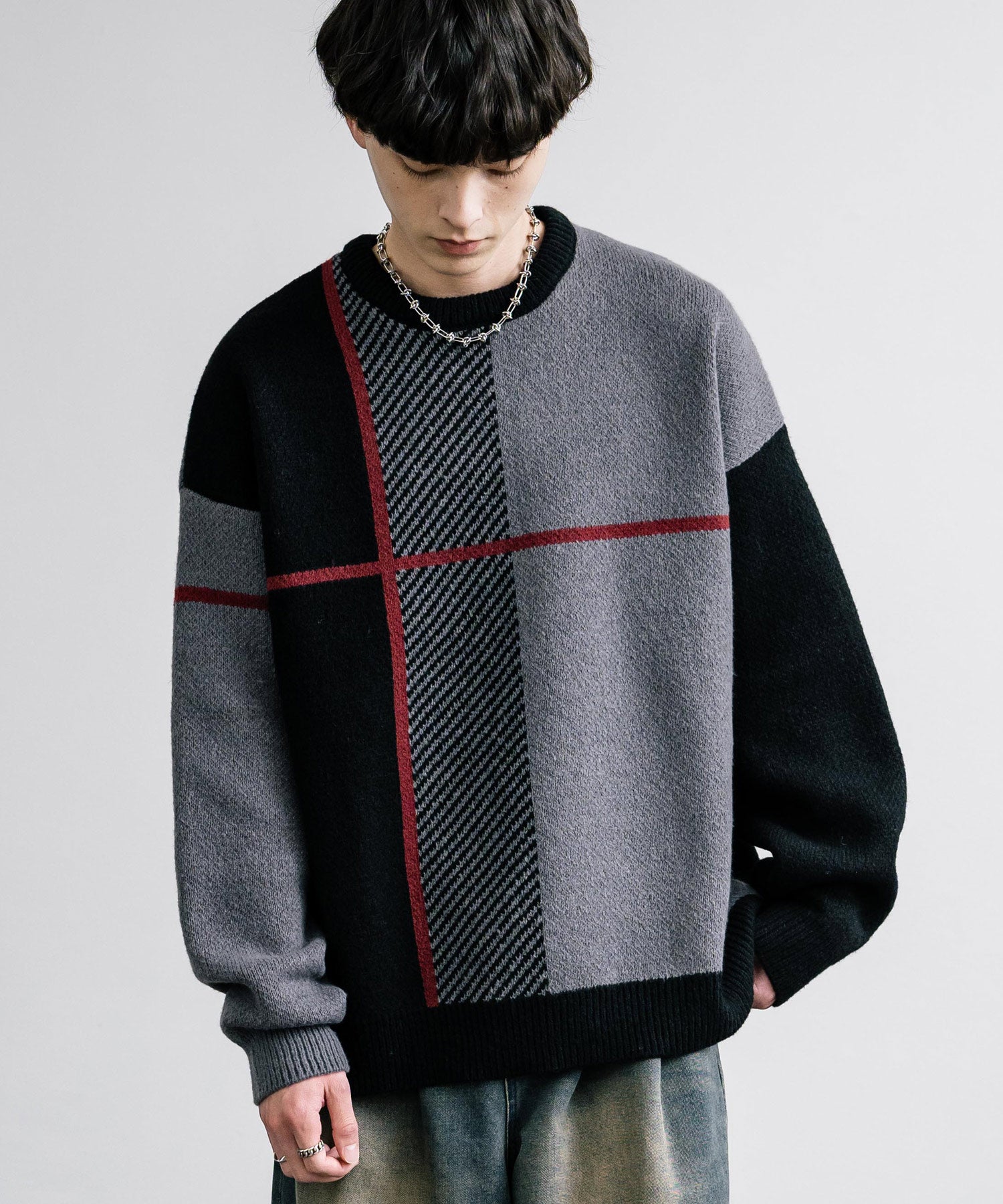 コーデの主役になる、オーバーサイズクロスチェック柄クルーニットセーター。