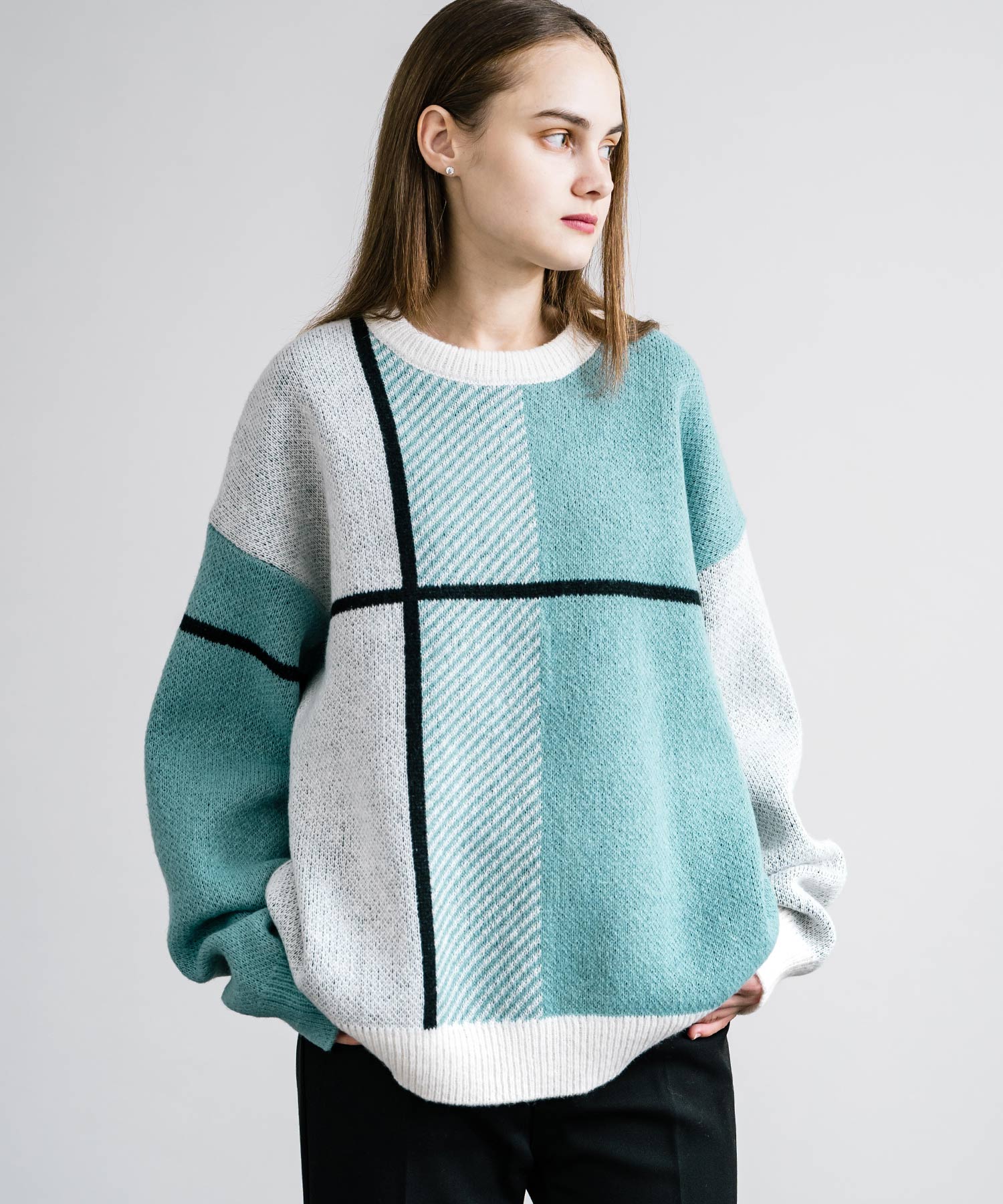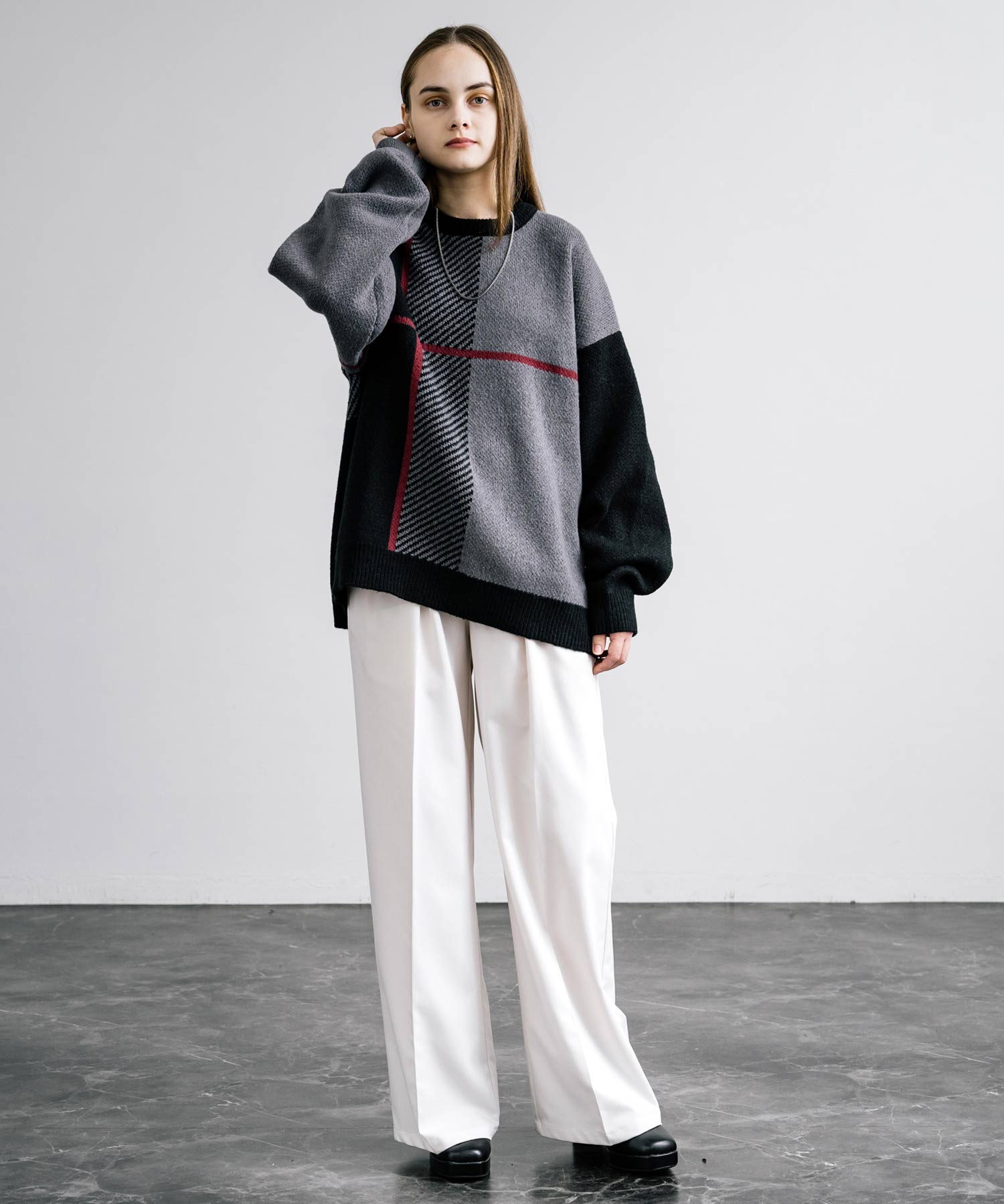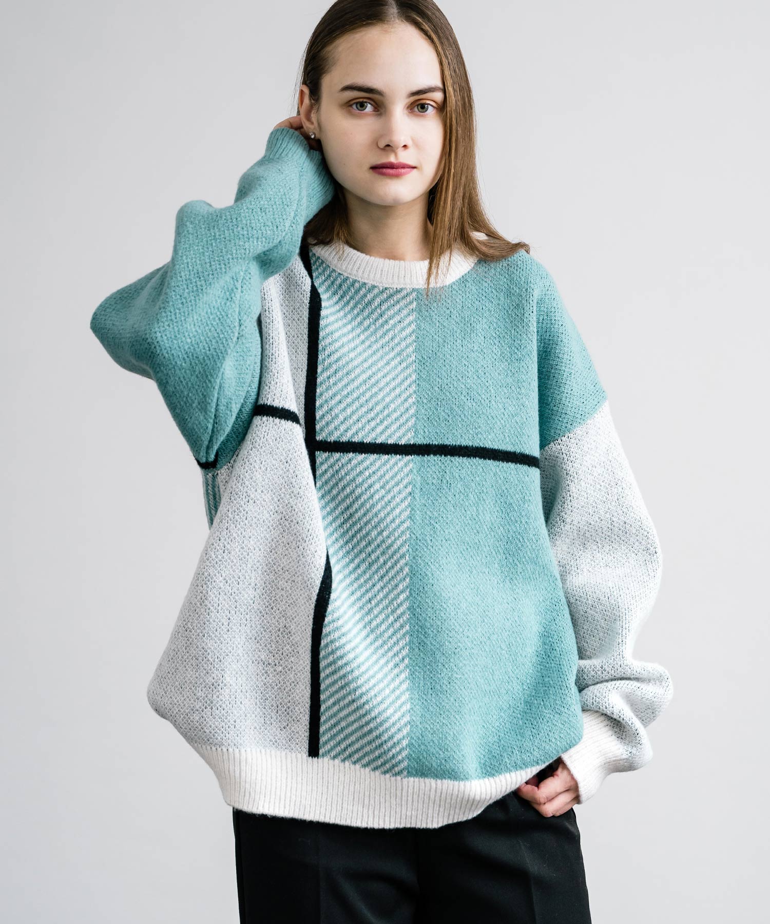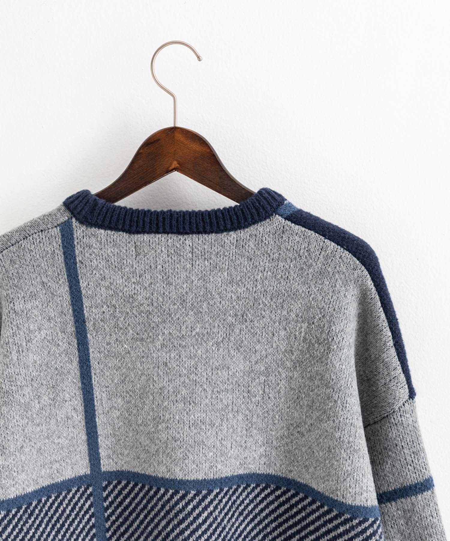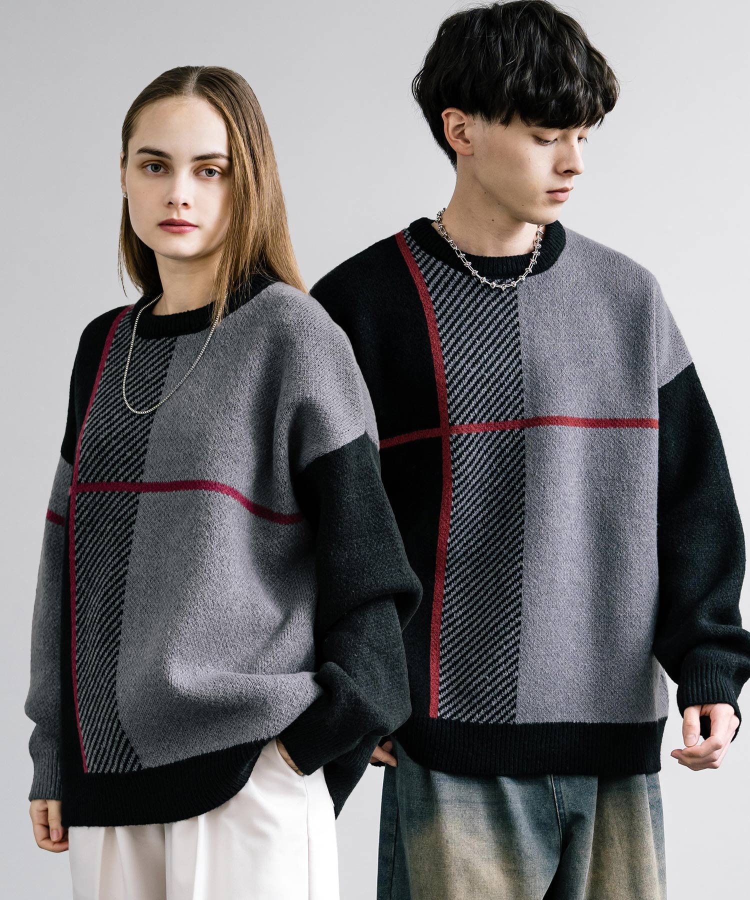 コーデの主役になる、オーバーサイズクロスチェック柄クルーニットセーター。