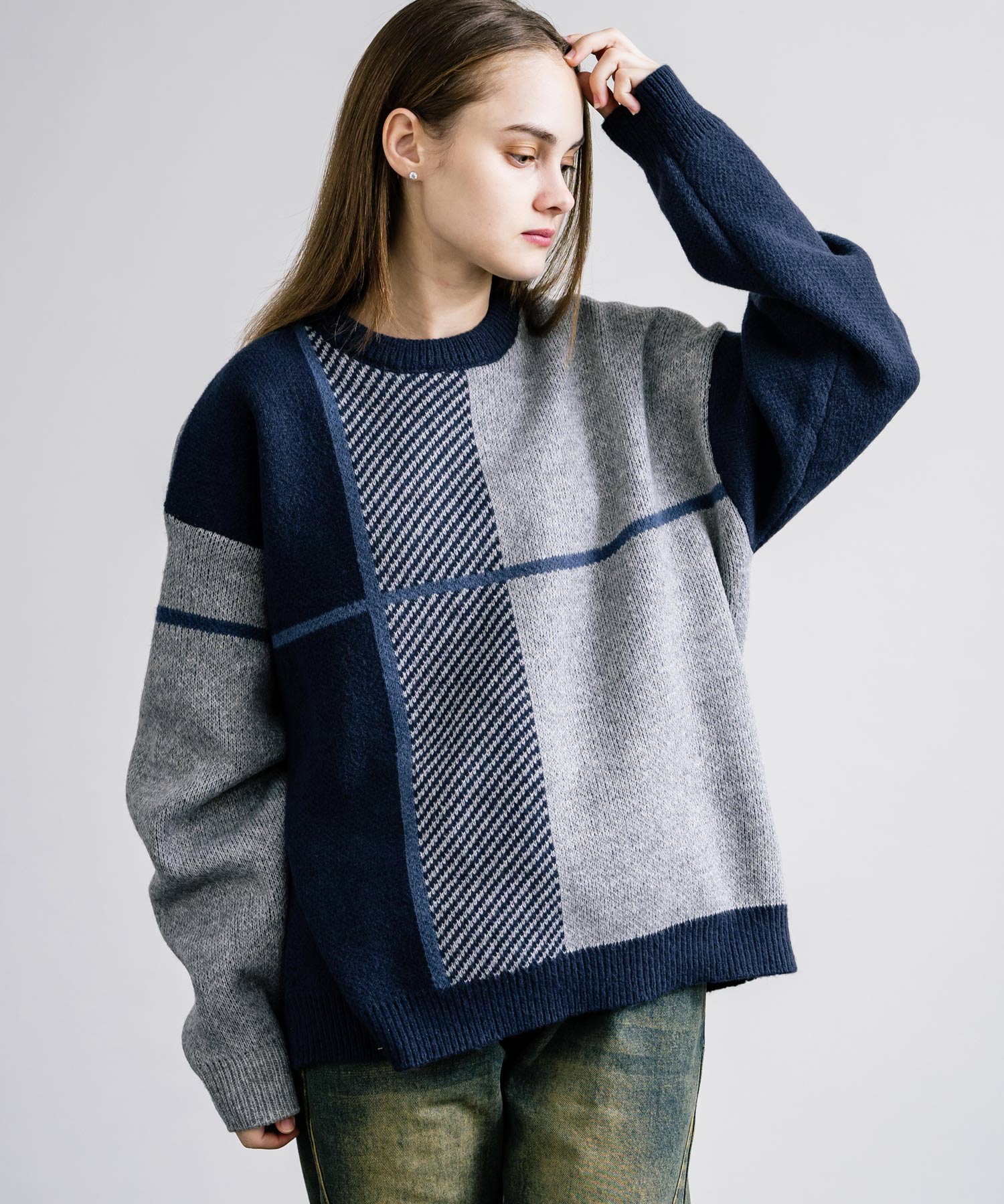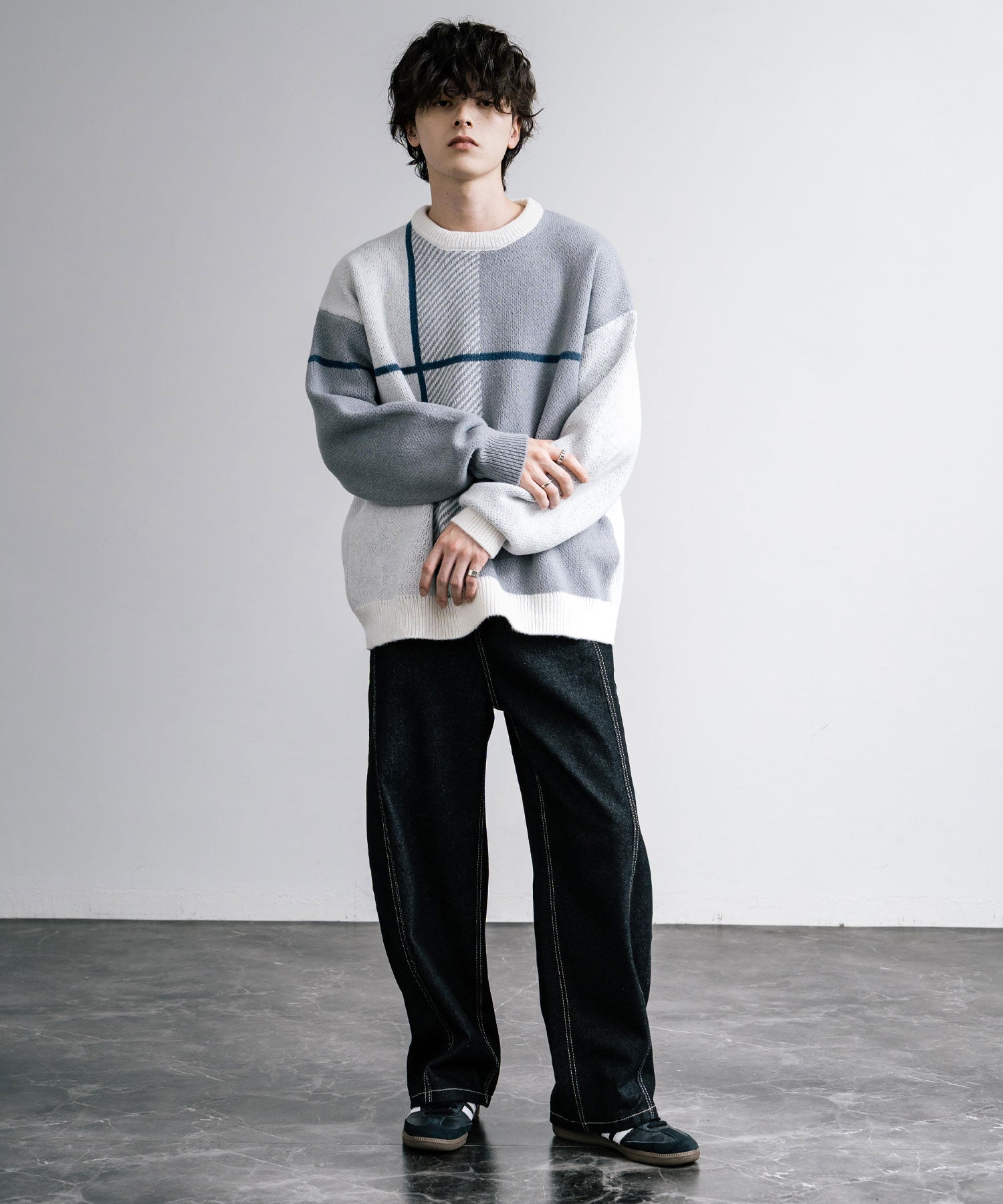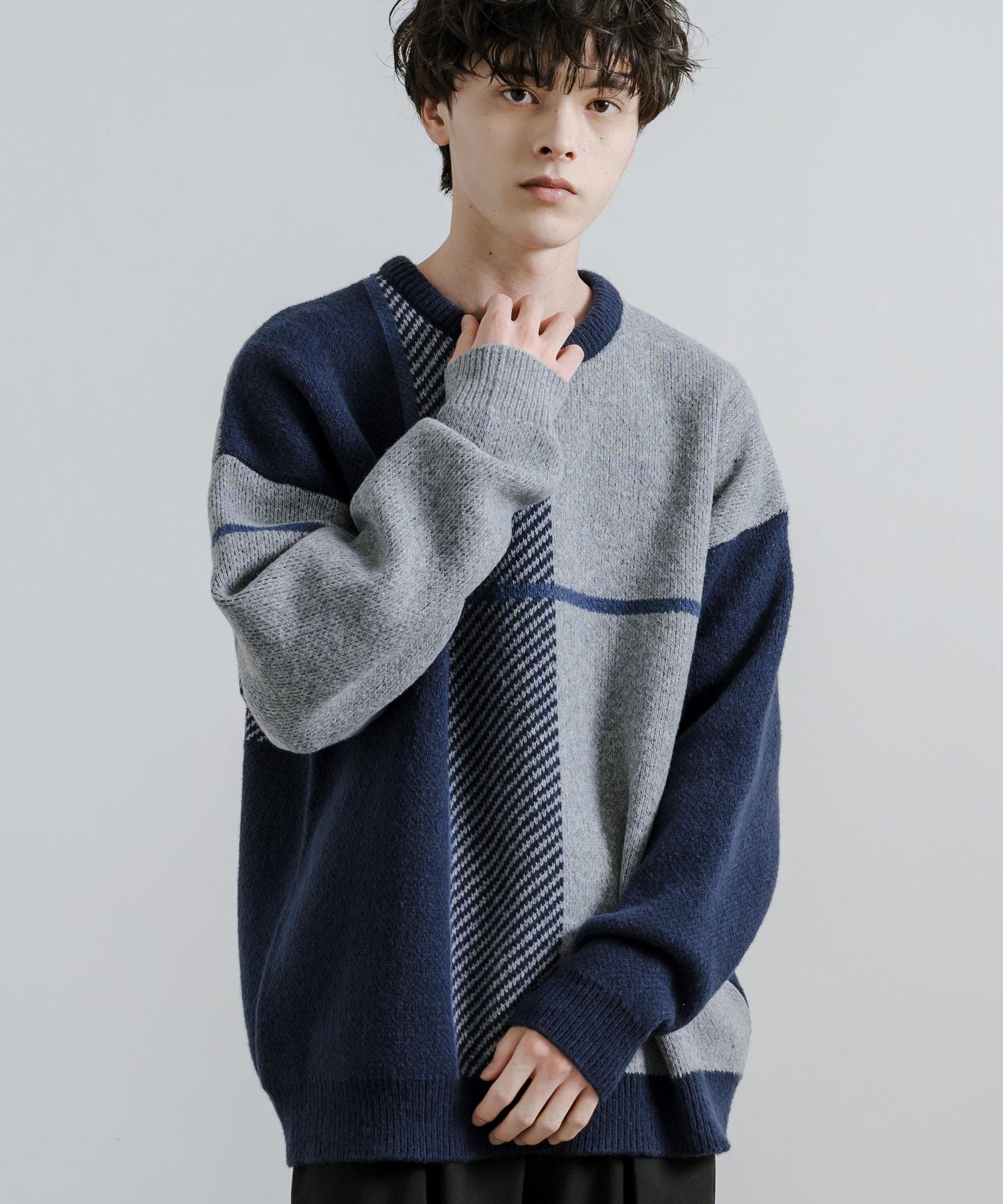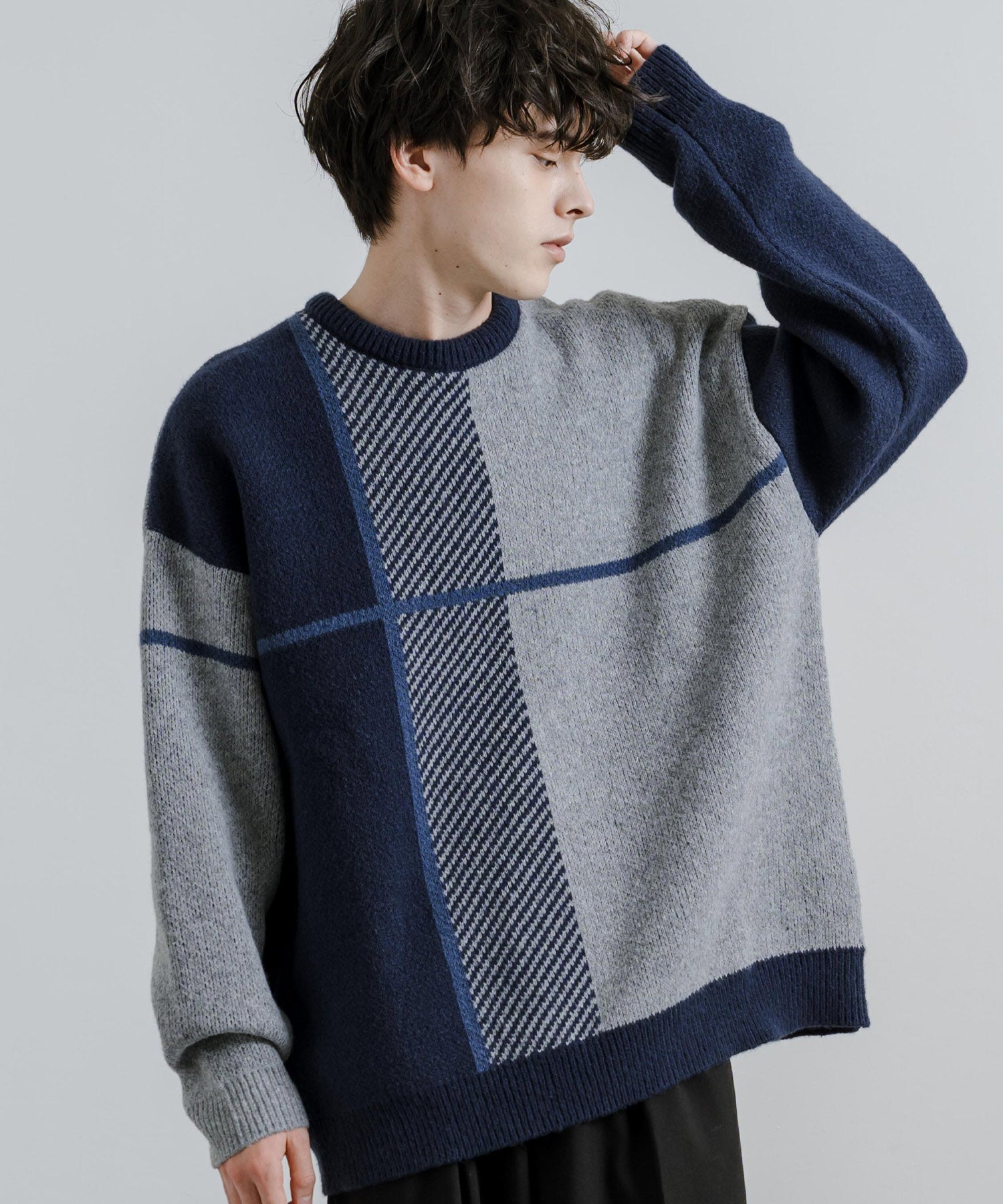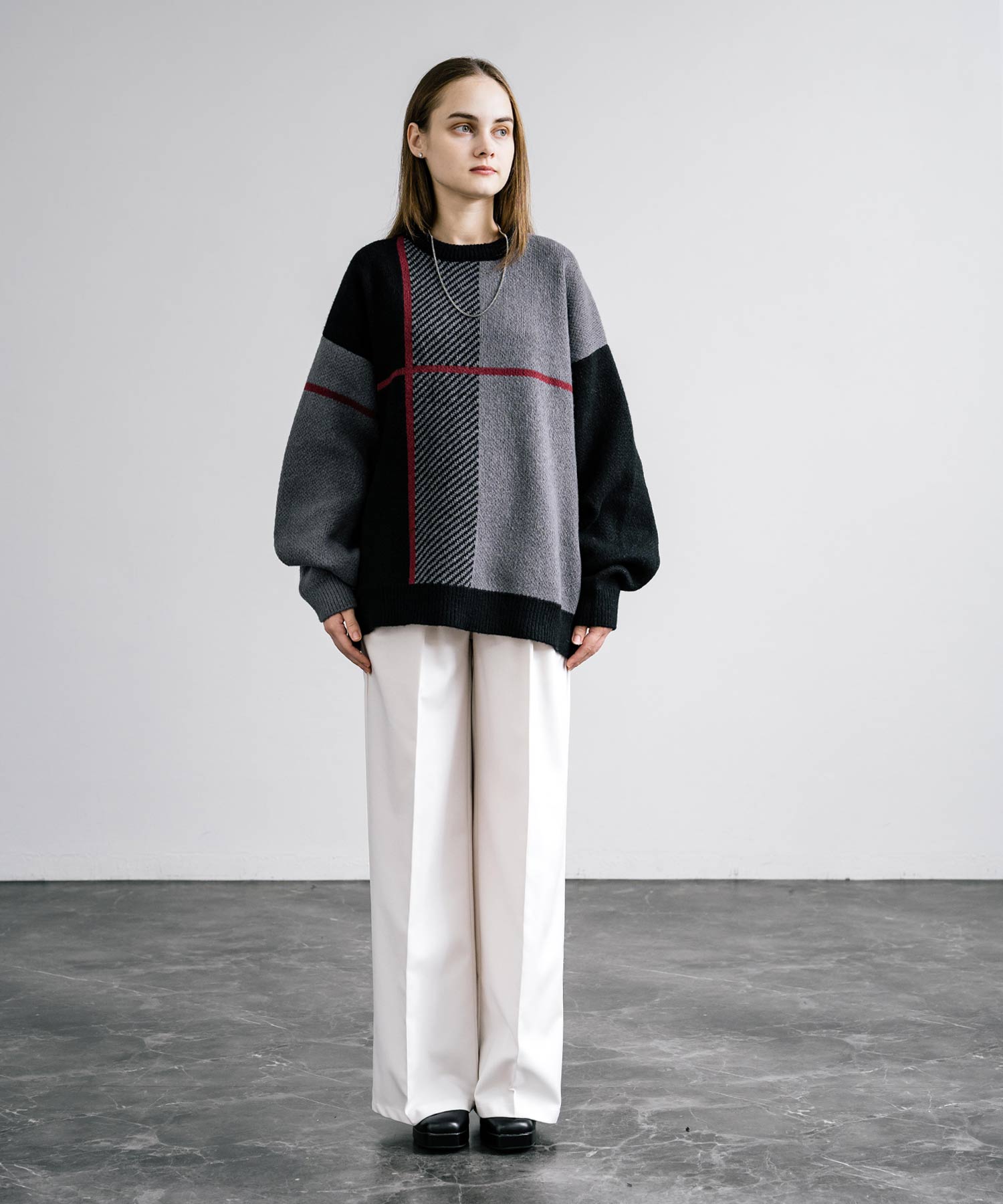 コーデの主役になる、オーバーサイズクロスチェック柄クルーニットセーター。