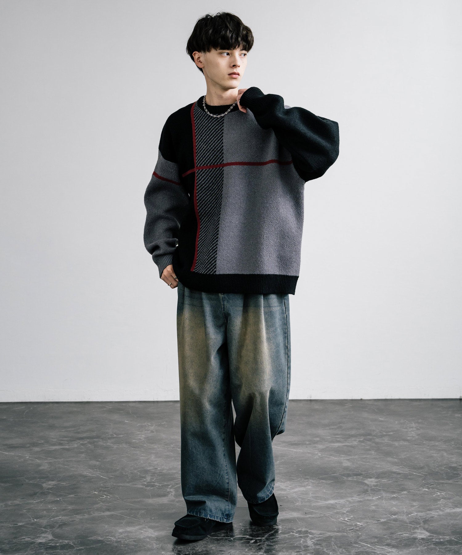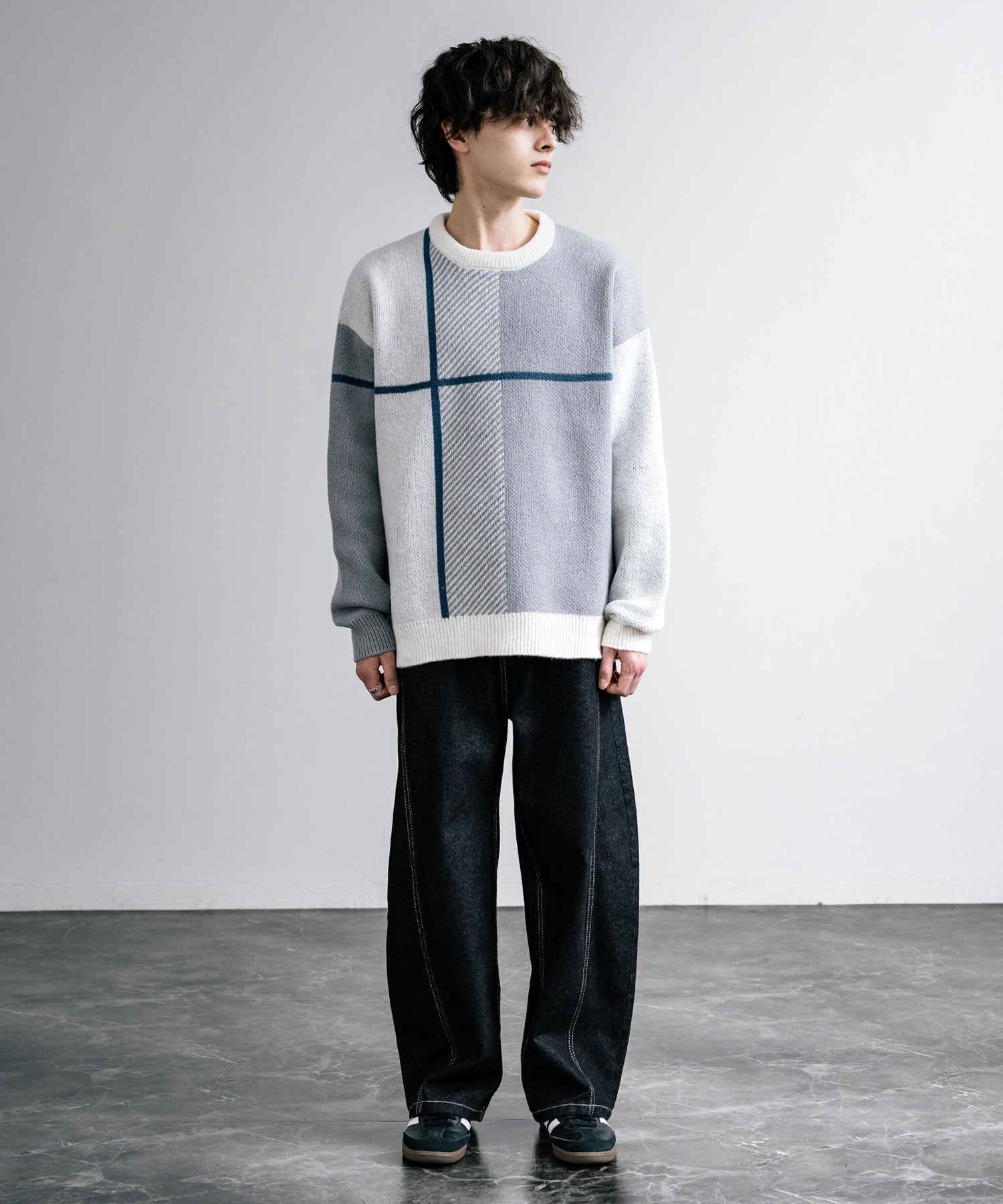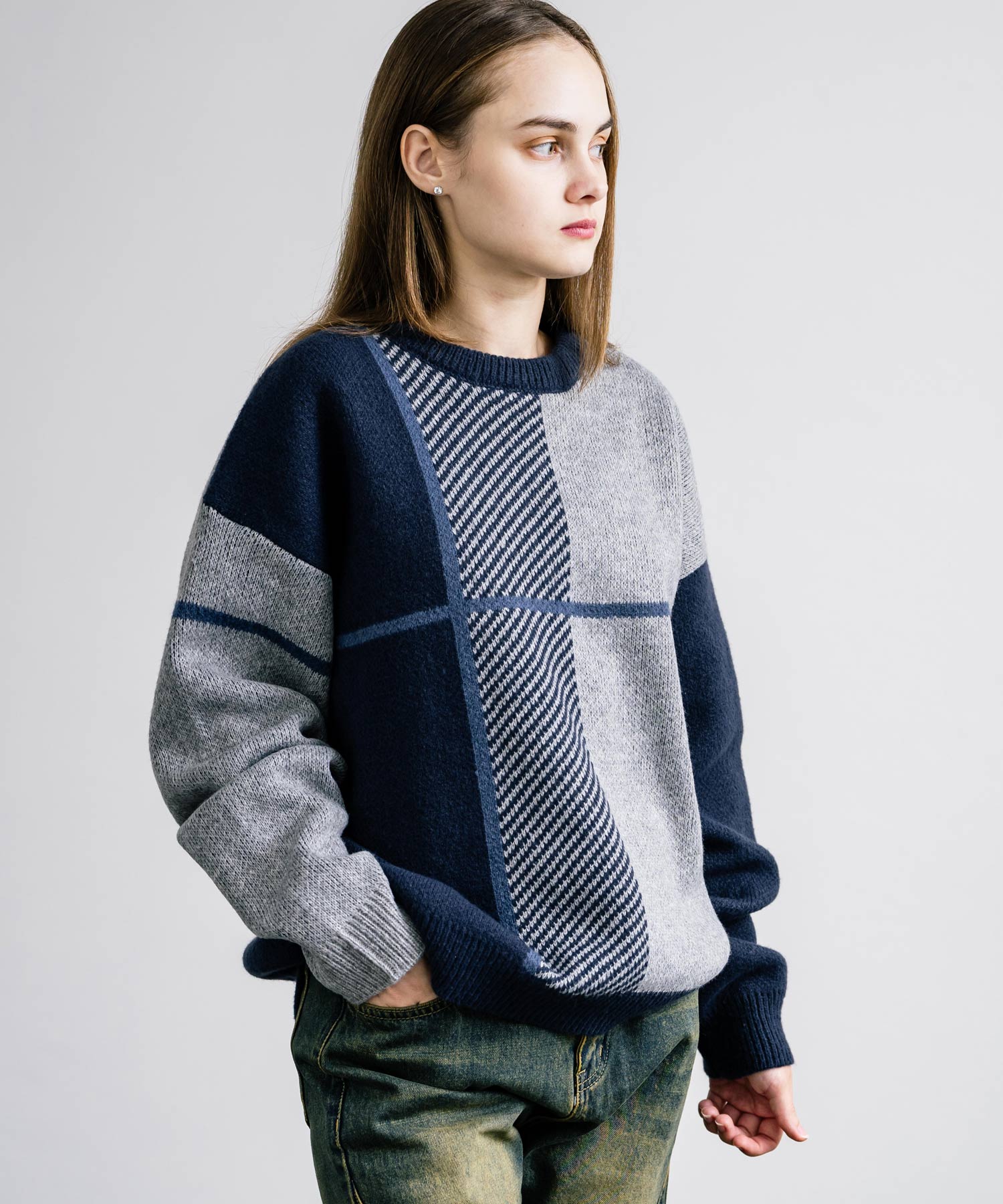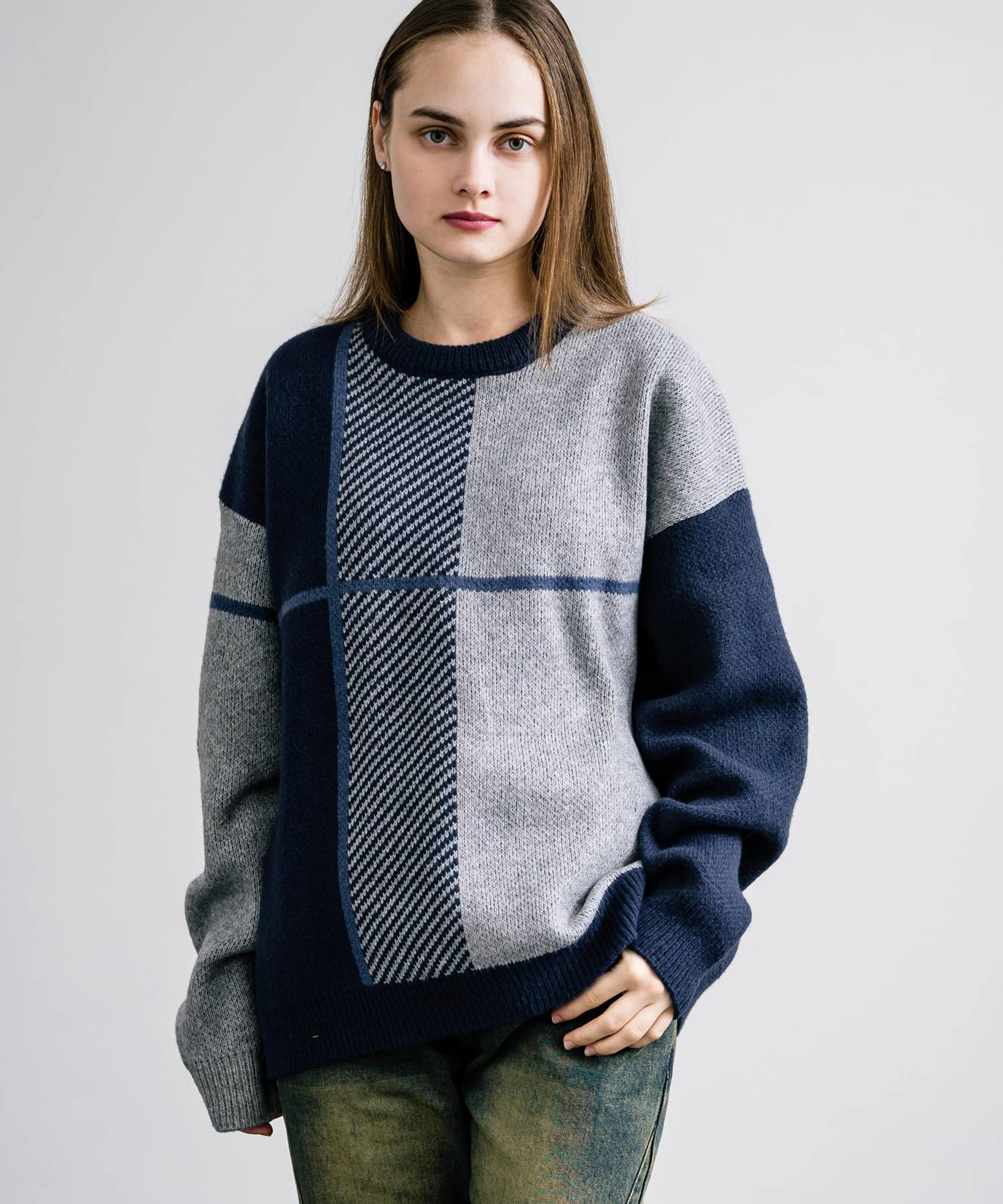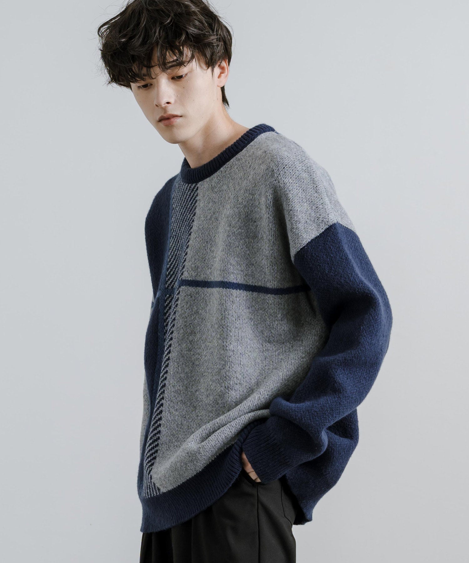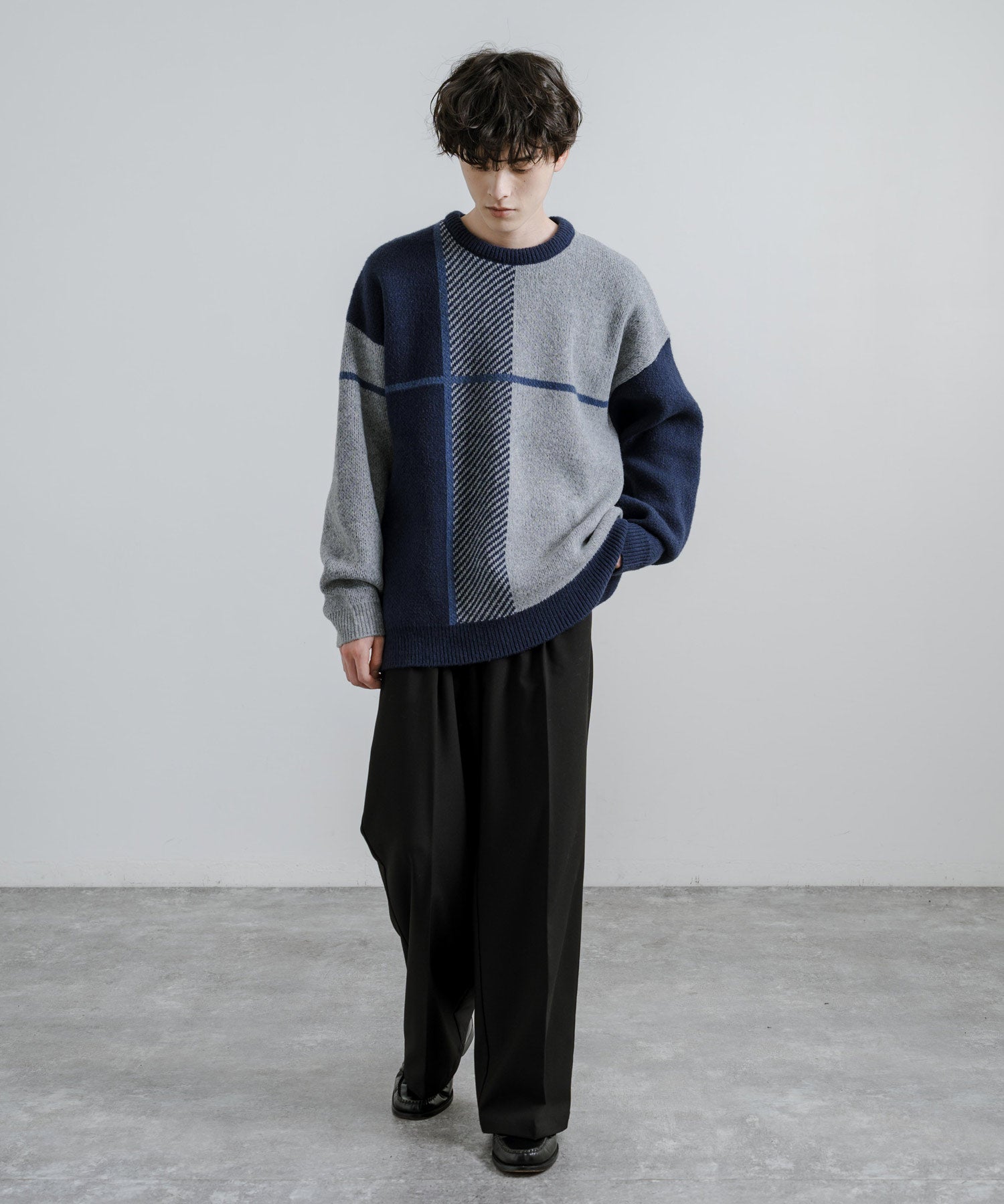 コーデの主役になる、オーバーサイズクロスチェック柄クルーニットセーター。
