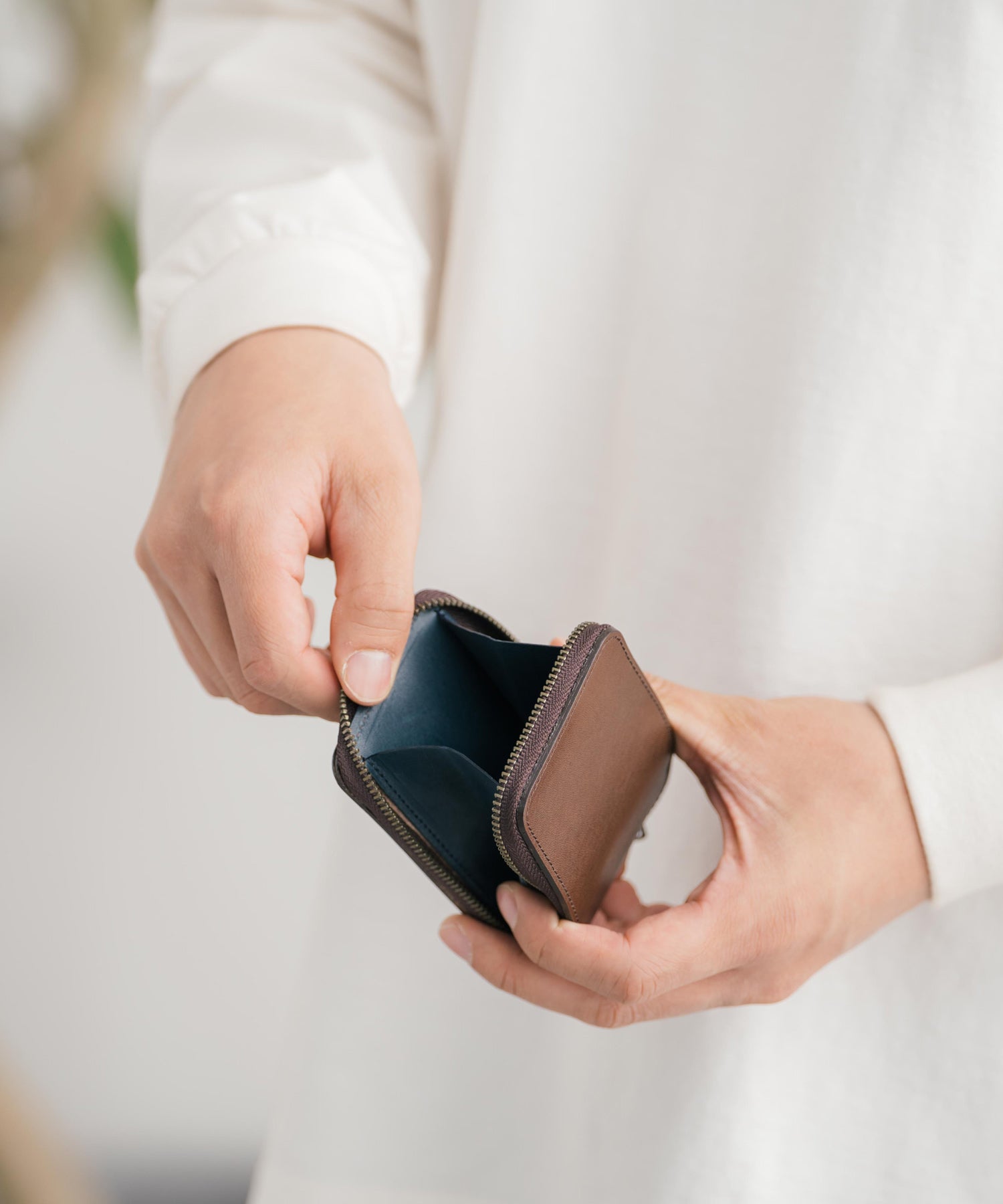 上質な栃木産のヌメ革が使用され、外側と中の革の色は配色でアクセントに。