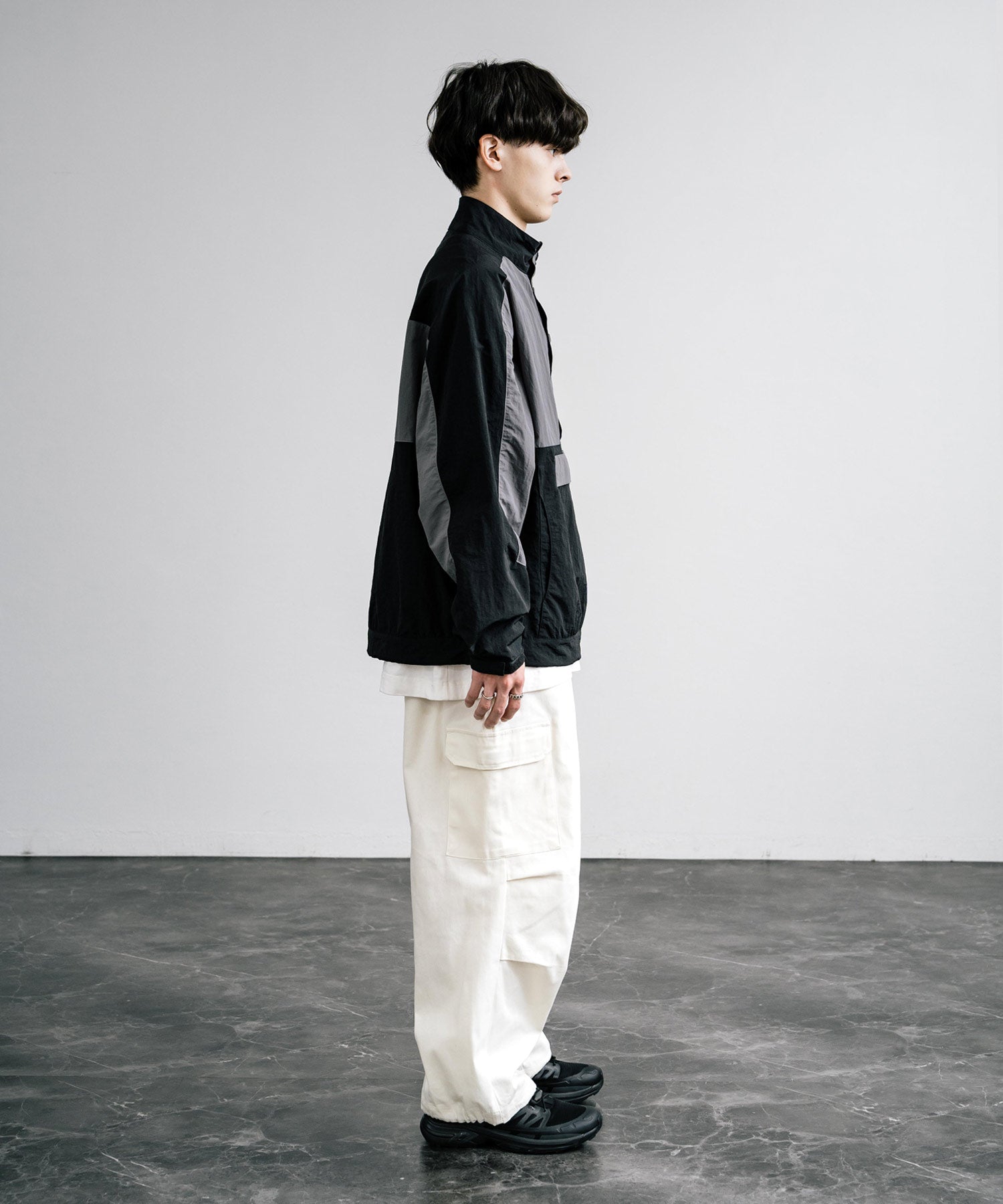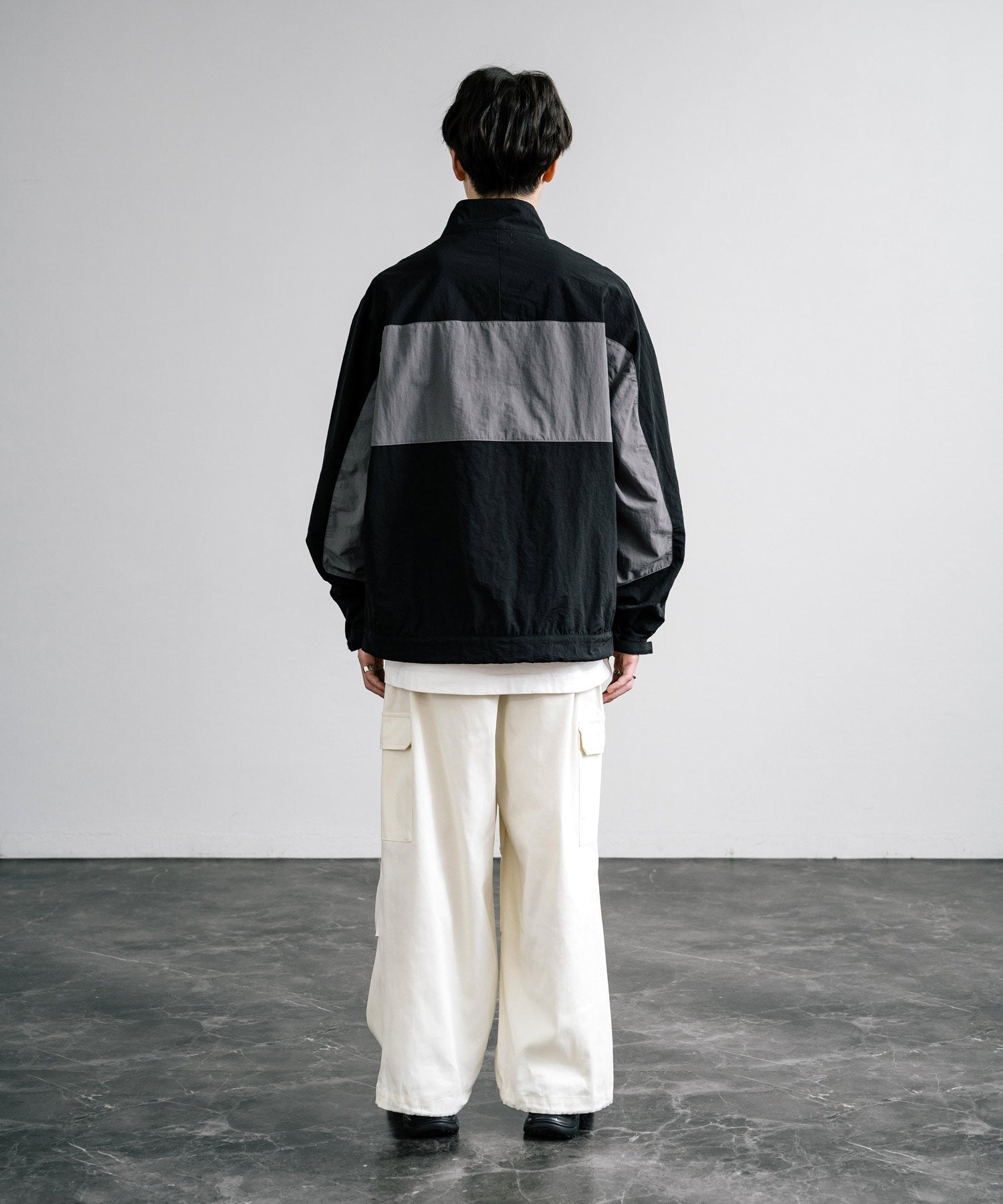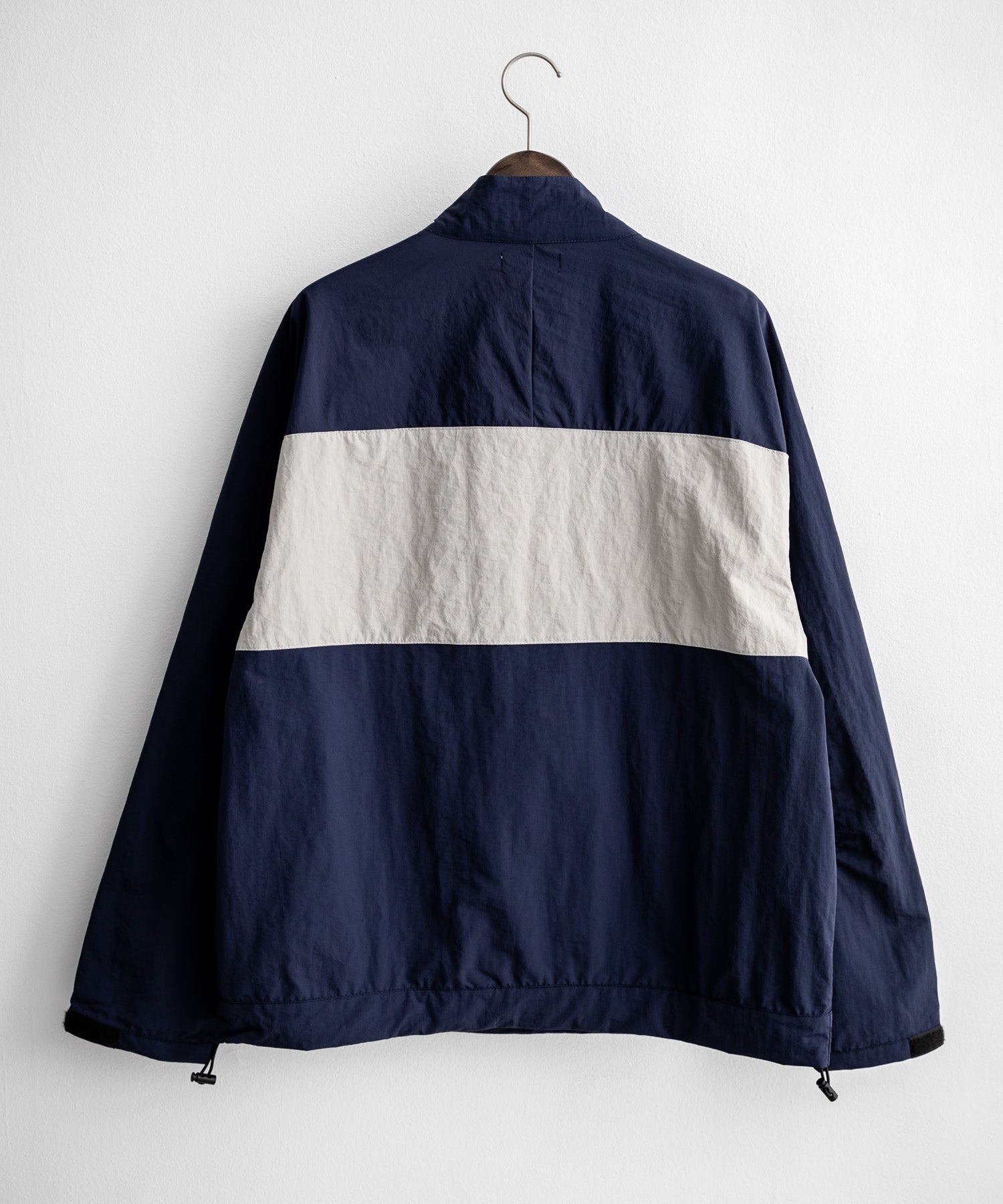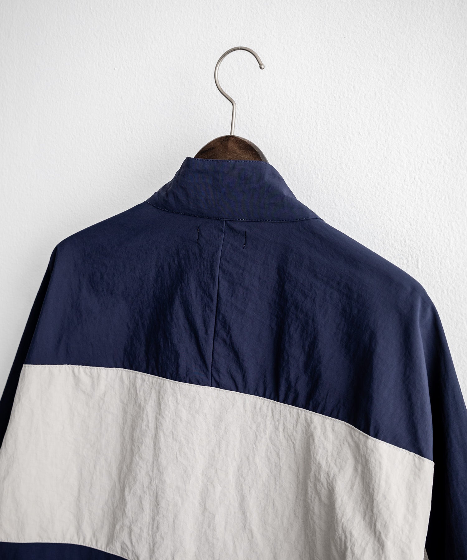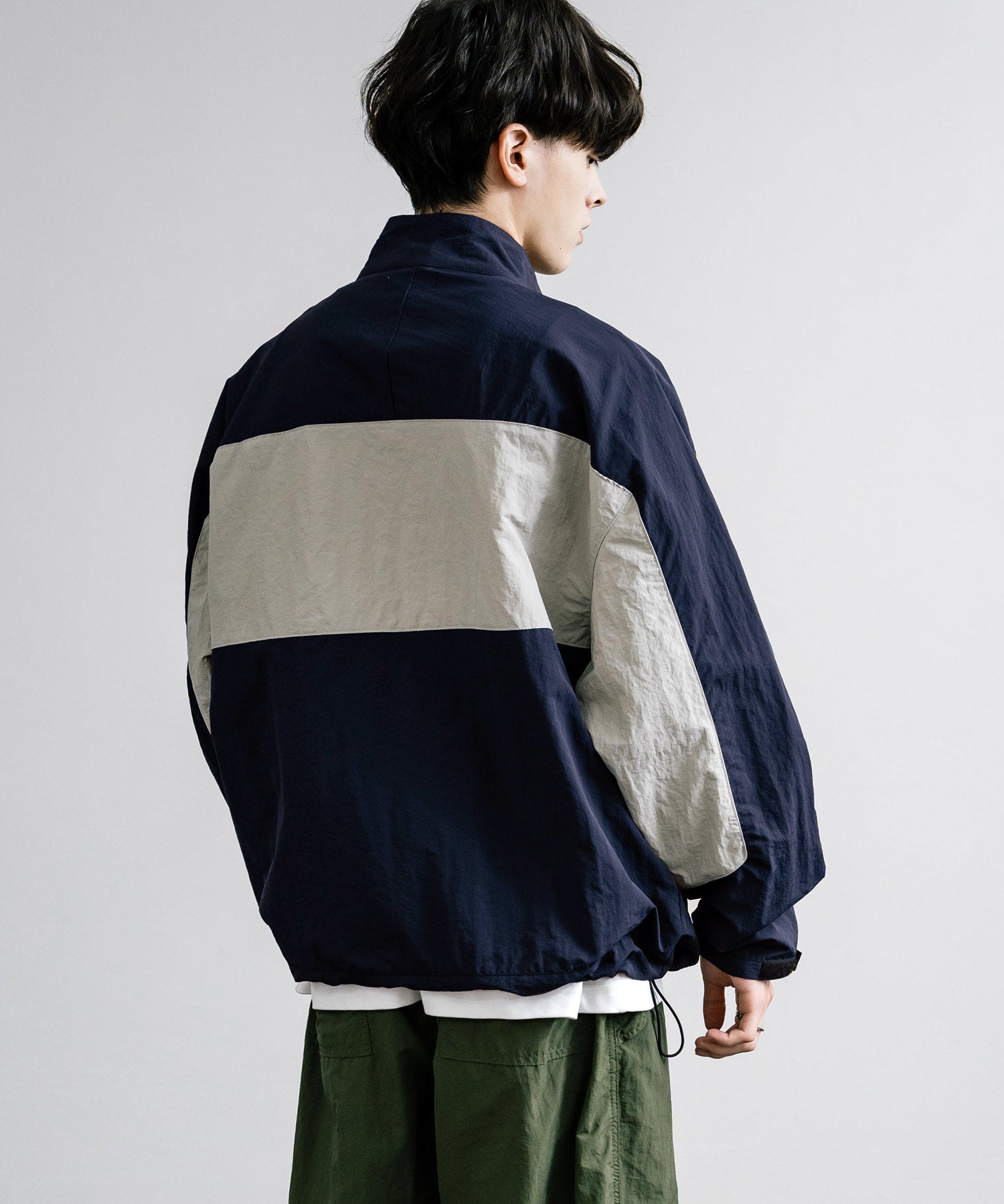 胸元のワンポイント刺繍とバイカラーがアクセントの存在感あるアイテム。