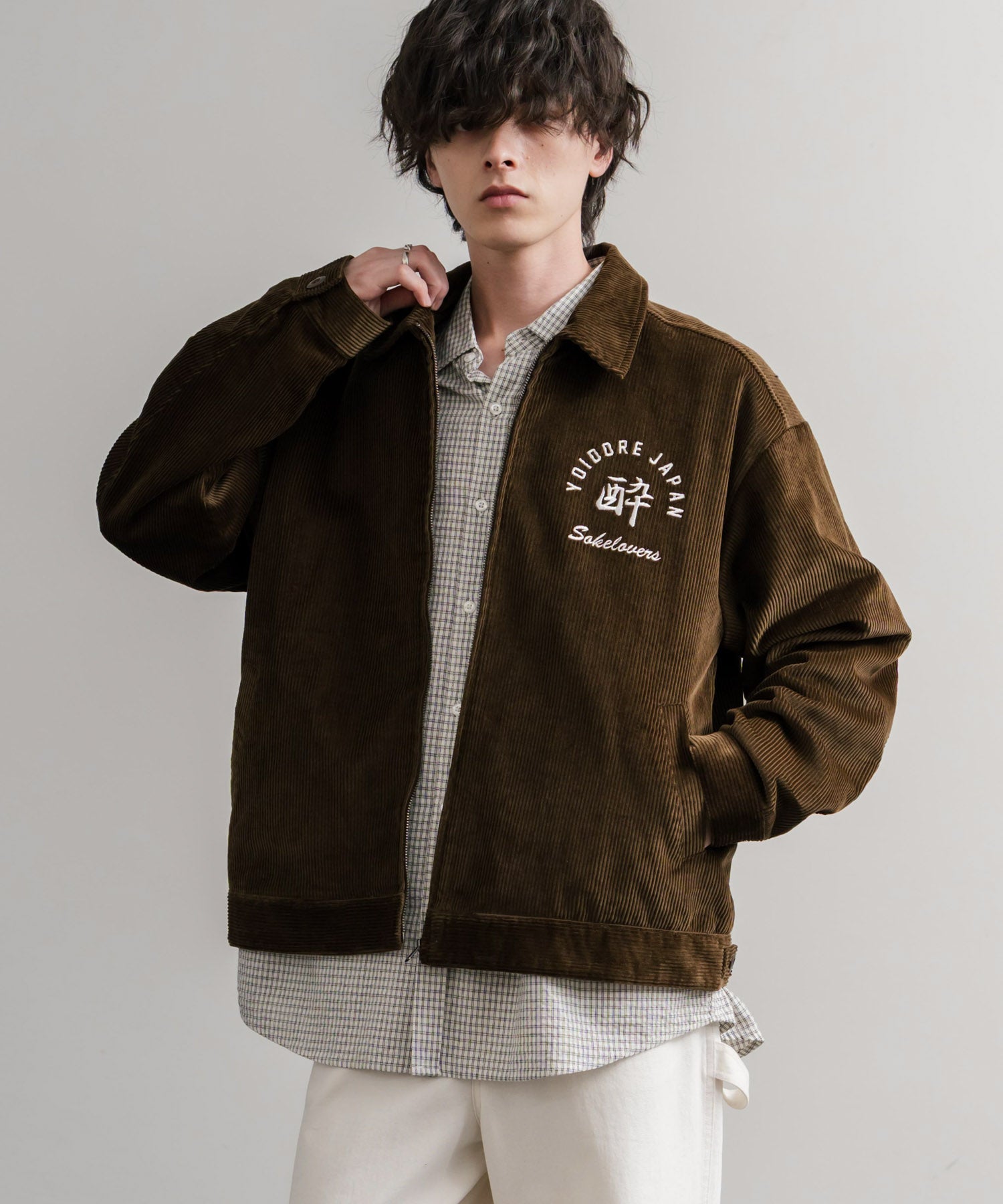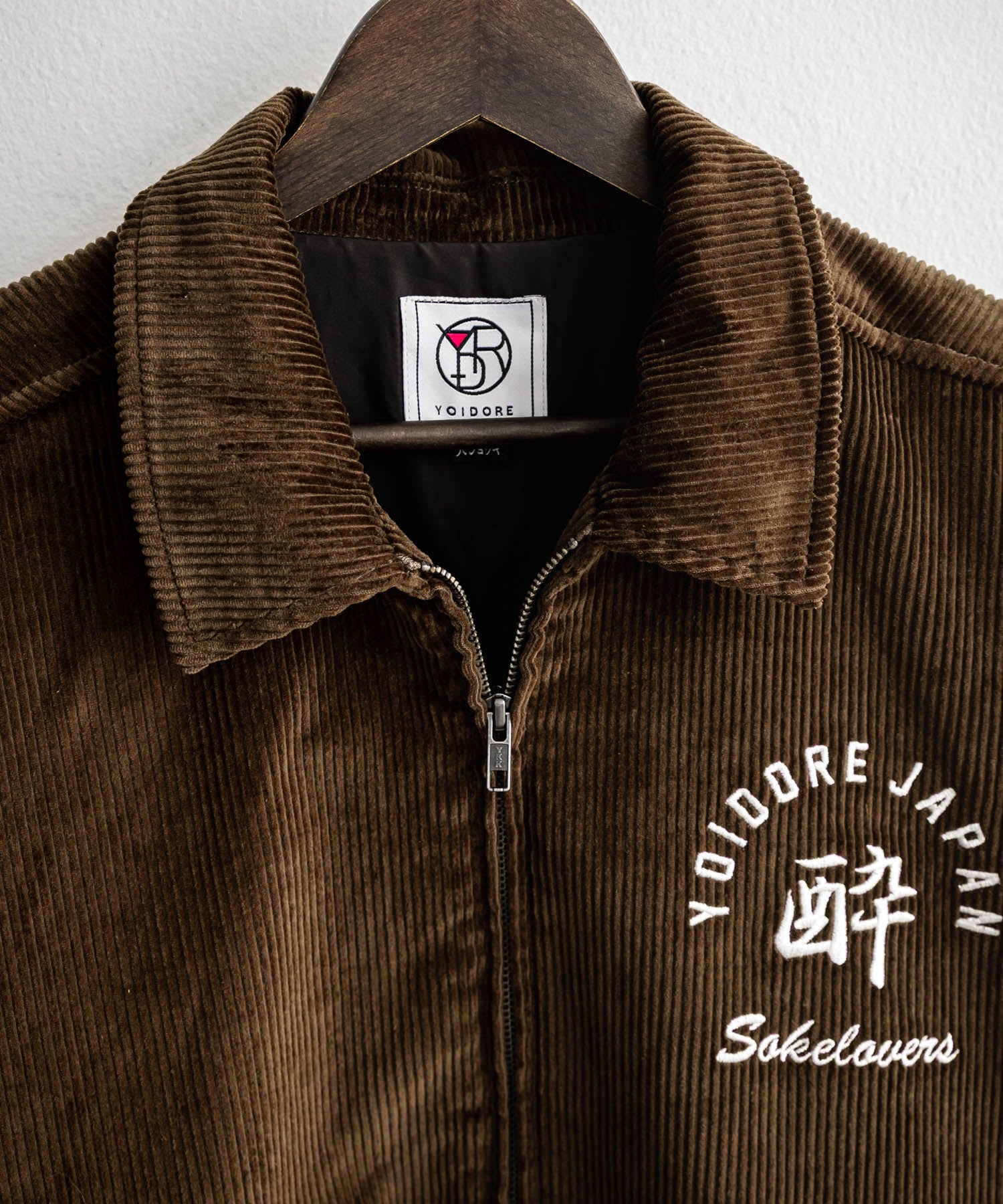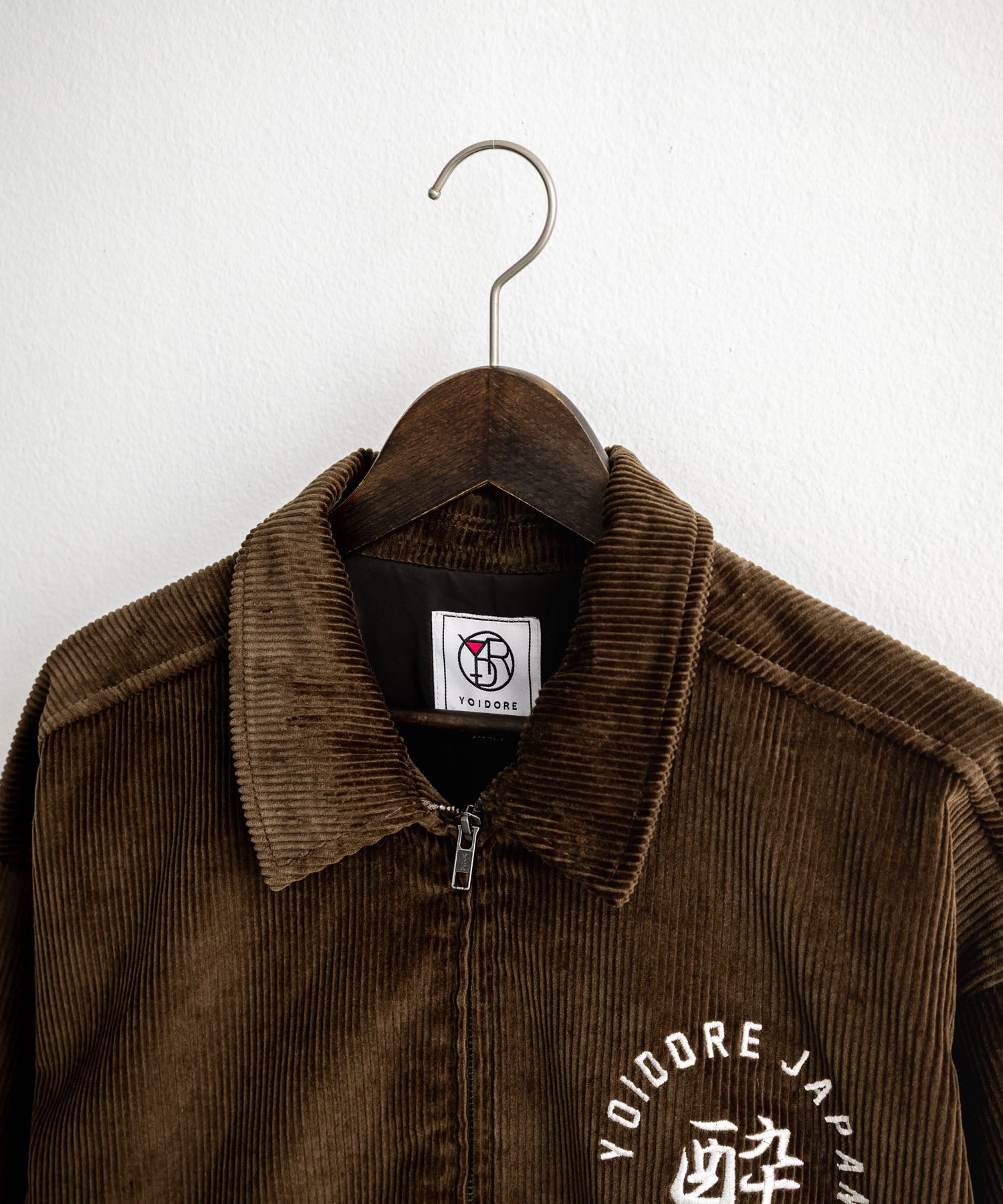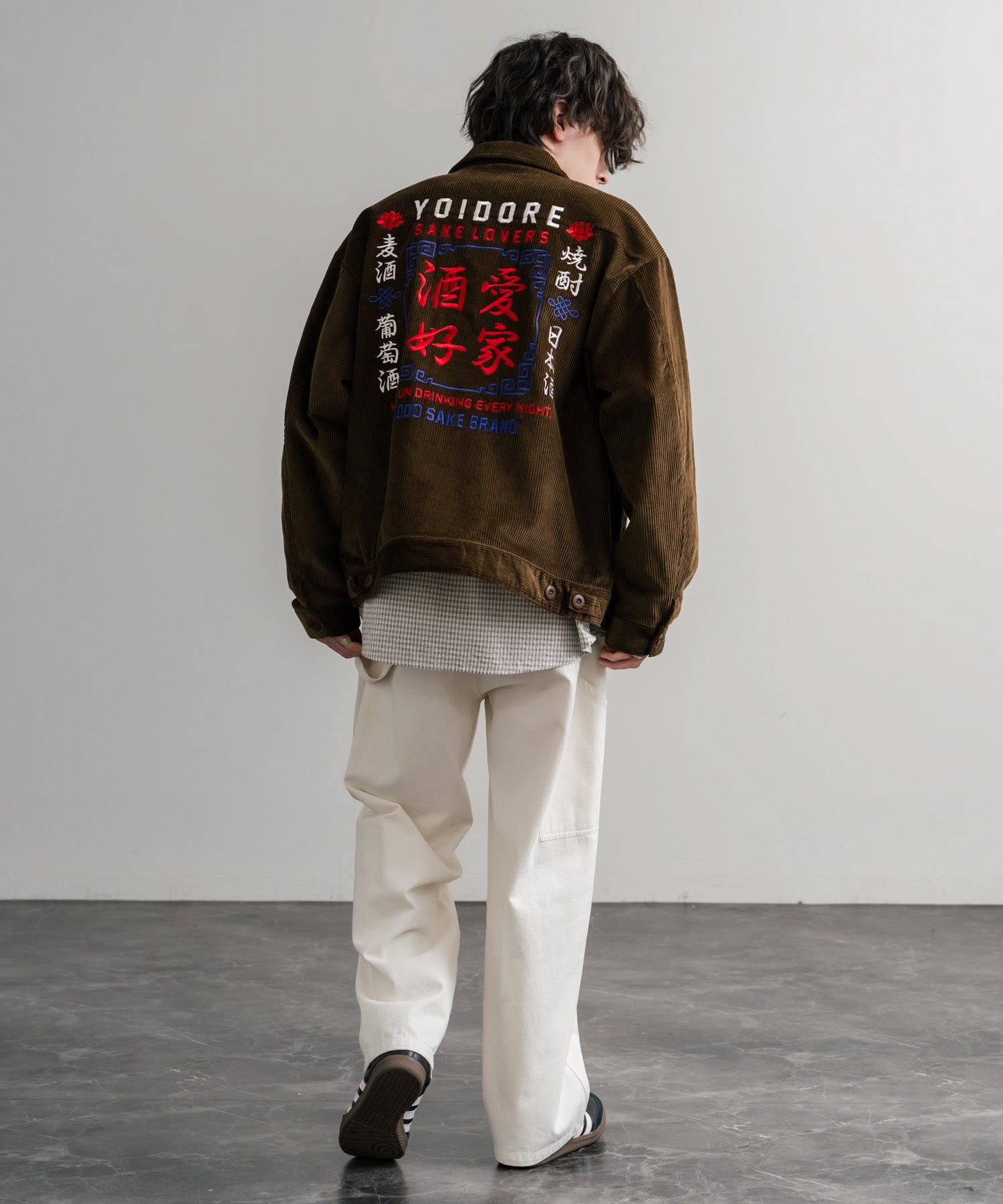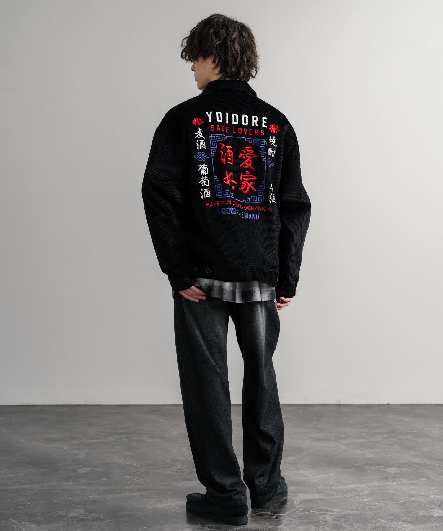バッグに「酒愛好家」刺繍デザインが施された!YOIDOREコーデュロイジャケット。
