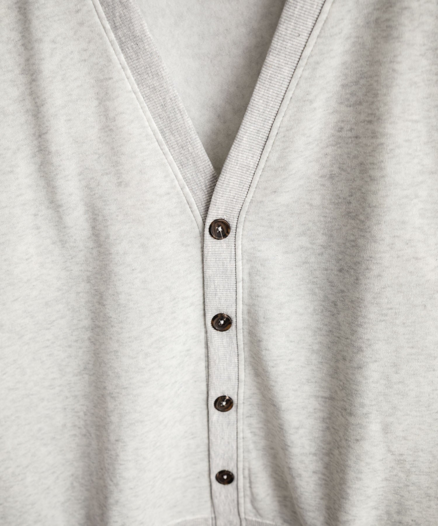 すっきりとしたVネックラインに5つのボタンを配した上品なデザイン。