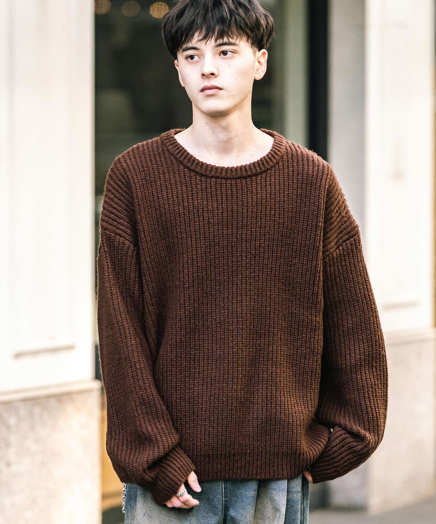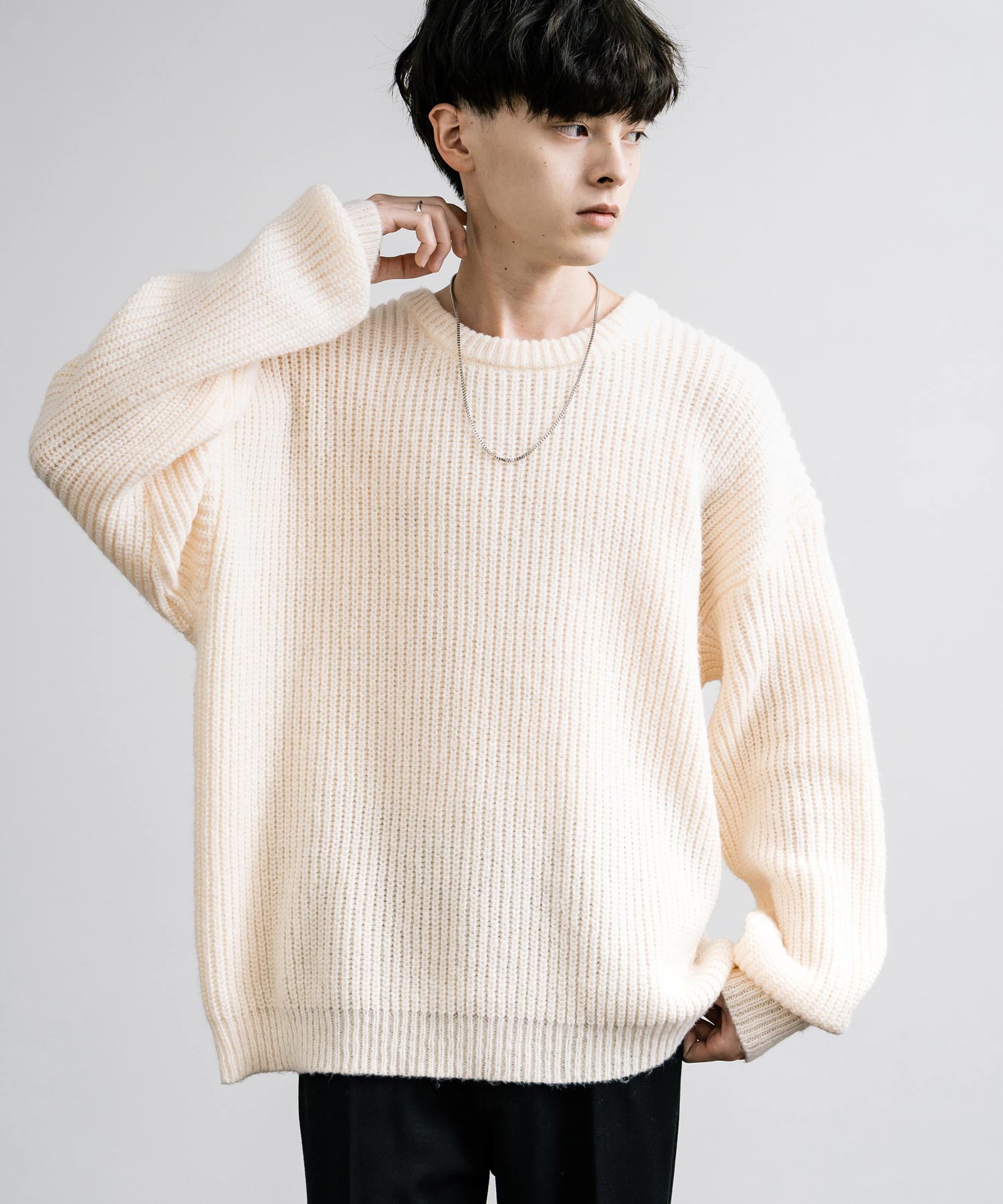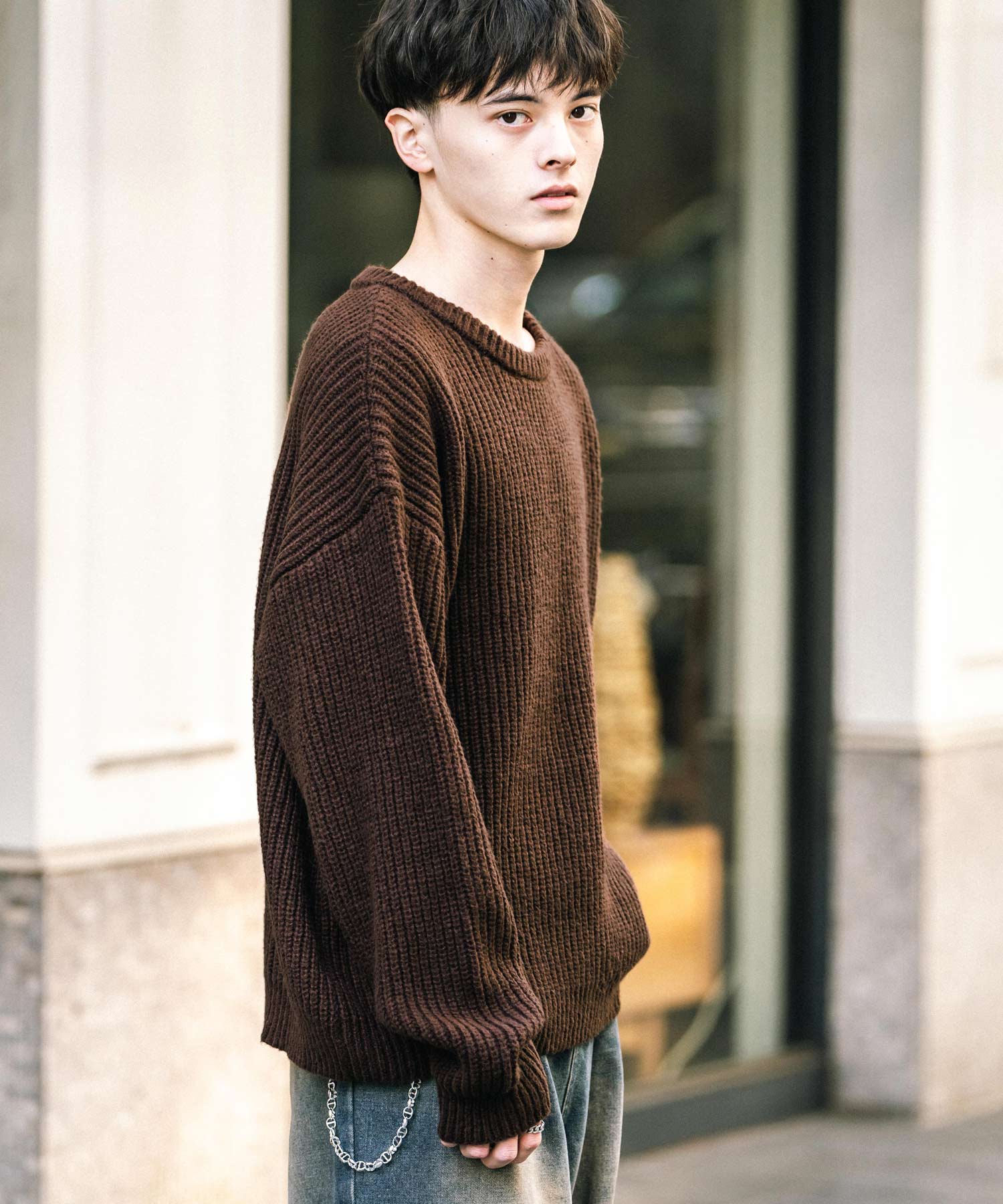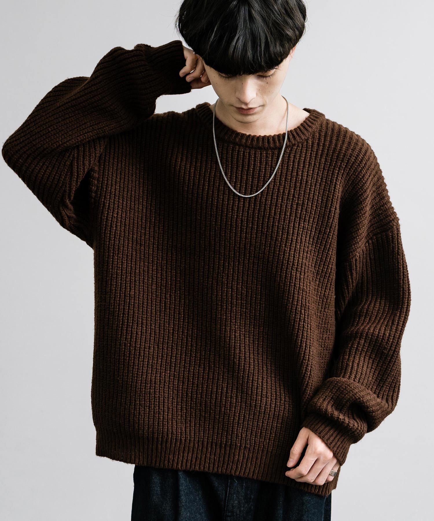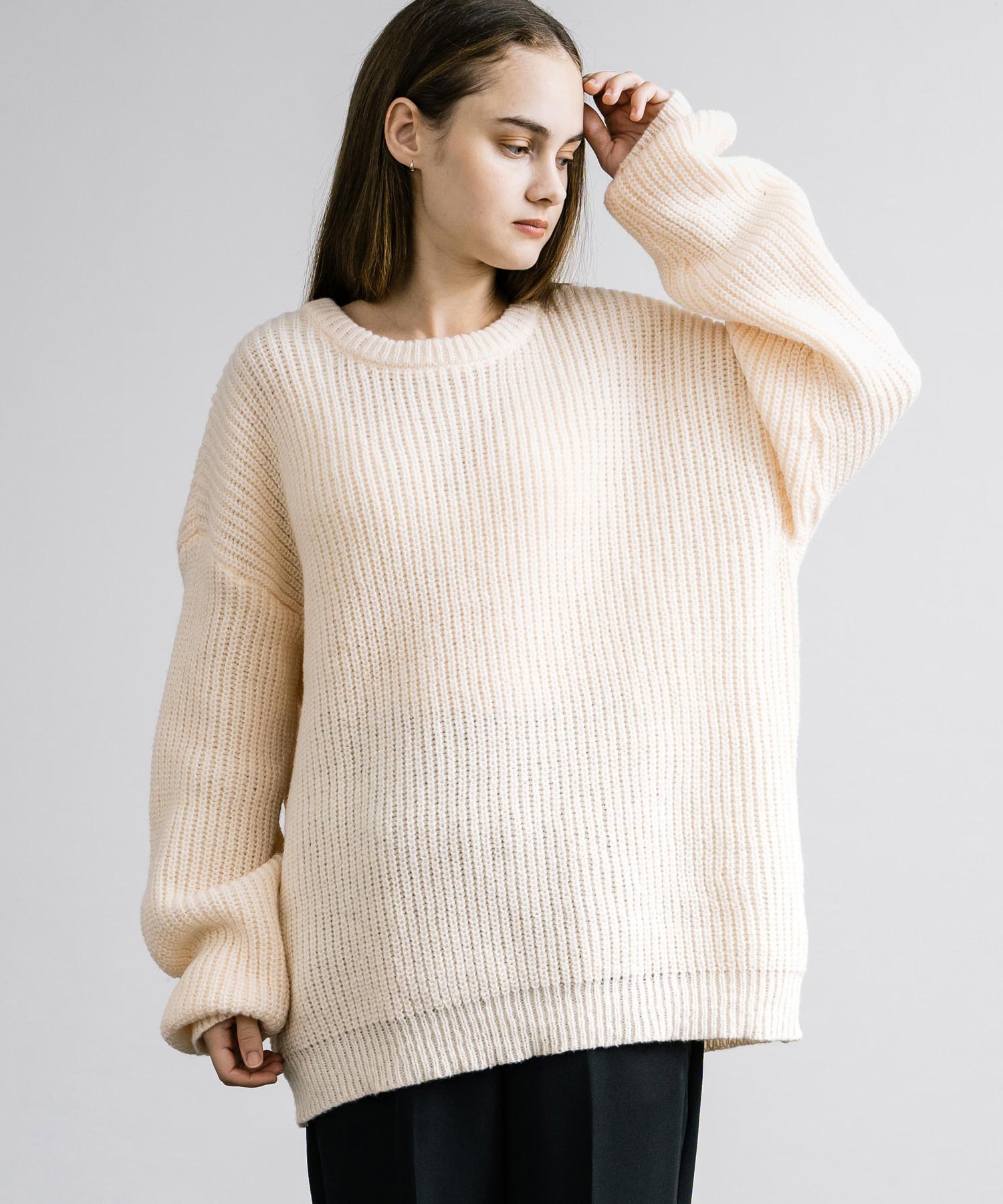 軽い着心地のボリュームニット!オーバーサイズ畦編みクルーニットセーター。