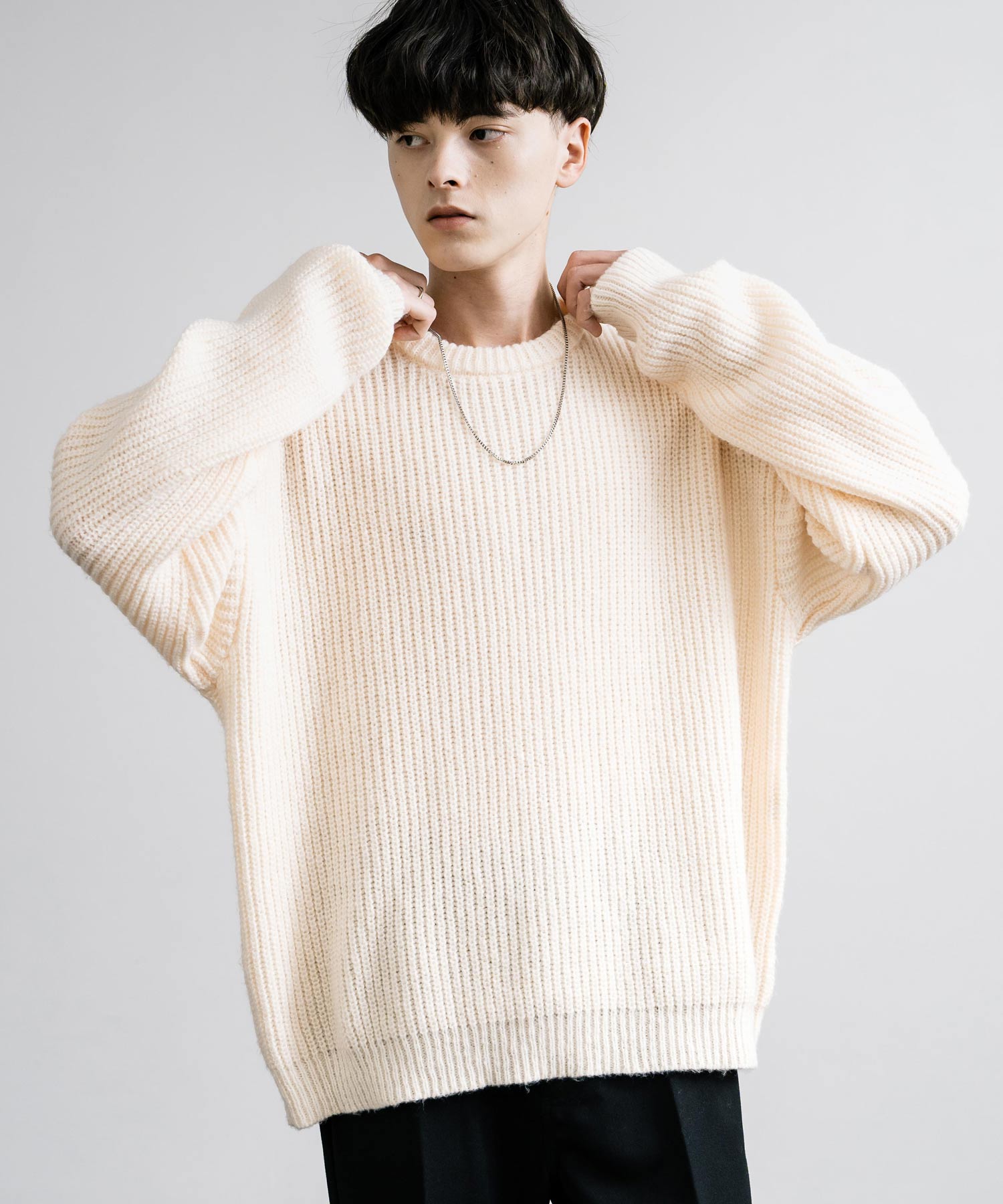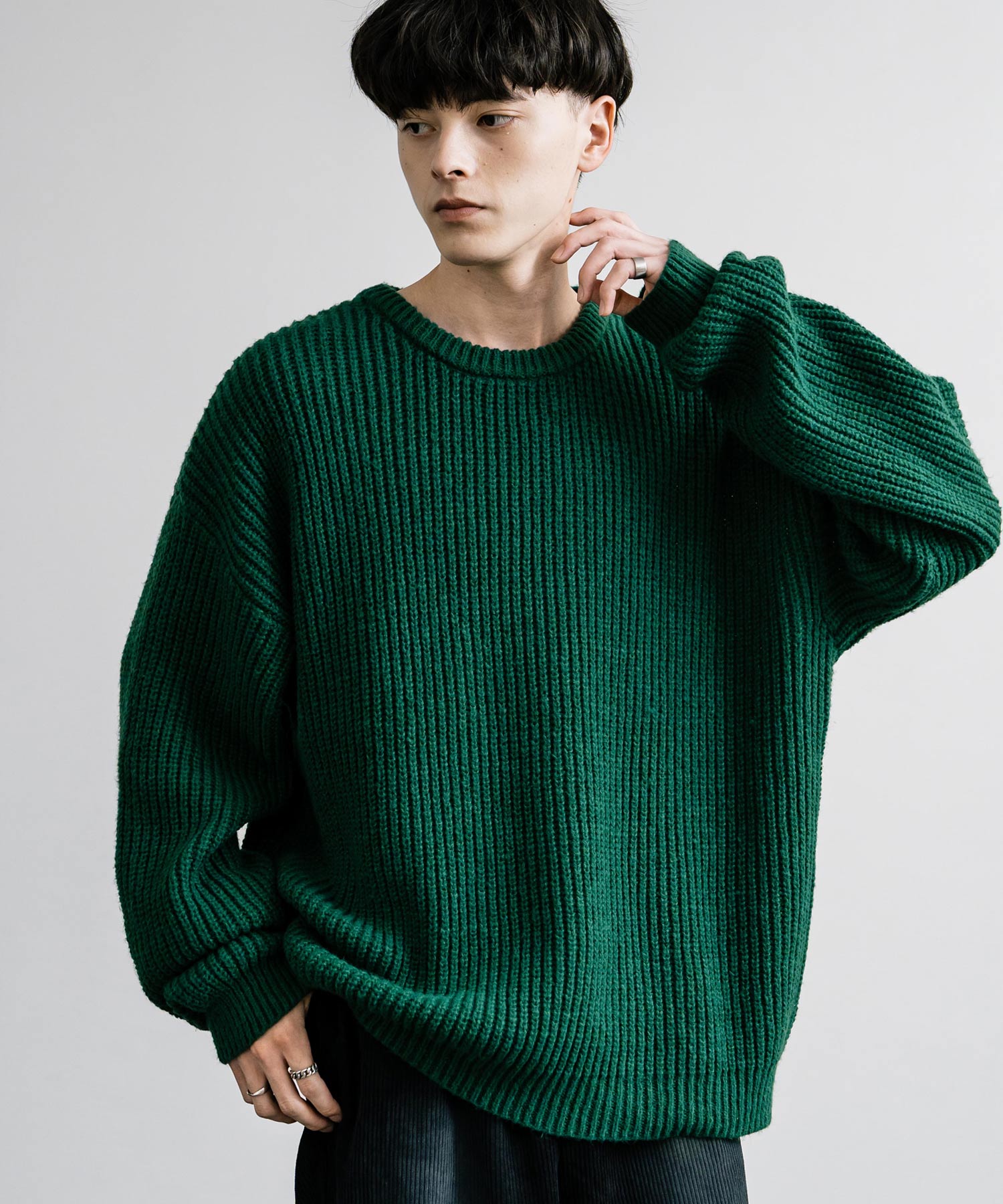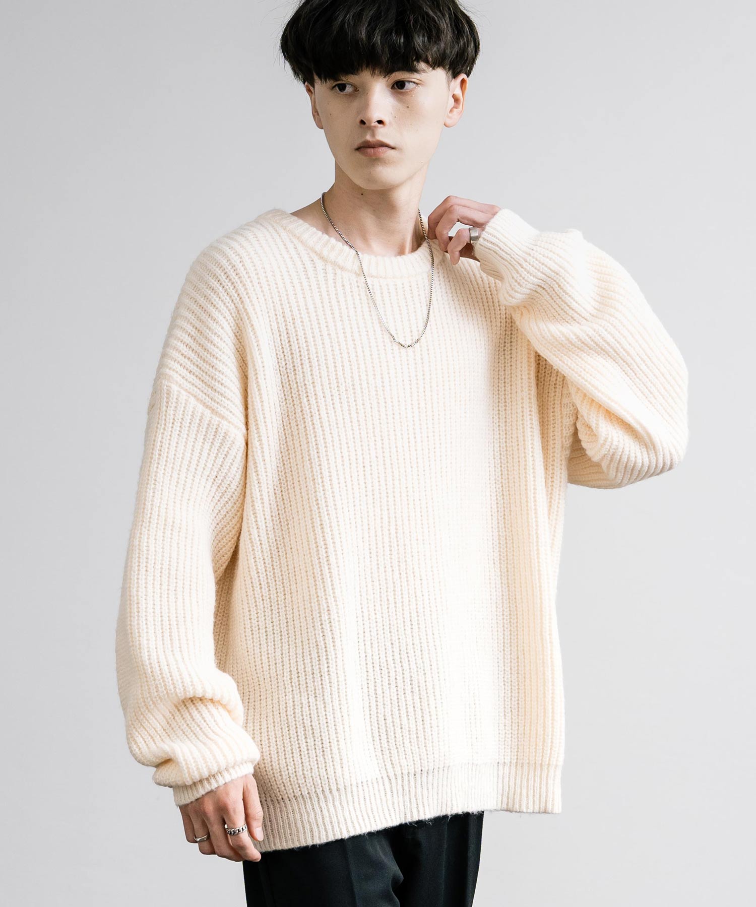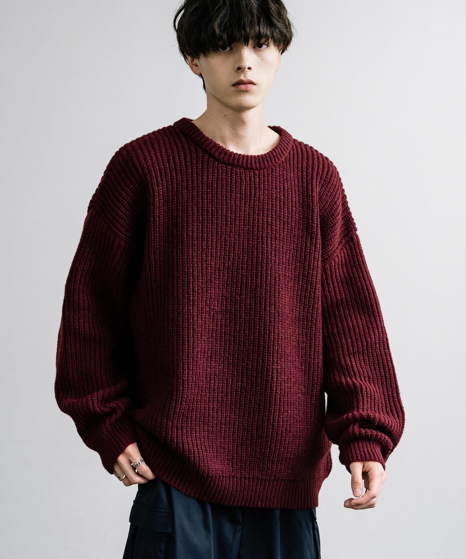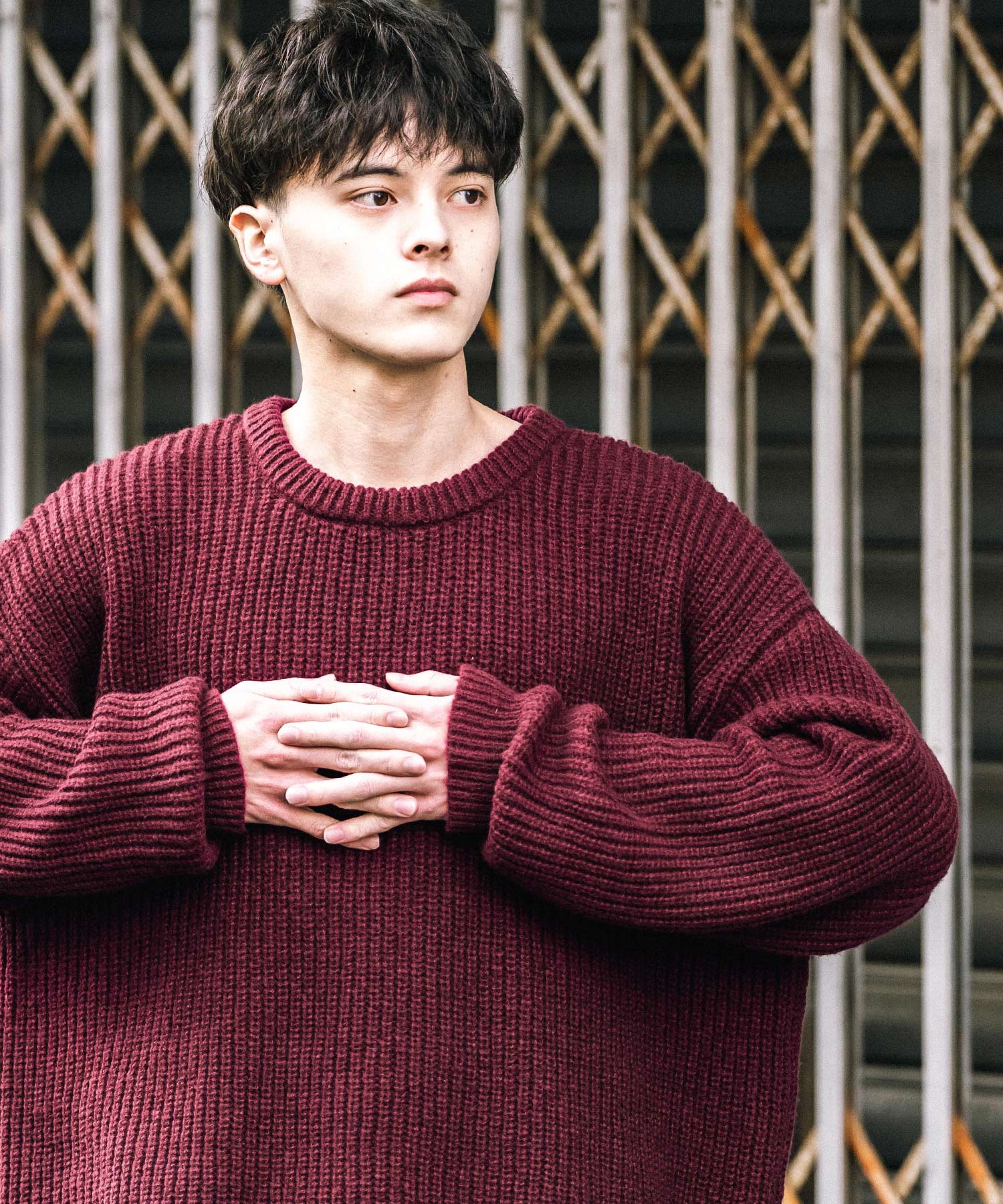 軽い着心地のボリュームニット!オーバーサイズ畦編みクルーニットセーター。