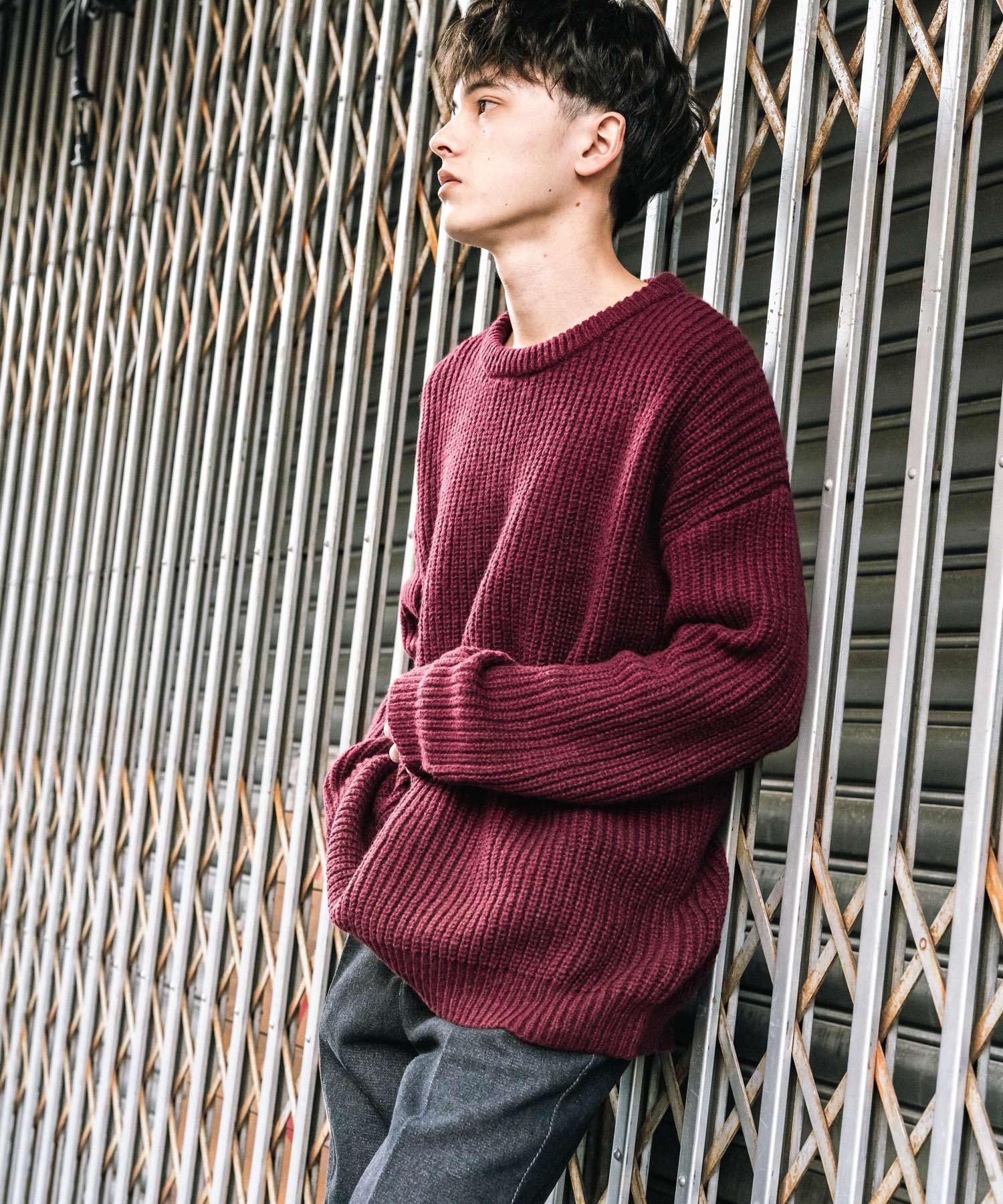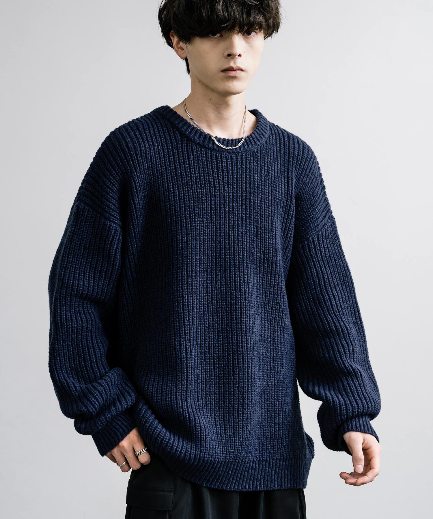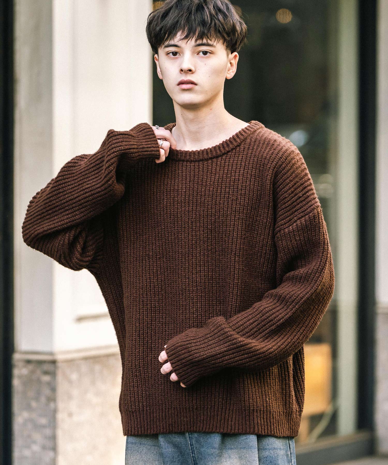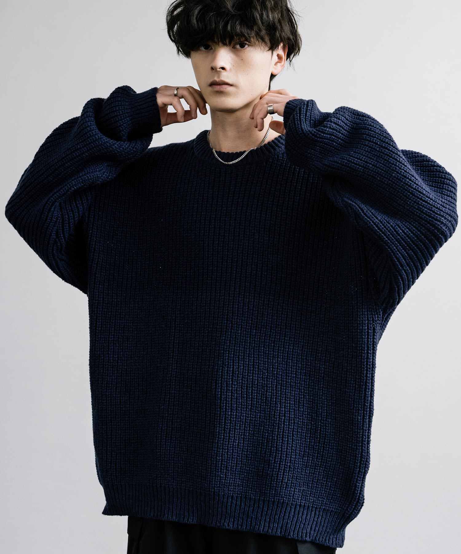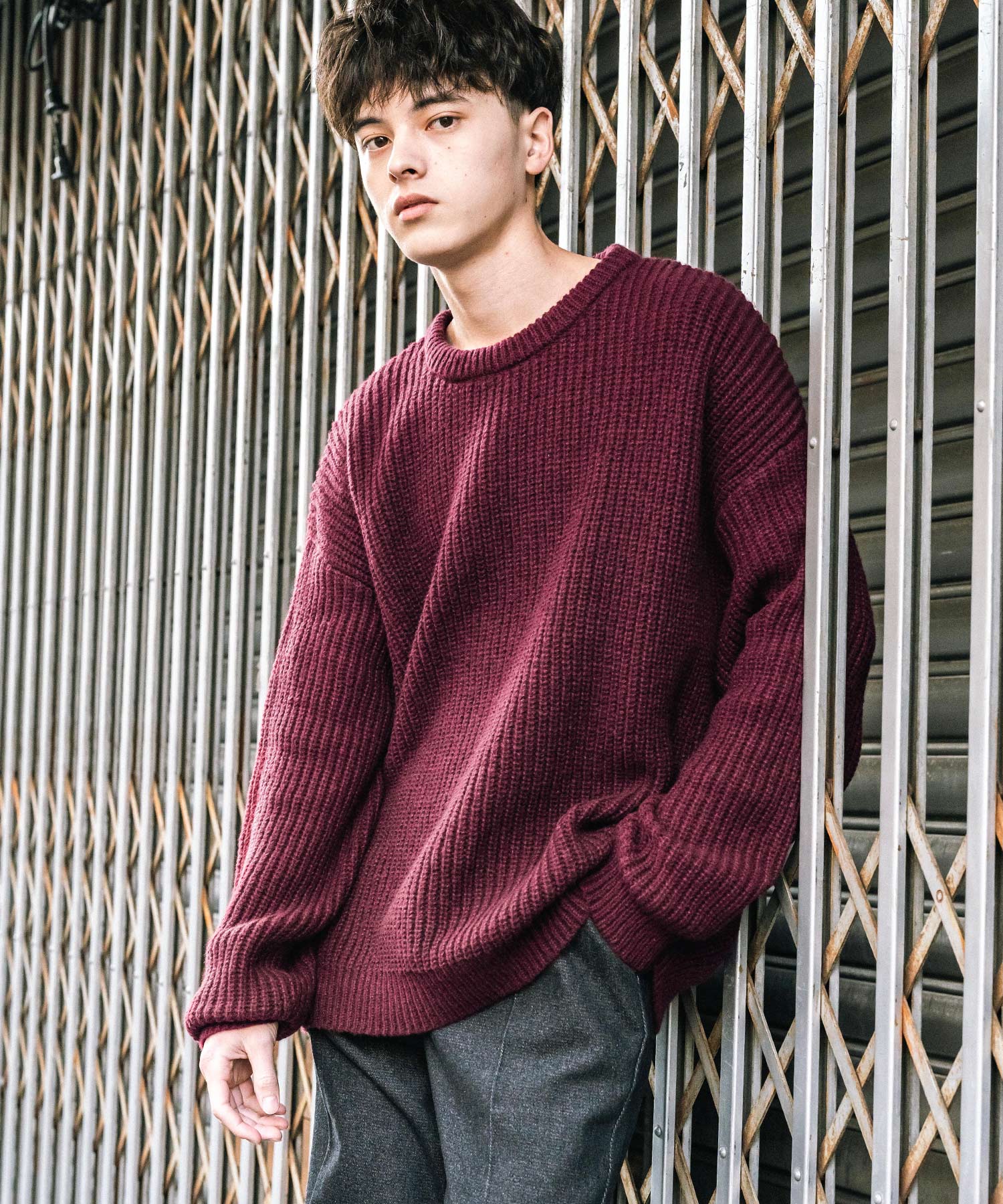 軽い着心地のボリュームニット!オーバーサイズ畦編みクルーニットセーター。