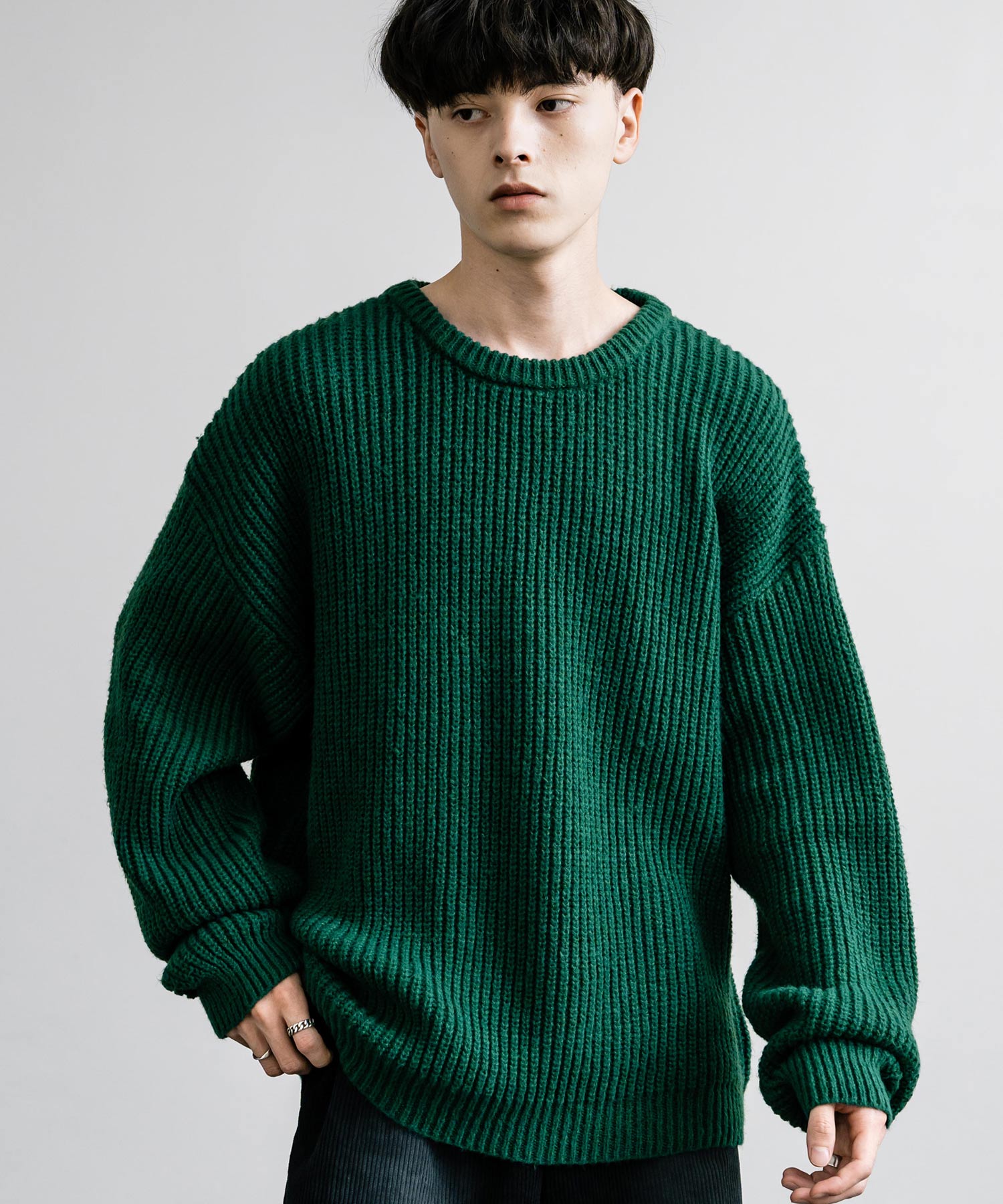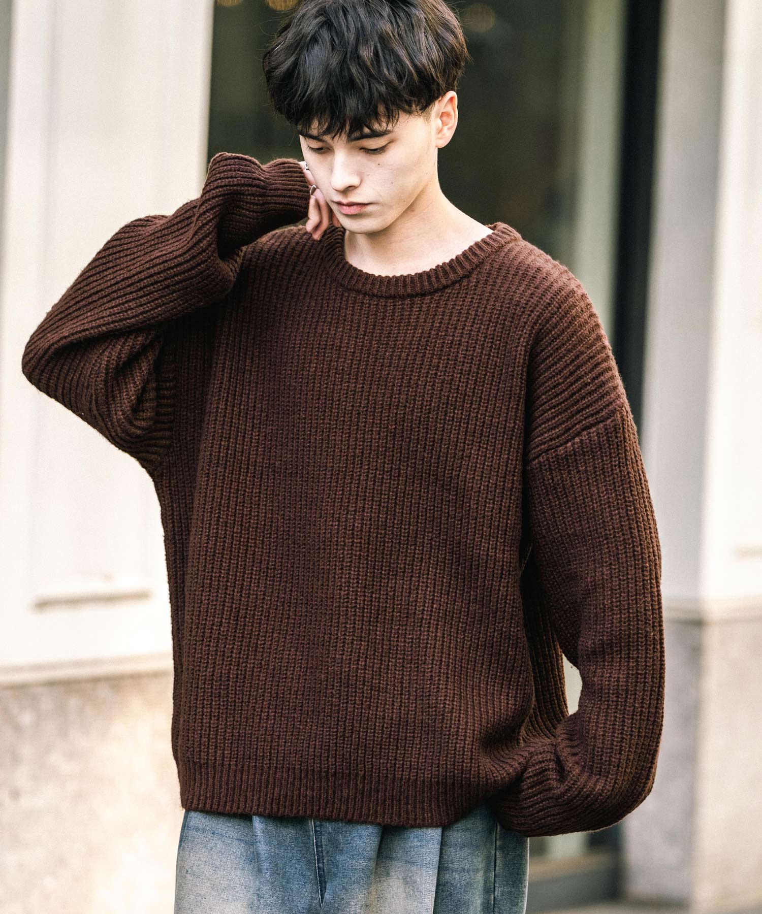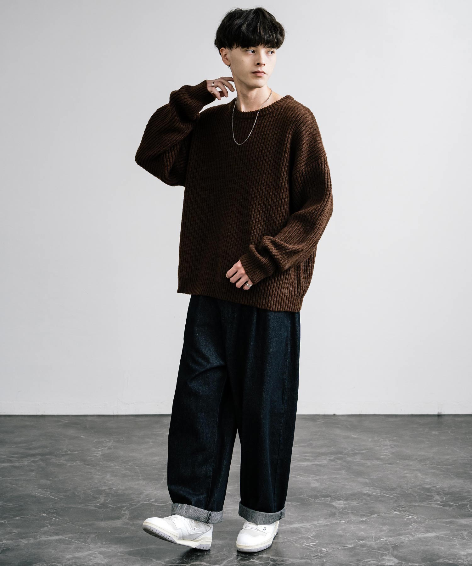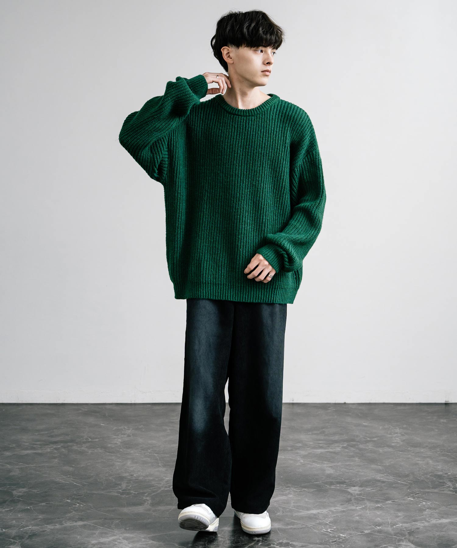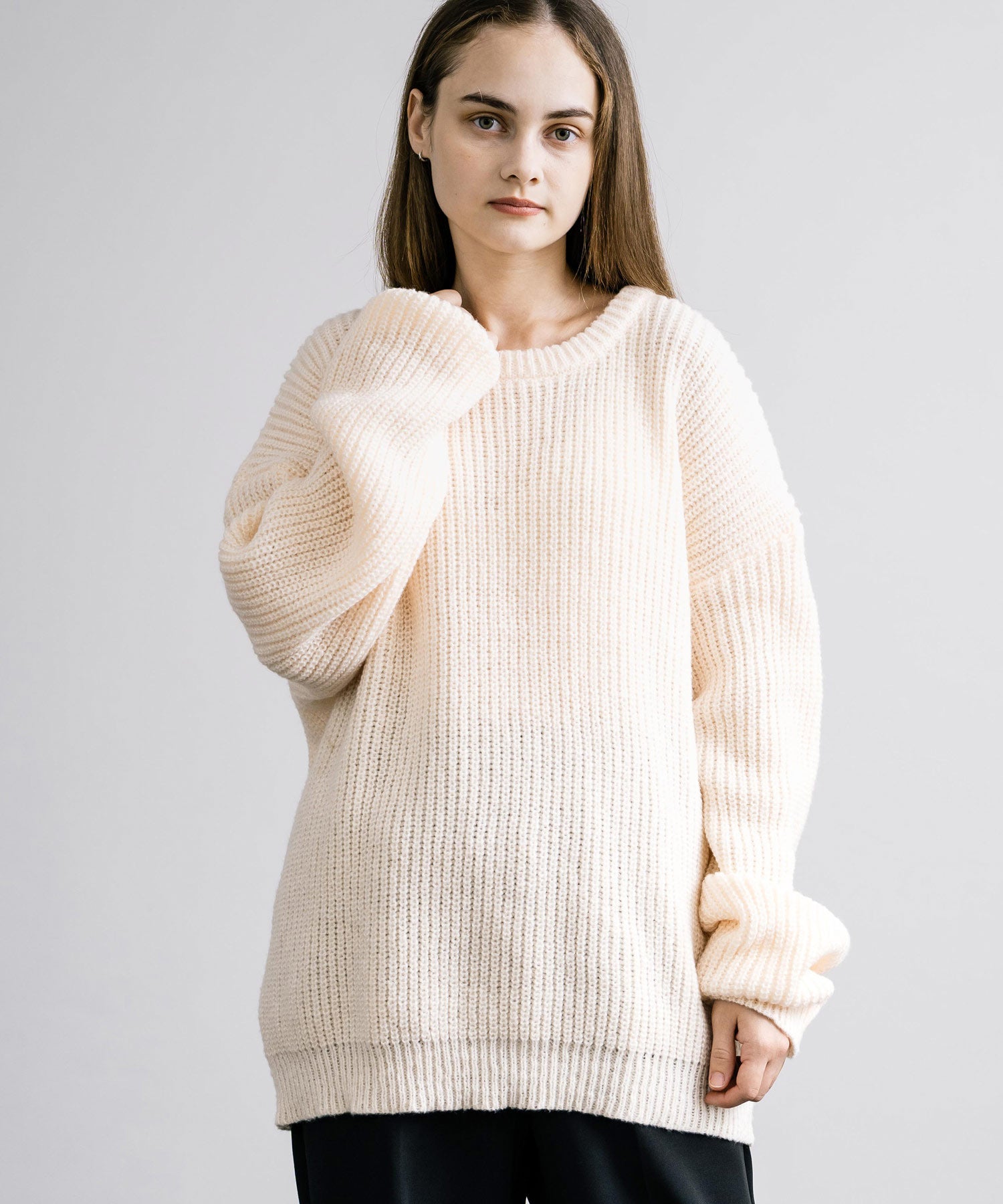 軽い着心地のボリュームニット!オーバーサイズ畦編みクルーニットセーター。