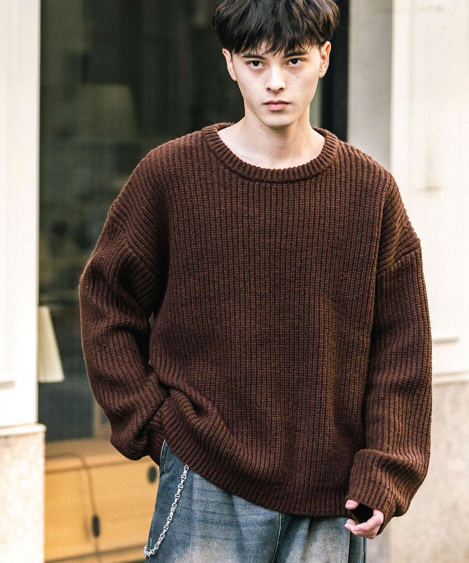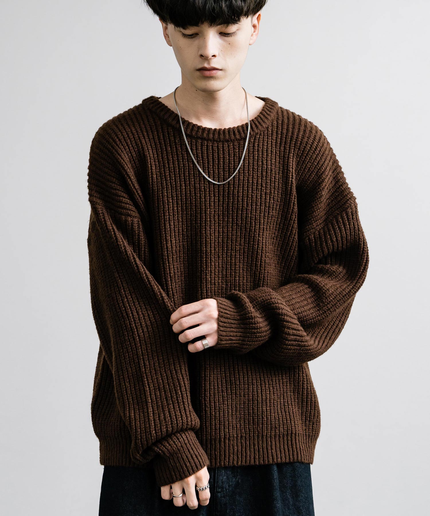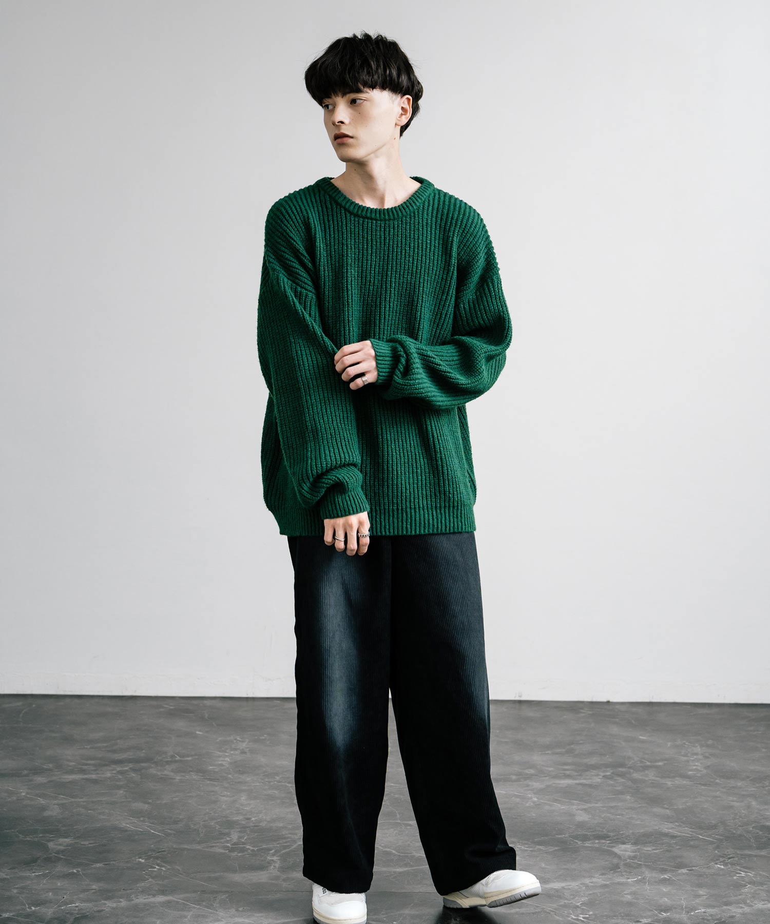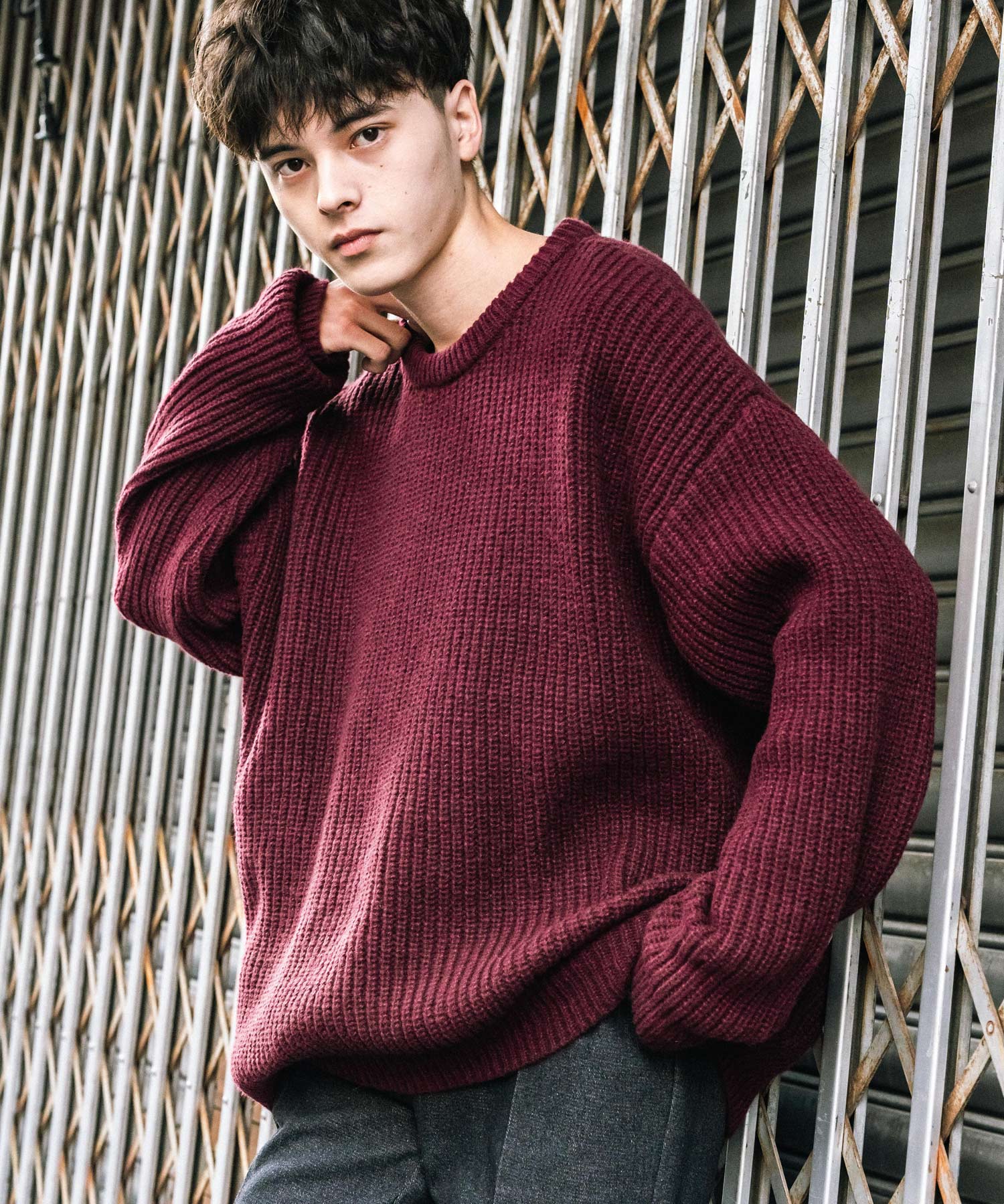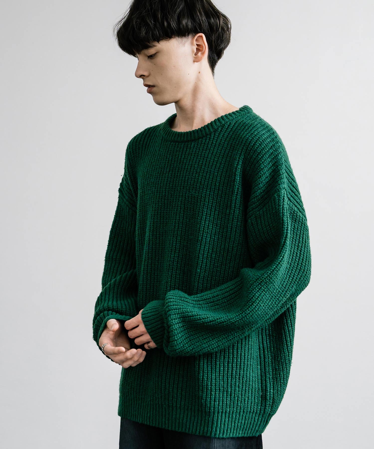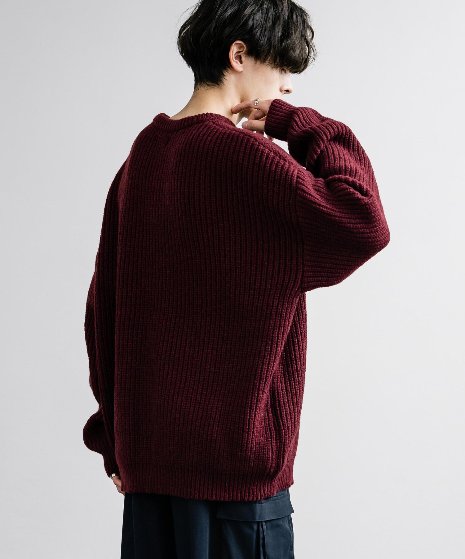 軽い着心地のボリュームニット!オーバーサイズ畦編みクルーニットセーター。