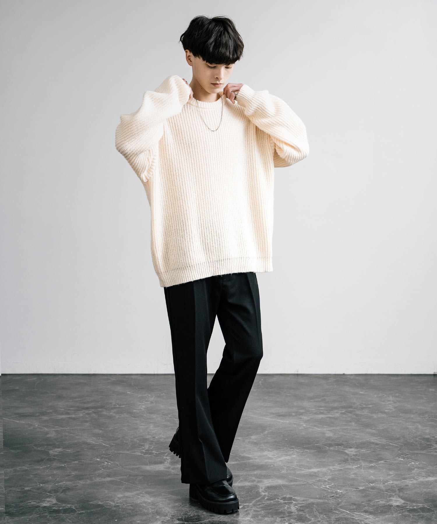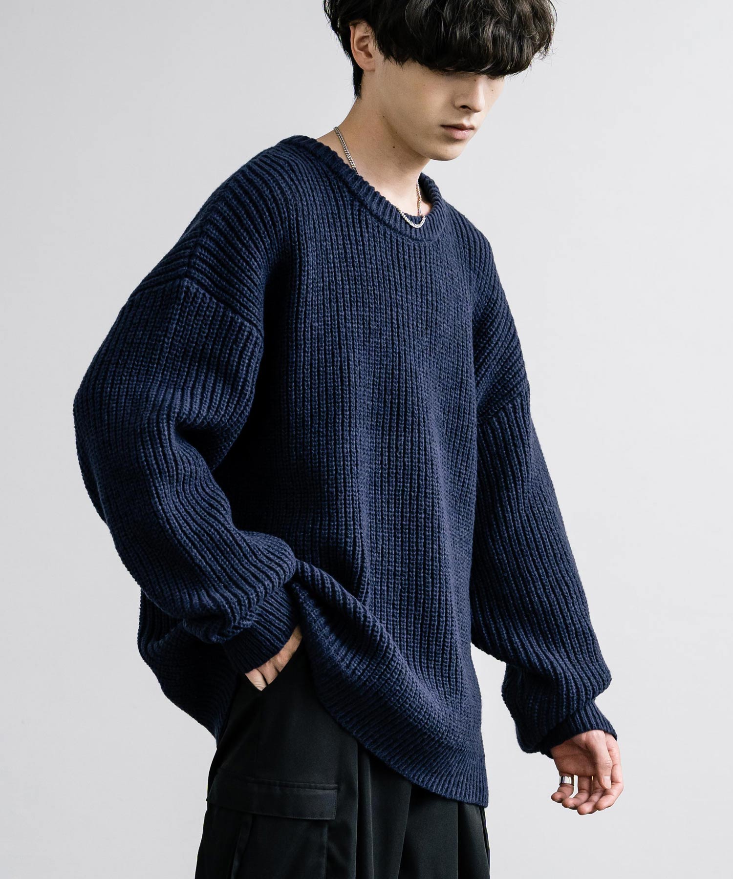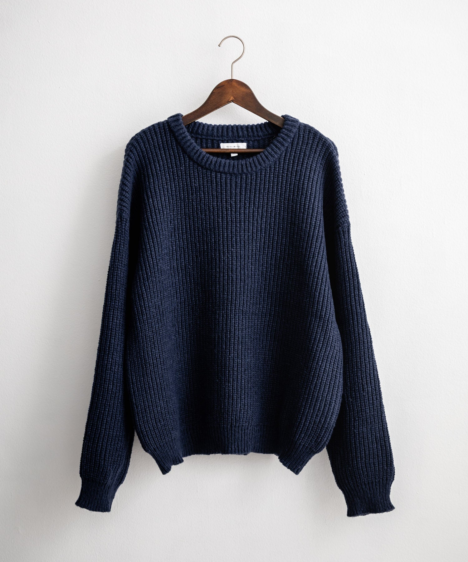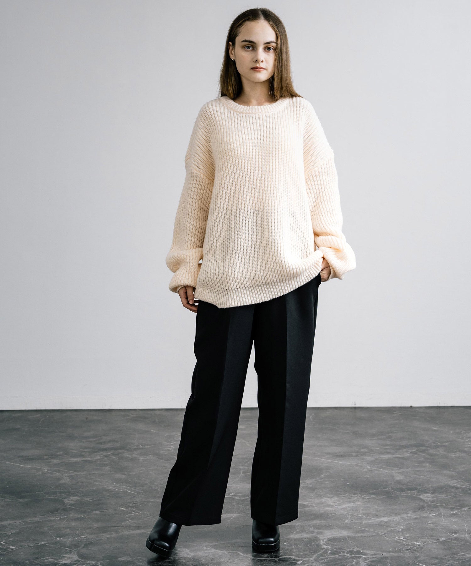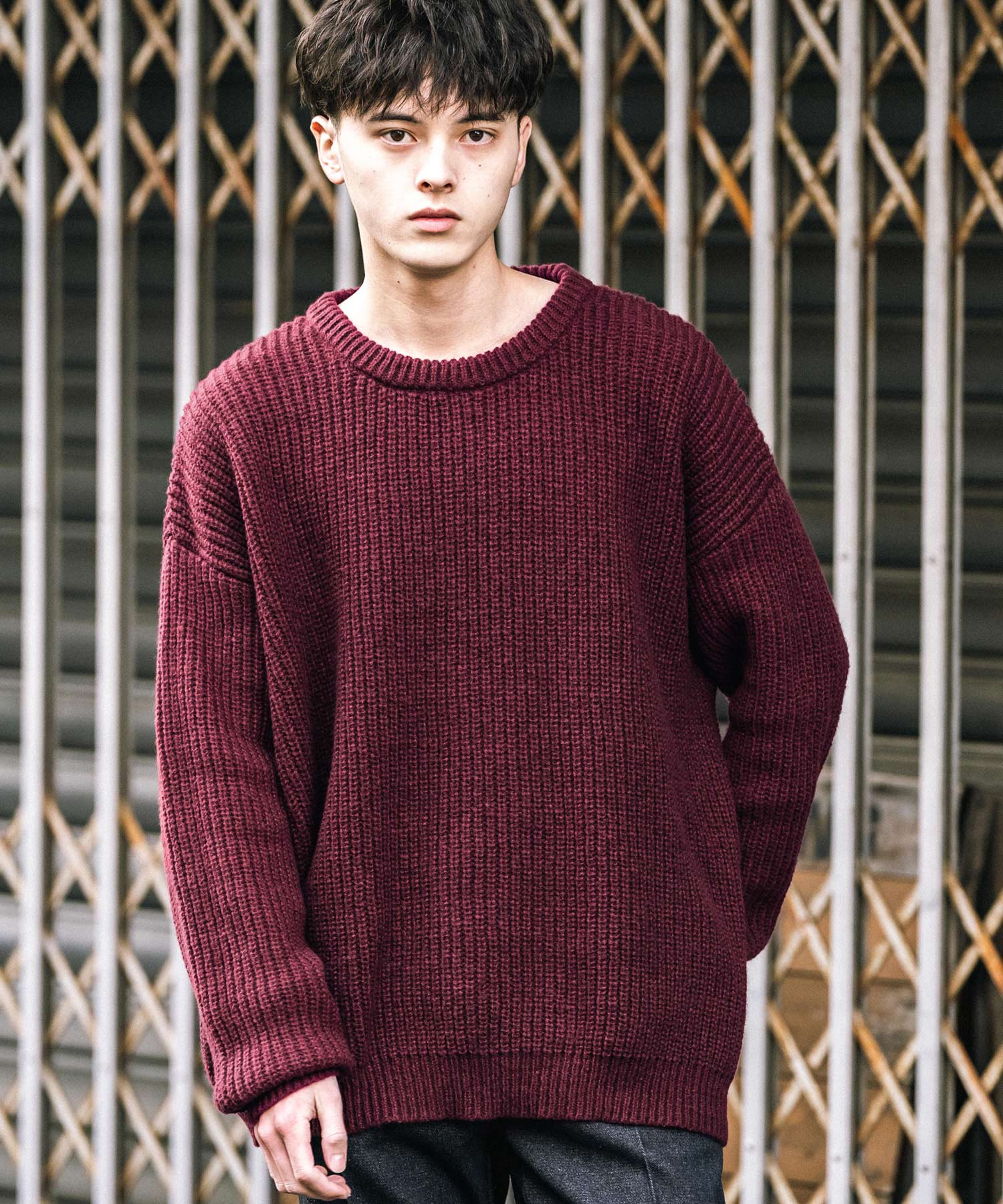 軽い着心地のボリュームニット!オーバーサイズ畦編みクルーニットセーター。