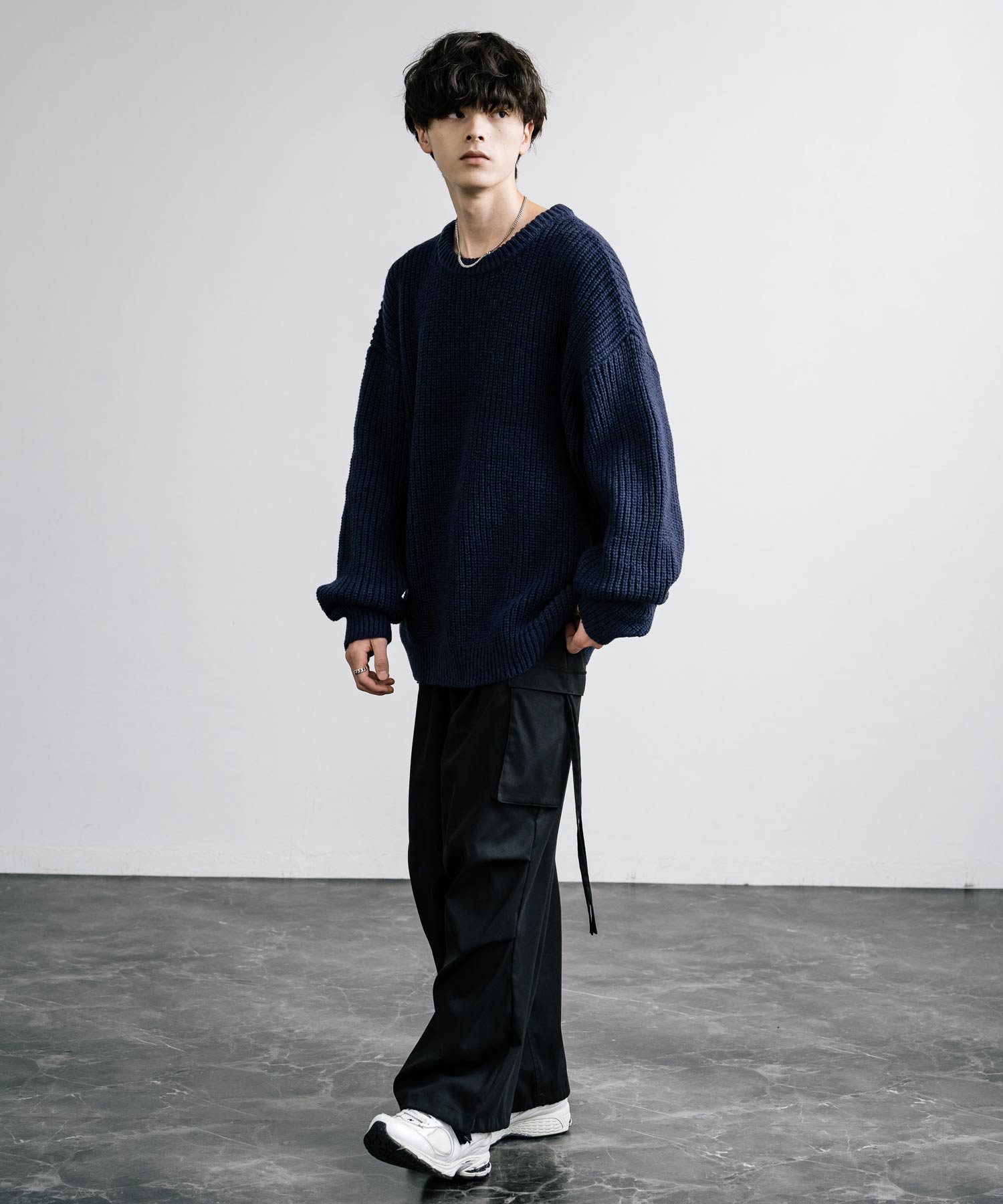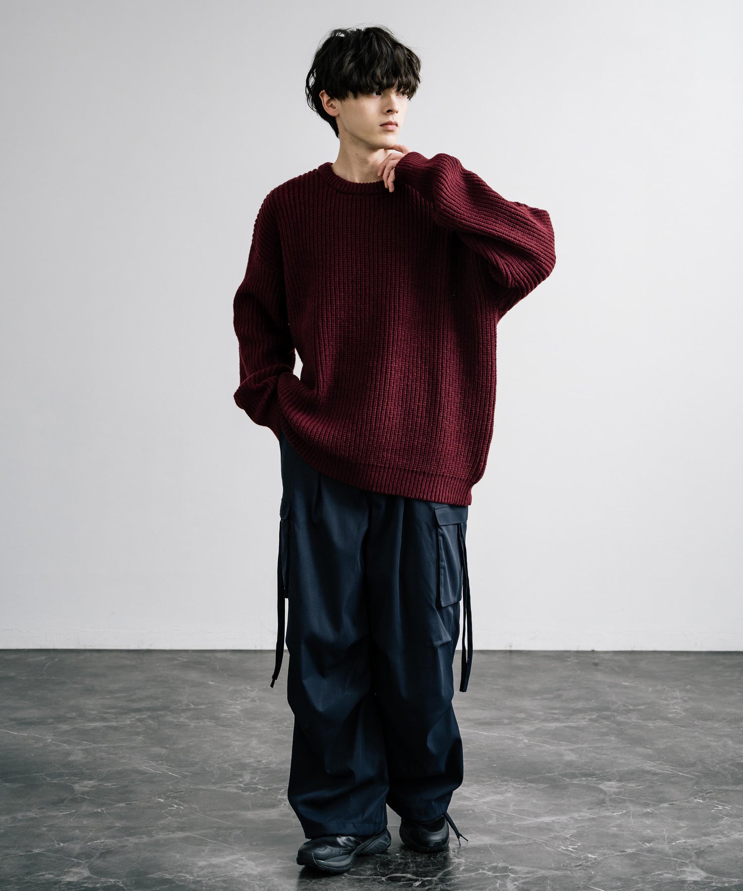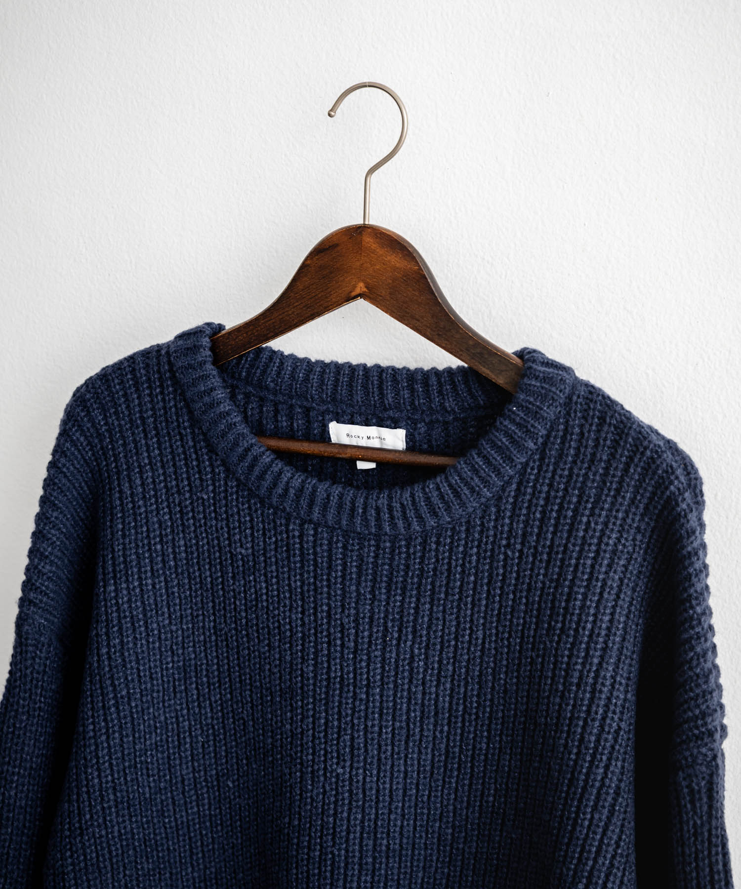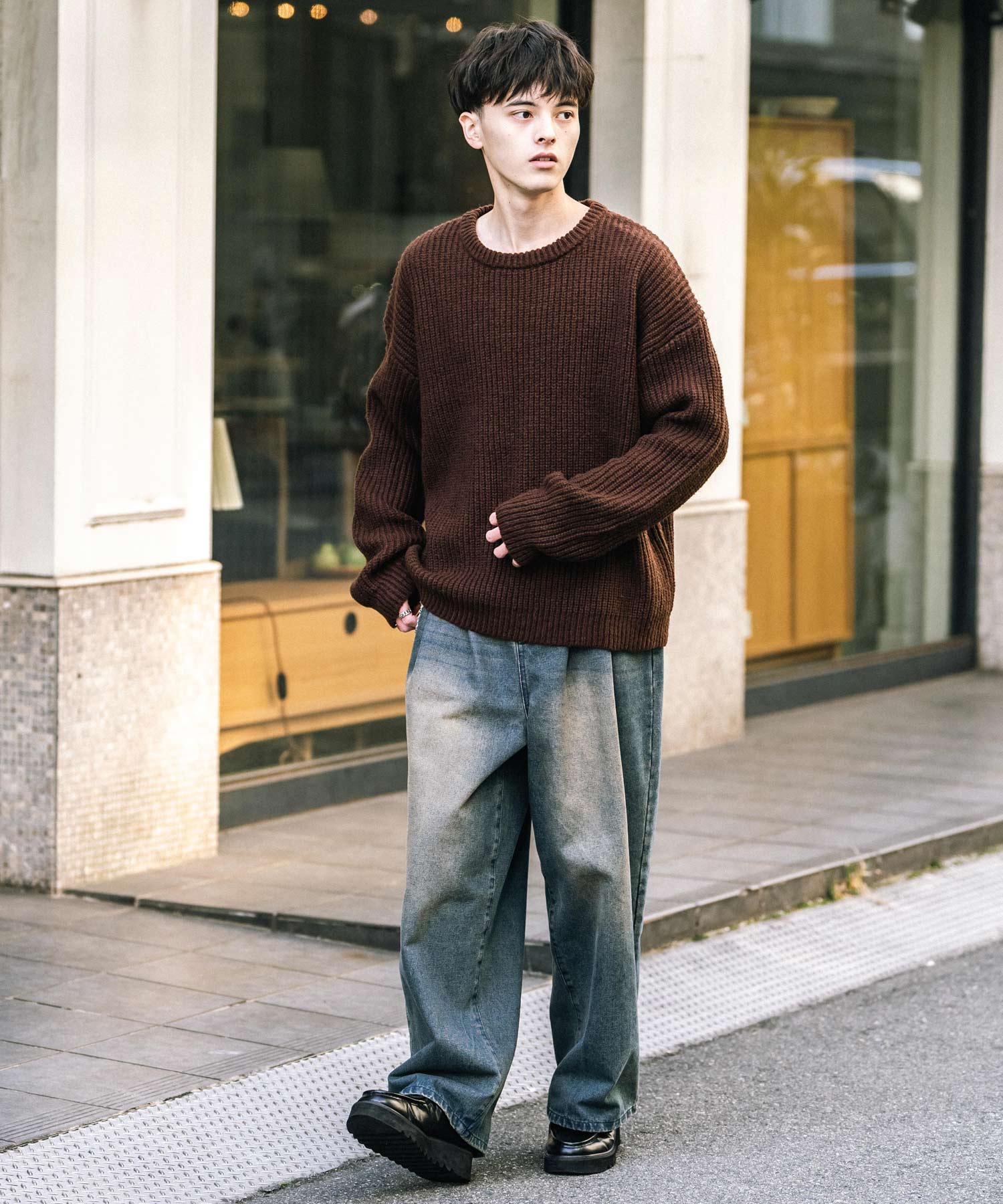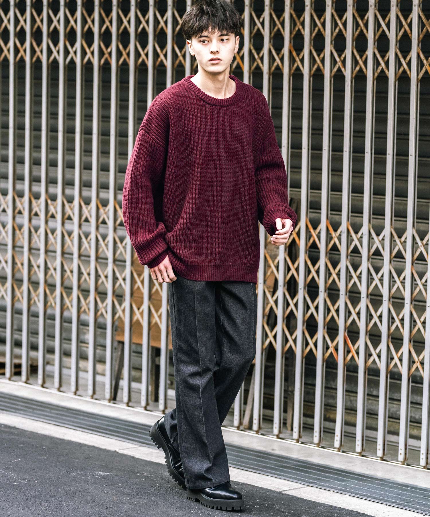 軽い着心地のボリュームニット!オーバーサイズ畦編みクルーニットセーター。