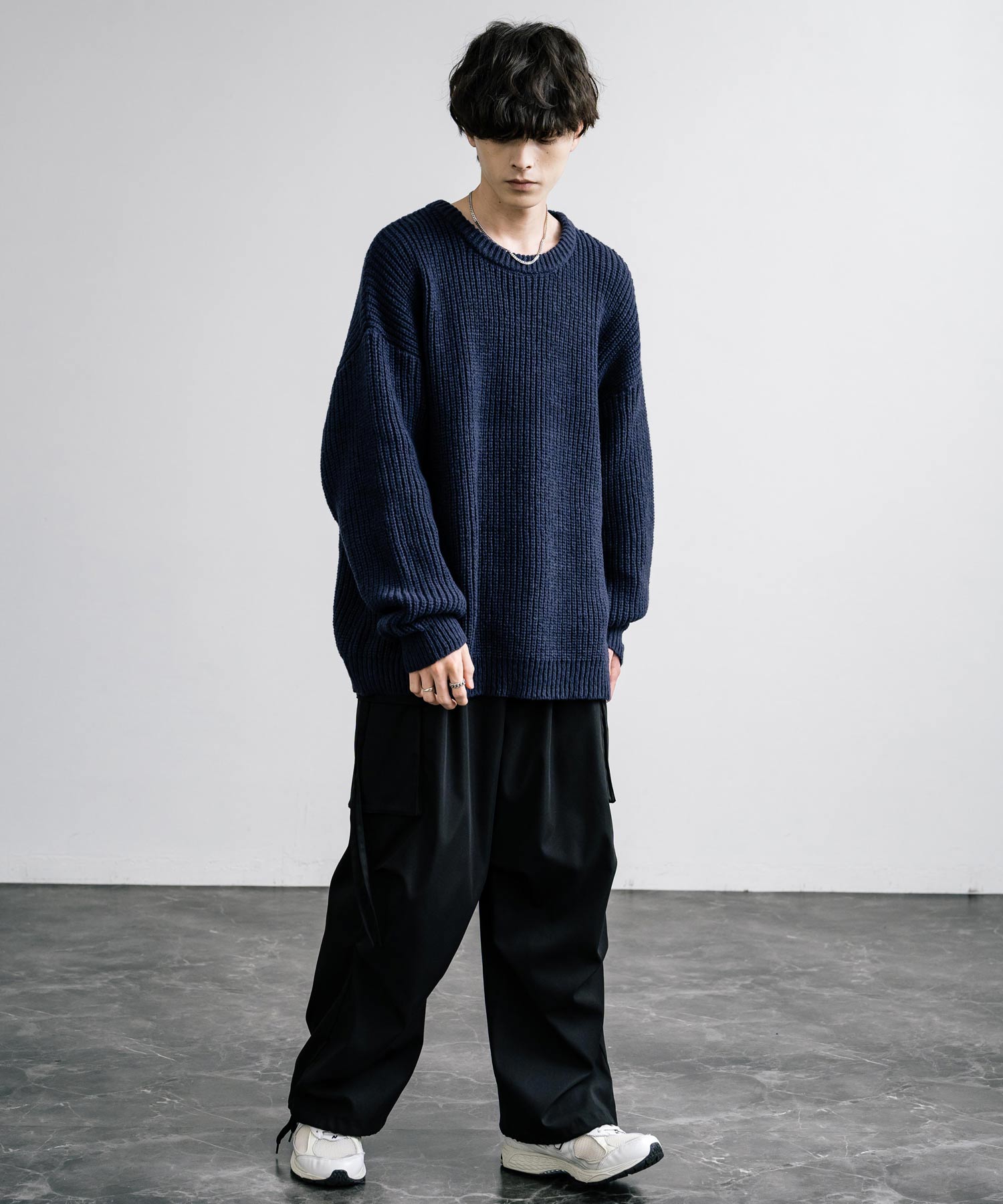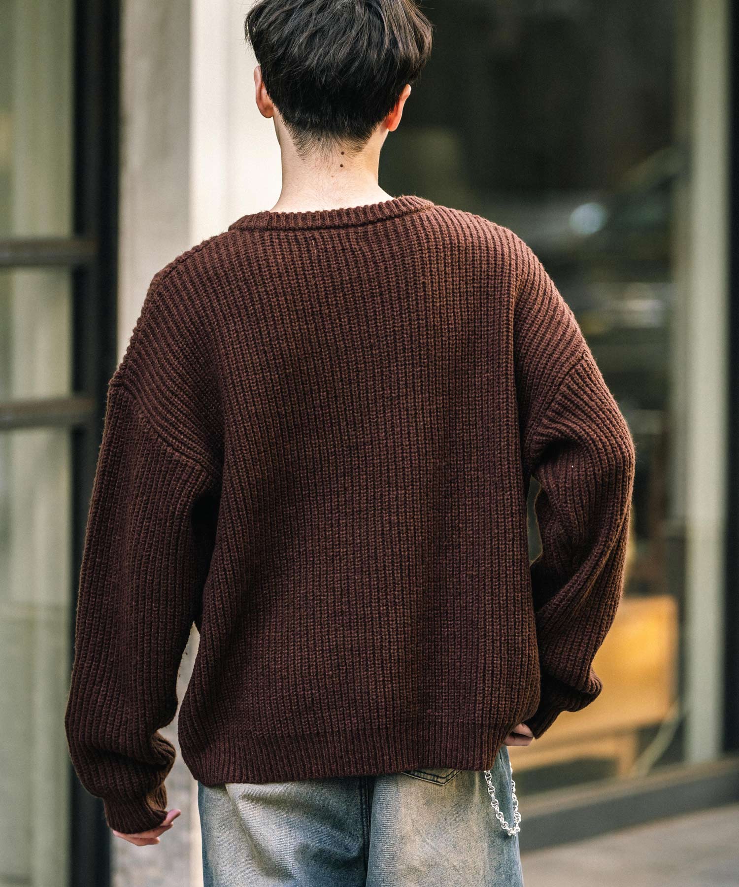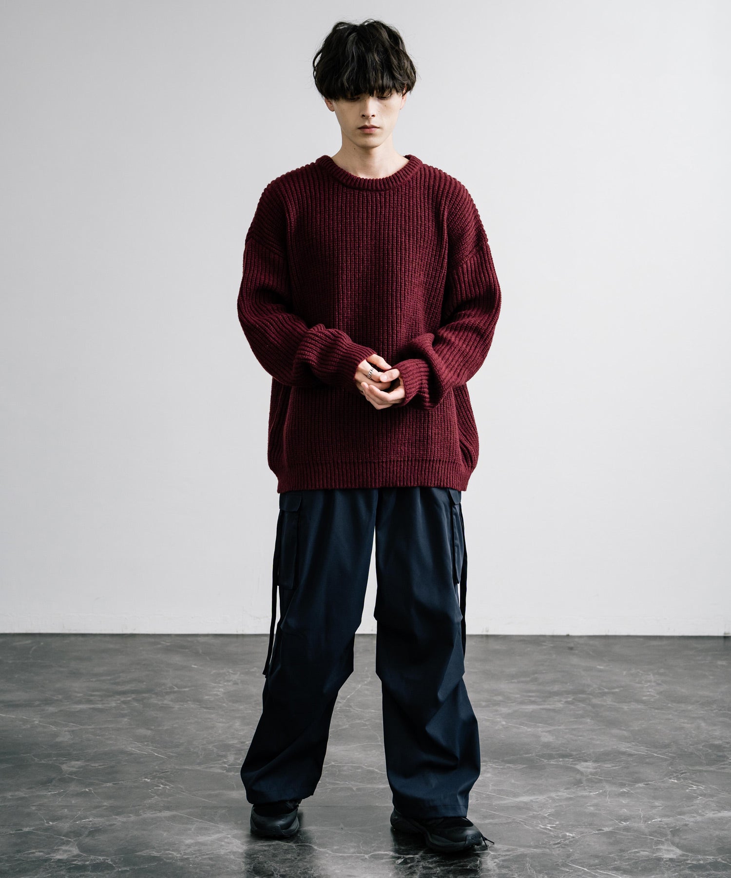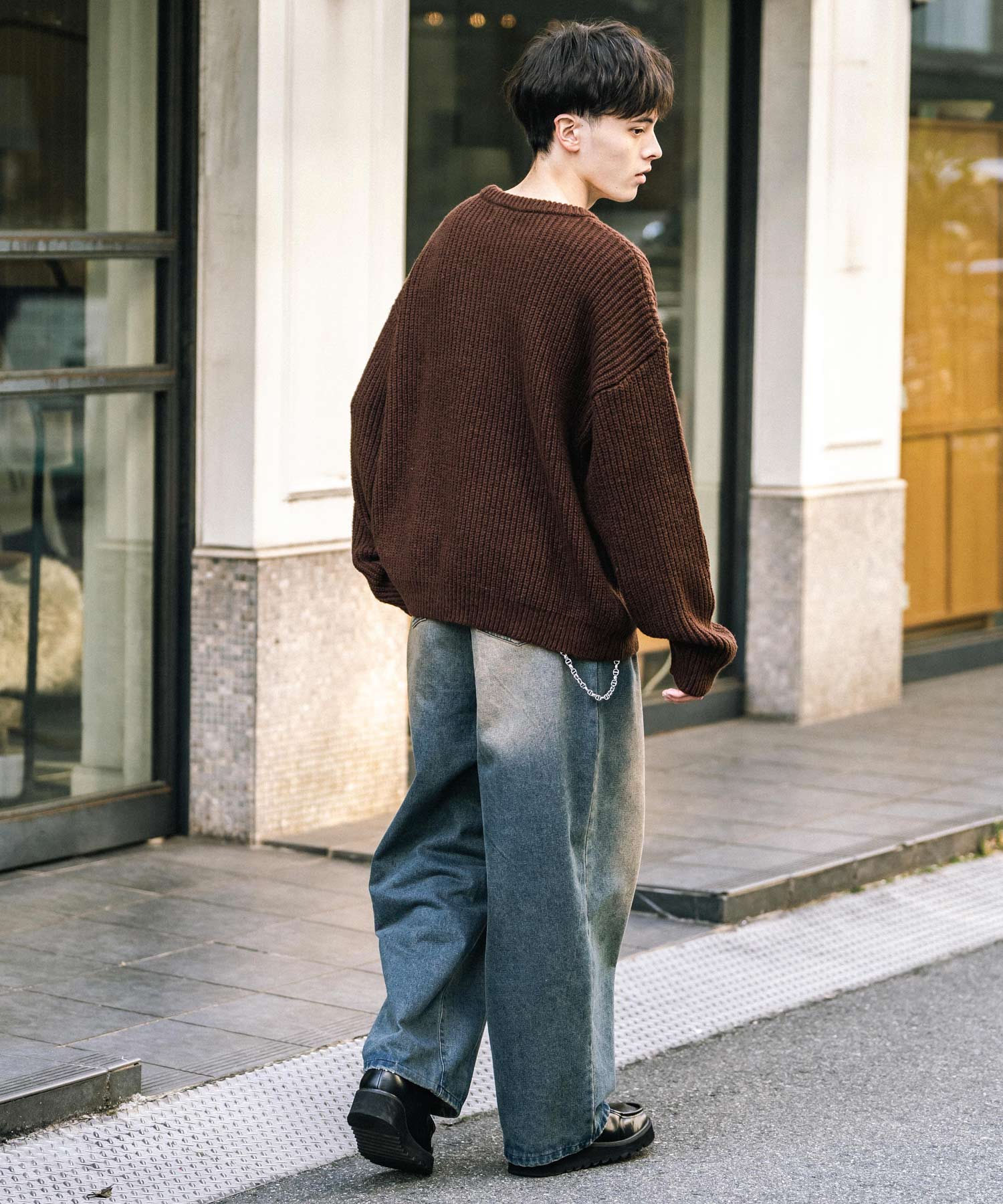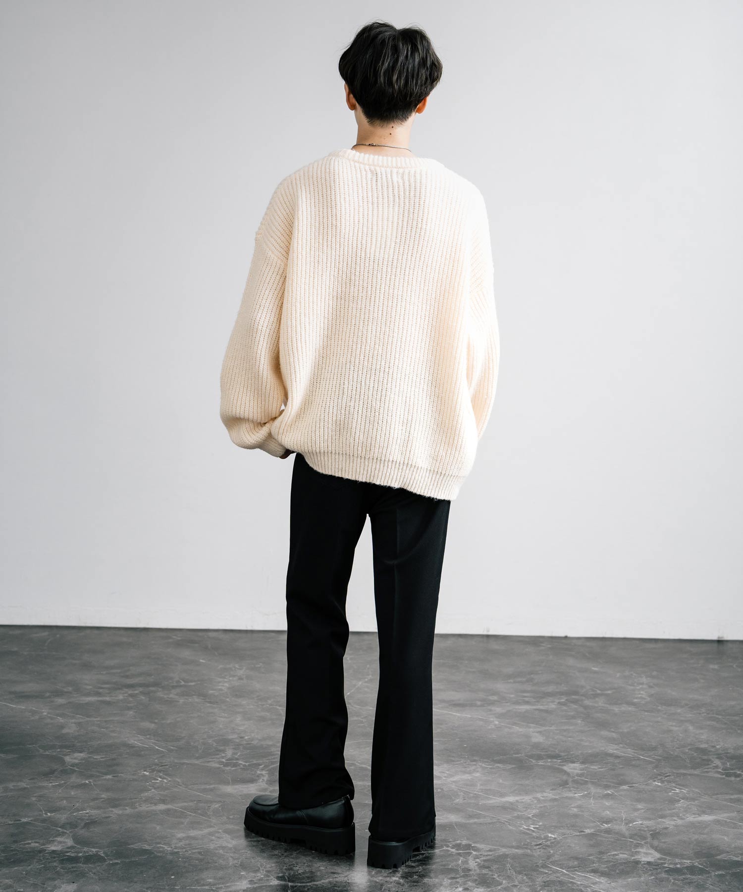 軽い着心地のボリュームニット!オーバーサイズ畦編みクルーニットセーター。