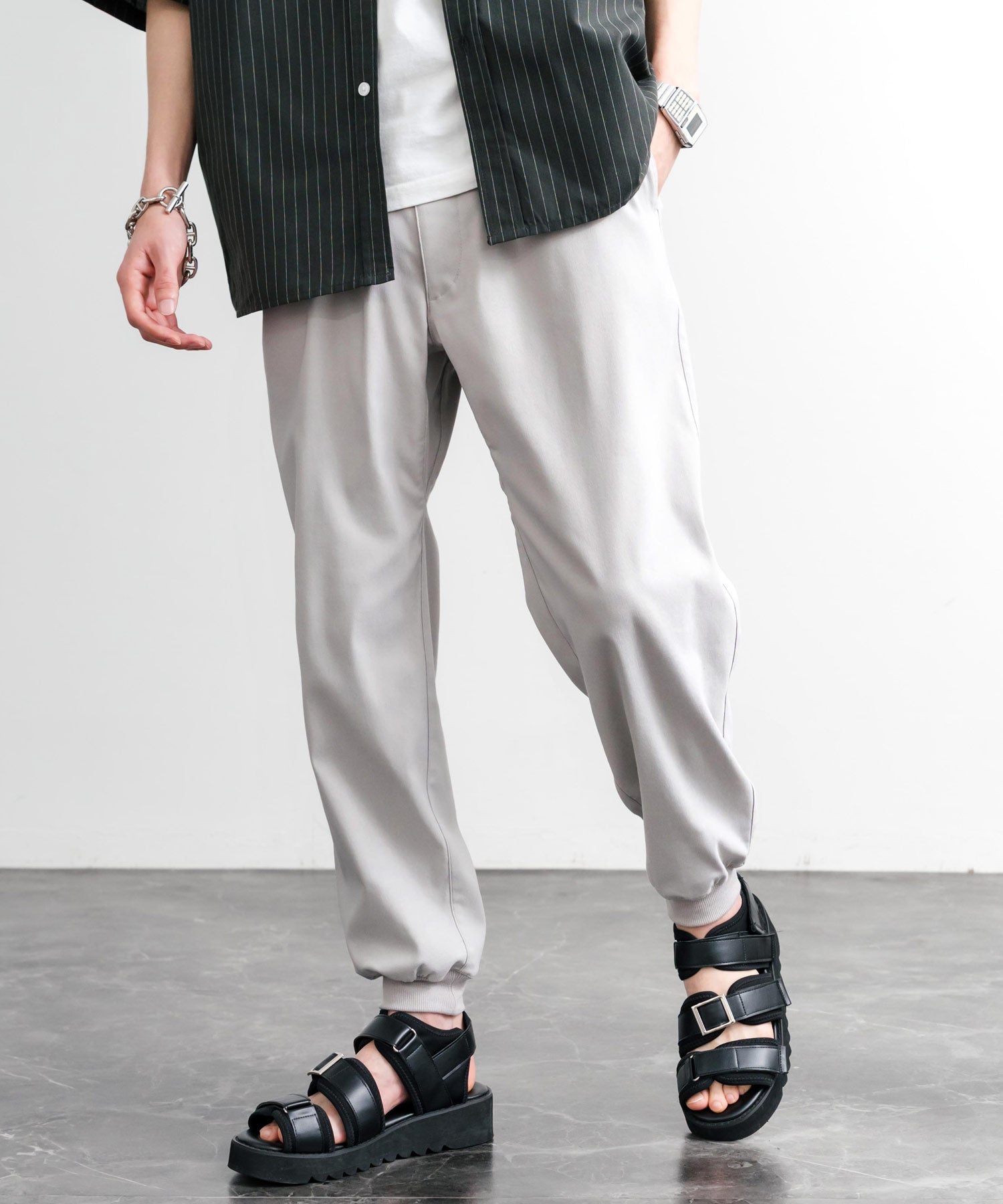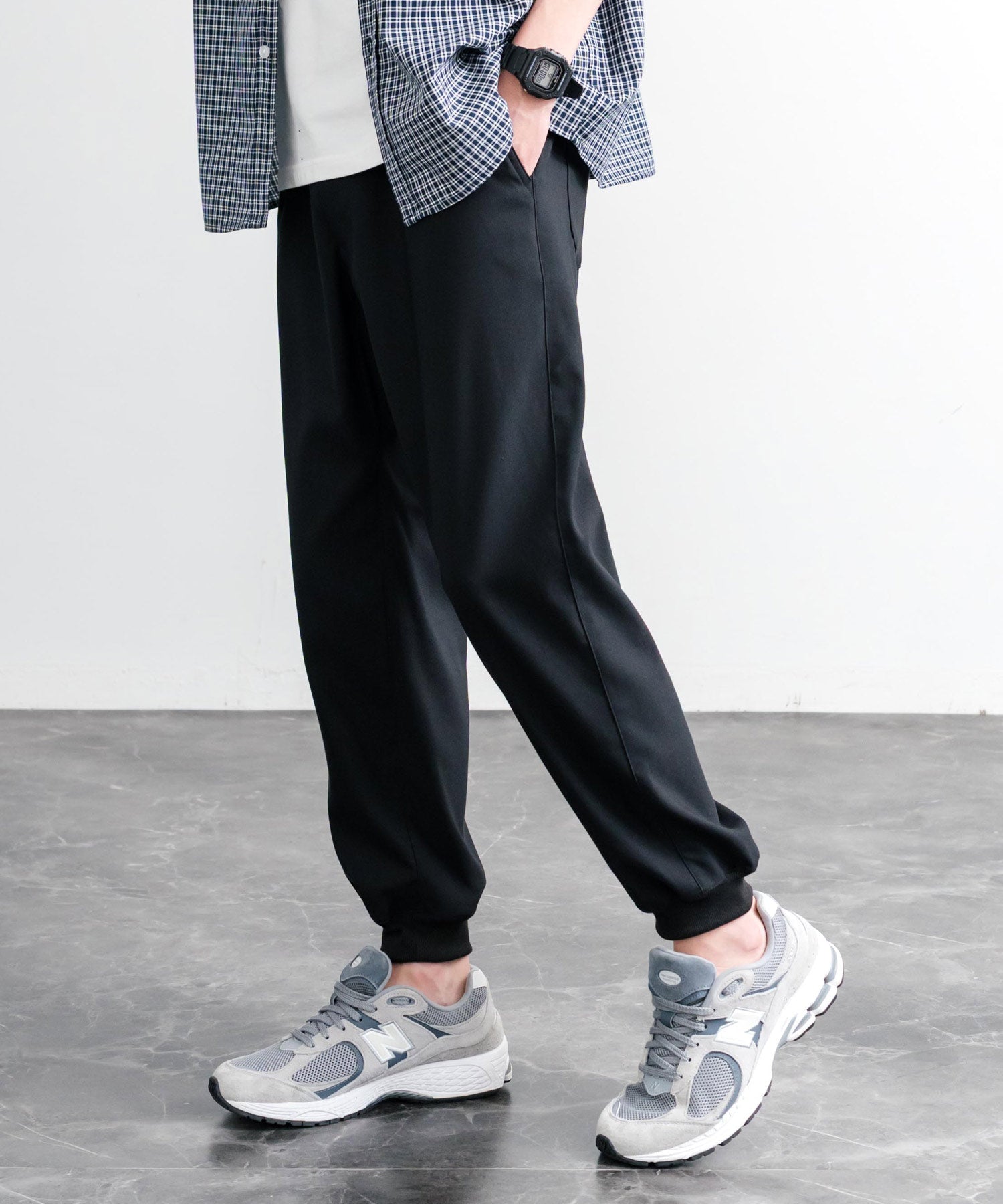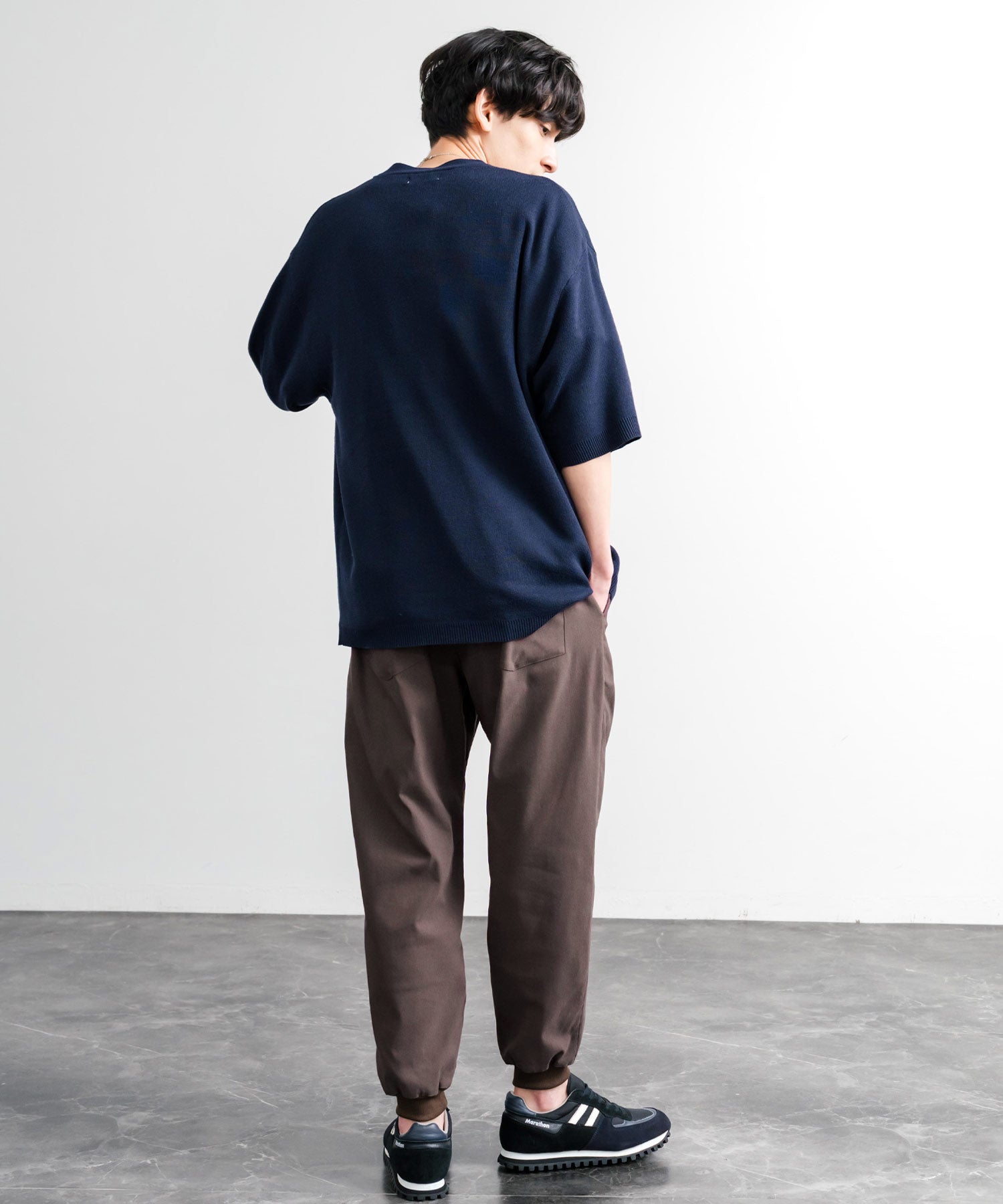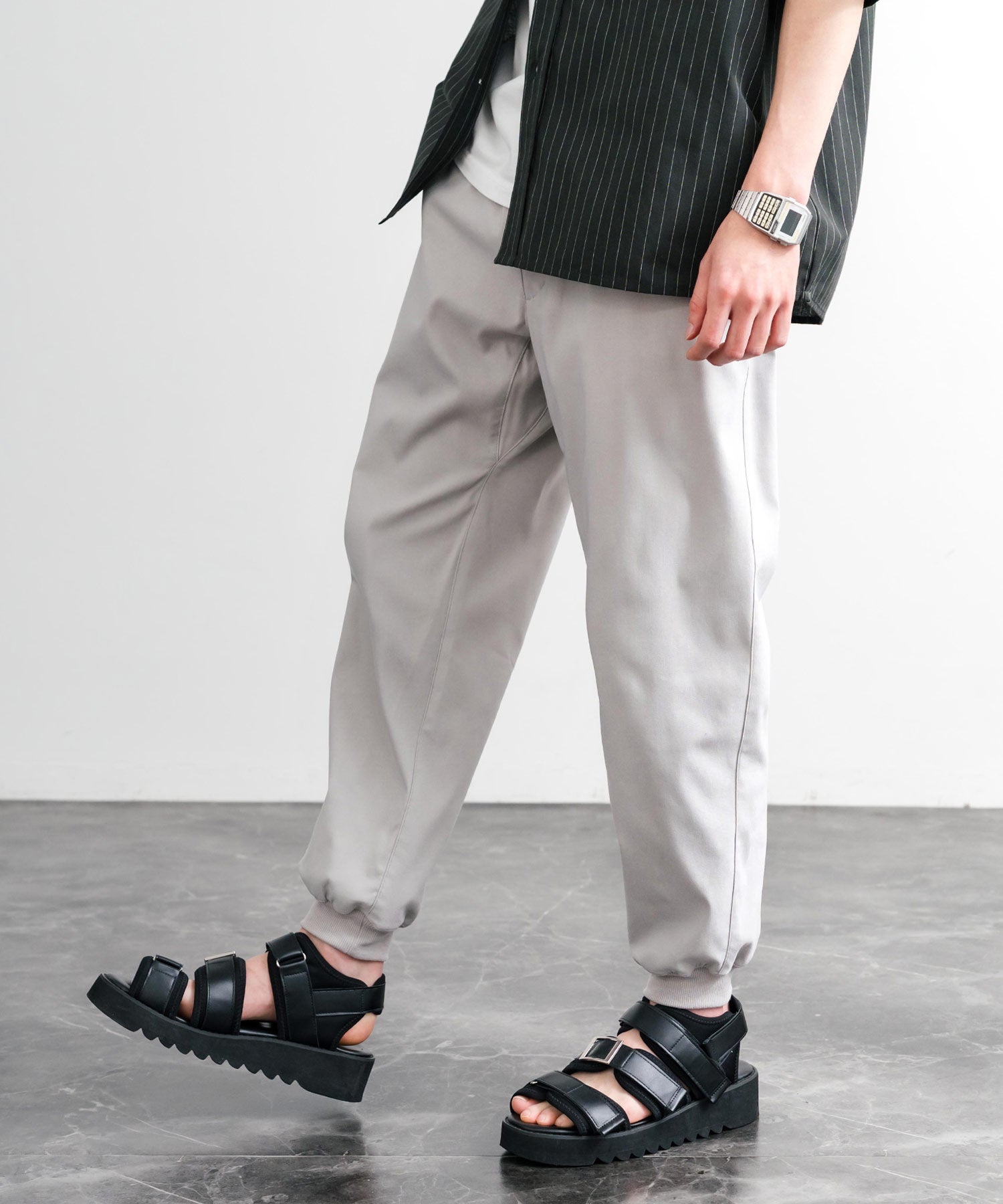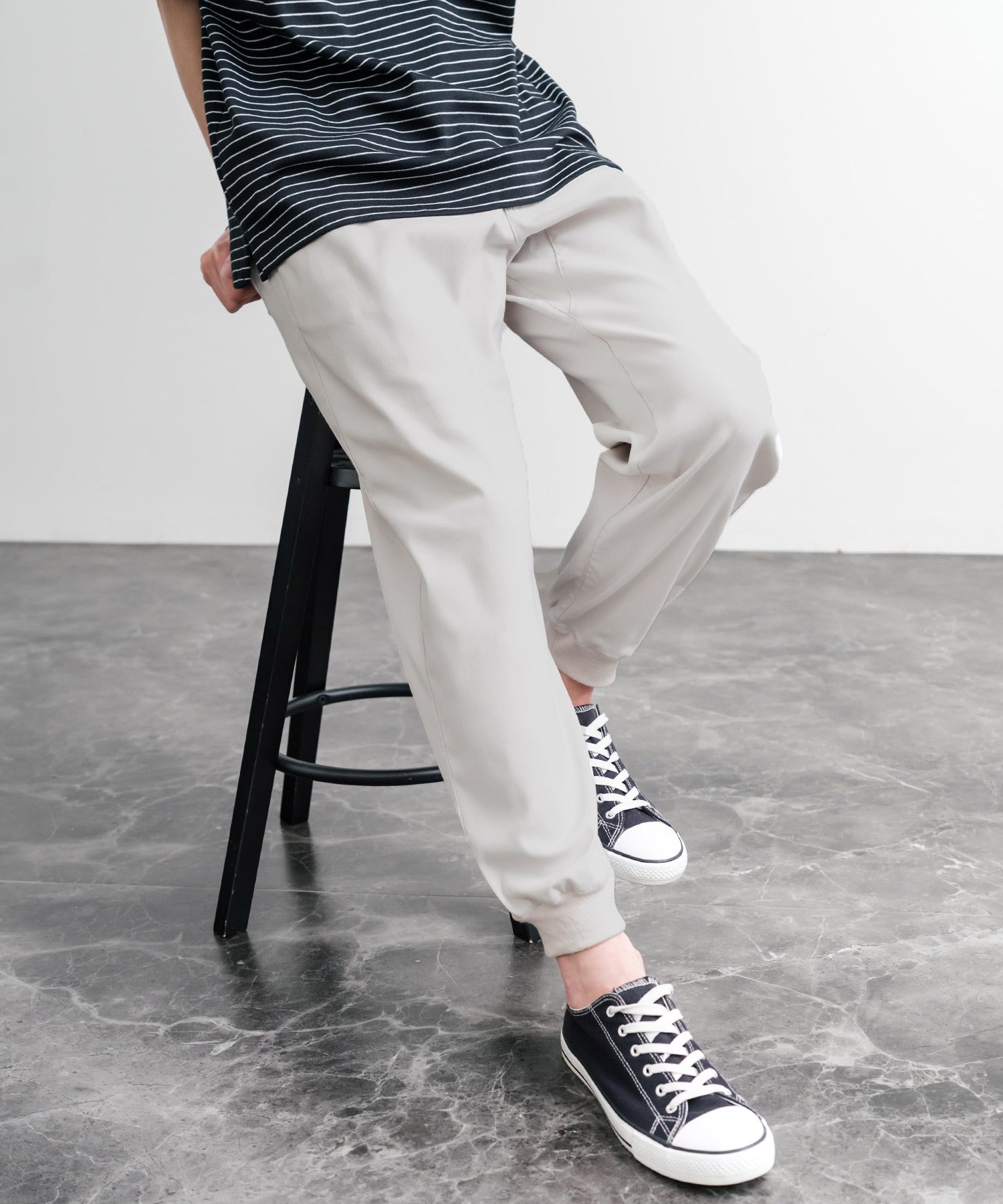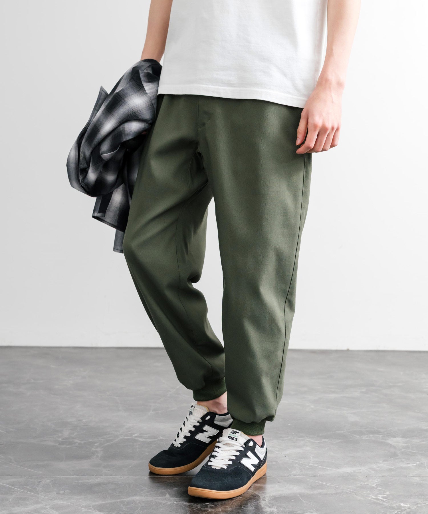 裾に向かってゆるくテーパードし、リブ仕様で仕上げたジョガースタイル。