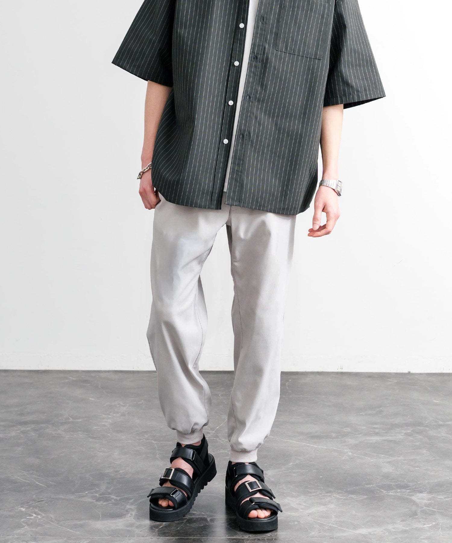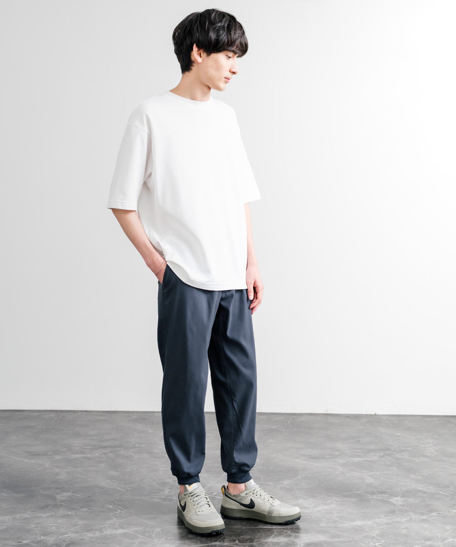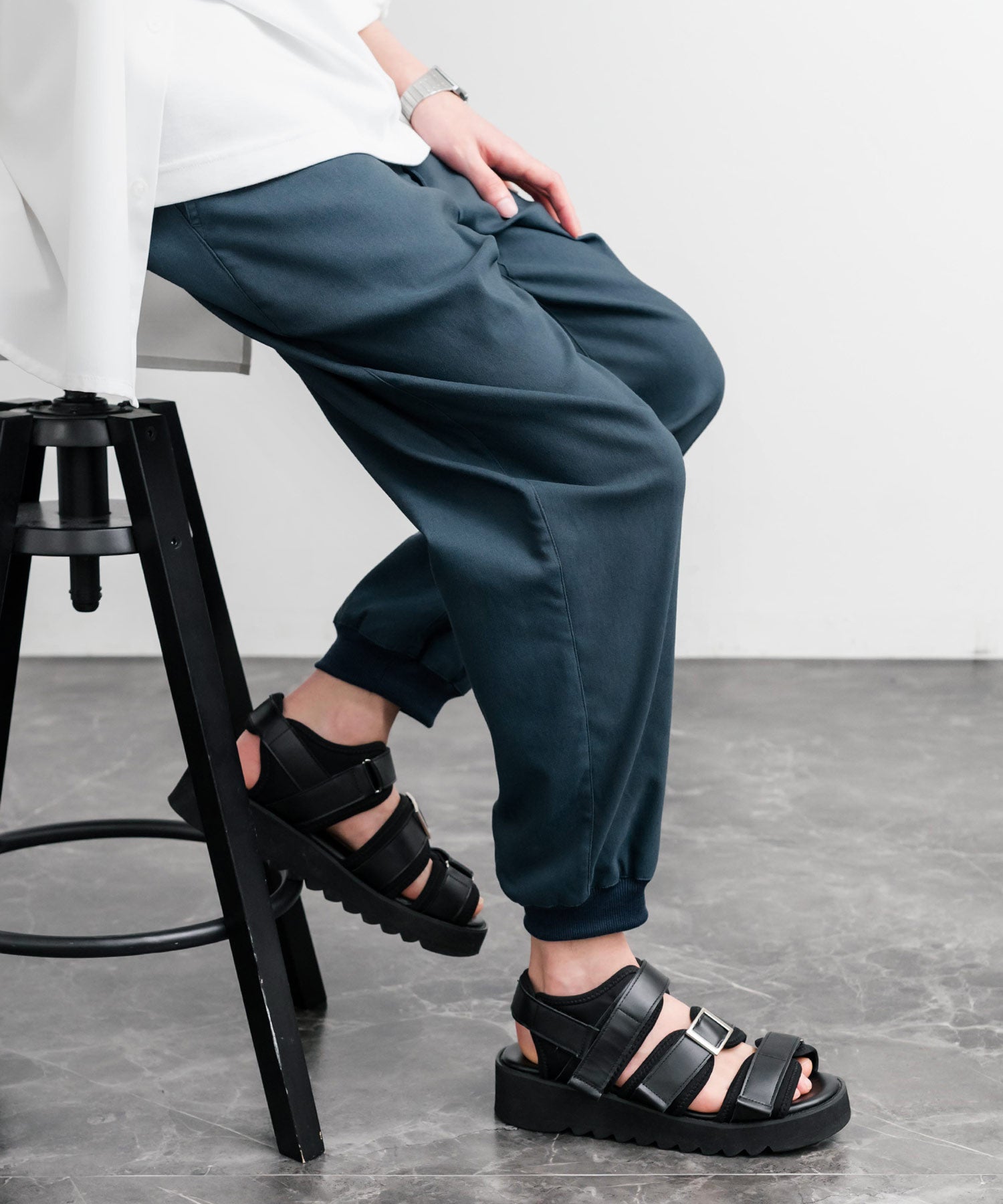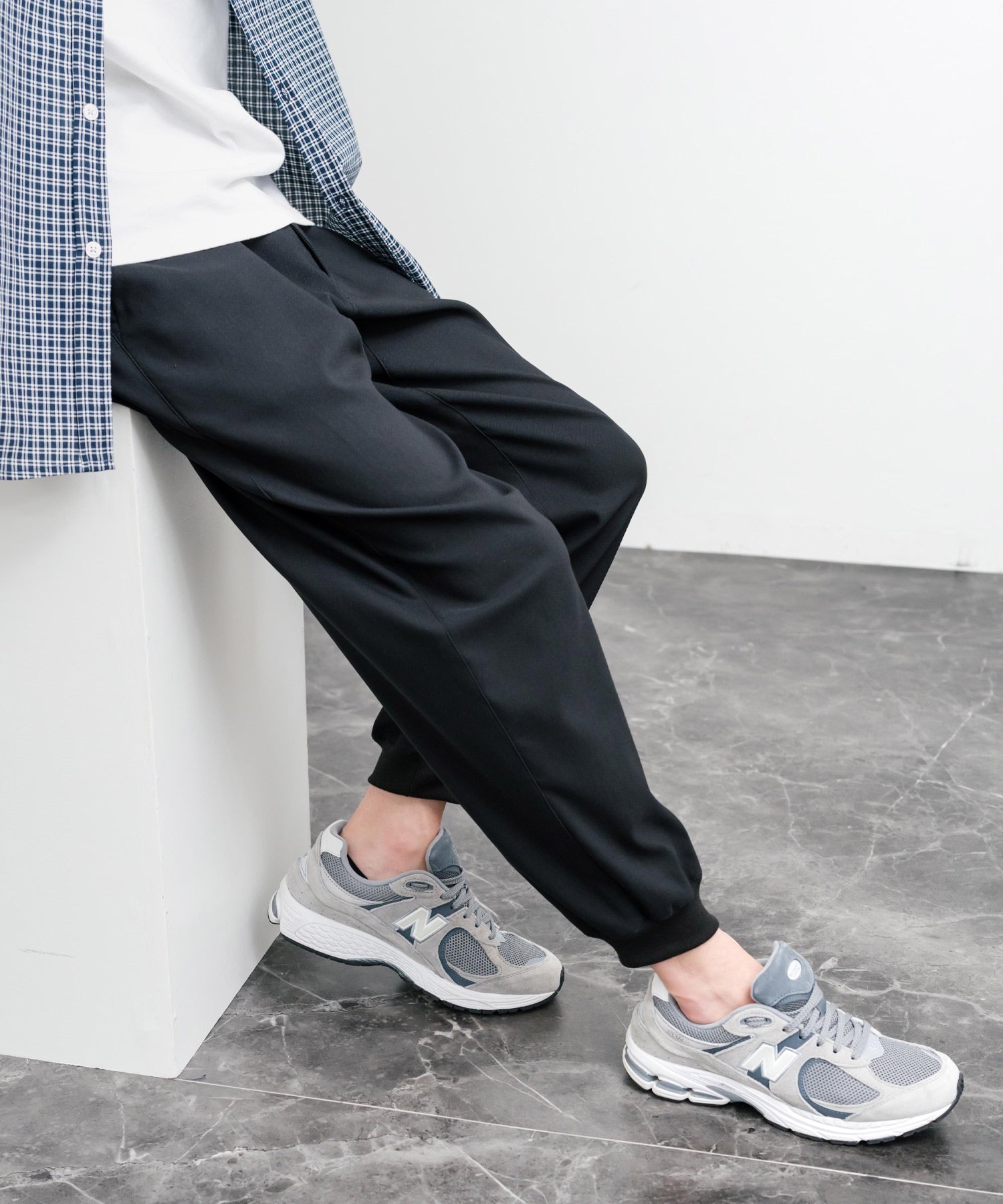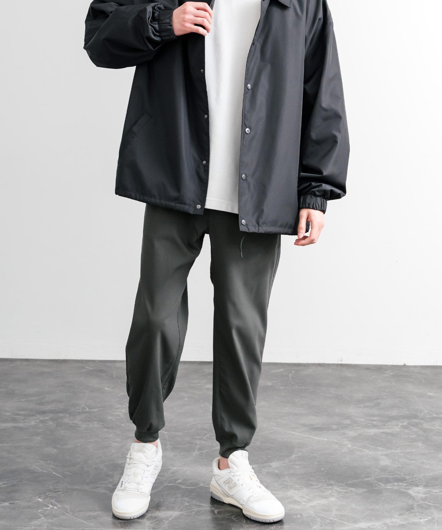裾に向かってゆるくテーパードし、リブ仕様で仕上げたジョガースタイル。