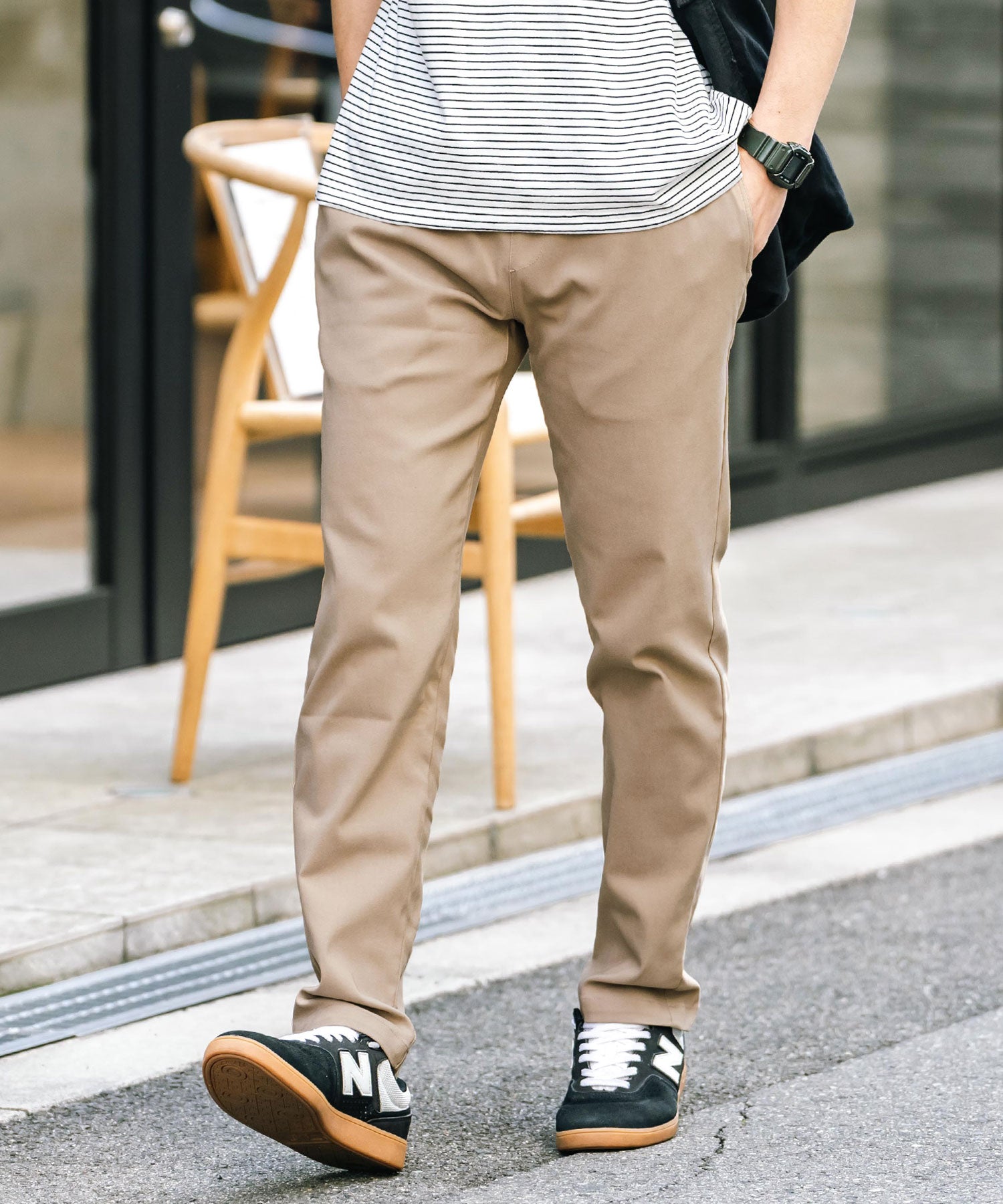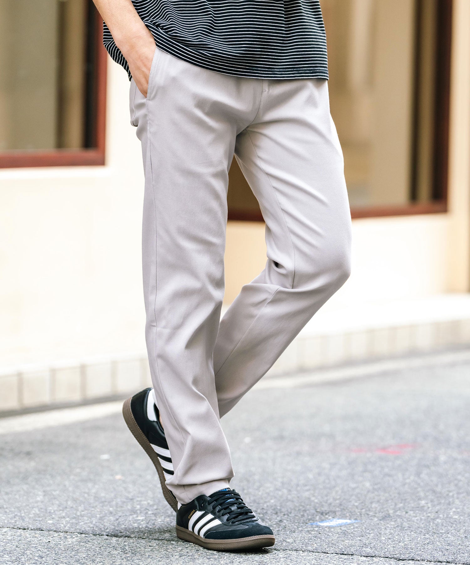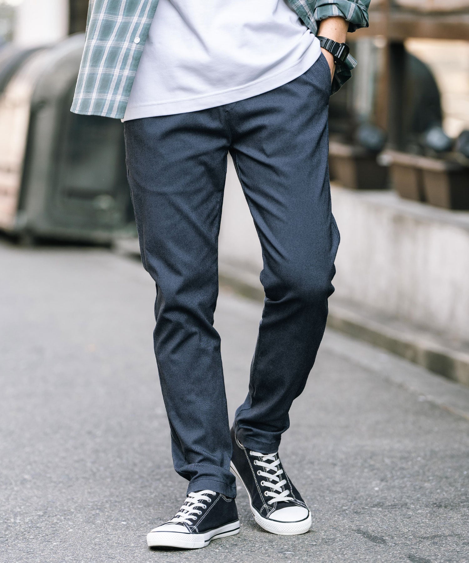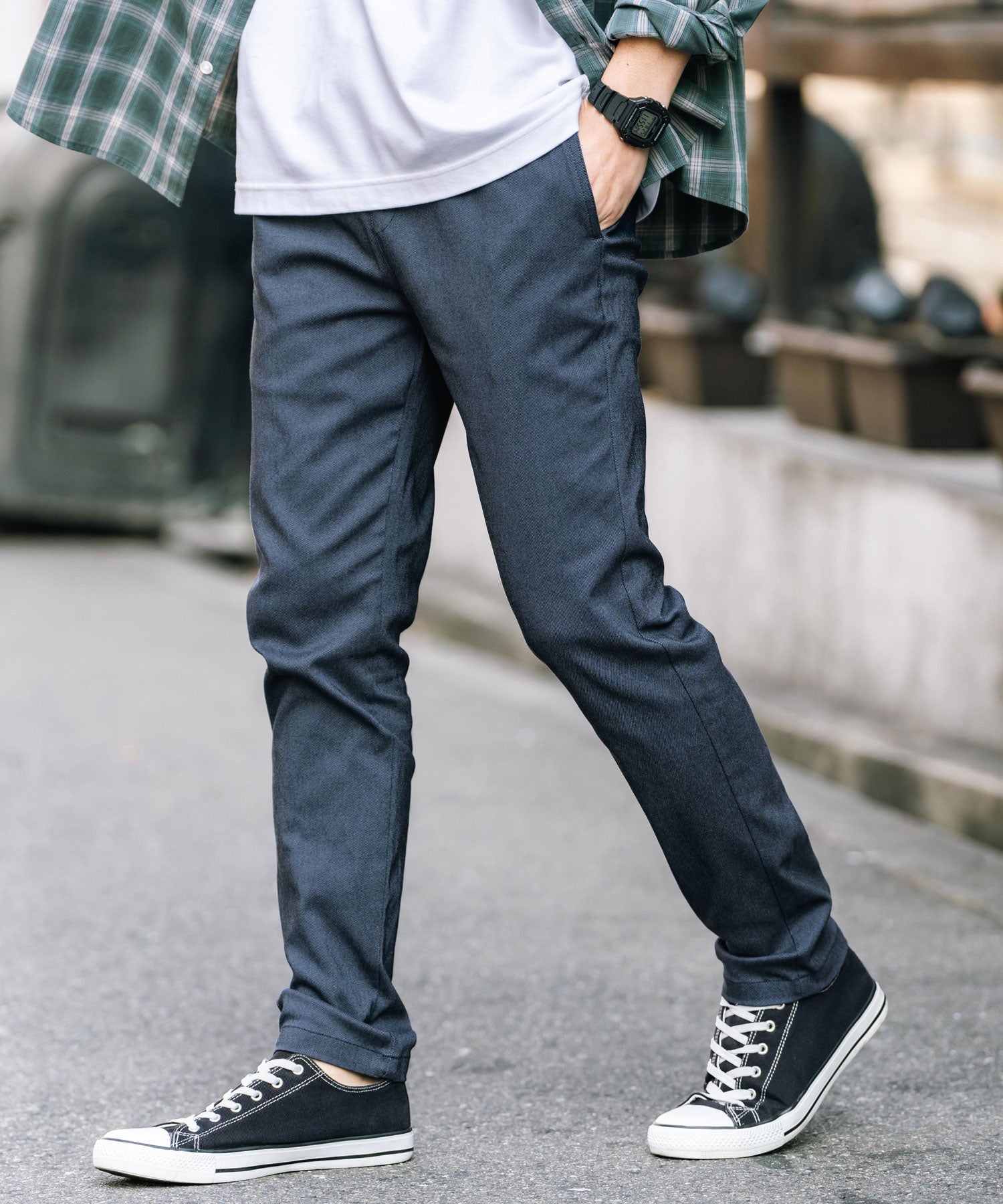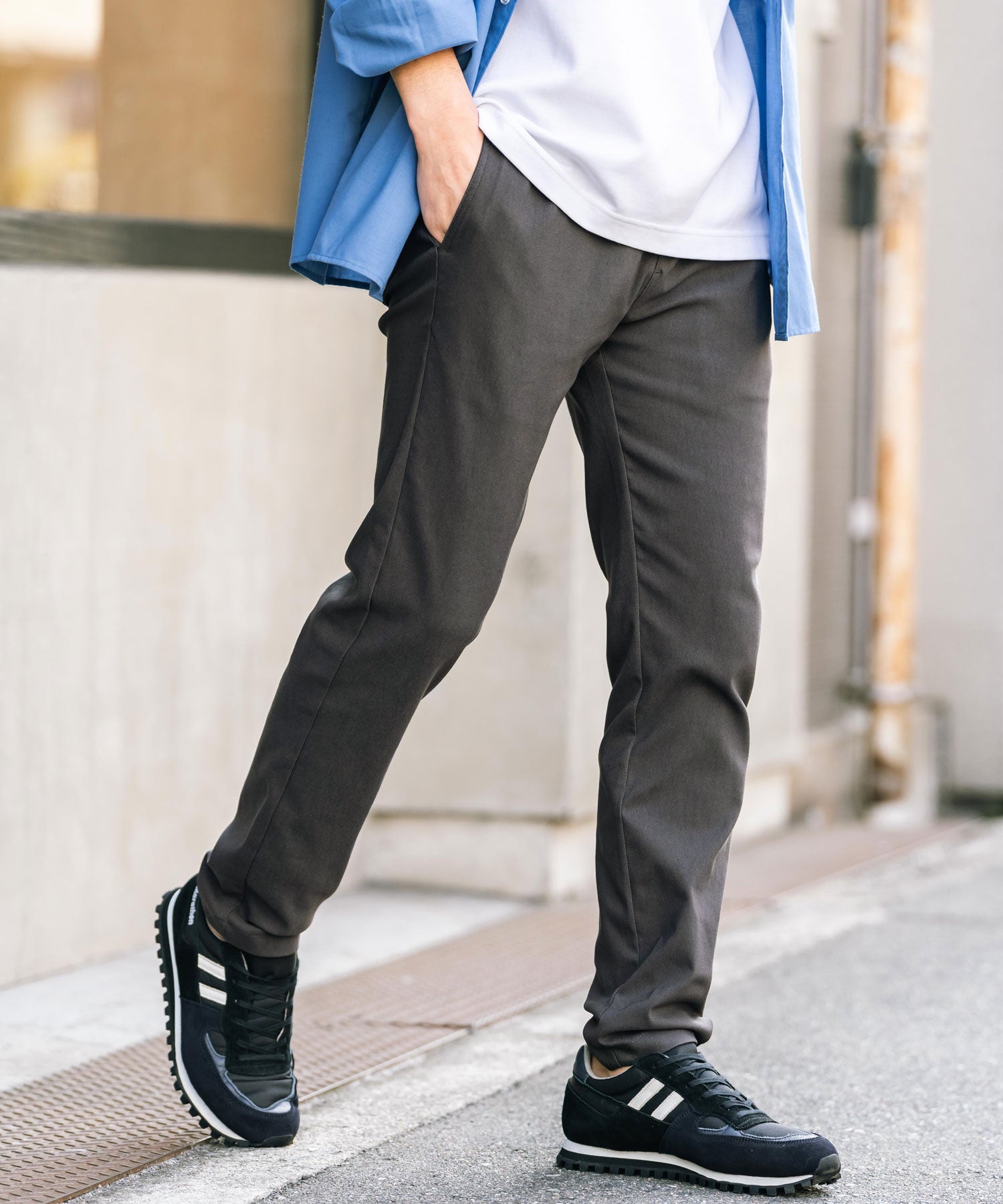 細すぎず、適度にゆとりのあるサイズ感でスッキリとした着こなしに。