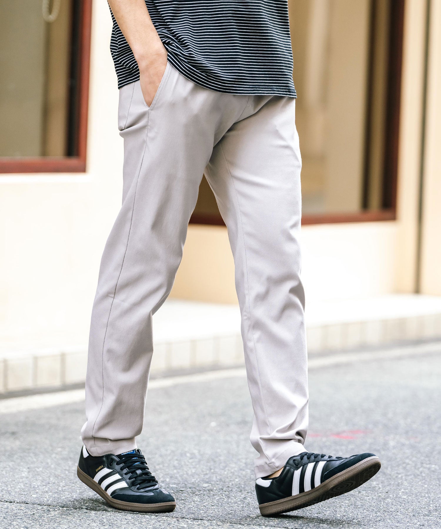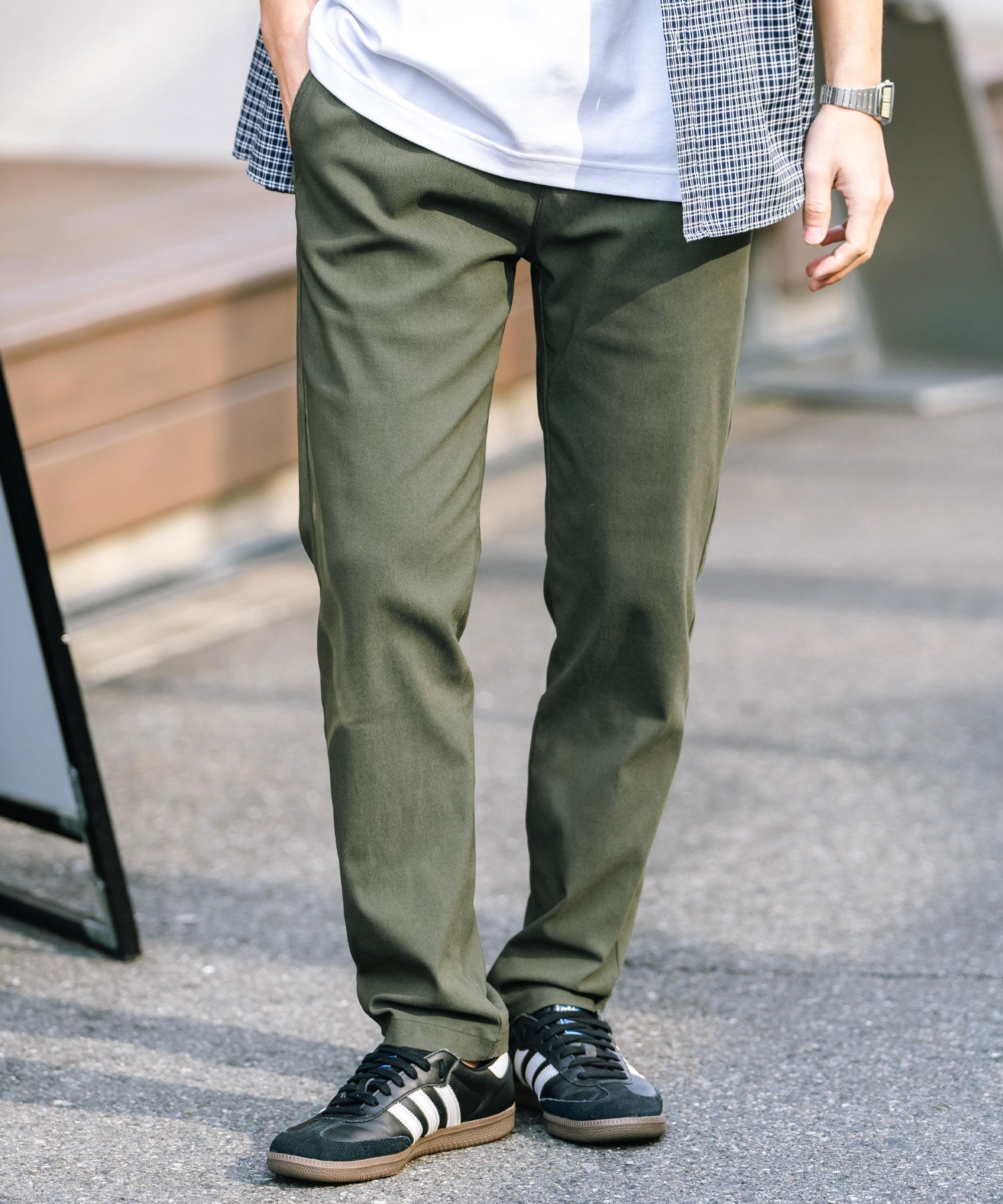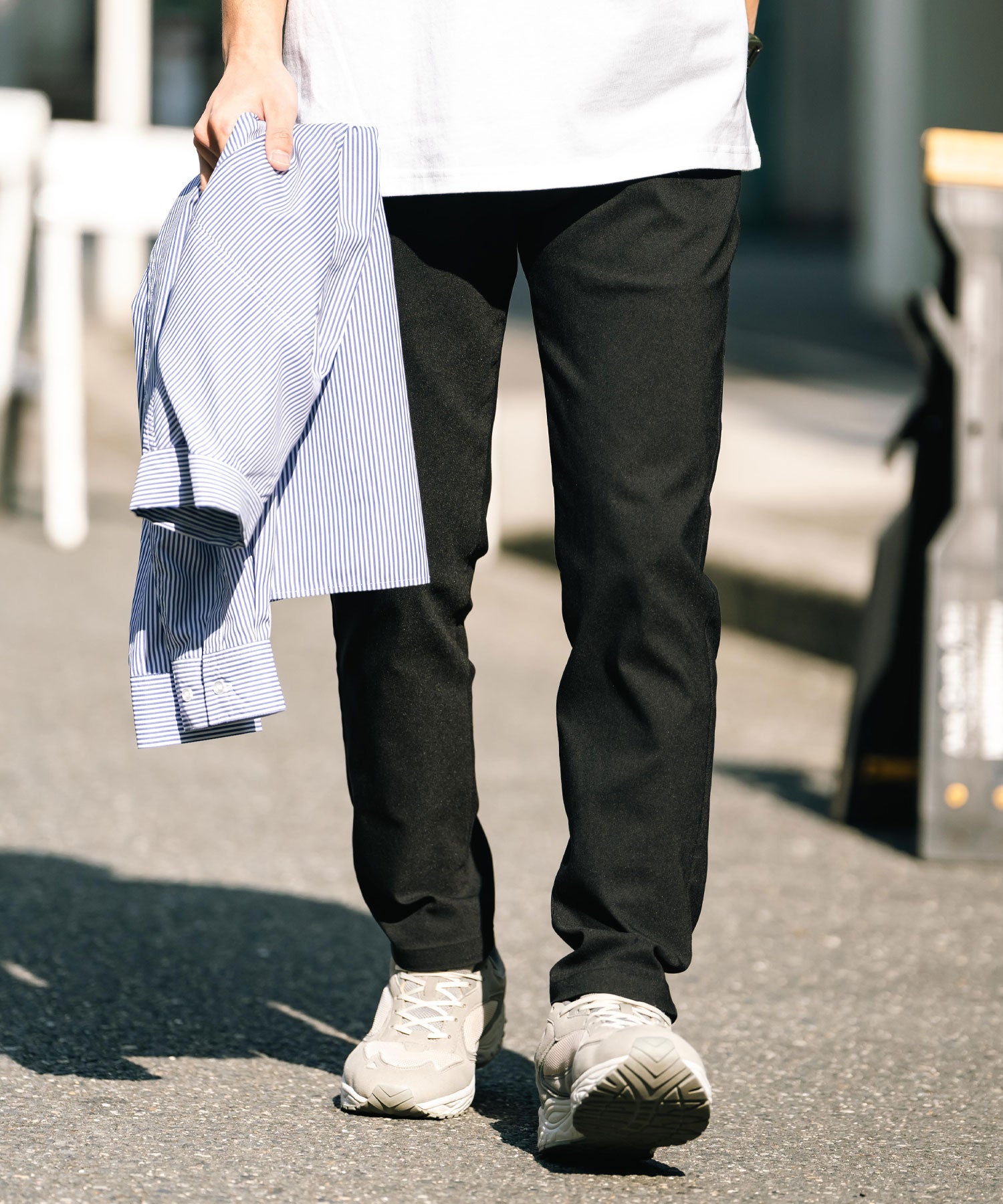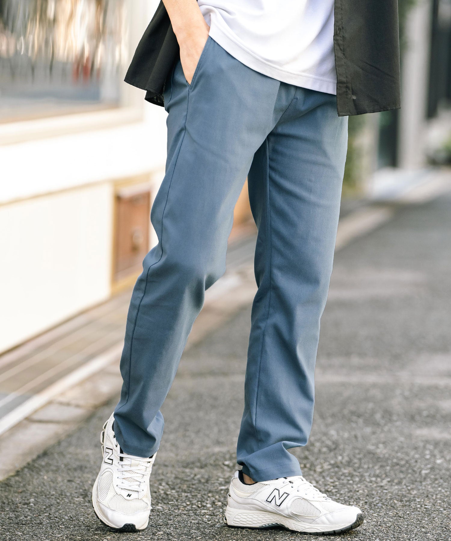 細すぎず、適度にゆとりのあるサイズ感でスッキリとした着こなしに。