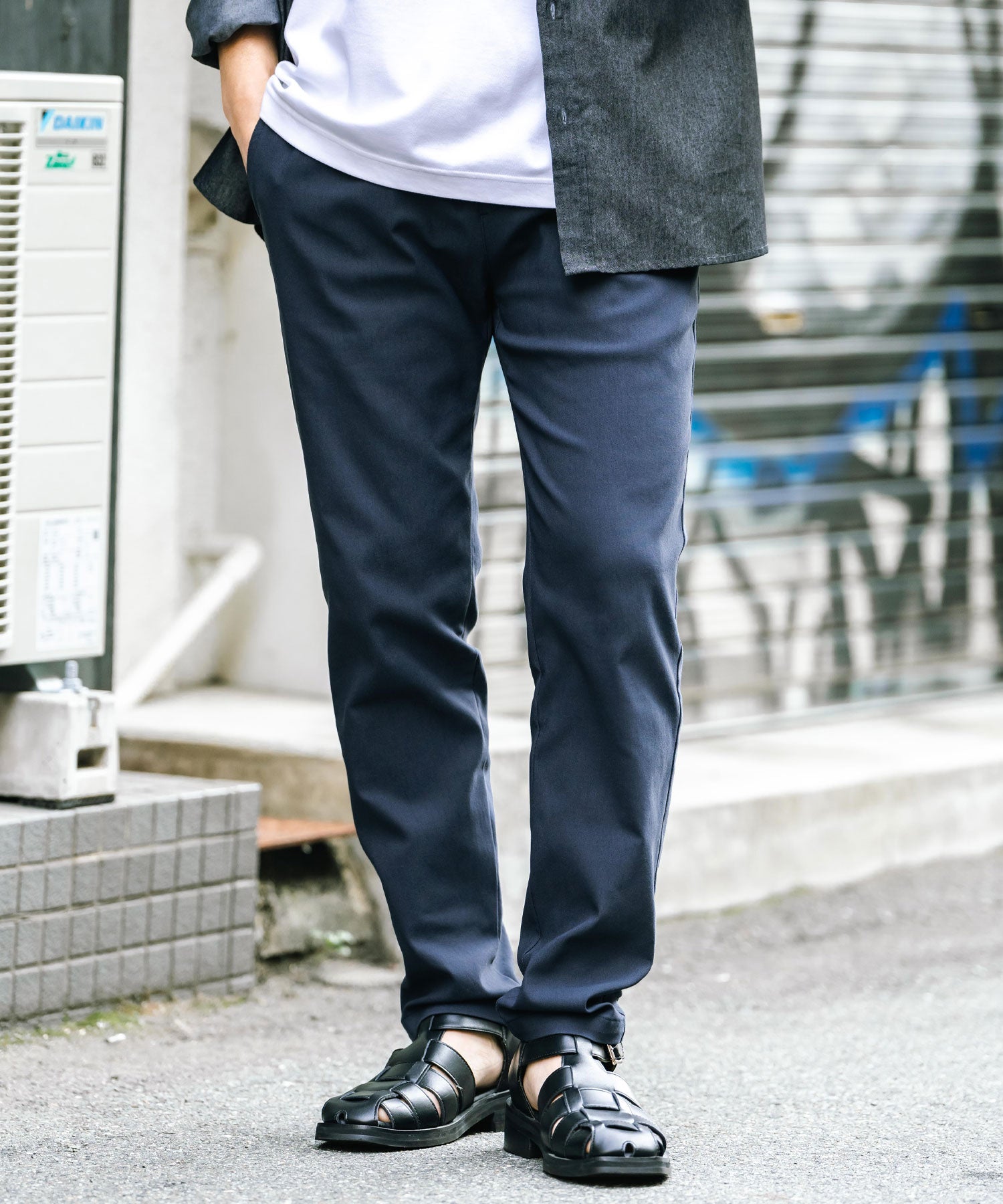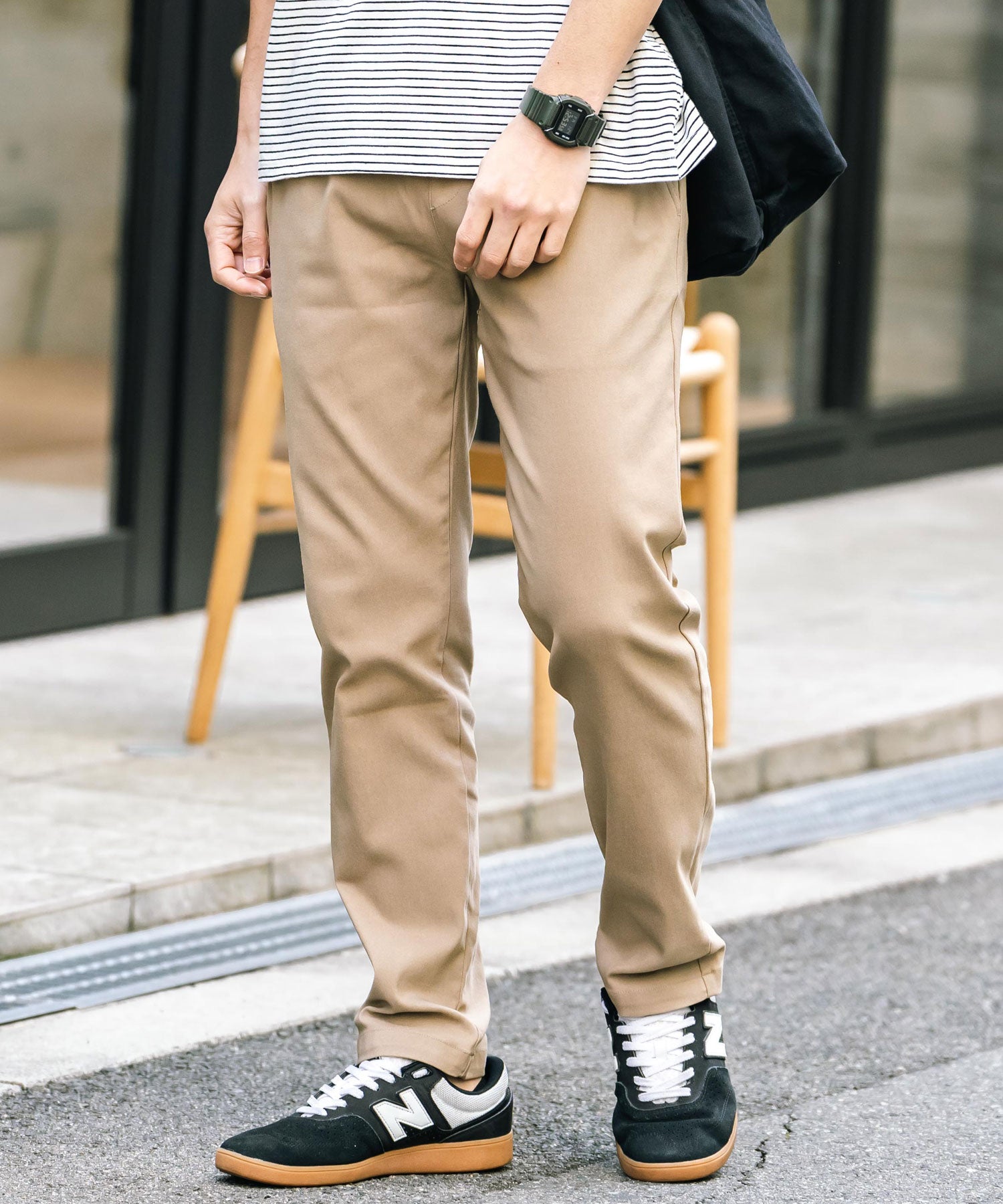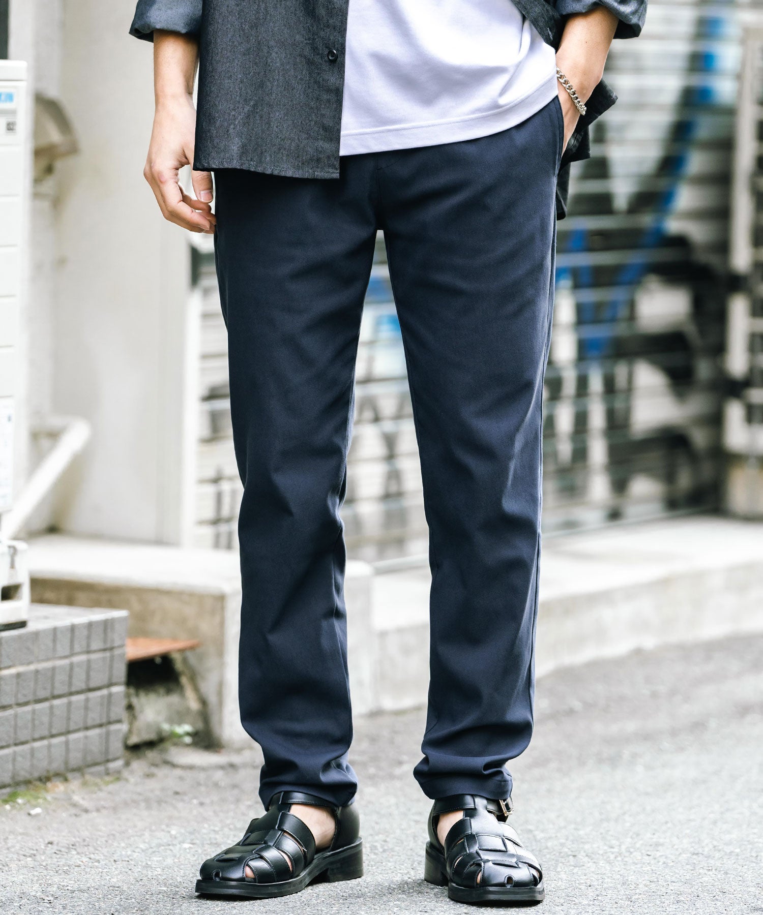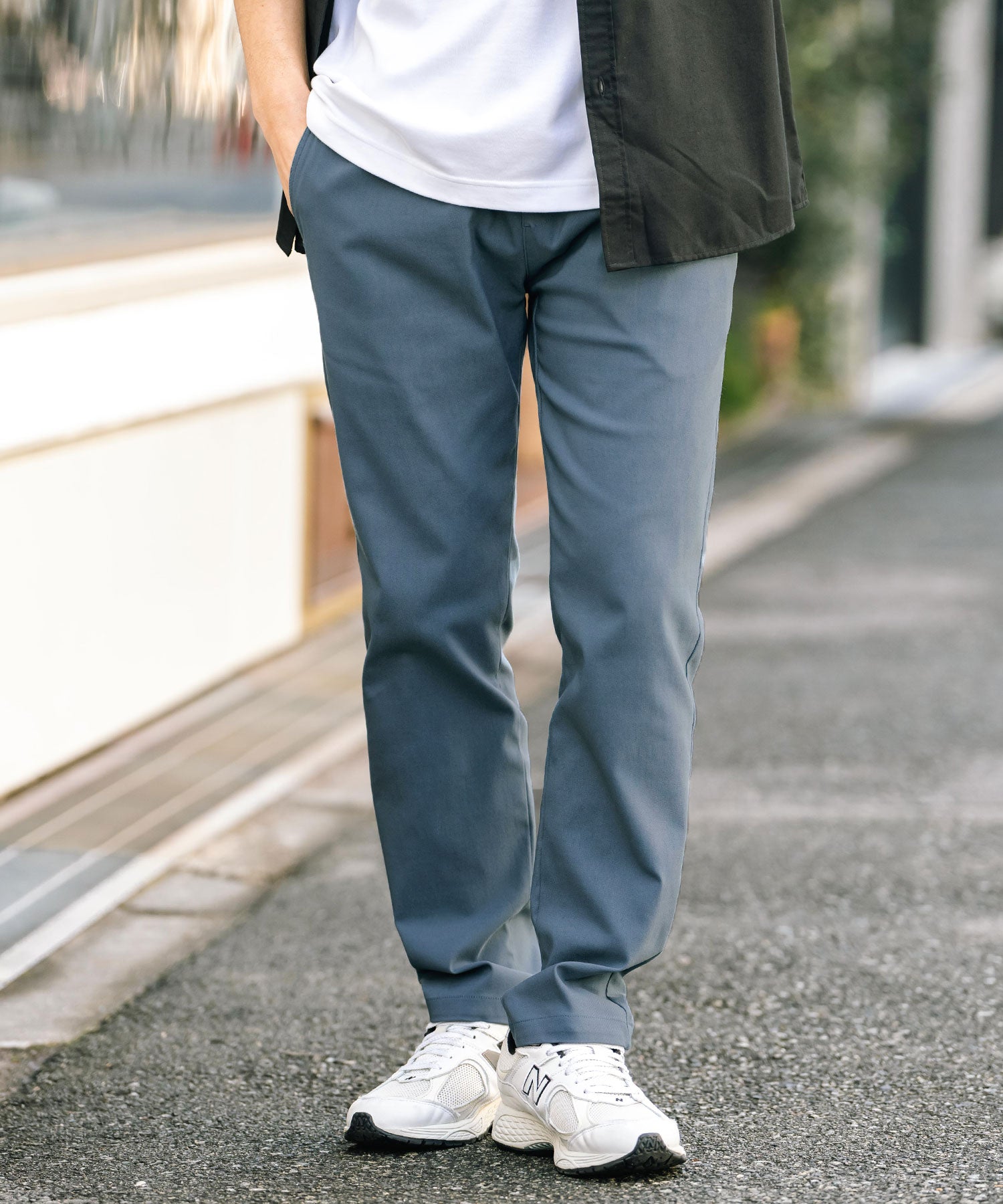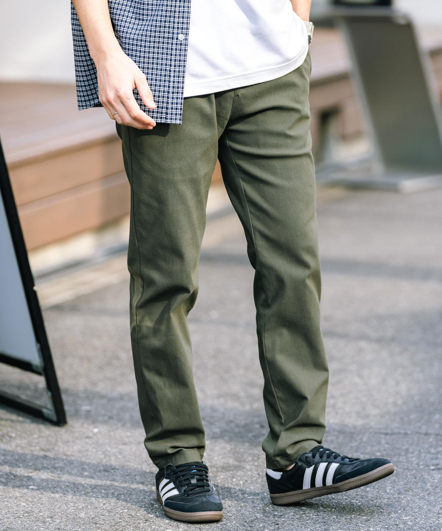 細すぎず、適度にゆとりのあるサイズ感でスッキリとした着こなしに。