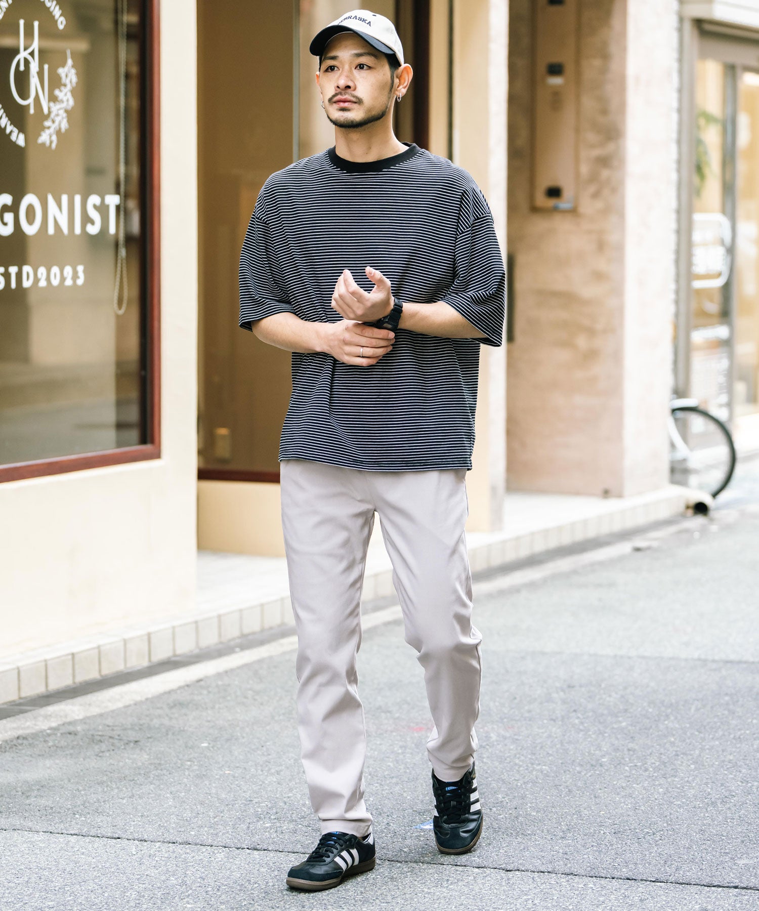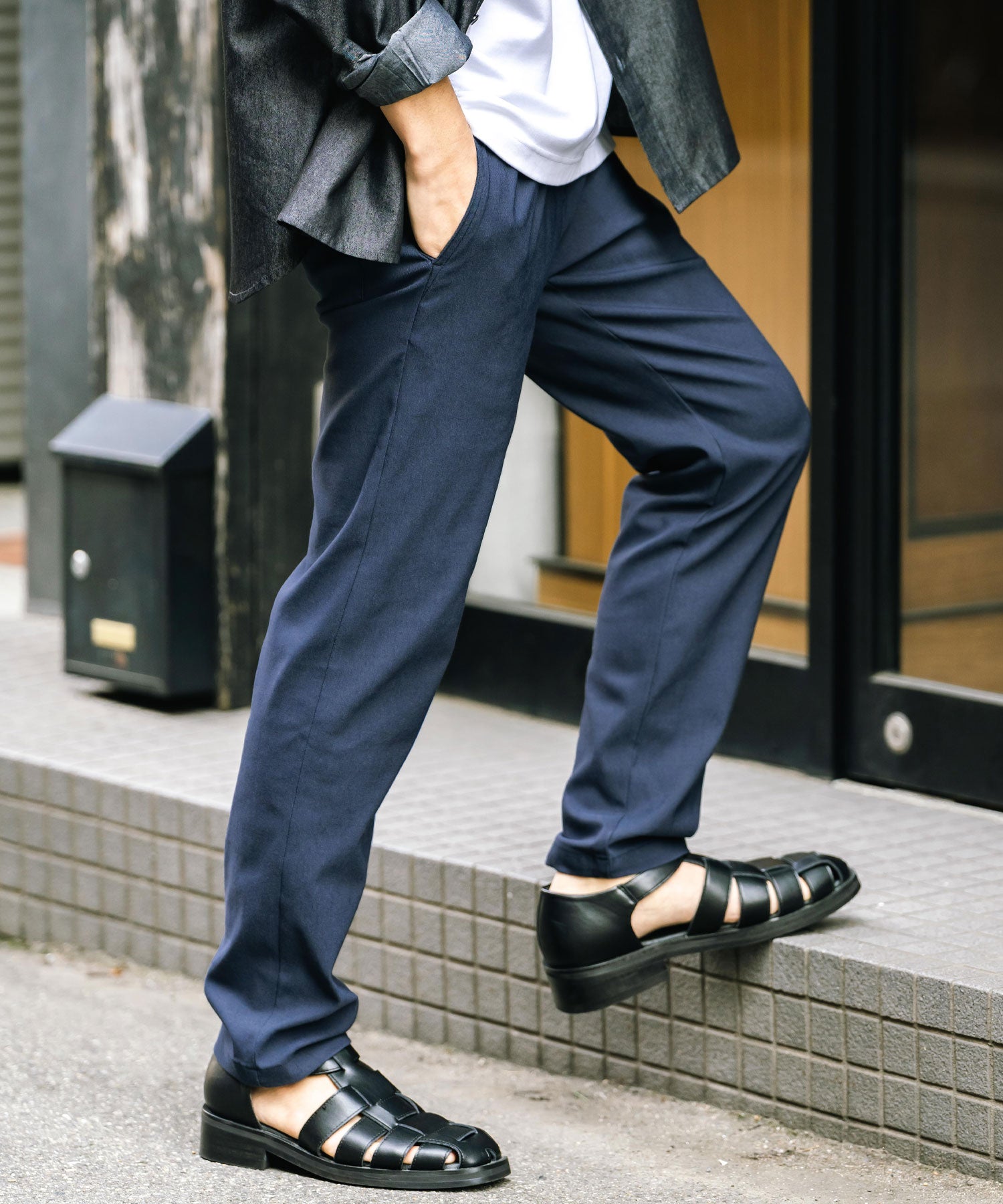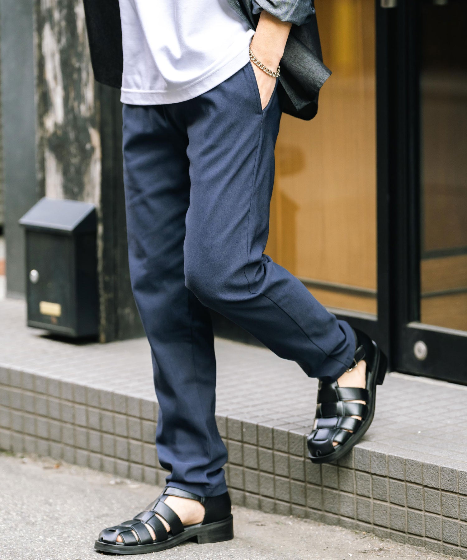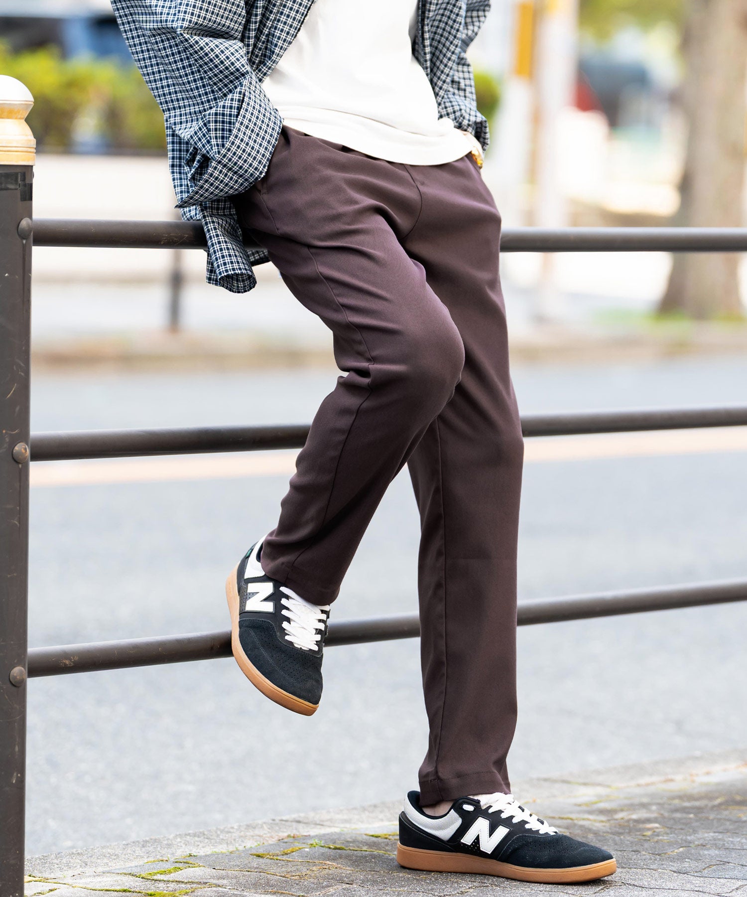 細すぎず、適度にゆとりのあるサイズ感でスッキリとした着こなしに。