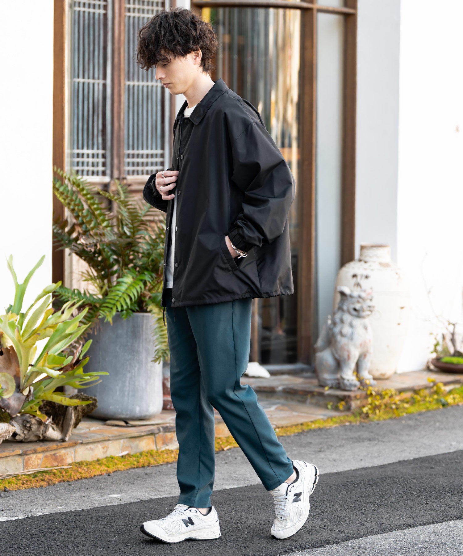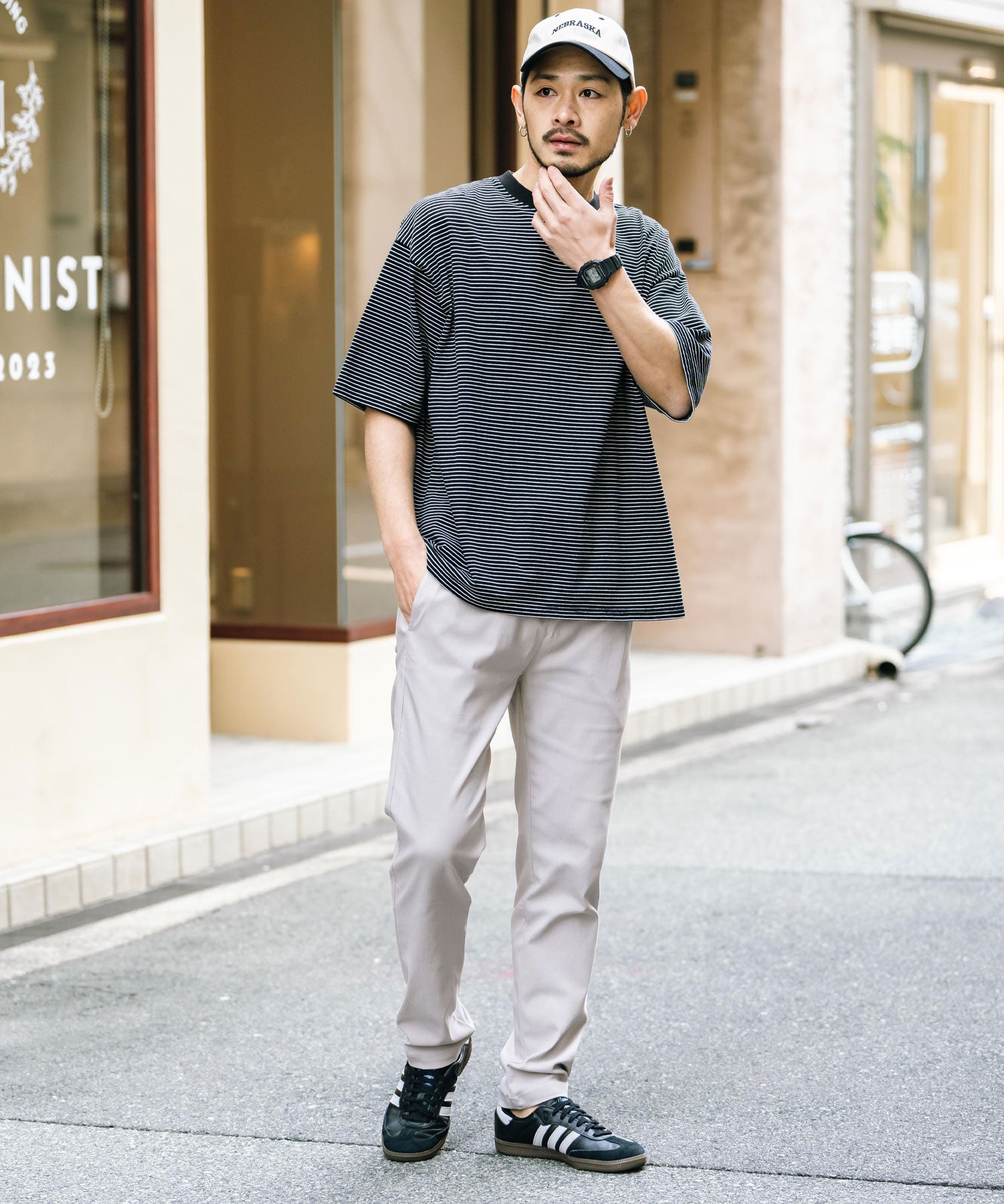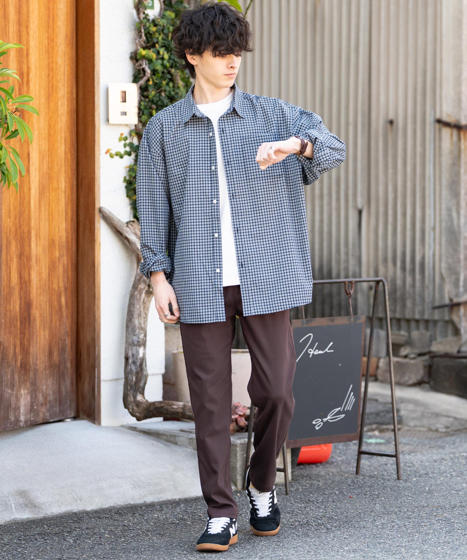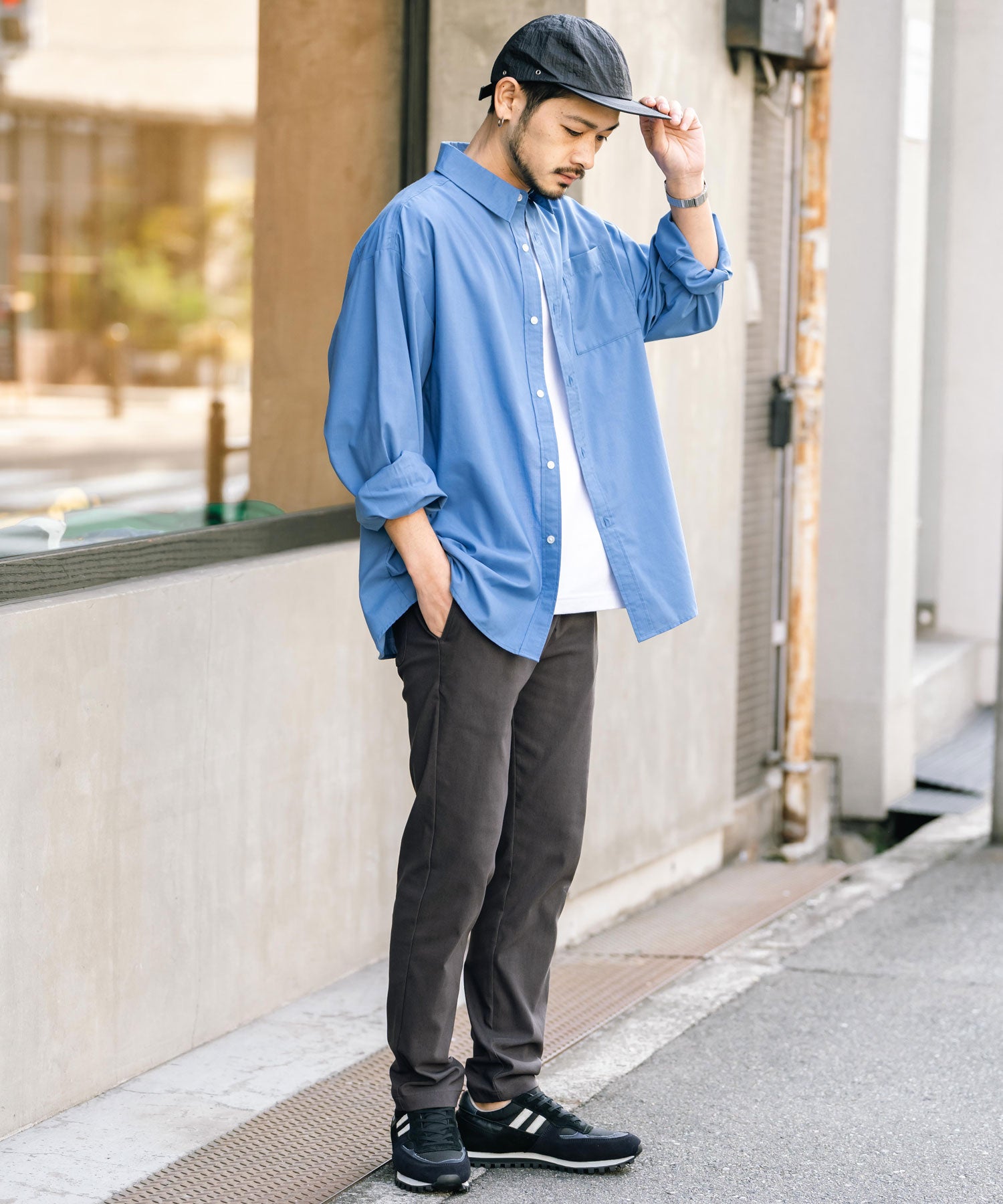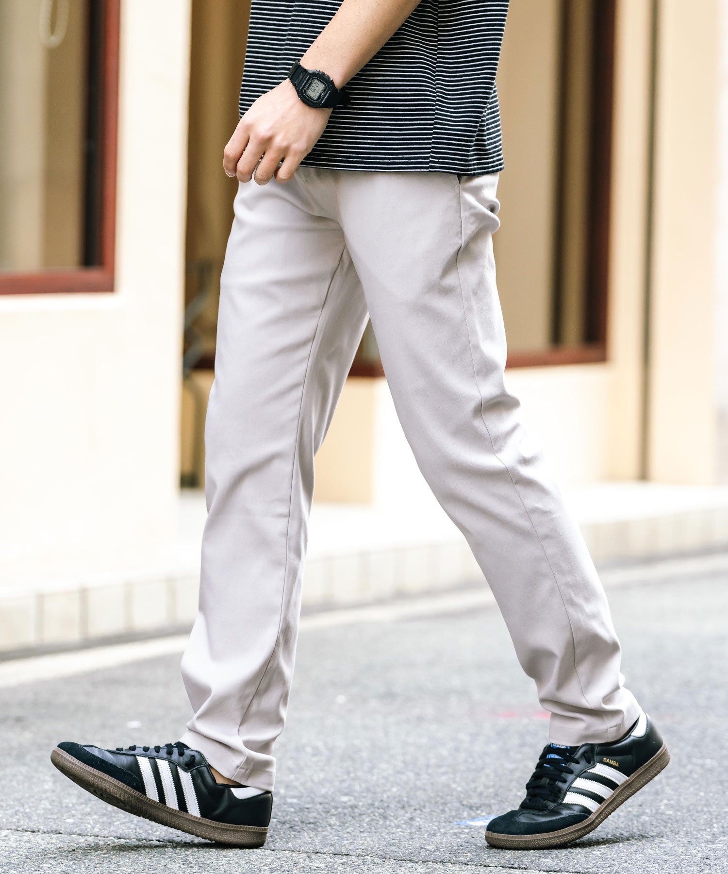 細すぎず、適度にゆとりのあるサイズ感でスッキリとした着こなしに。