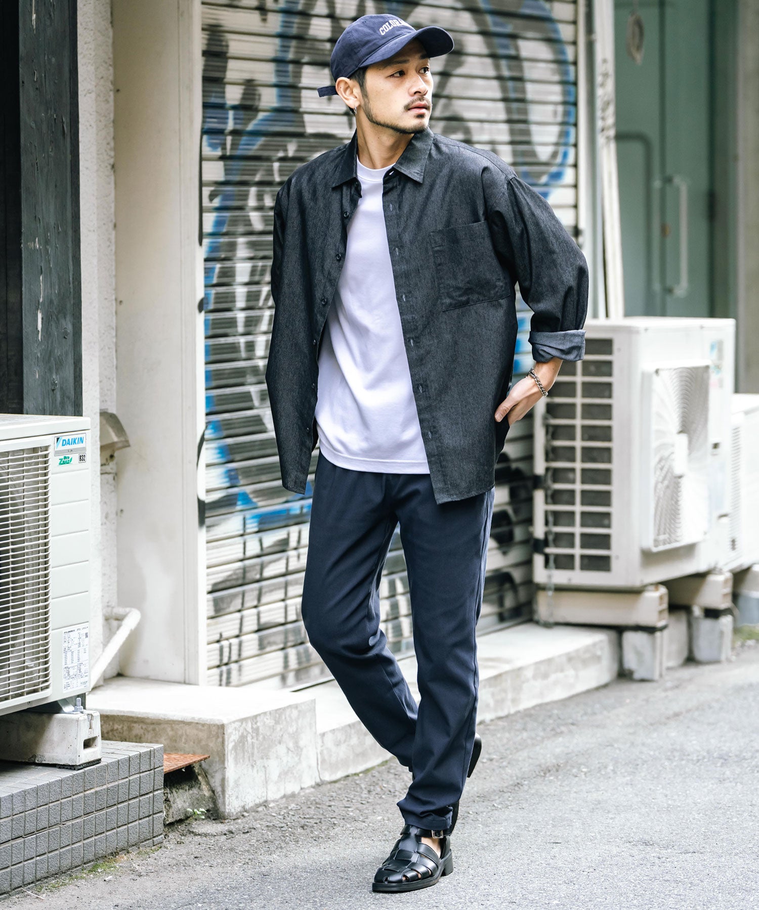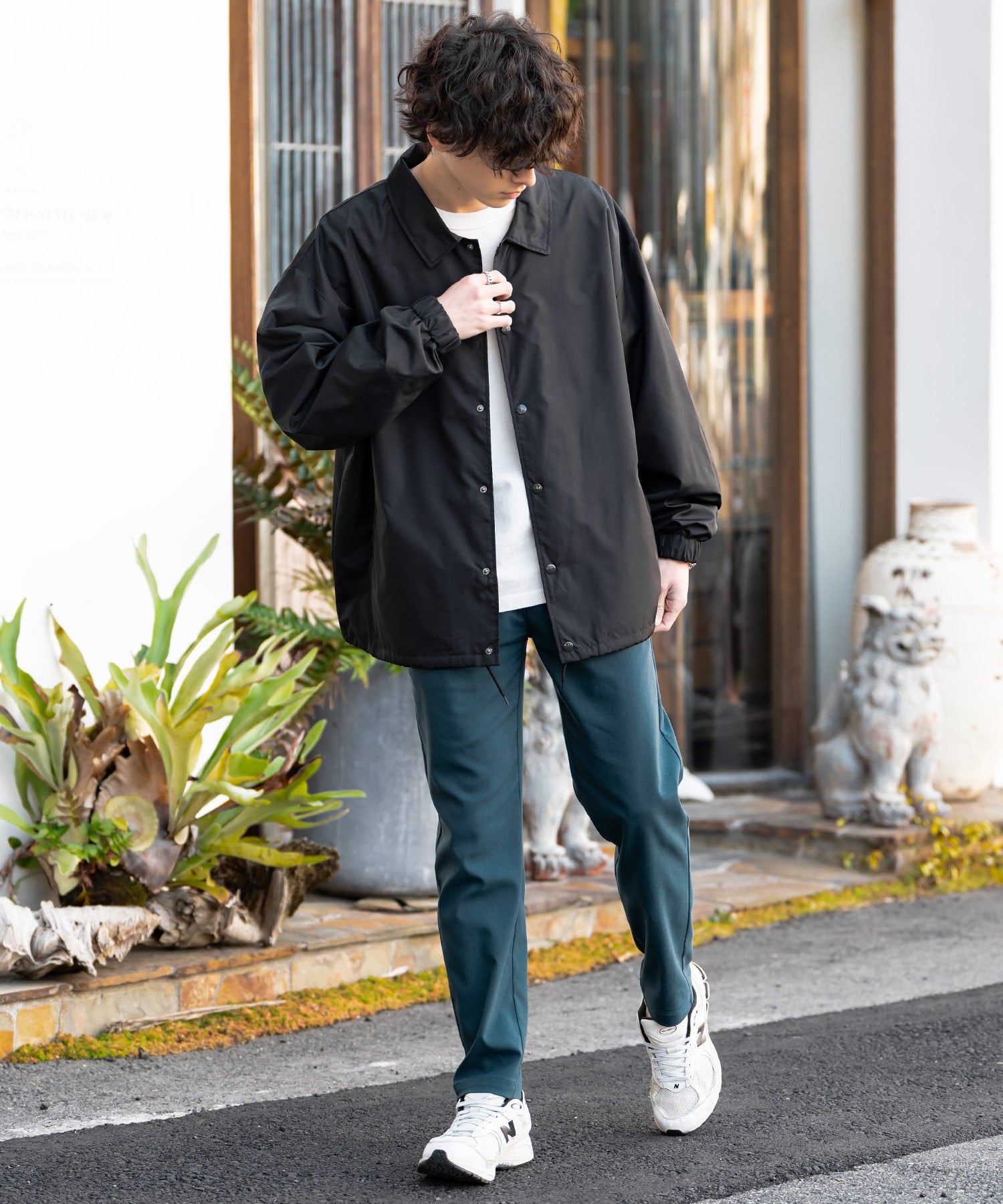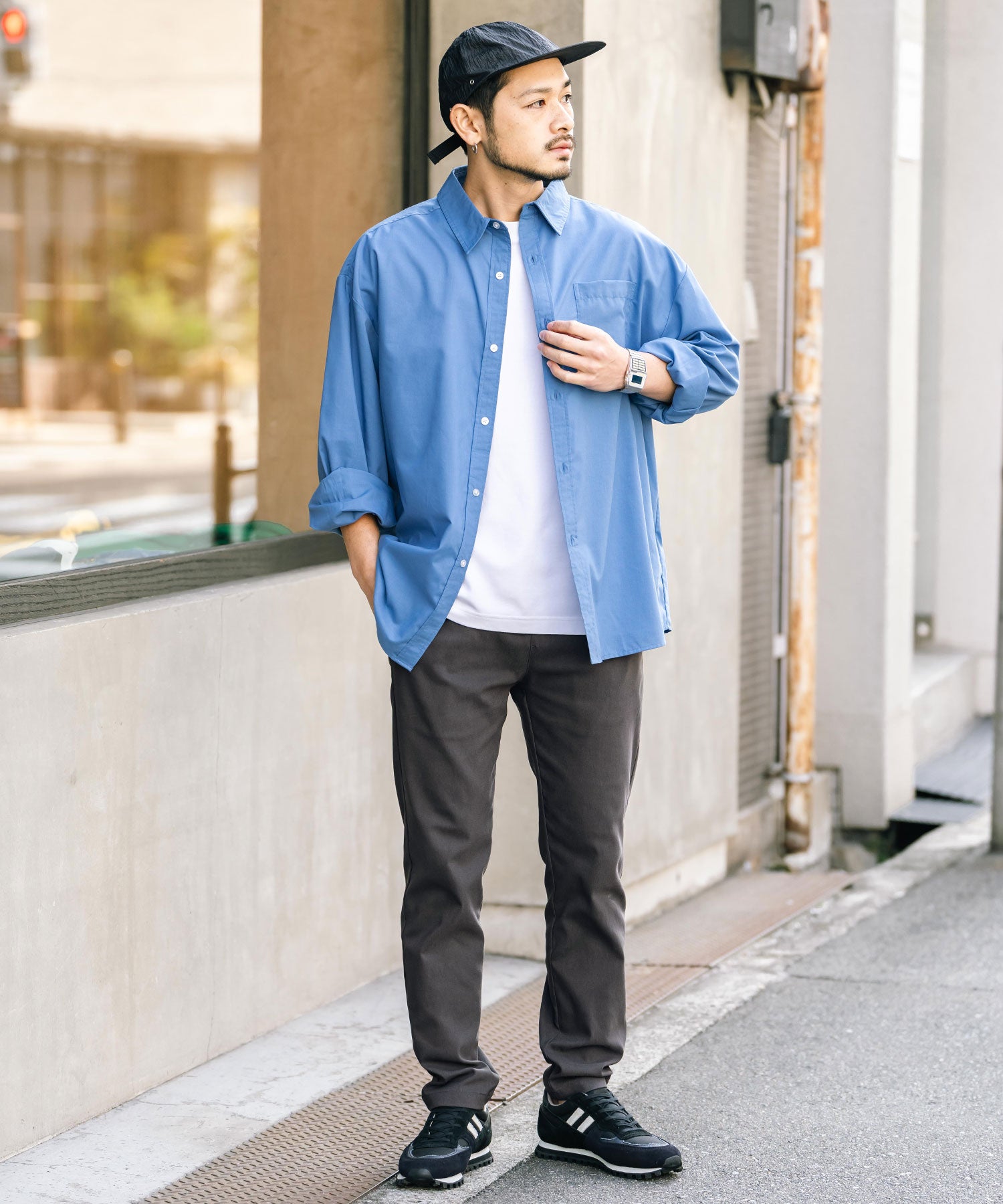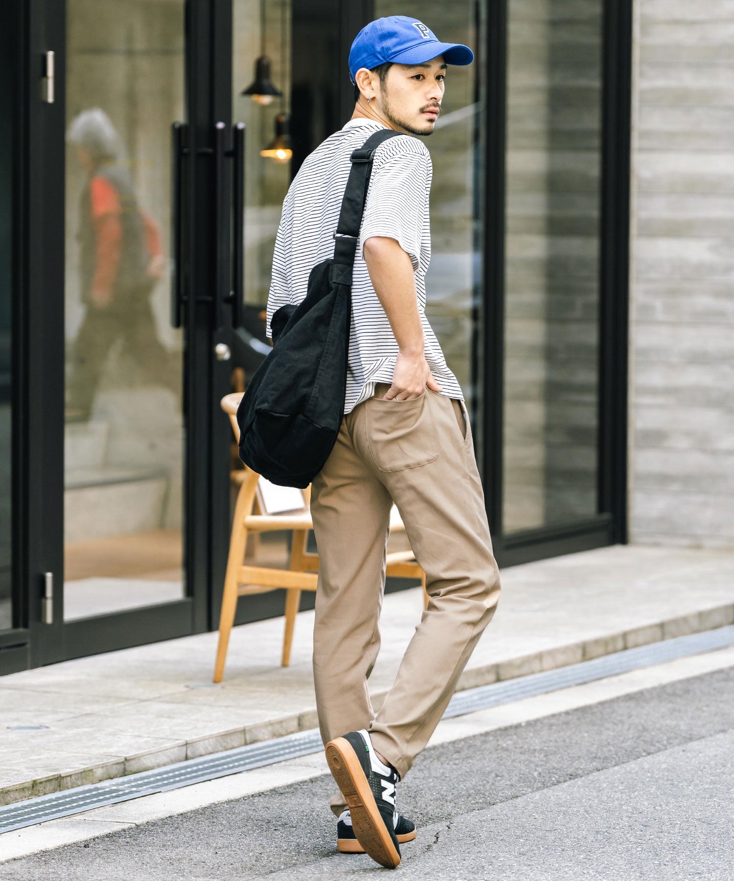 細すぎず、適度にゆとりのあるサイズ感でスッキリとした着こなしに。