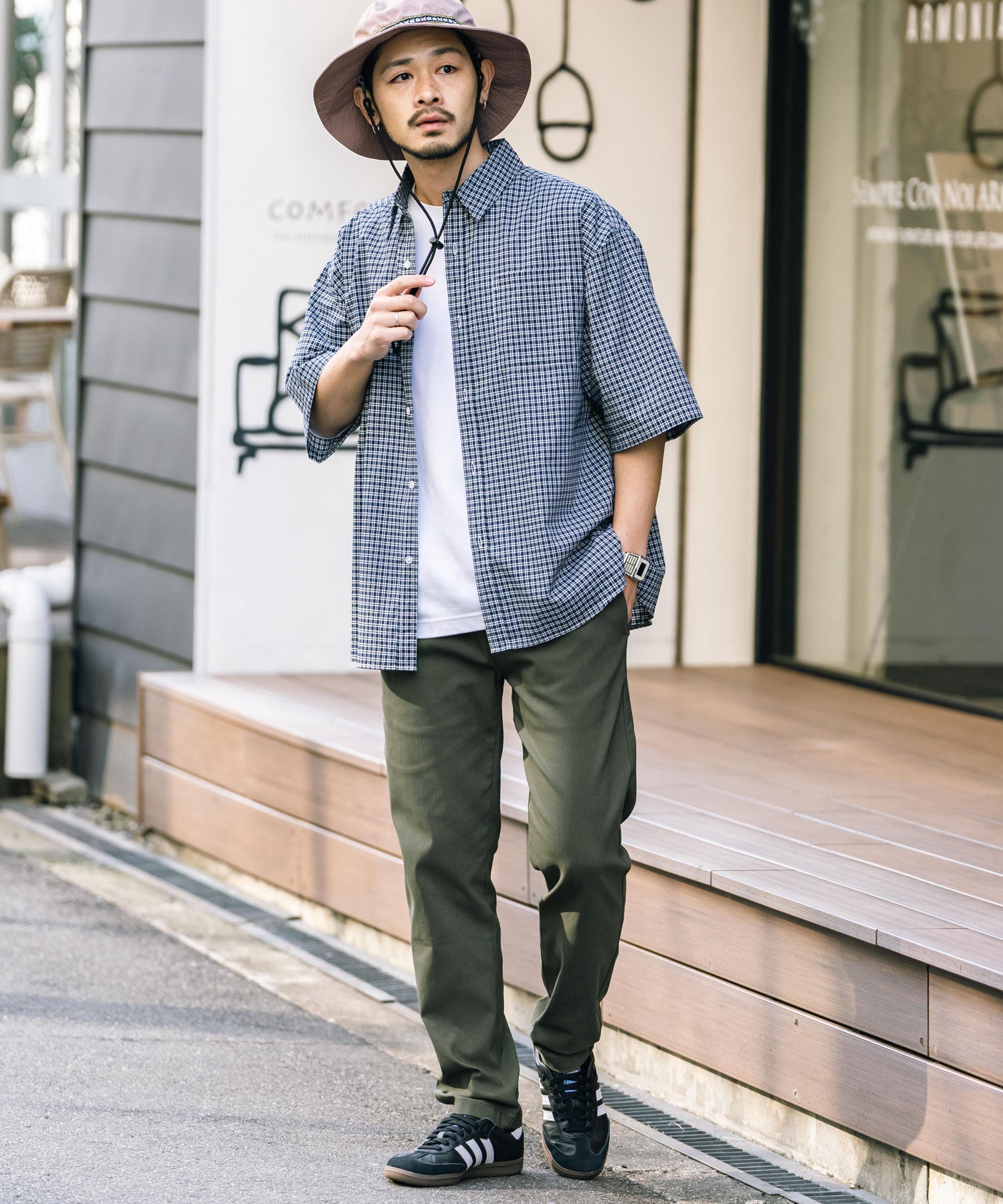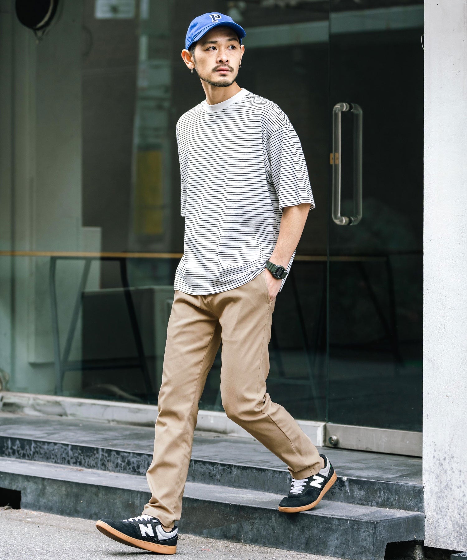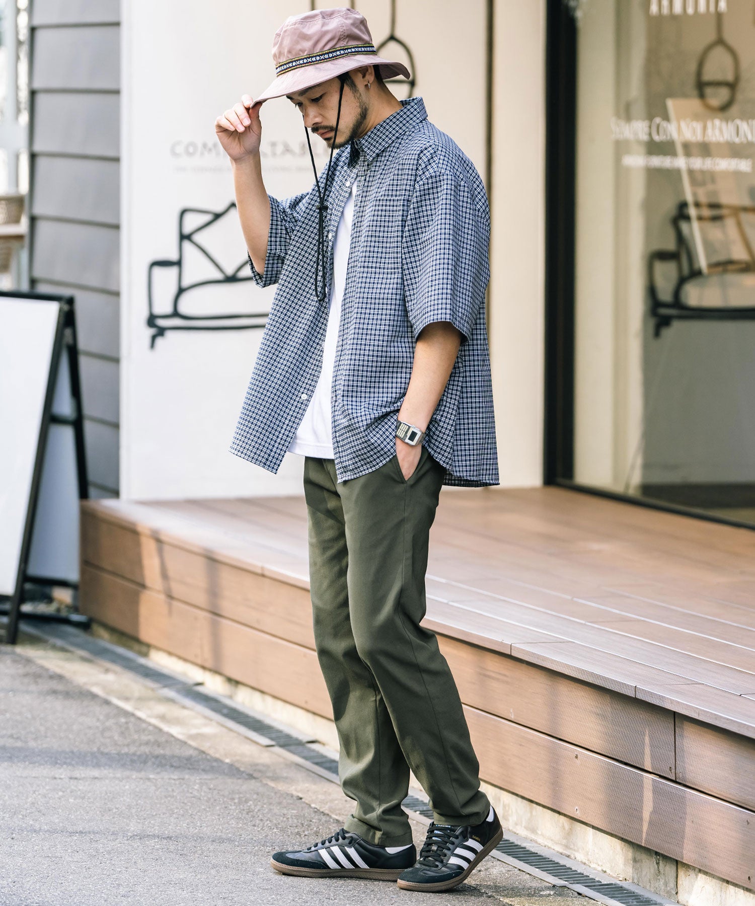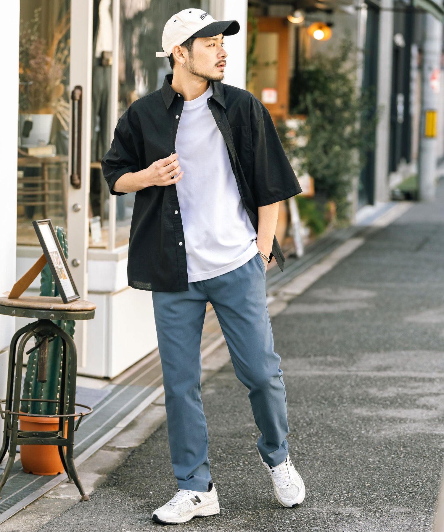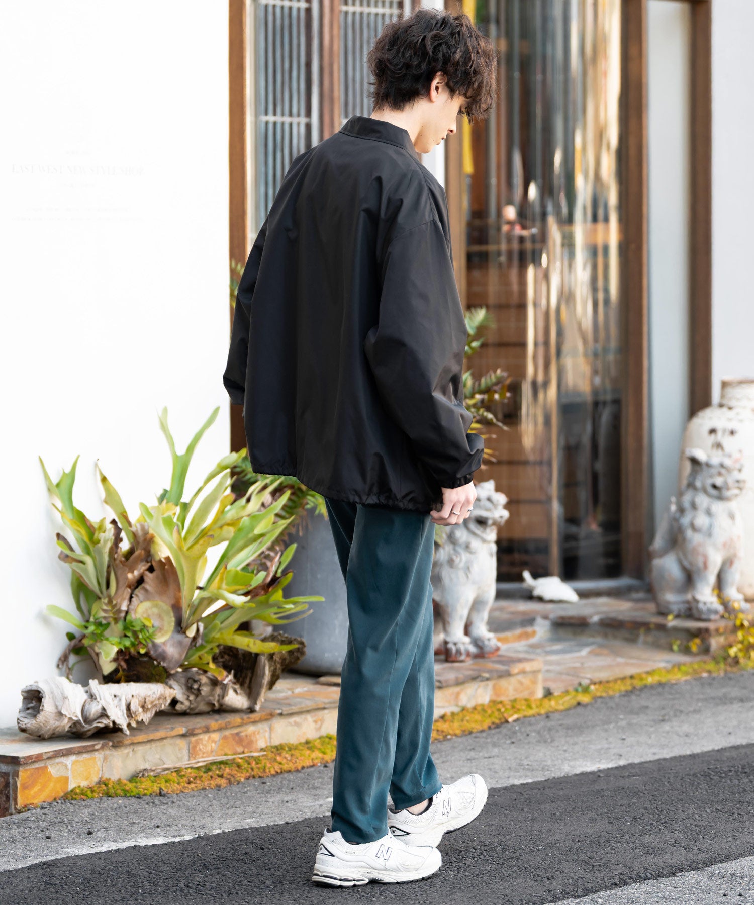細すぎず、適度にゆとりのあるサイズ感でスッキリとした着こなしに。