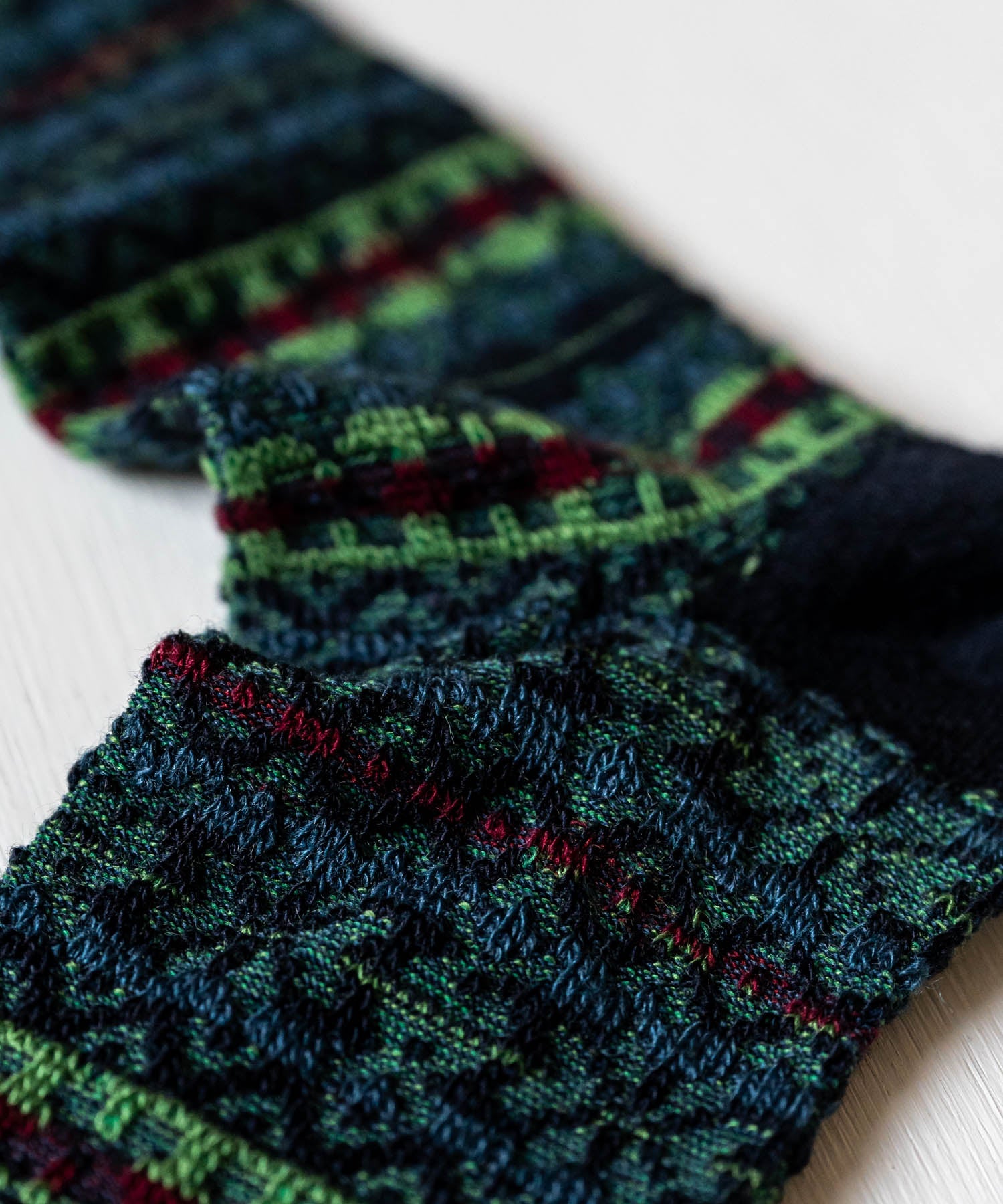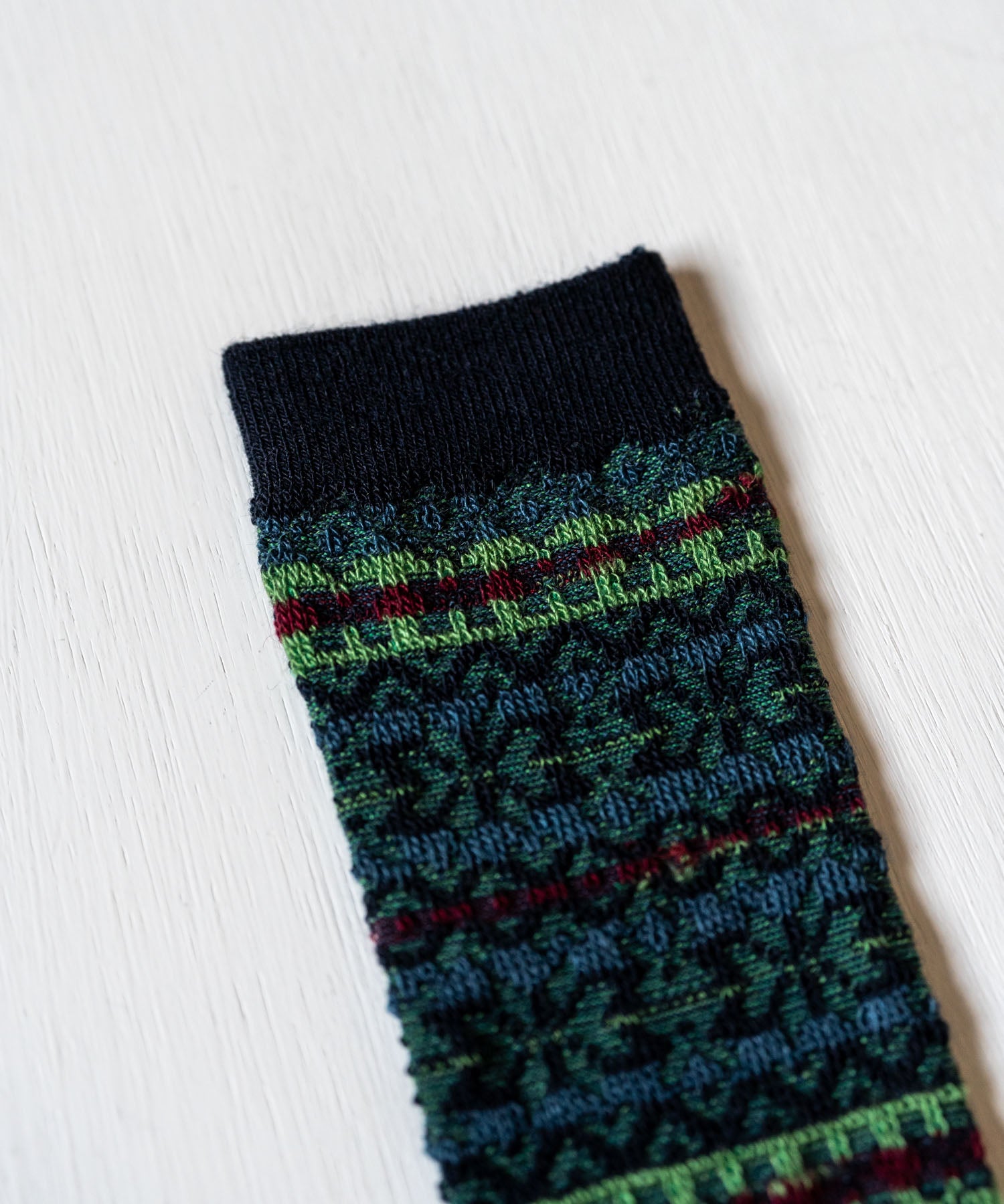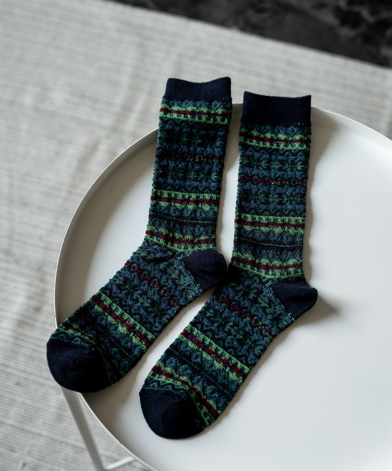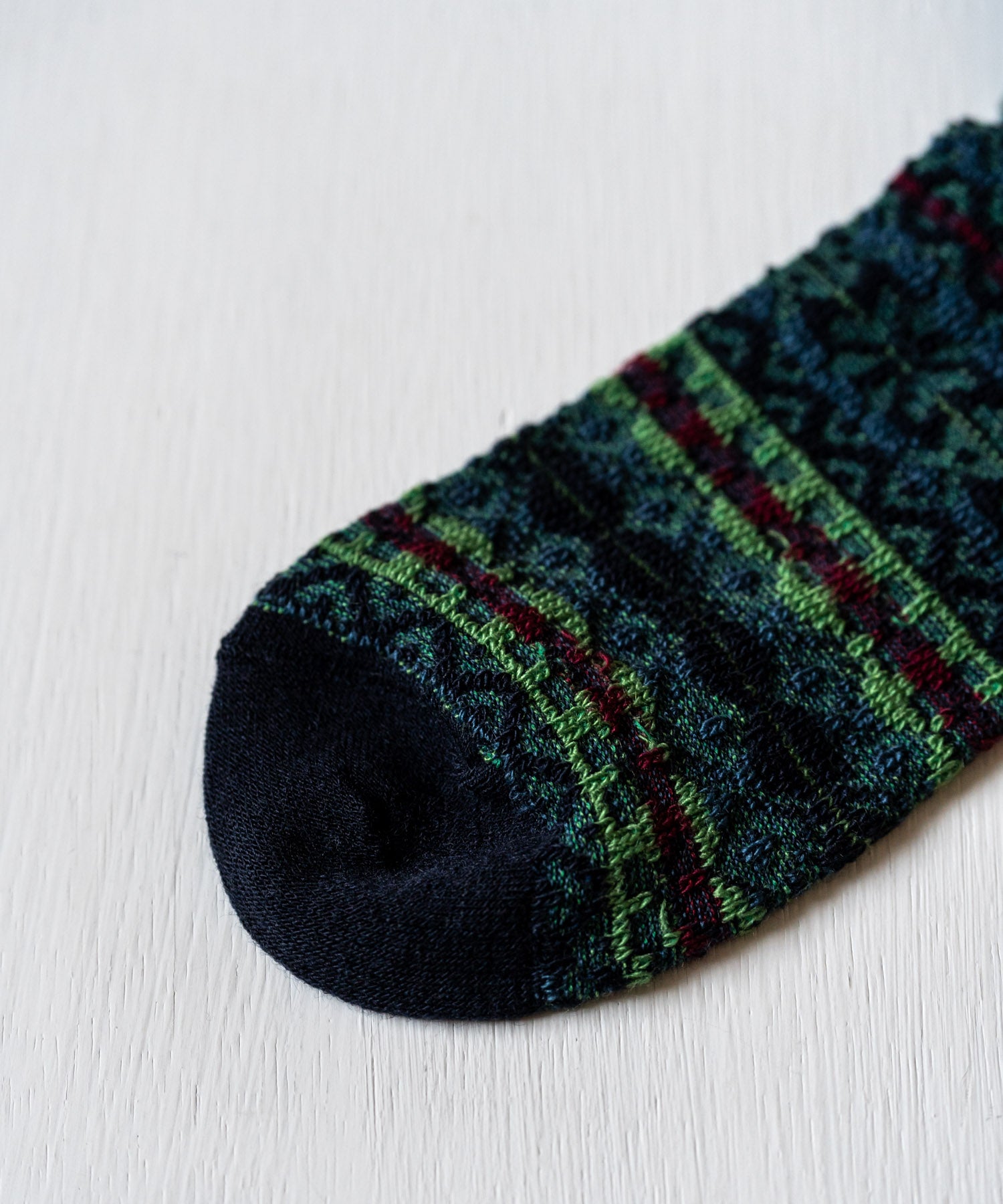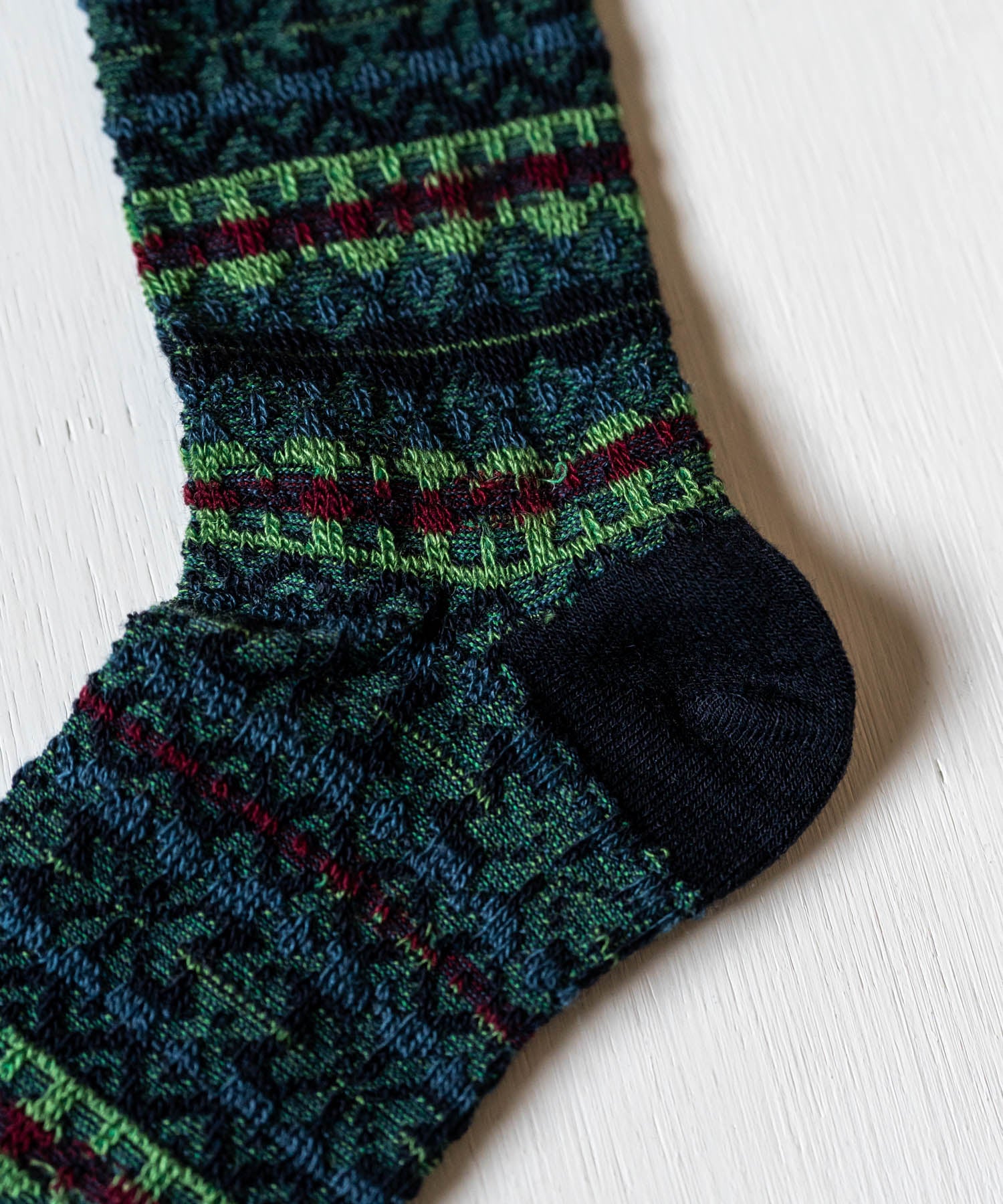 伝統的なフェアアイル柄を、編み地の裏面を生かして表現したリバースジャカードソックス。