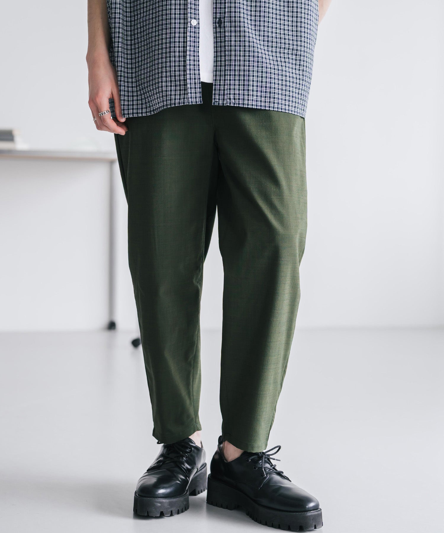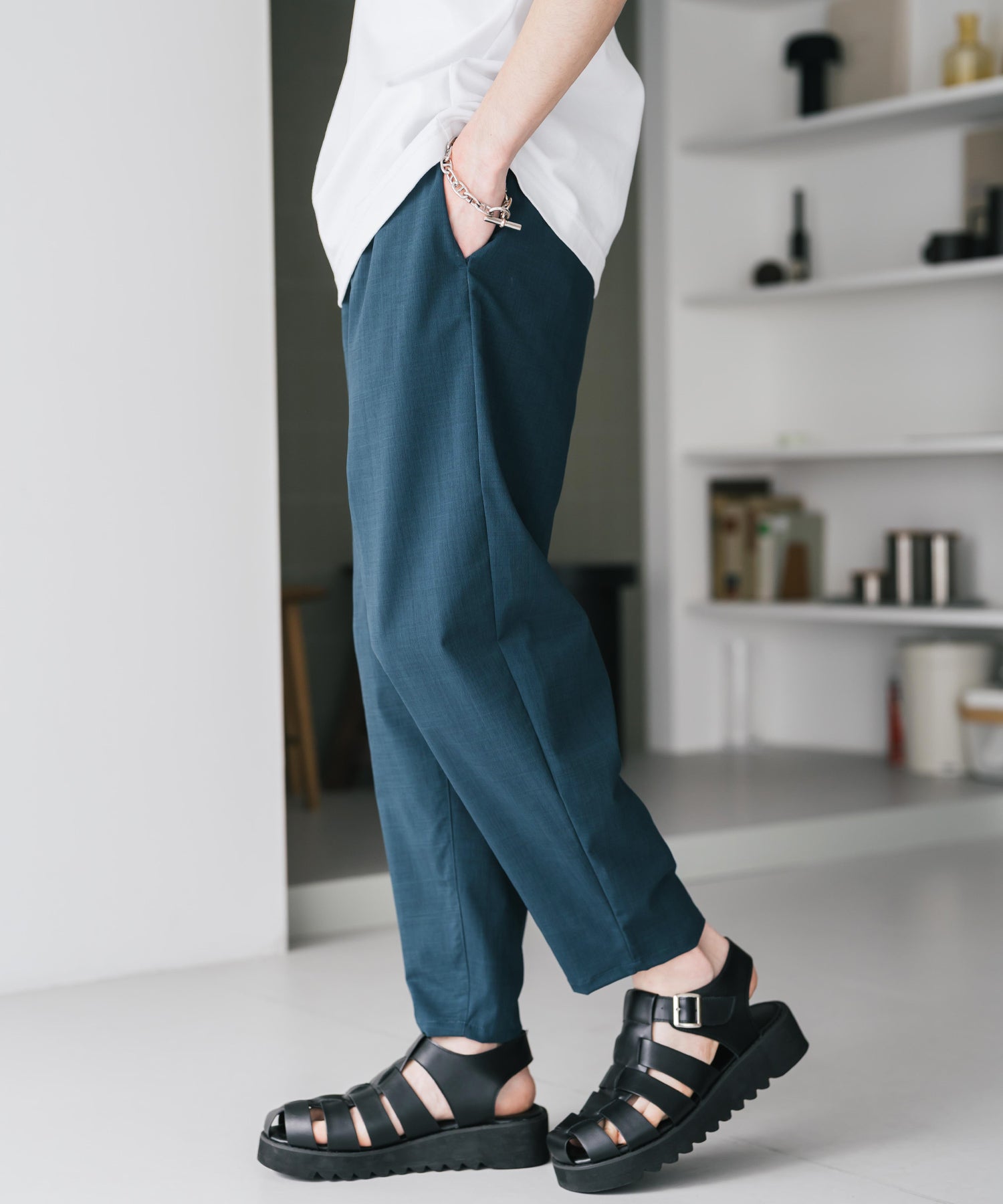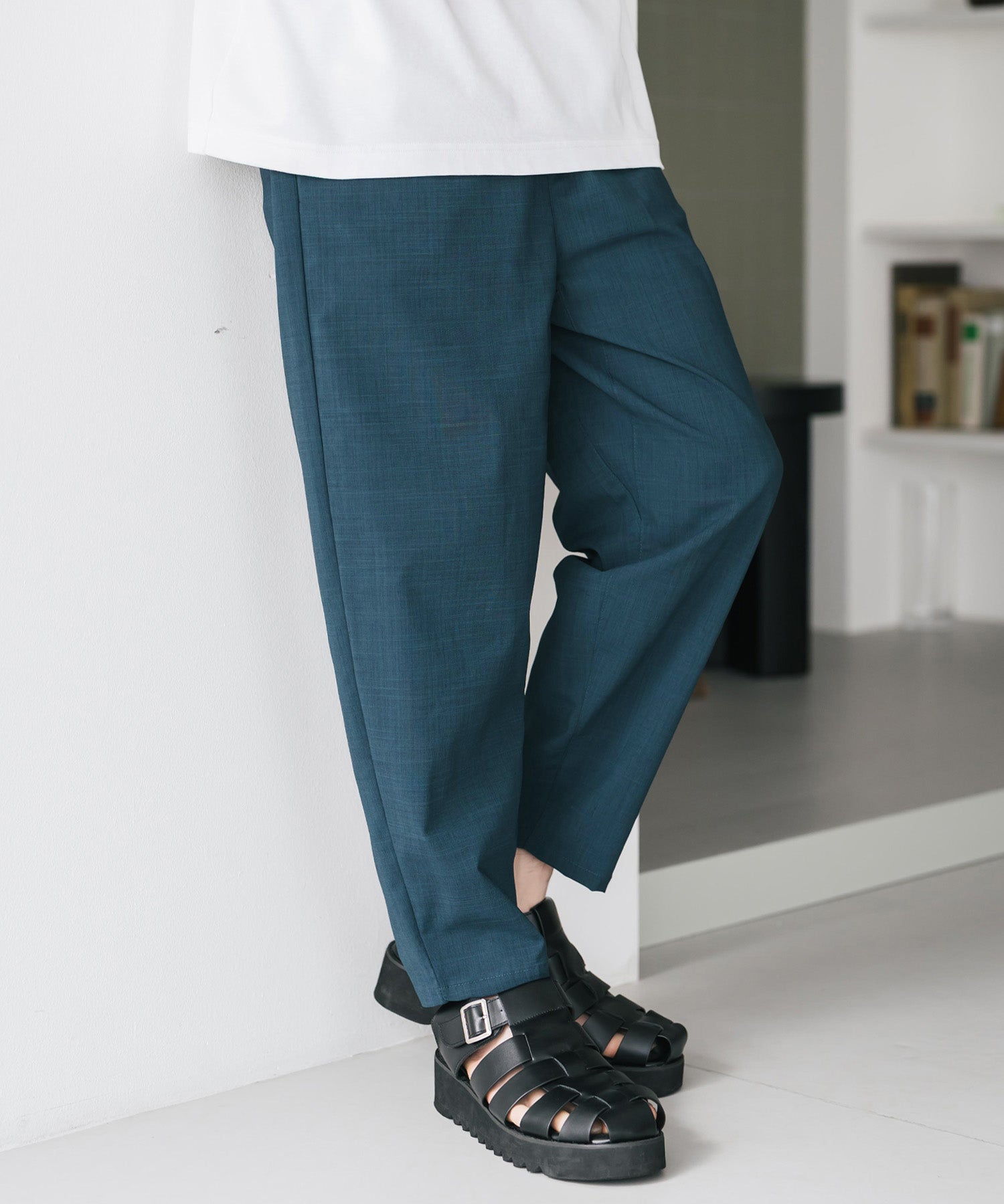 足首がちらりと見えるアンクル丈で、軽やかで抜け感のある印象。