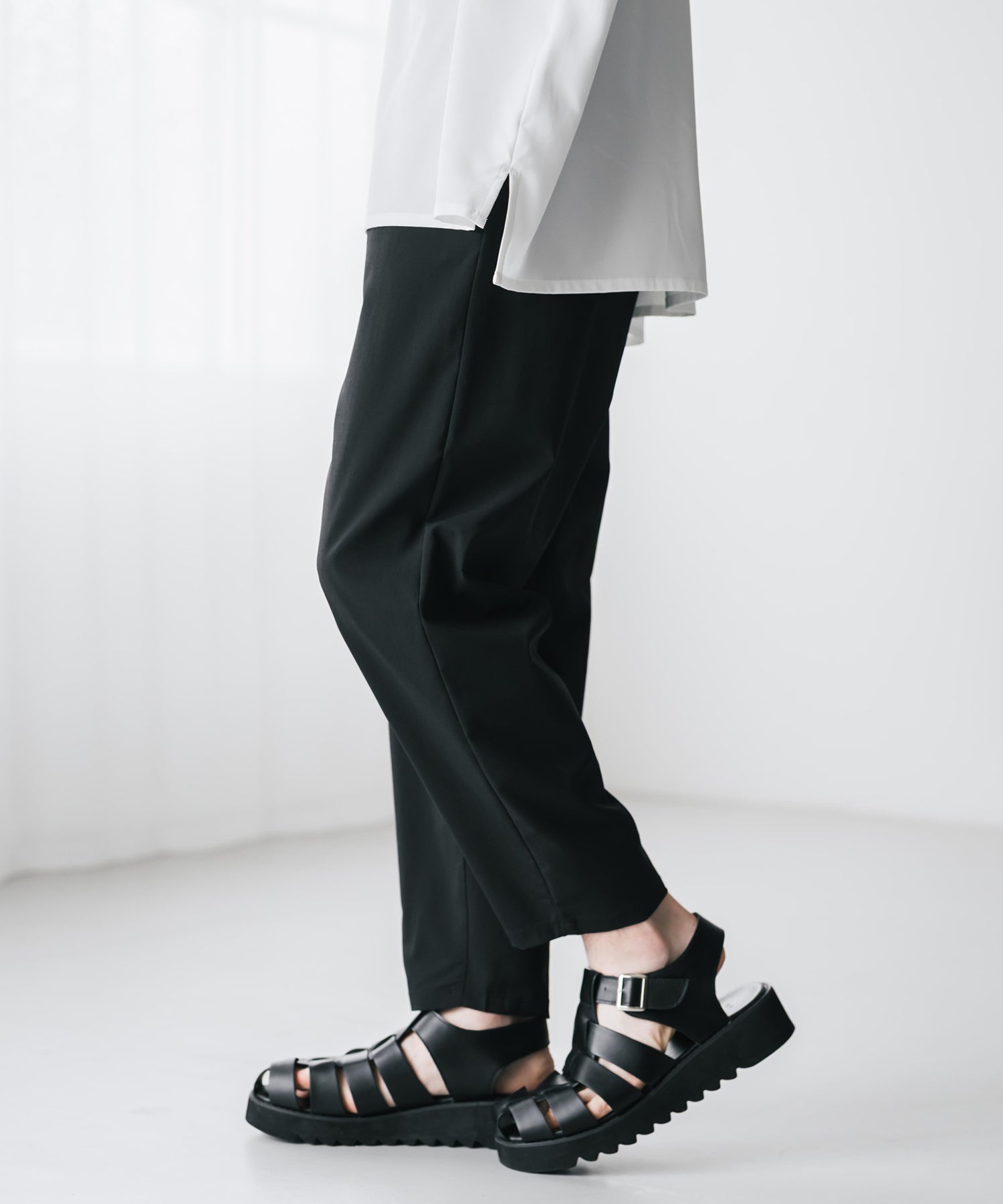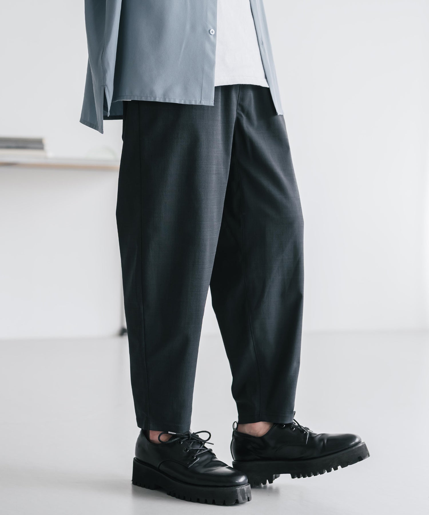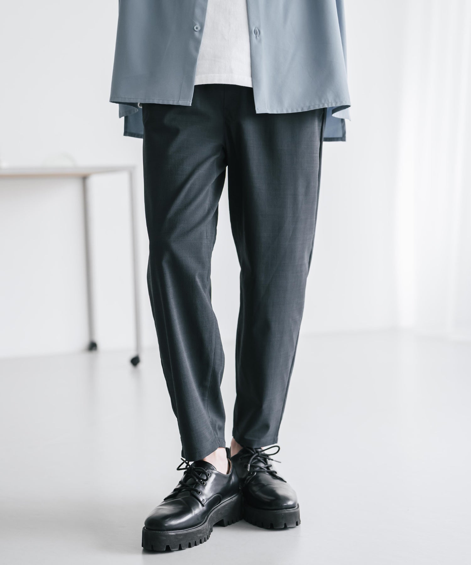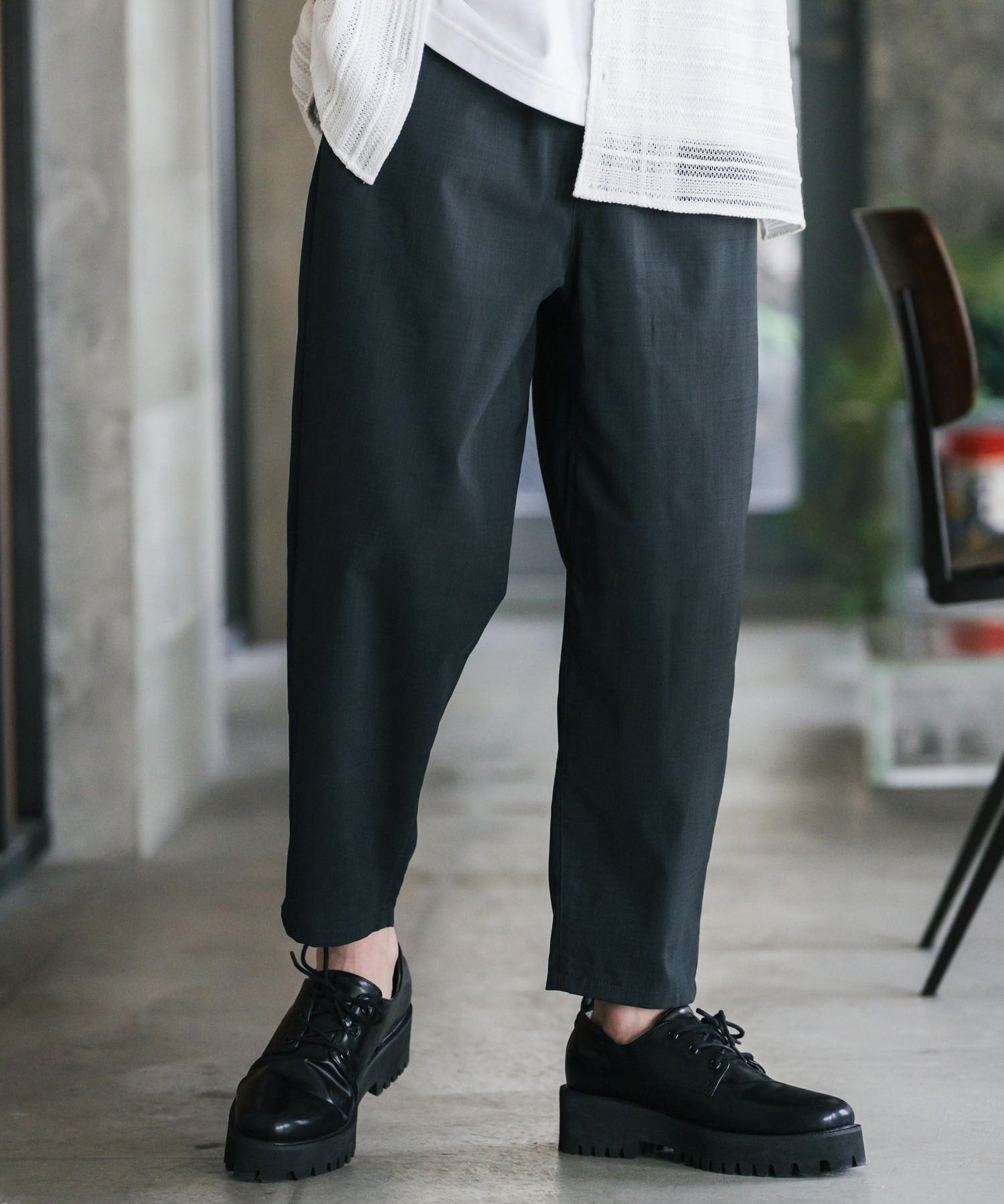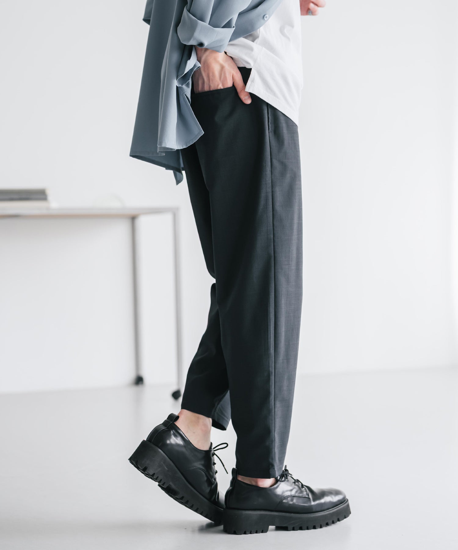 膝から下は裾に向かってテーパードを効かせたシルエット。
