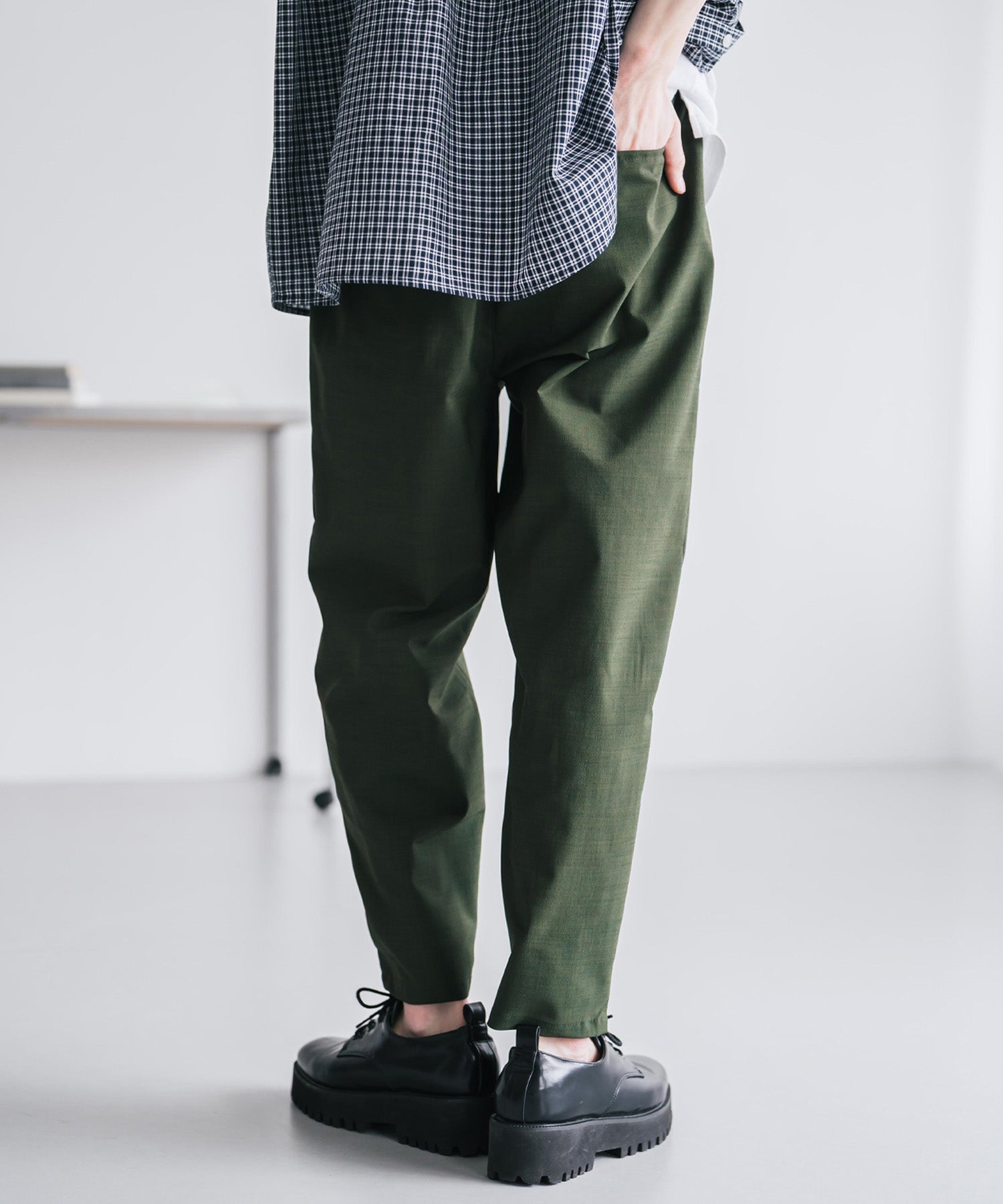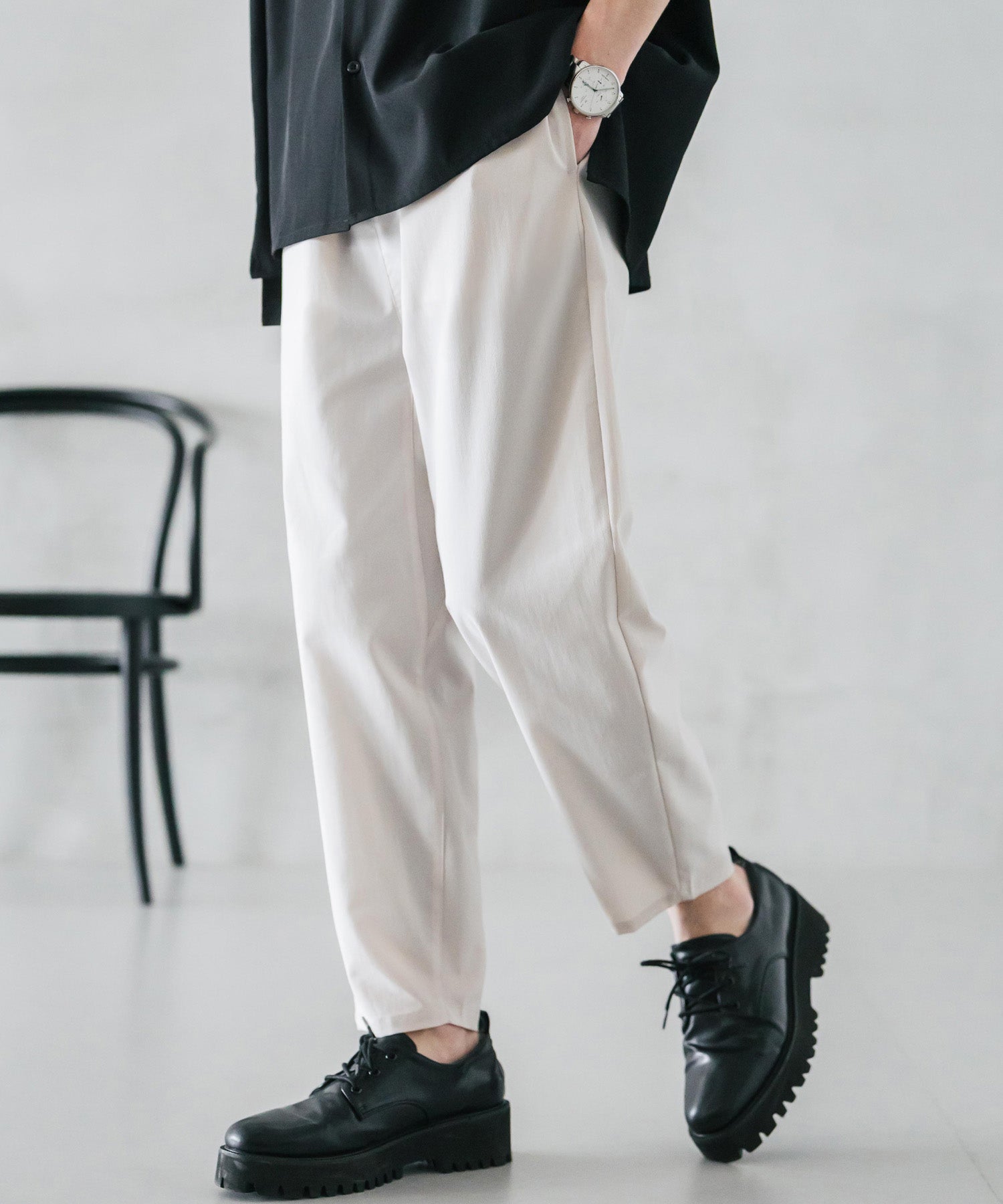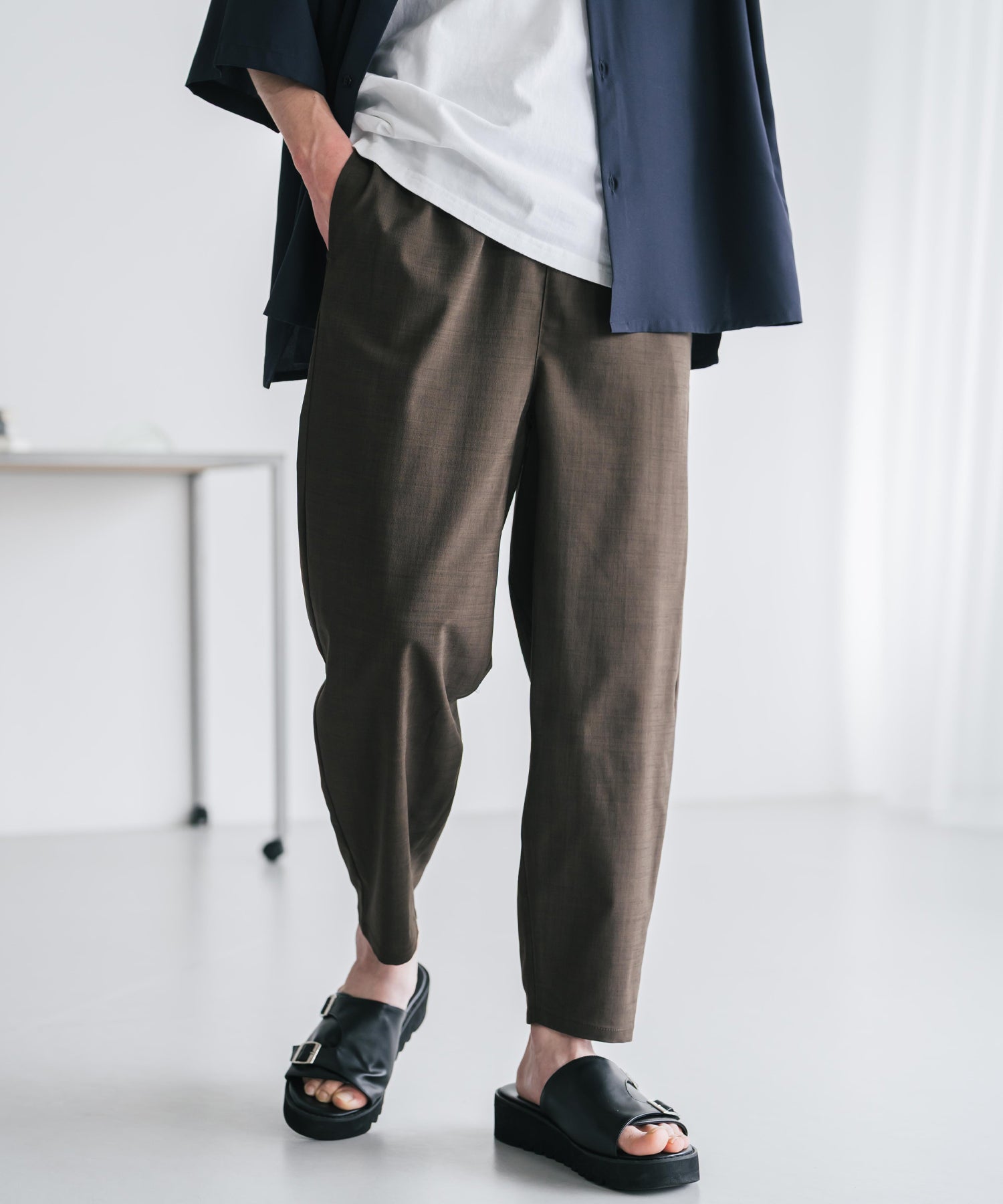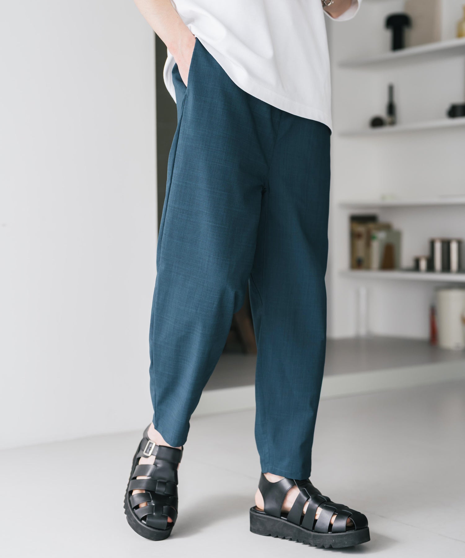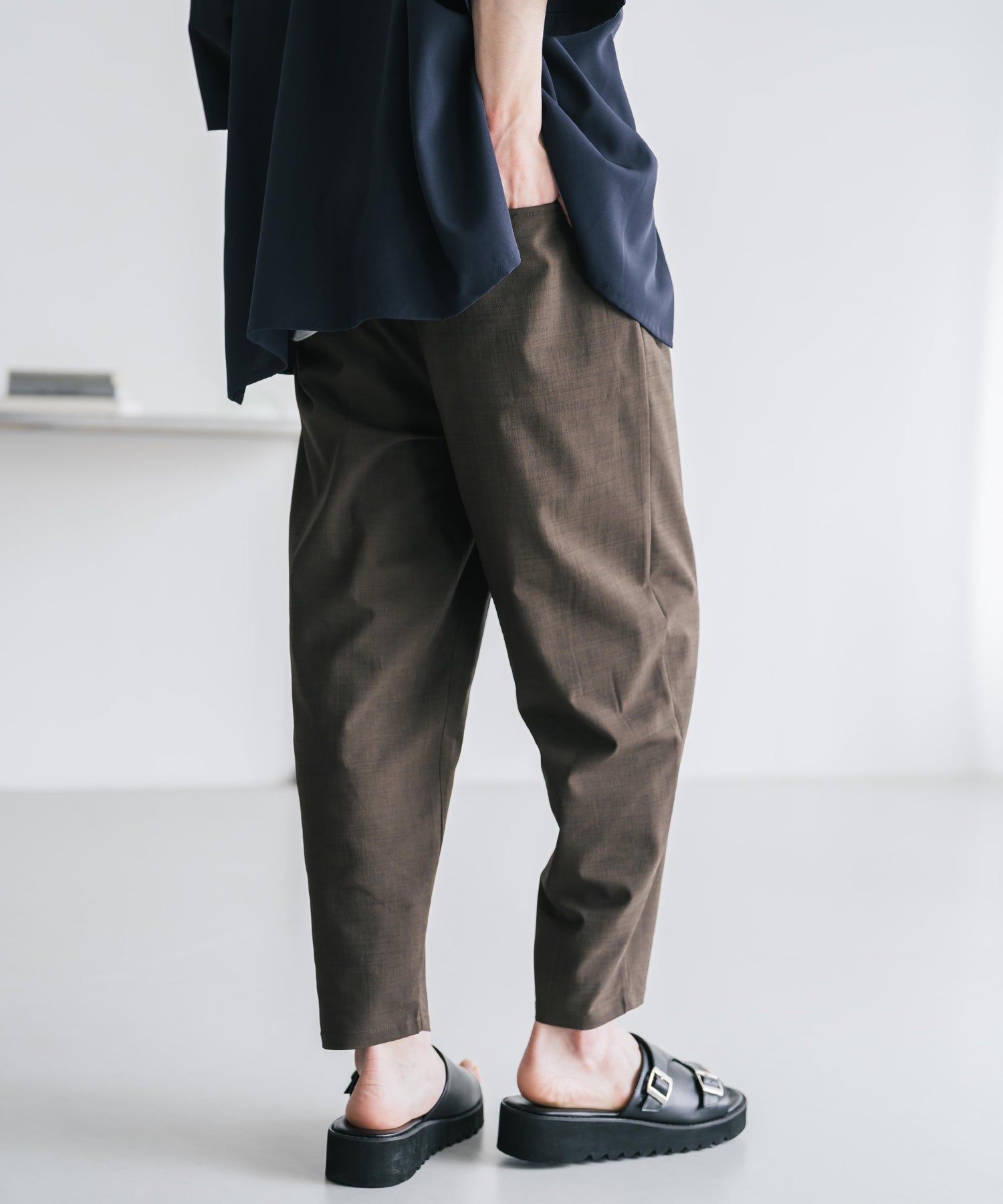膝から下は裾に向かってテーパードを効かせたシルエット。
